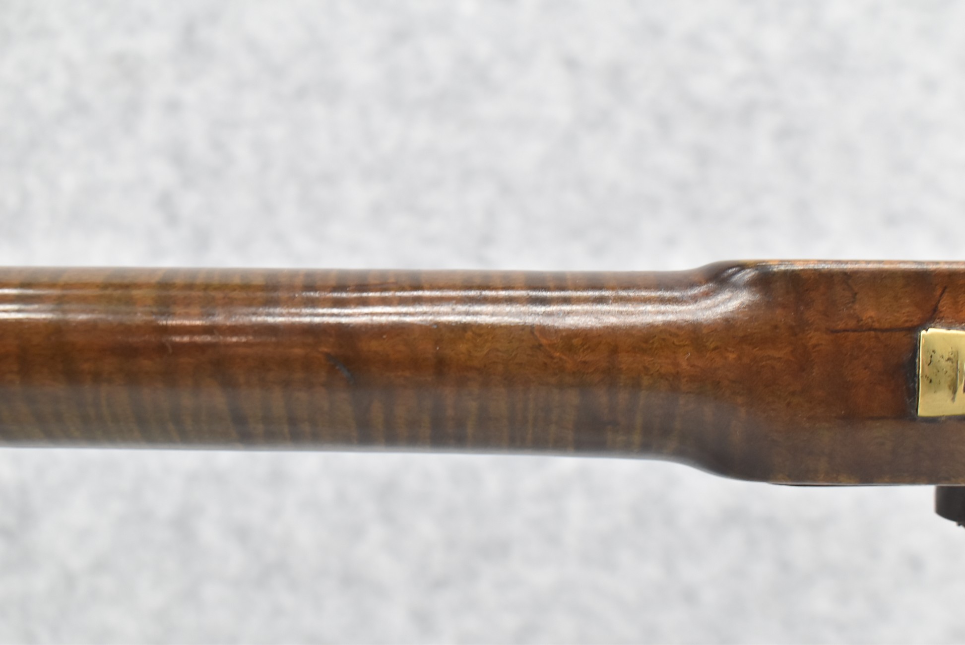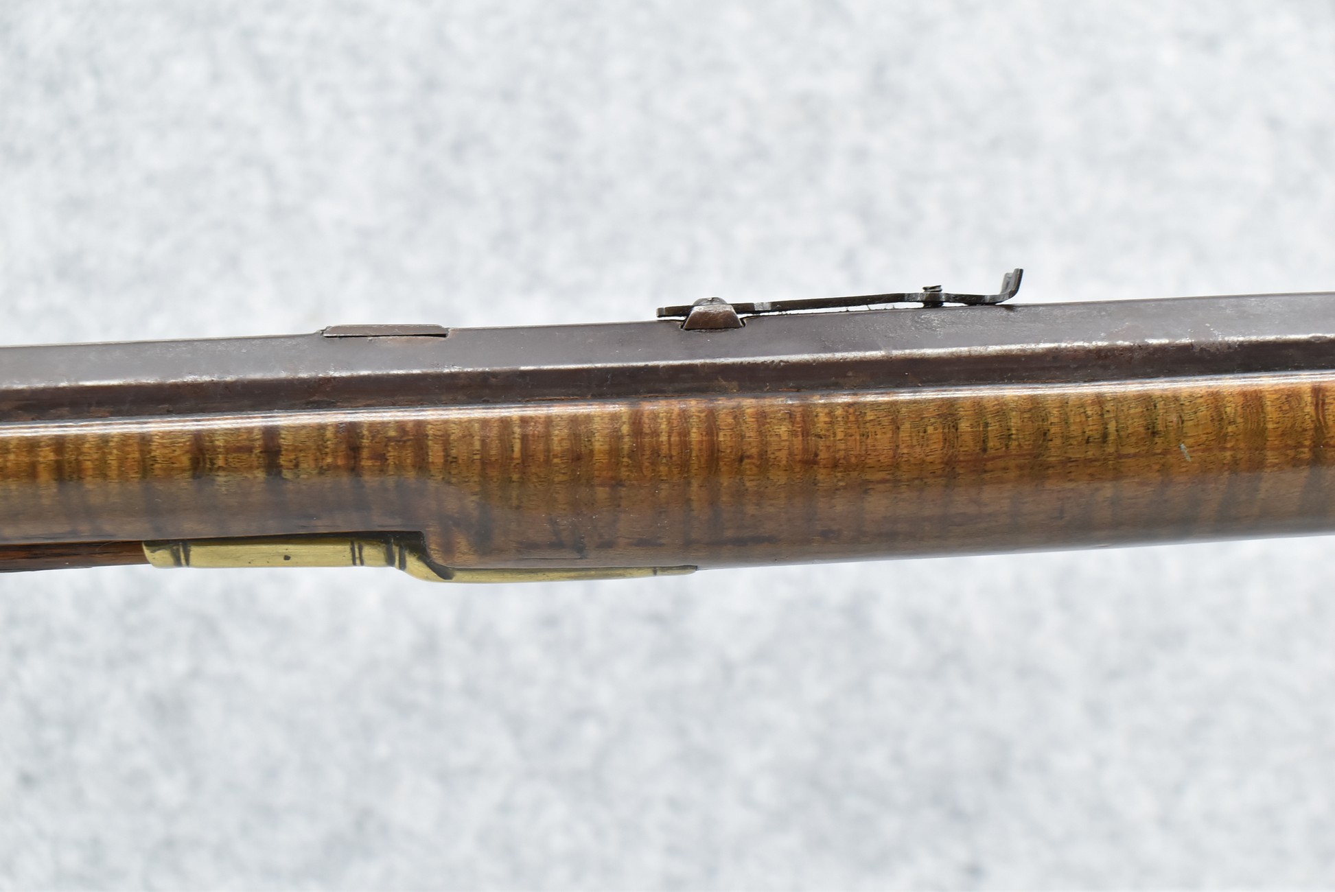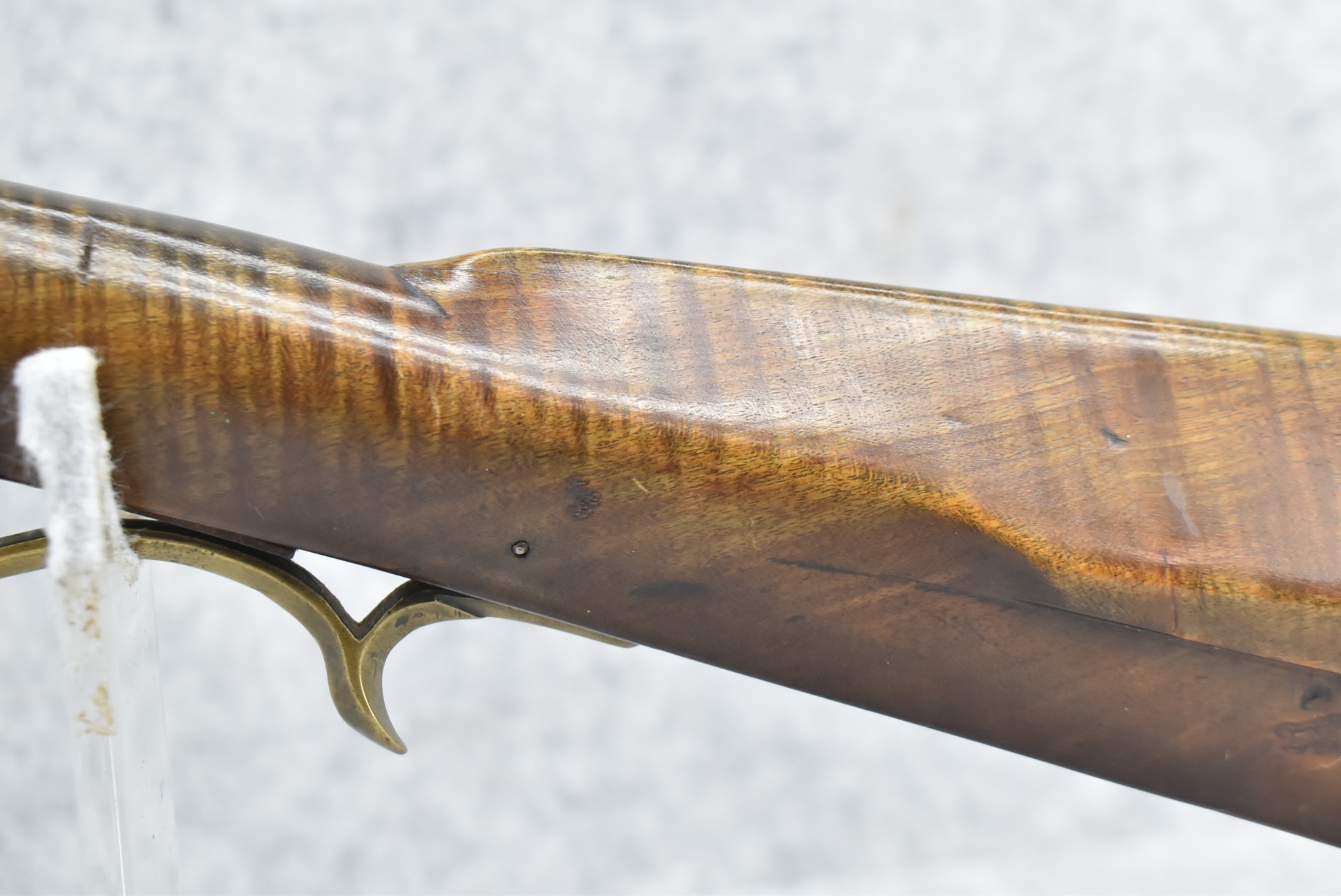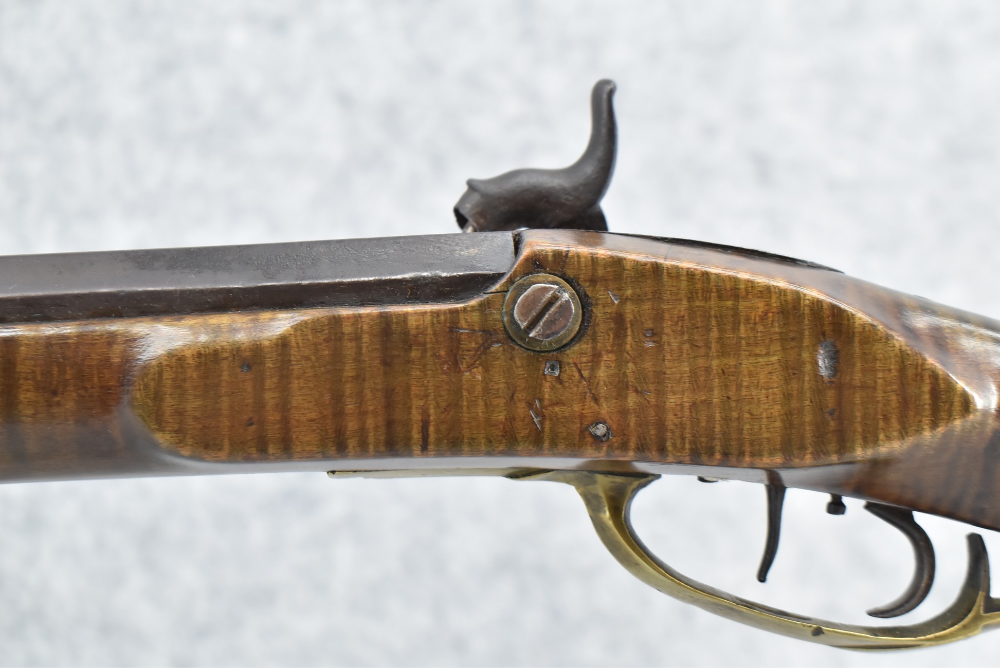 156.        Signed W. Blain Barrel Percussion Kentucky Long Rifle – w/40 Cal. 39” Octagon Barrel w/Front & Rear Barrels Sights – w/Refinished Full Length Wood Stock w/4pc. Engraved Patch Box (Identical Patch Box in “Kentucky Rifle Patch Boxes Vol. 2” by Chandler & Whisker) & Brass Furniture – w/Double Set Triggers – Note:  Crack in Fore Stock – Overall Length of 55” – W. Blain Died in 1852.  In 1823 He Was Located in Brothers Valley Twp., Somerset County & Between 1827-1852 He Was Located in Donegal Twp., Westmoreland County, PA