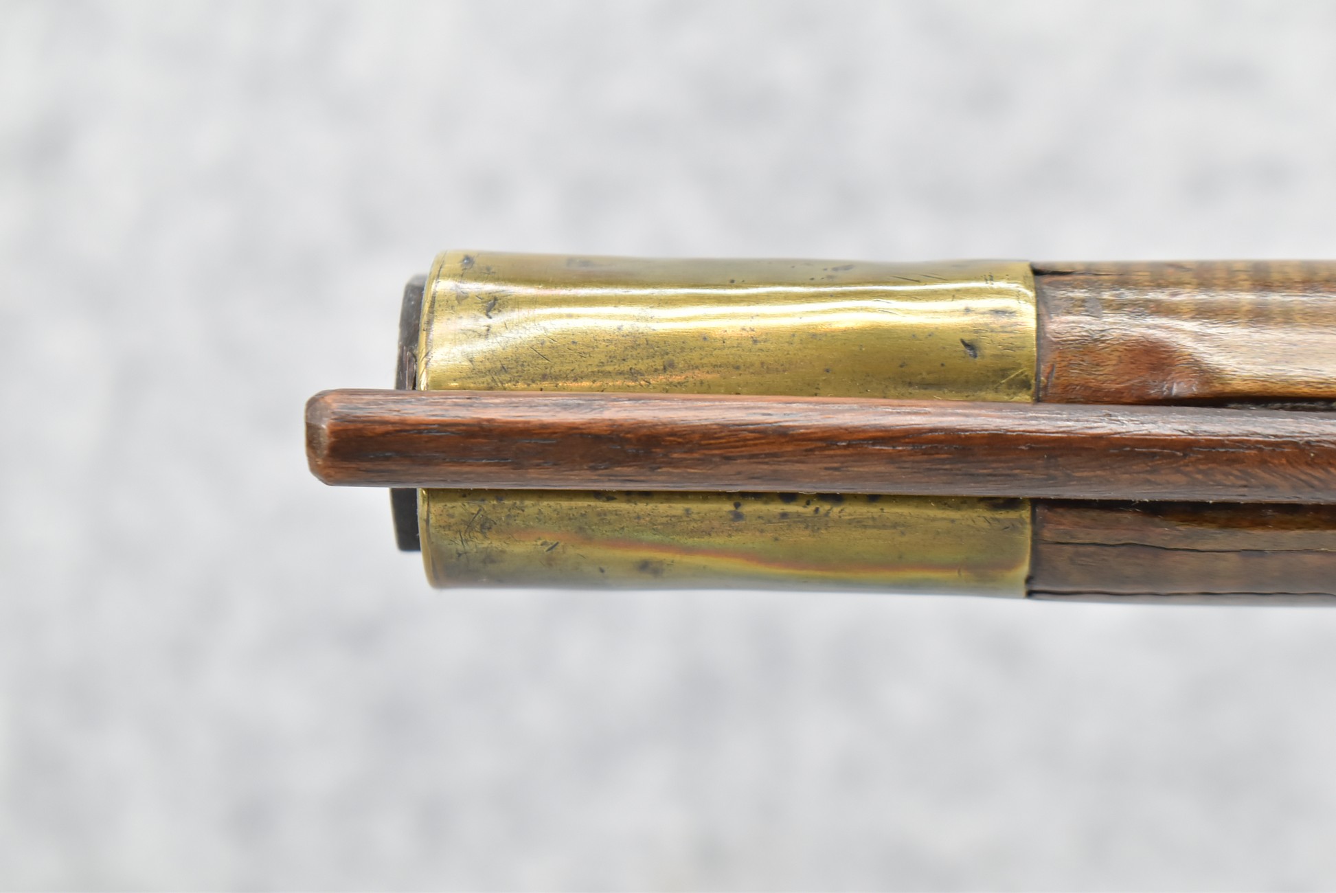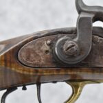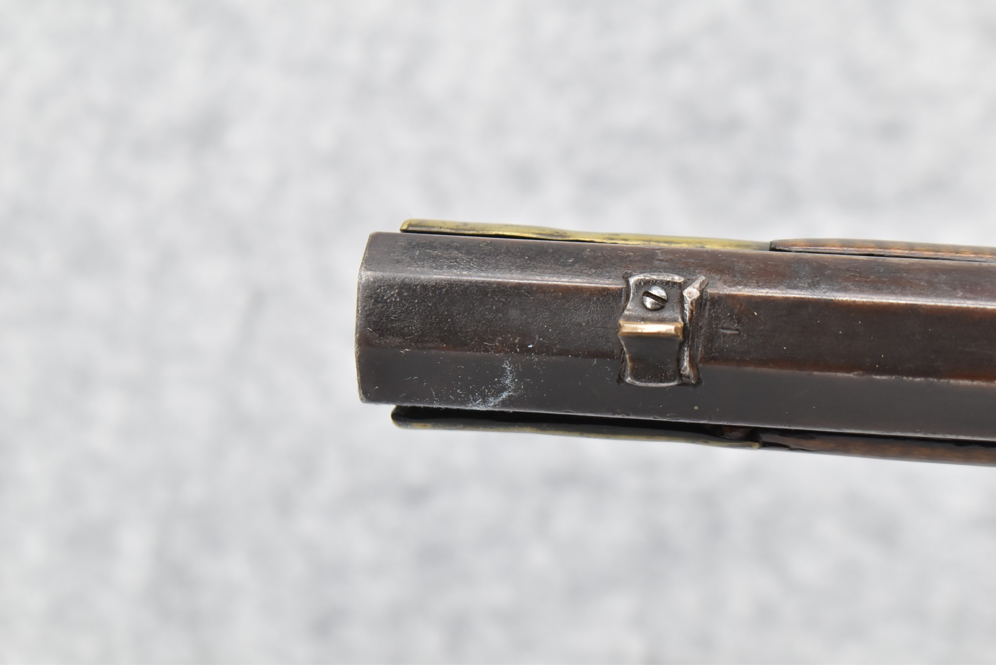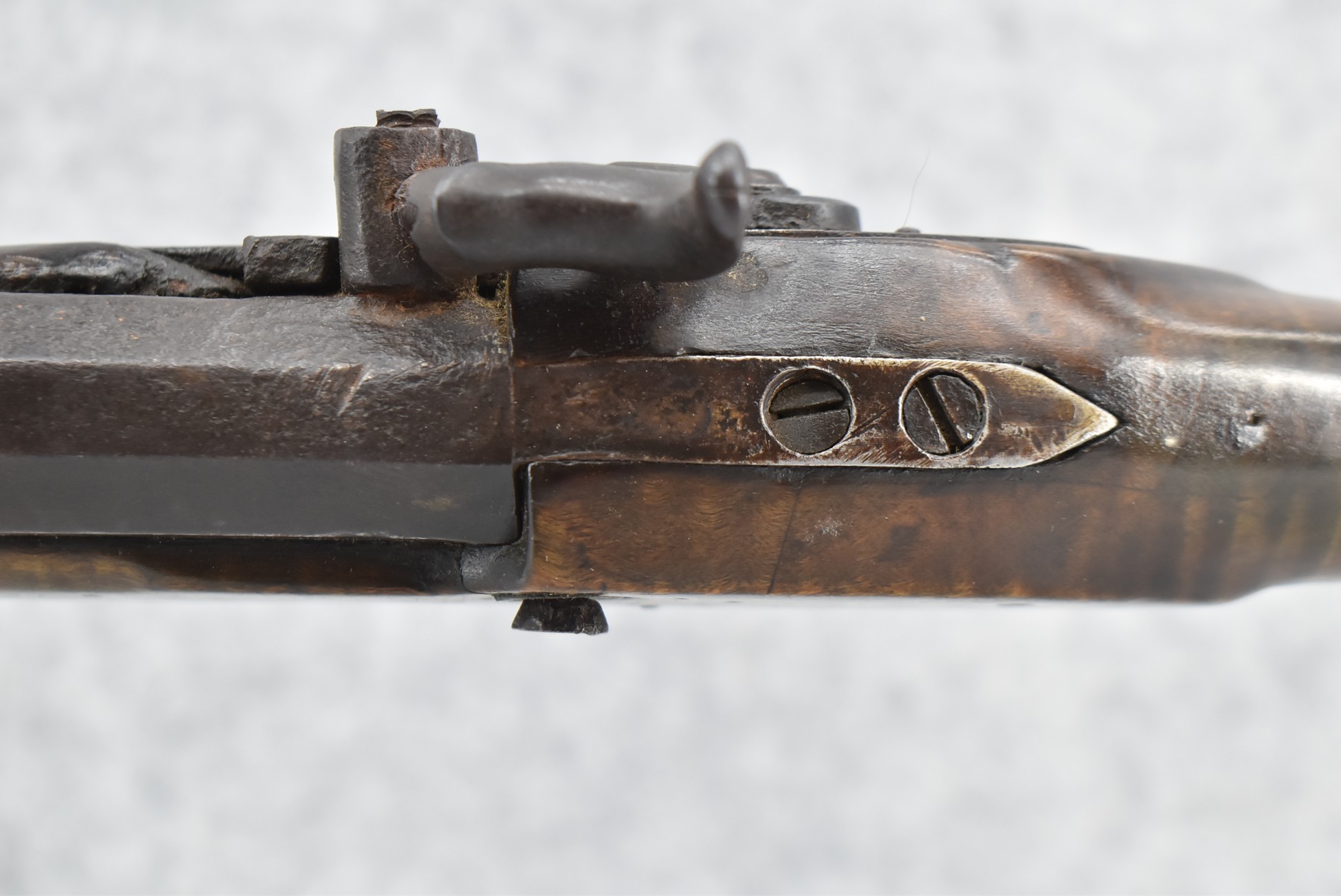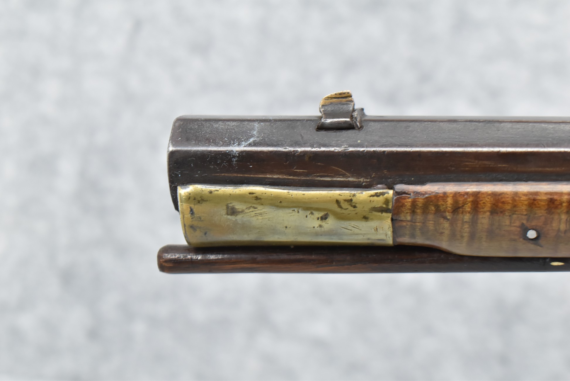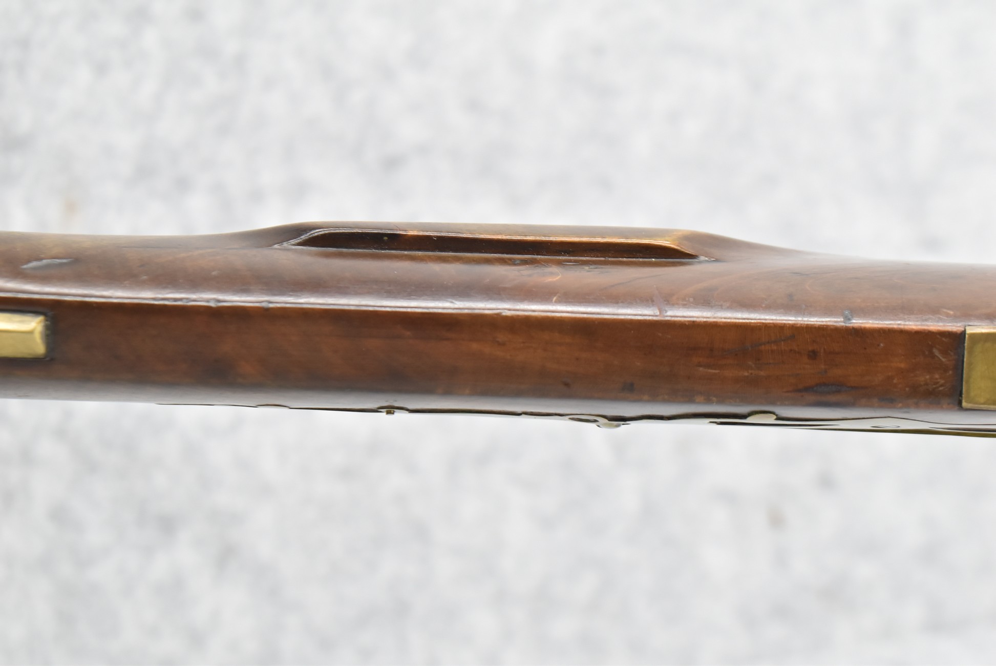 156.        Signed W. Blain Barrel Percussion Kentucky Long Rifle – w/40 Cal. 39” Octagon Barrel w/Front & Rear Barrels Sights – w/Refinished Full Length Wood Stock w/4pc. Engraved Patch Box (Identical Patch Box in “Kentucky Rifle Patch Boxes Vol. 2” by Chandler & Whisker) & Brass Furniture – w/Double Set Triggers – Note:  Crack in Fore Stock – Overall Length of 55” – W. Blain Died in 1852.  In 1823 He Was Located in Brothers Valley Twp., Somerset County & Between 1827-1852 He Was Located in Donegal Twp., Westmoreland County, PA