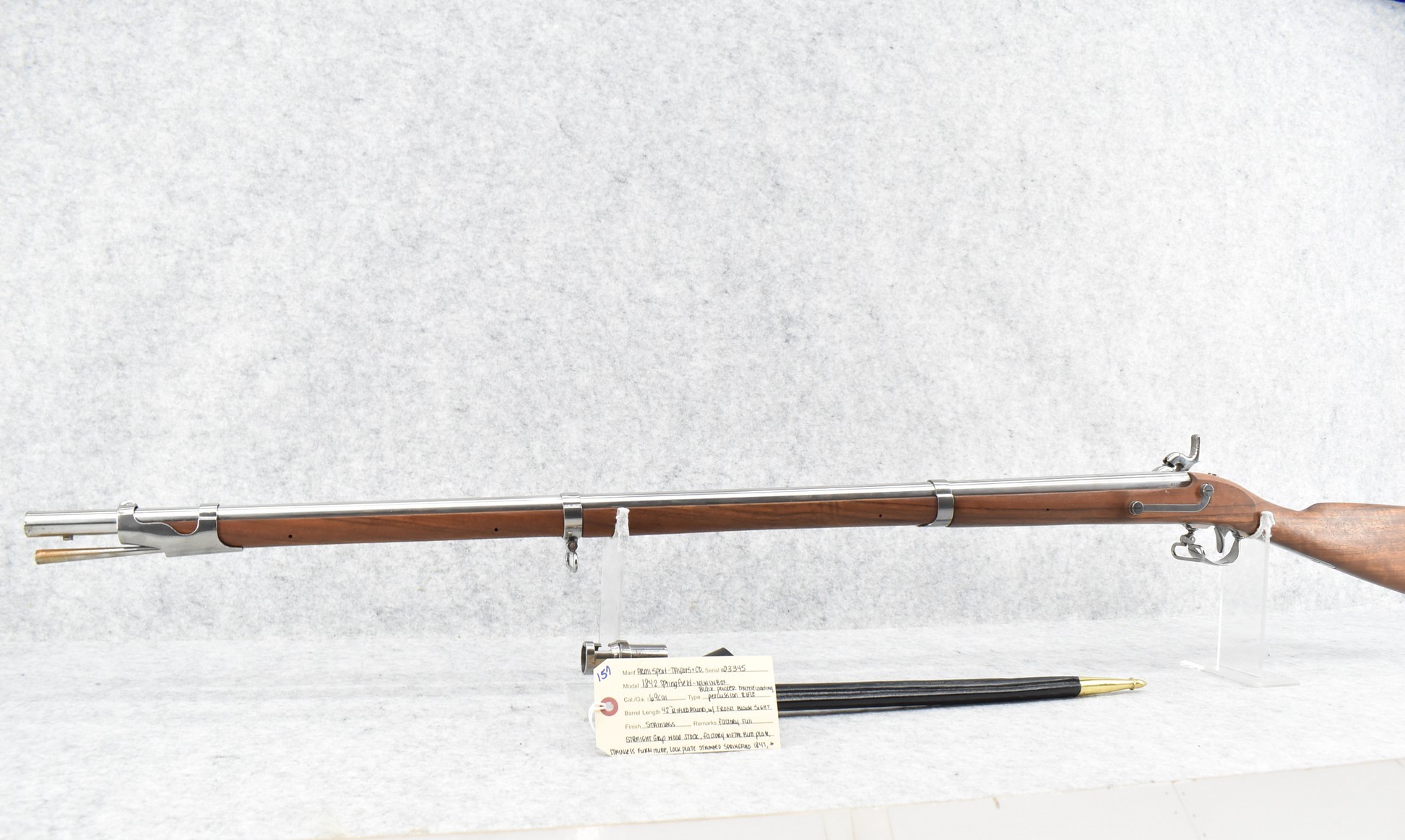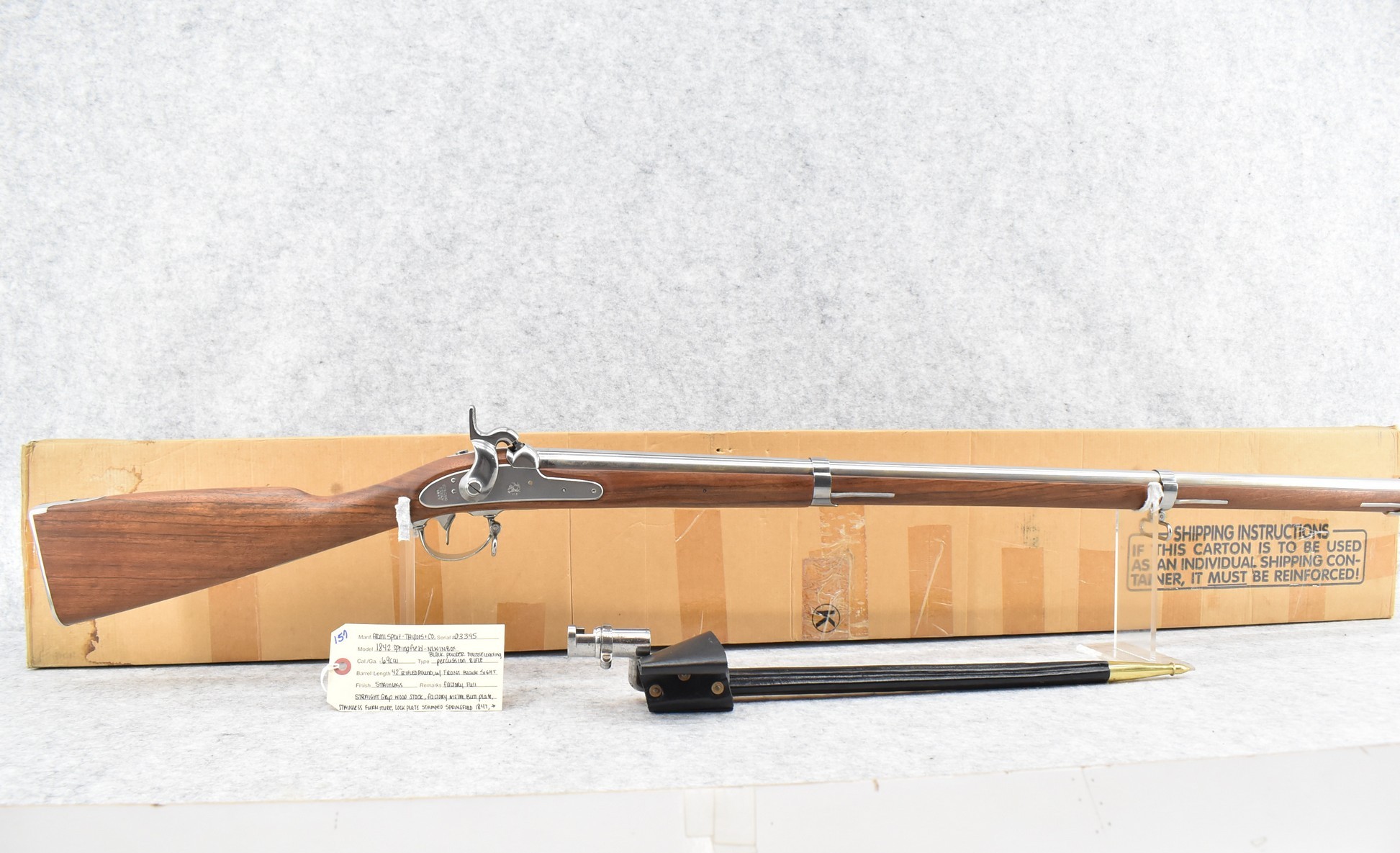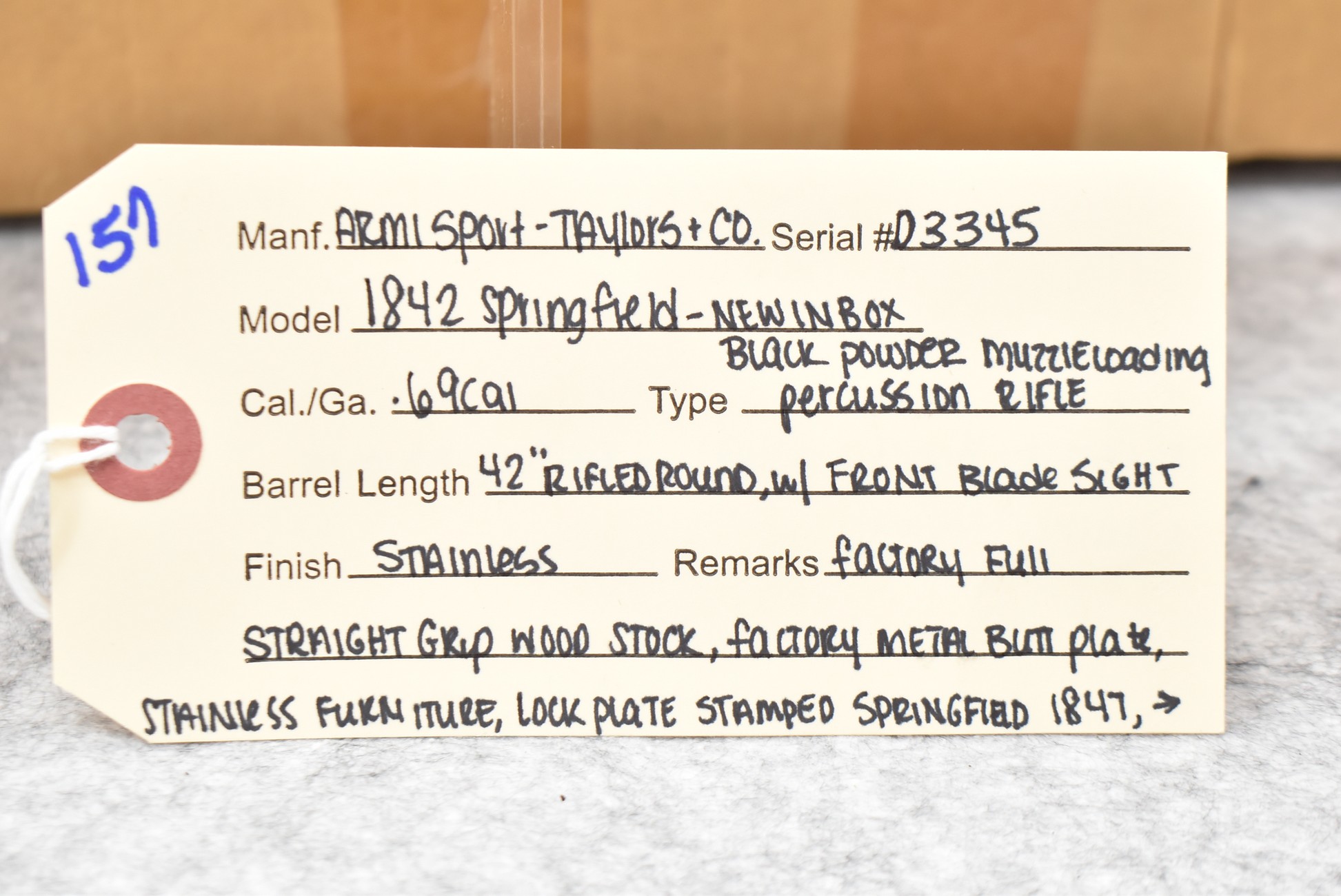 157. Armi-Sport/Taylors & Co. – Mod. 1842 Springfield – 69 Cal. Black Powder Muzzleloading Percussion Rifle – w/42” Rifled Round Barrel w/Front Blade Sight – Stainless Finish – w/Factory Full Straight Grip Wood Stock w/Factory Metal Butt Plate & Stainless Furniture – Lock Plate Stamped Springfield 1847 – w/Factory Bayonet w/Leather Sheath – w/Factory Box & Manual