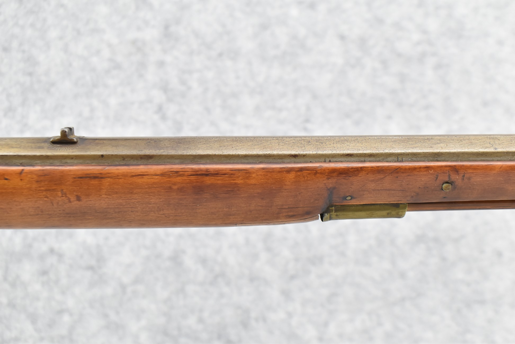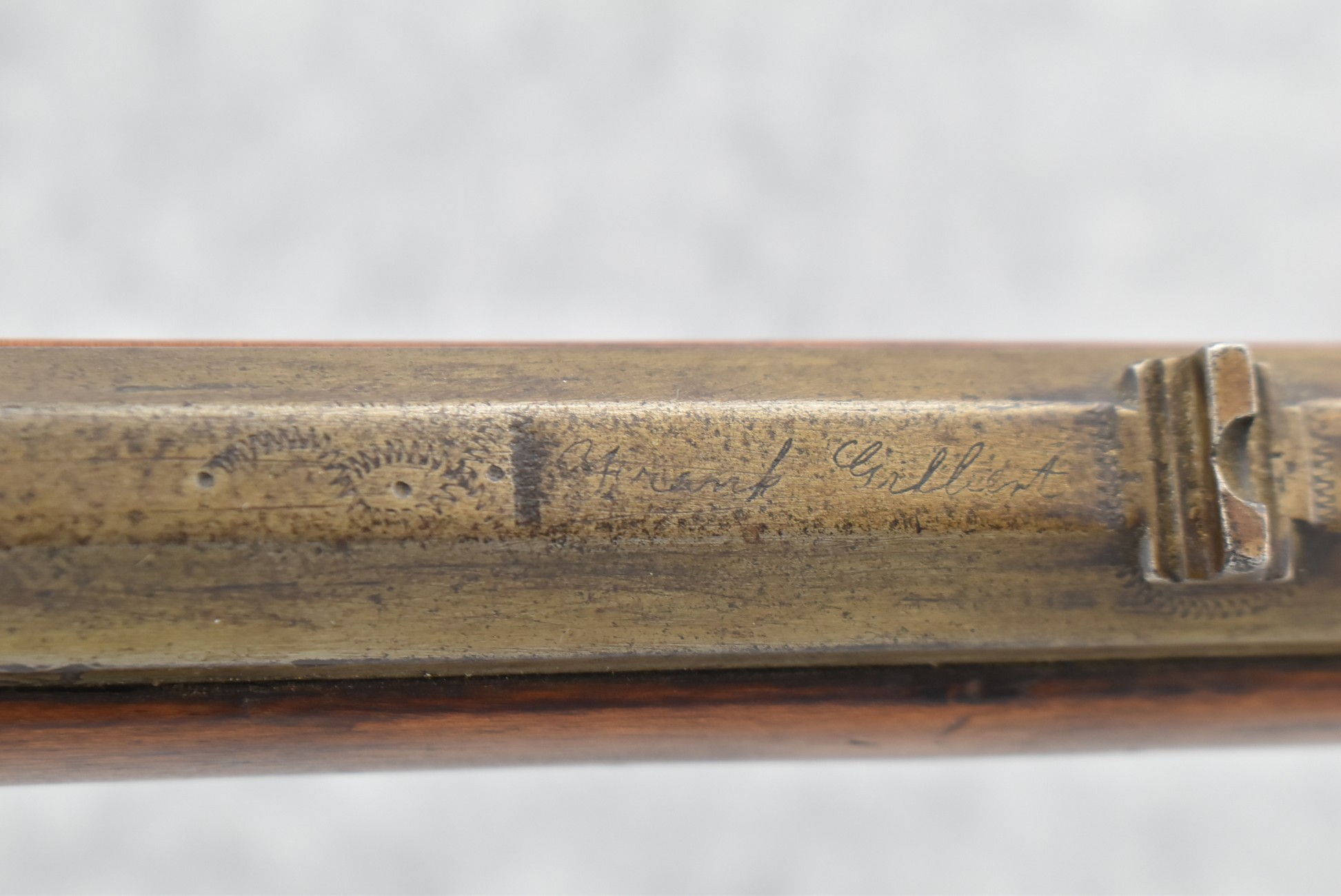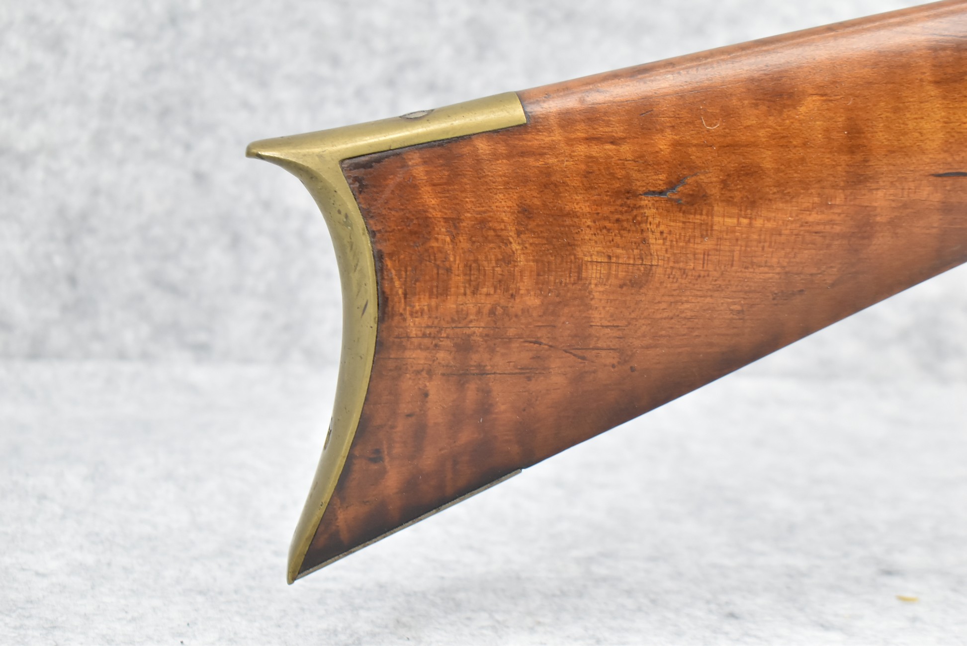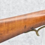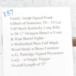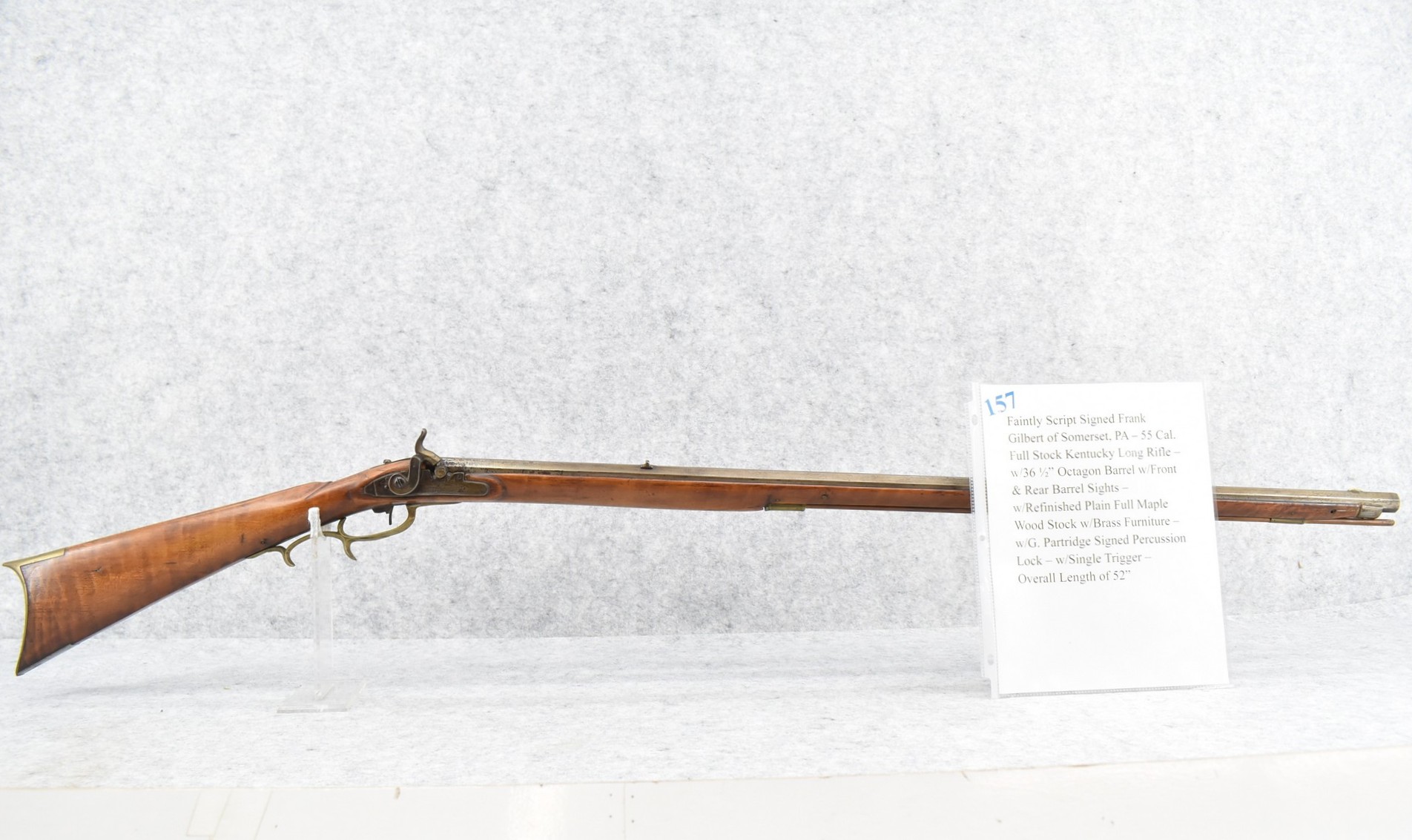 157. Faintly Script Signed Frank Gilbert of Somerset, PA – 55 Cal. Full Stock Kentucky Long Rifle – w/36 ½” Octagon Barrel w/Front & Rear Barrel Sights – w/Refinished Plain Full Maple Wood Stock w/Brass Furniture – w/G. Partridge Signed Percussion Lock – w/Single Trigger – Overall Length of 52”