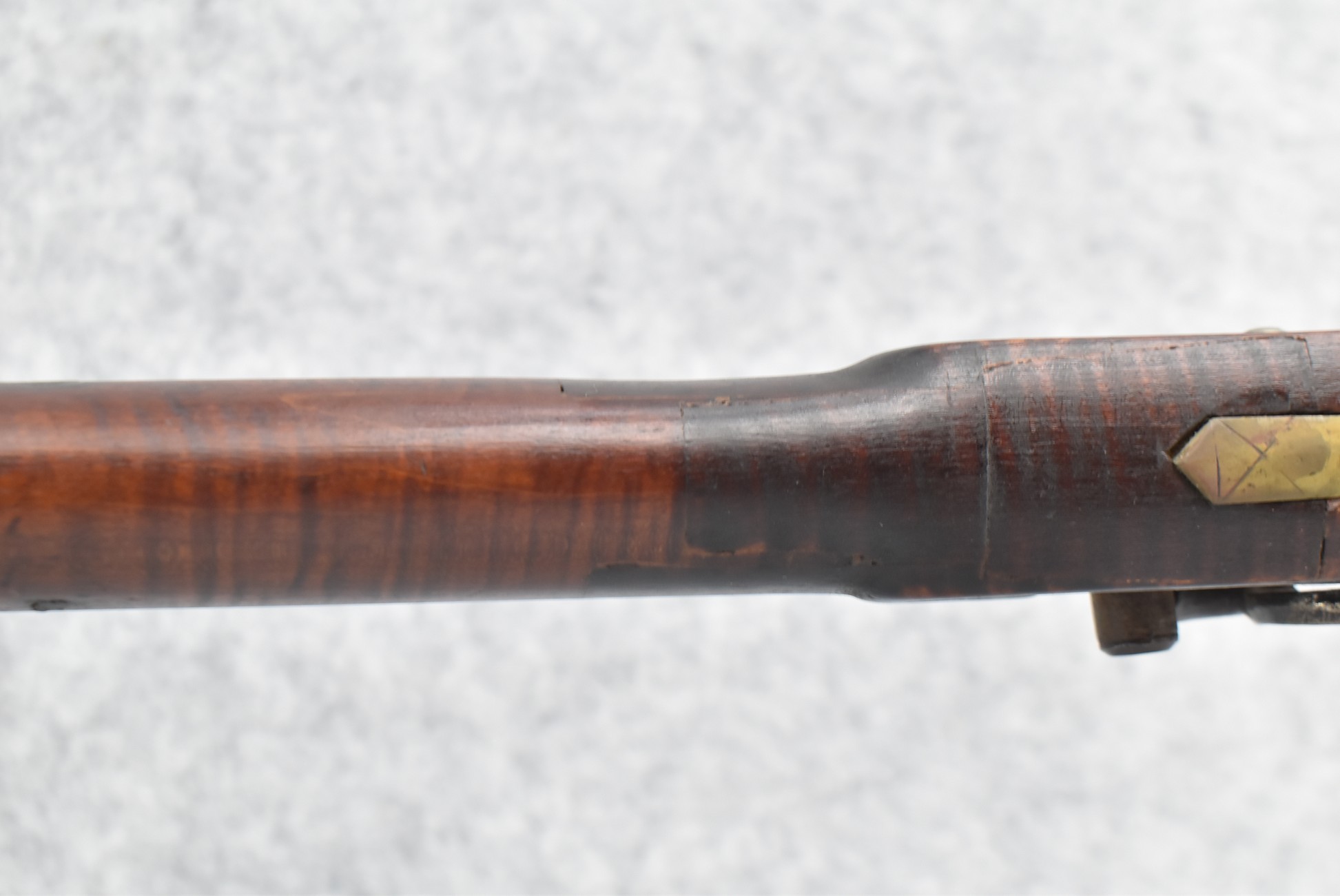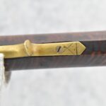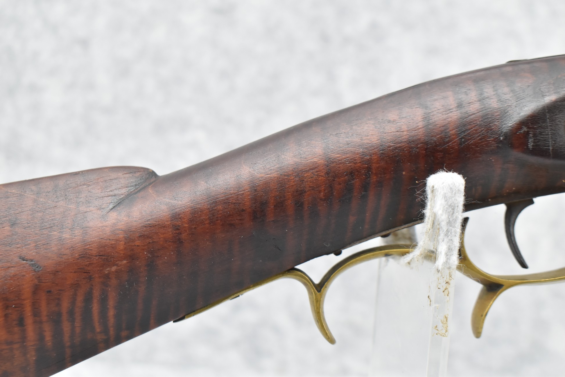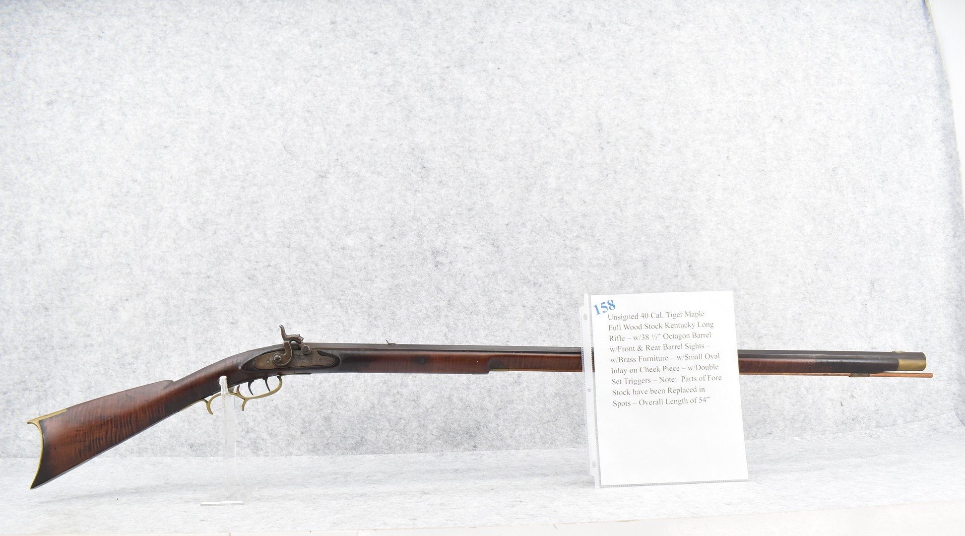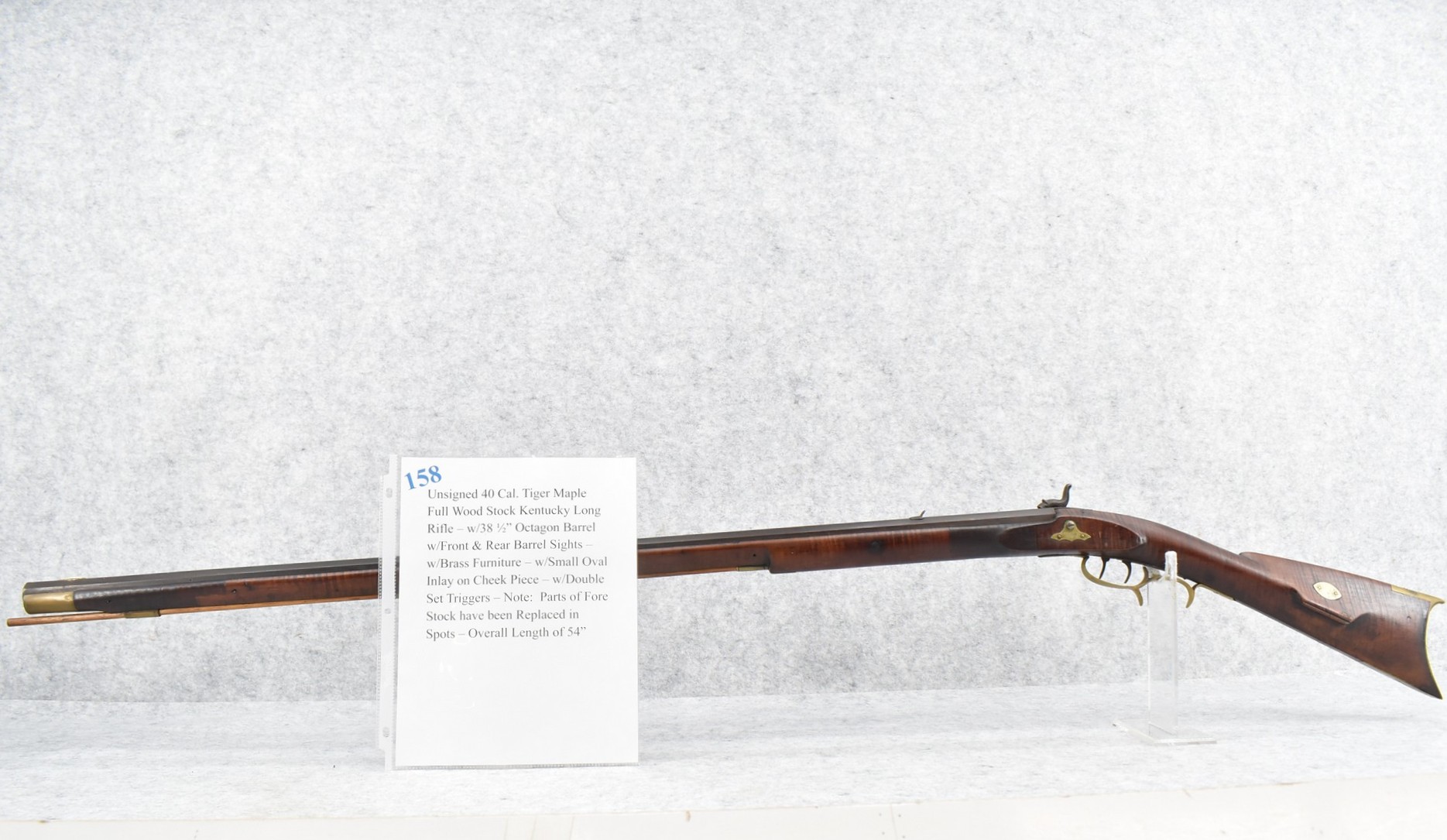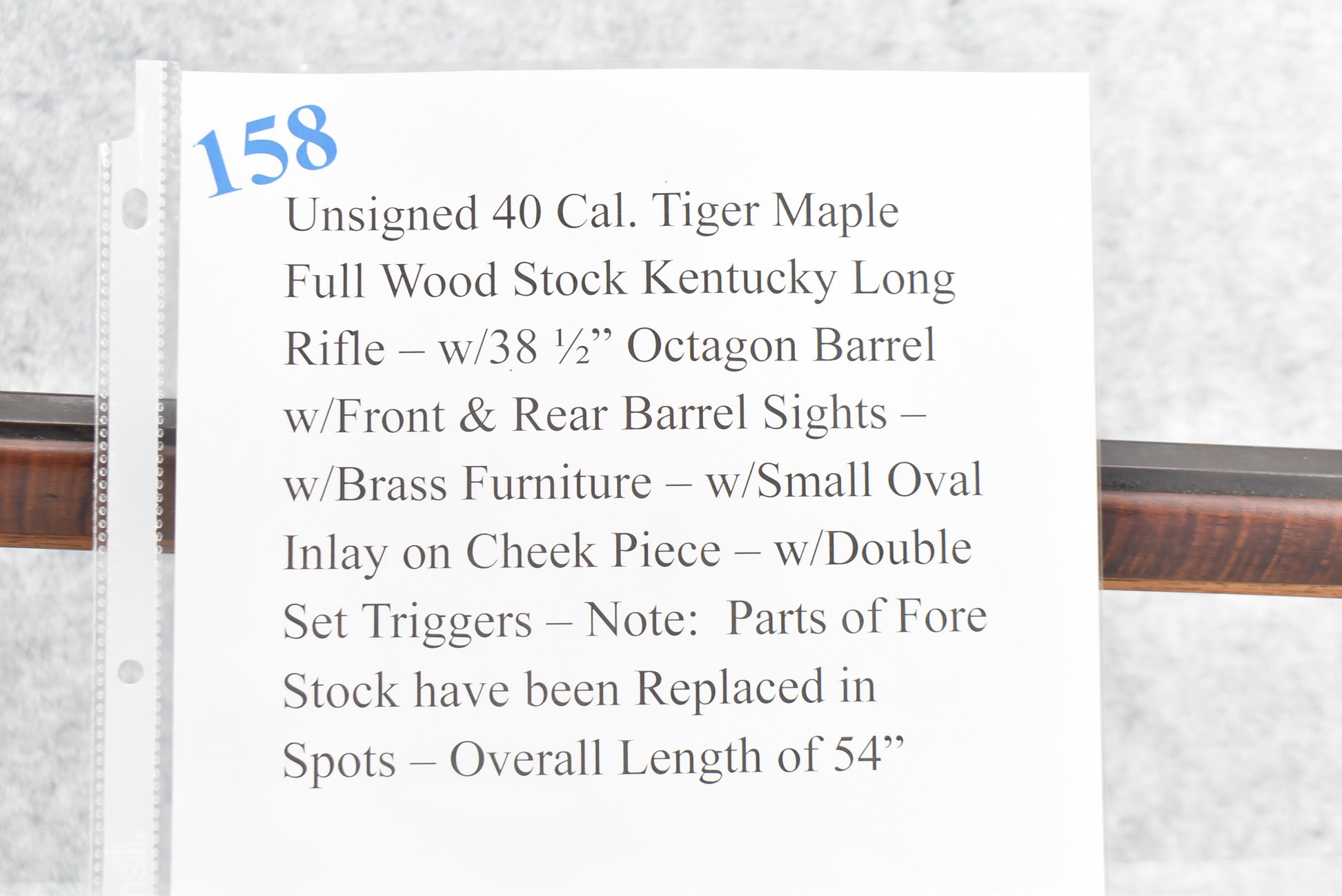 158. Unsigned 40 Cal. Tiger Maple Full Wood Stock Kentucky Long Rifle – w/38 ½” Octagon Barrel w/Front & Rear Barrel Sights – w/Brass Furniture – w/Small Oval Inlay on Cheek Piece – w/Double Set Triggers – Note: Parts of Fore Stock have been Replaced in Spots – Overall Length of 54”