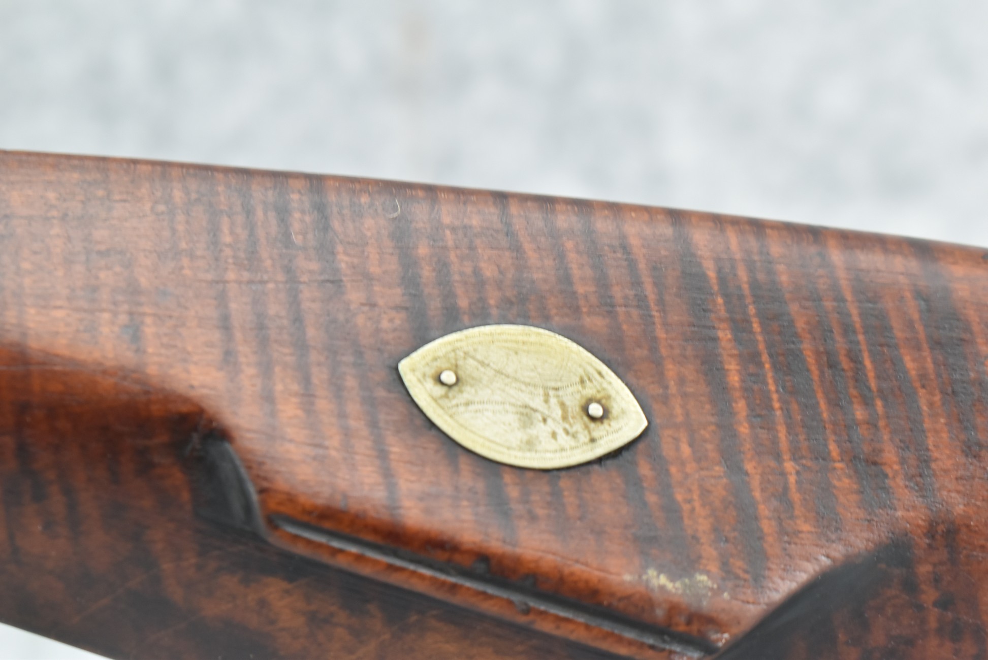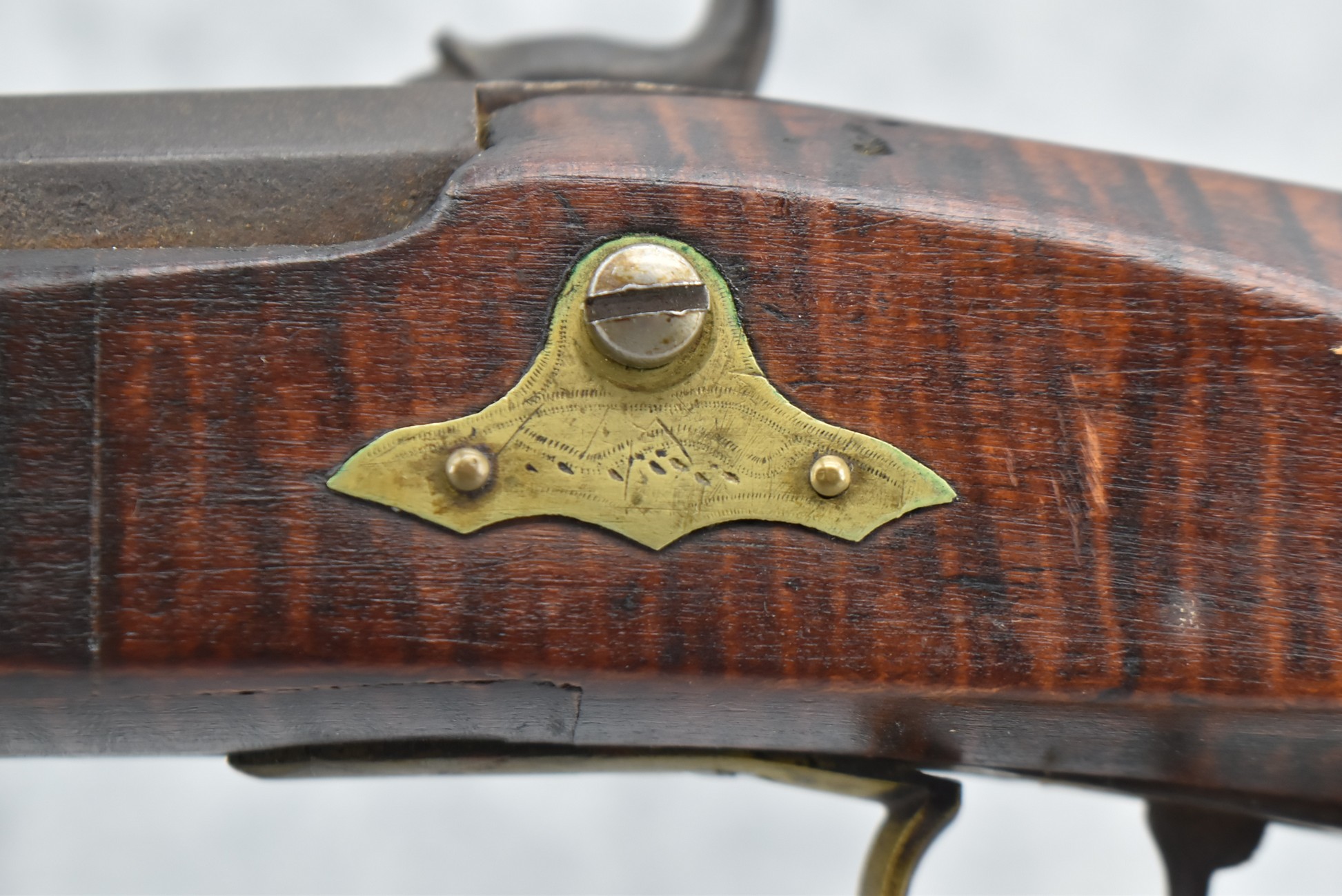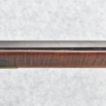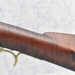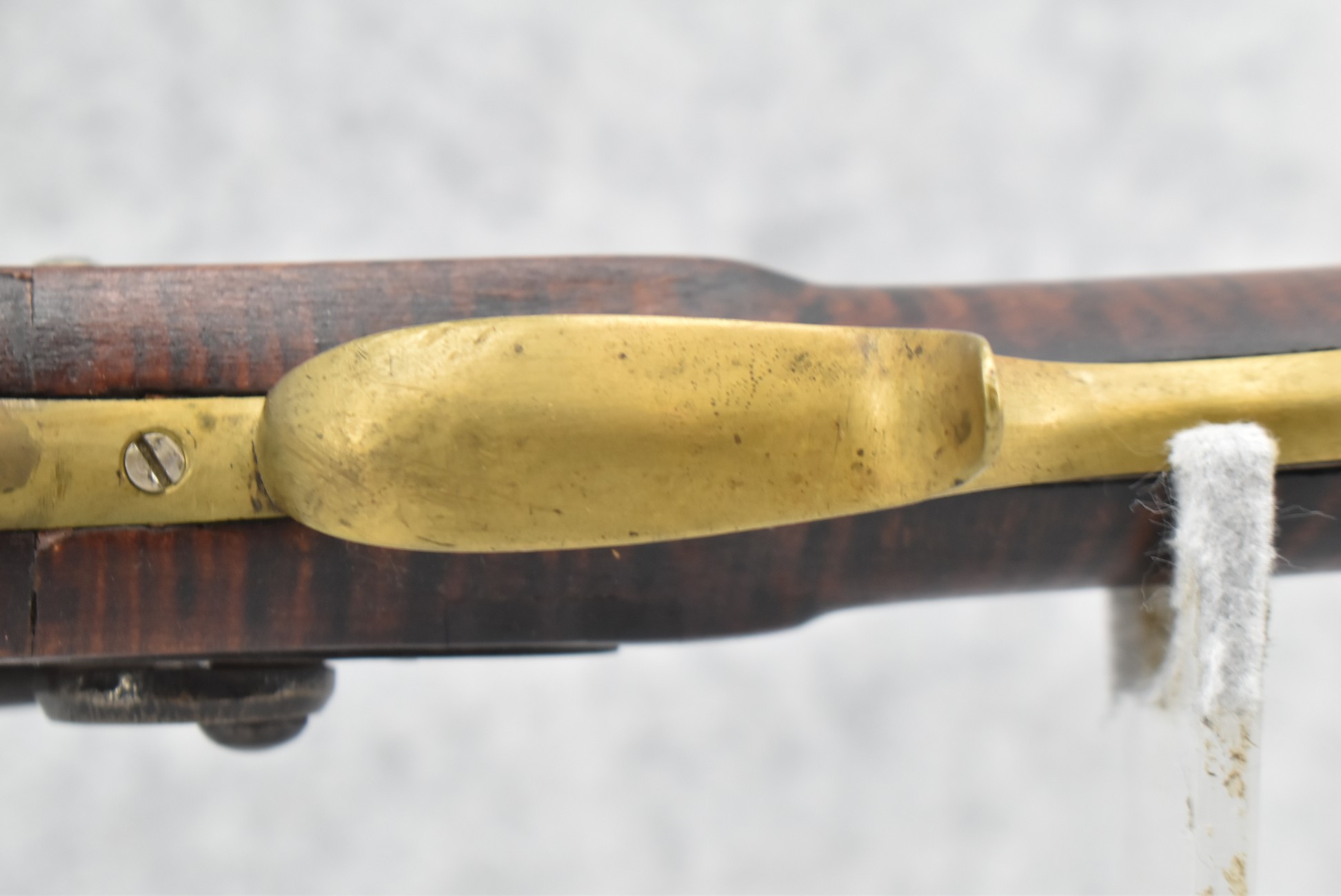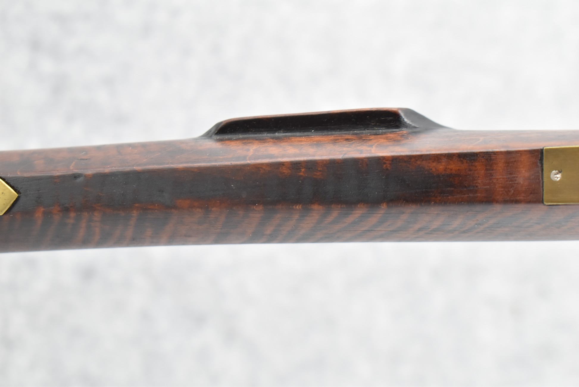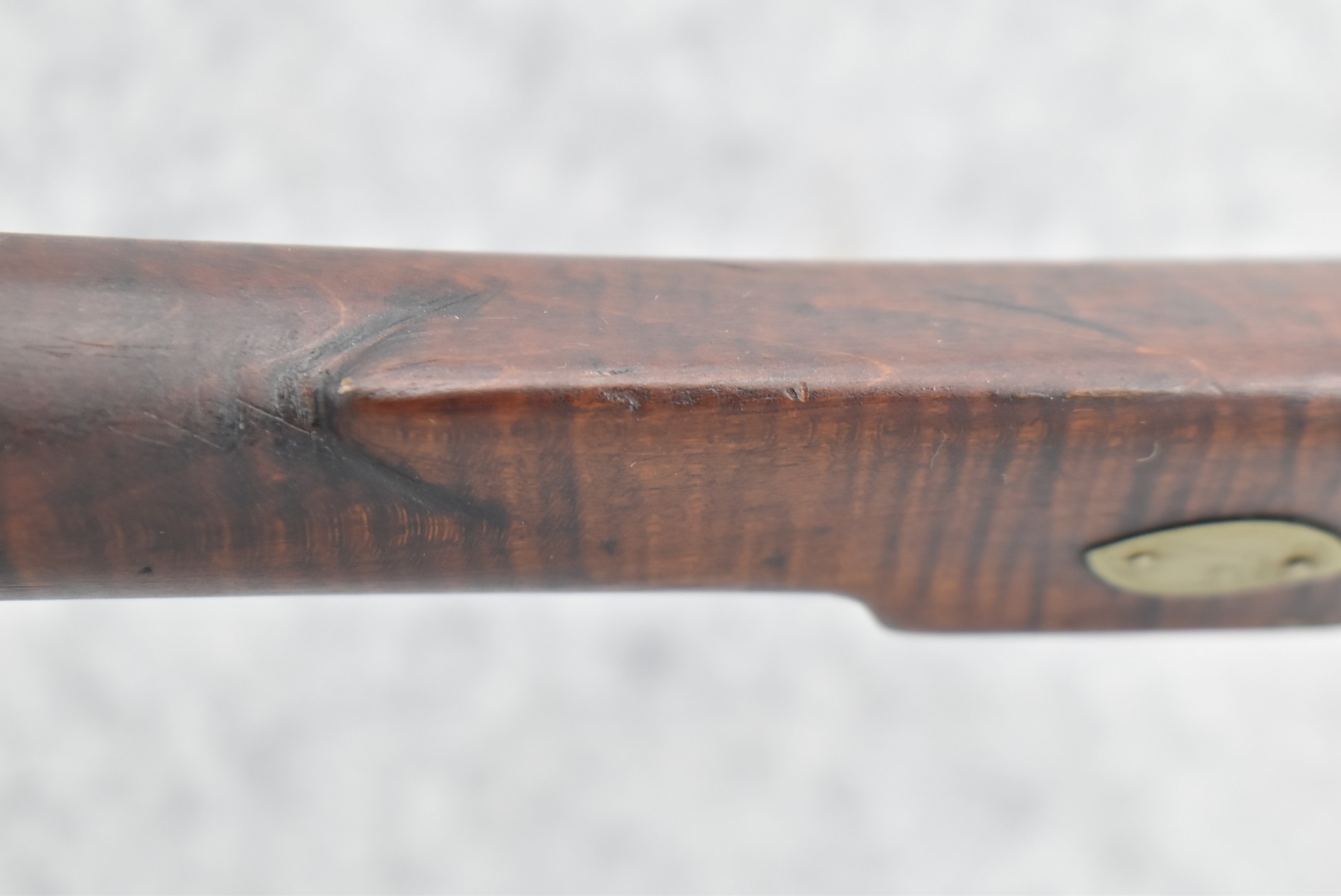 158. Unsigned 40 Cal. Tiger Maple Full Wood Stock Kentucky Long Rifle – w/38 ½” Octagon Barrel w/Front & Rear Barrel Sights – w/Brass Furniture – w/Small Oval Inlay on Cheek Piece – w/Double Set Triggers – Note: Parts of Fore Stock have been Replaced in Spots – Overall Length of 54”