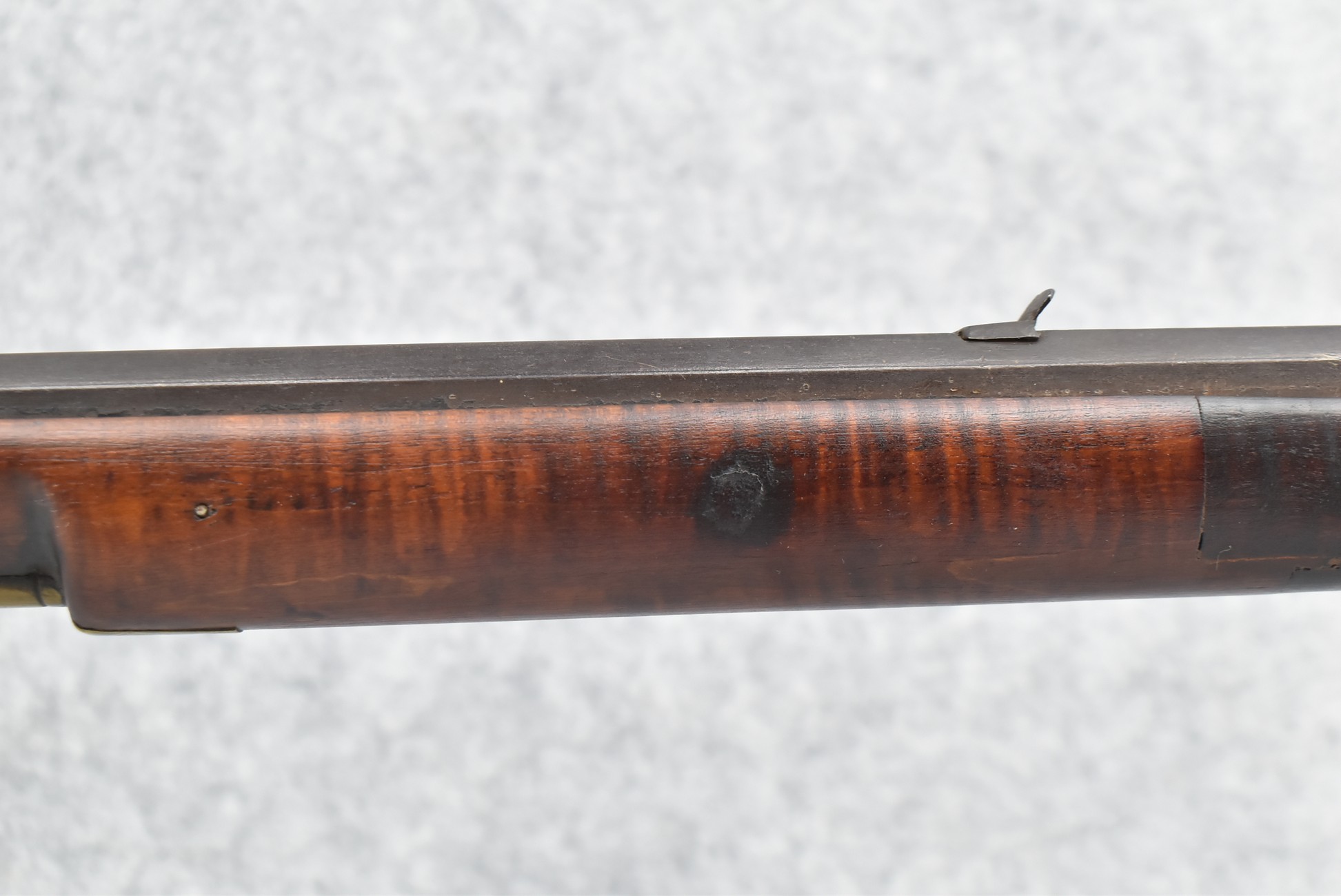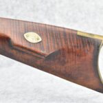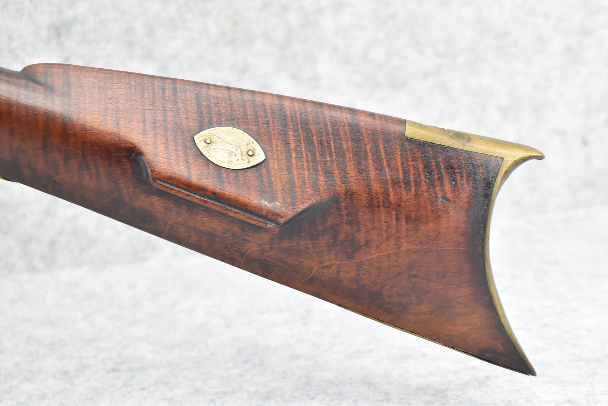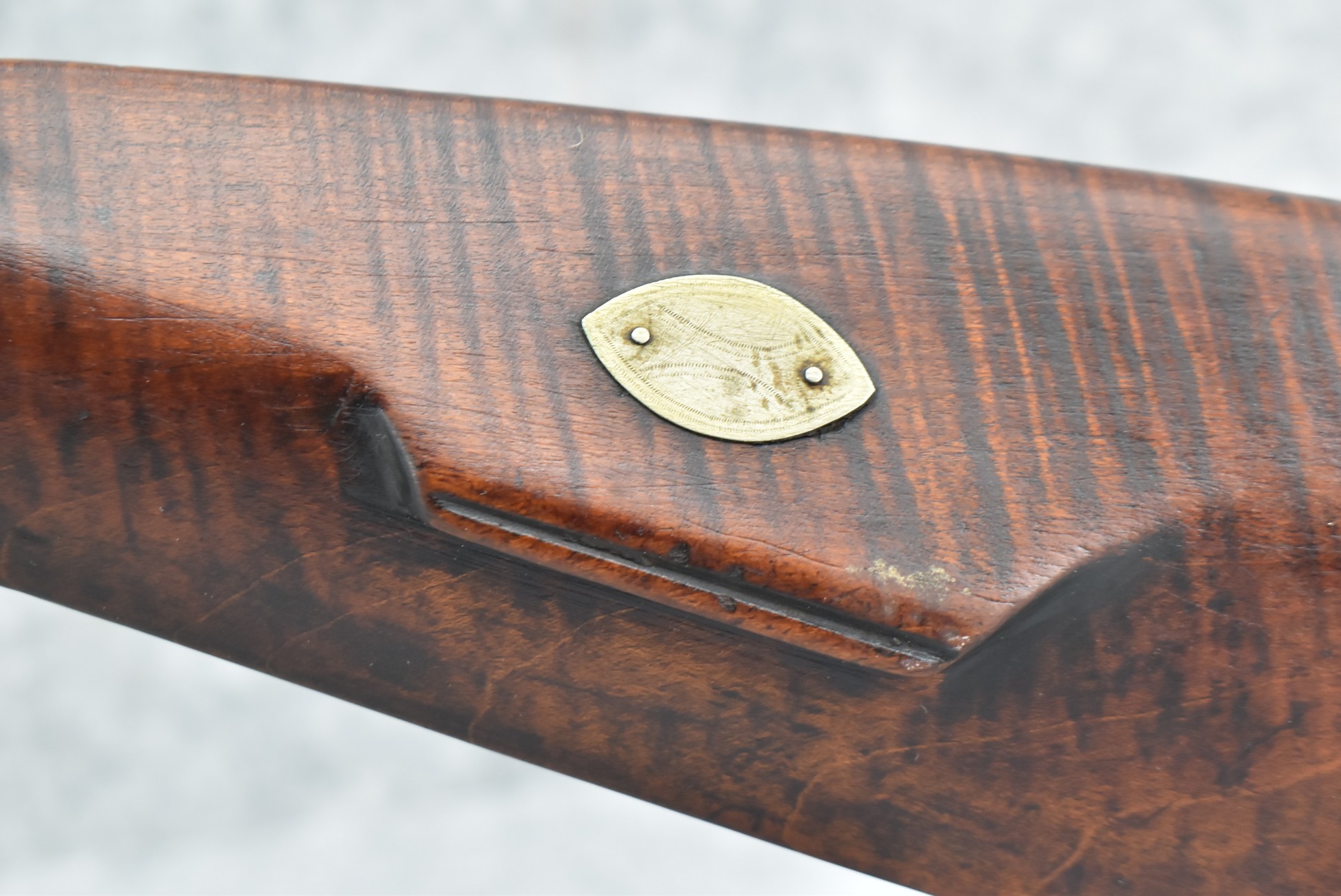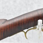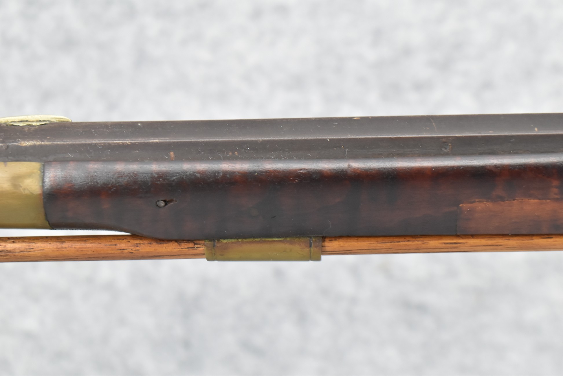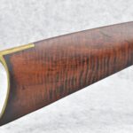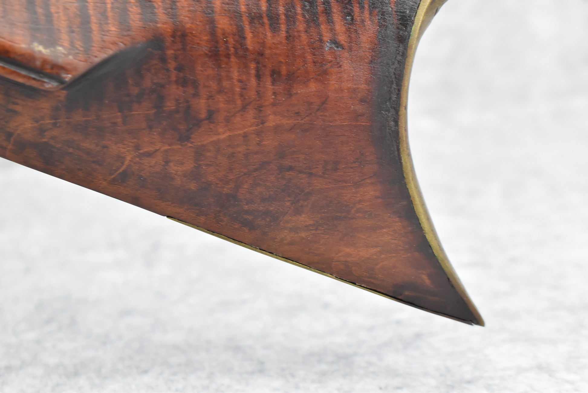 158. Unsigned 40 Cal. Tiger Maple Full Wood Stock Kentucky Long Rifle – w/38 ½” Octagon Barrel w/Front & Rear Barrel Sights – w/Brass Furniture – w/Small Oval Inlay on Cheek Piece – w/Double Set Triggers – Note: Parts of Fore Stock have been Replaced in Spots – Overall Length of 54”