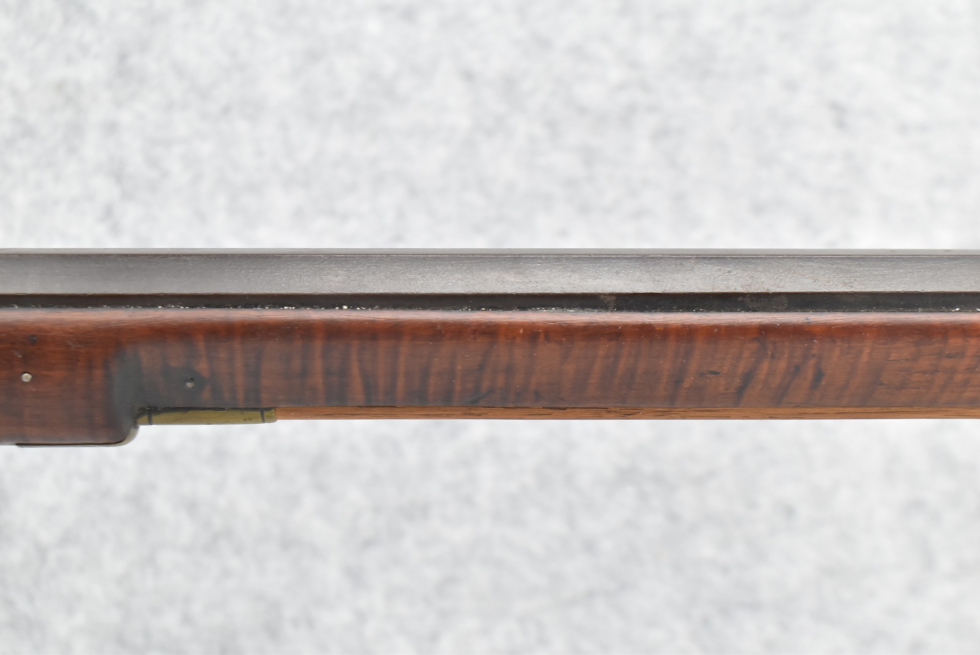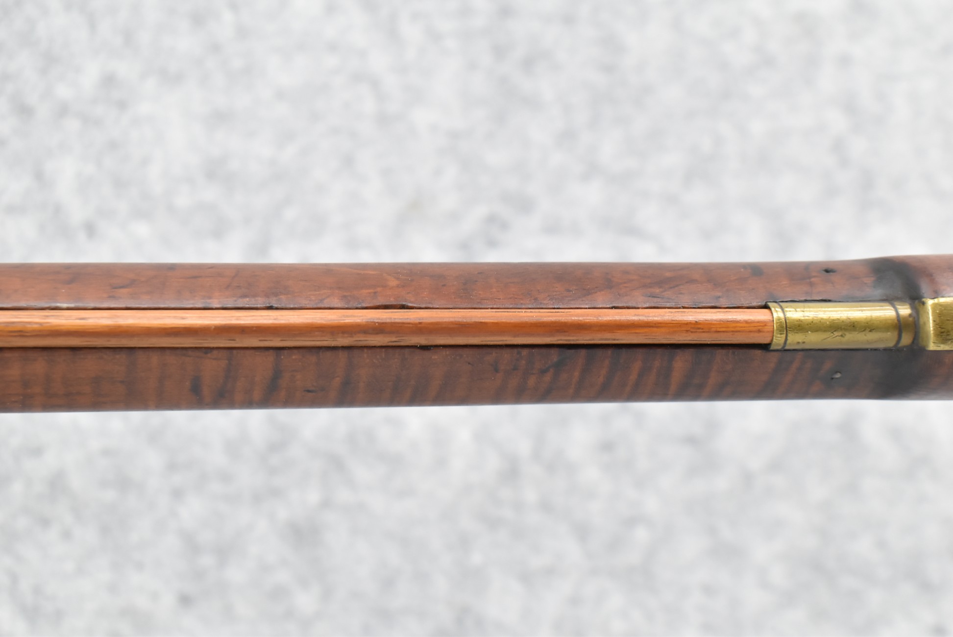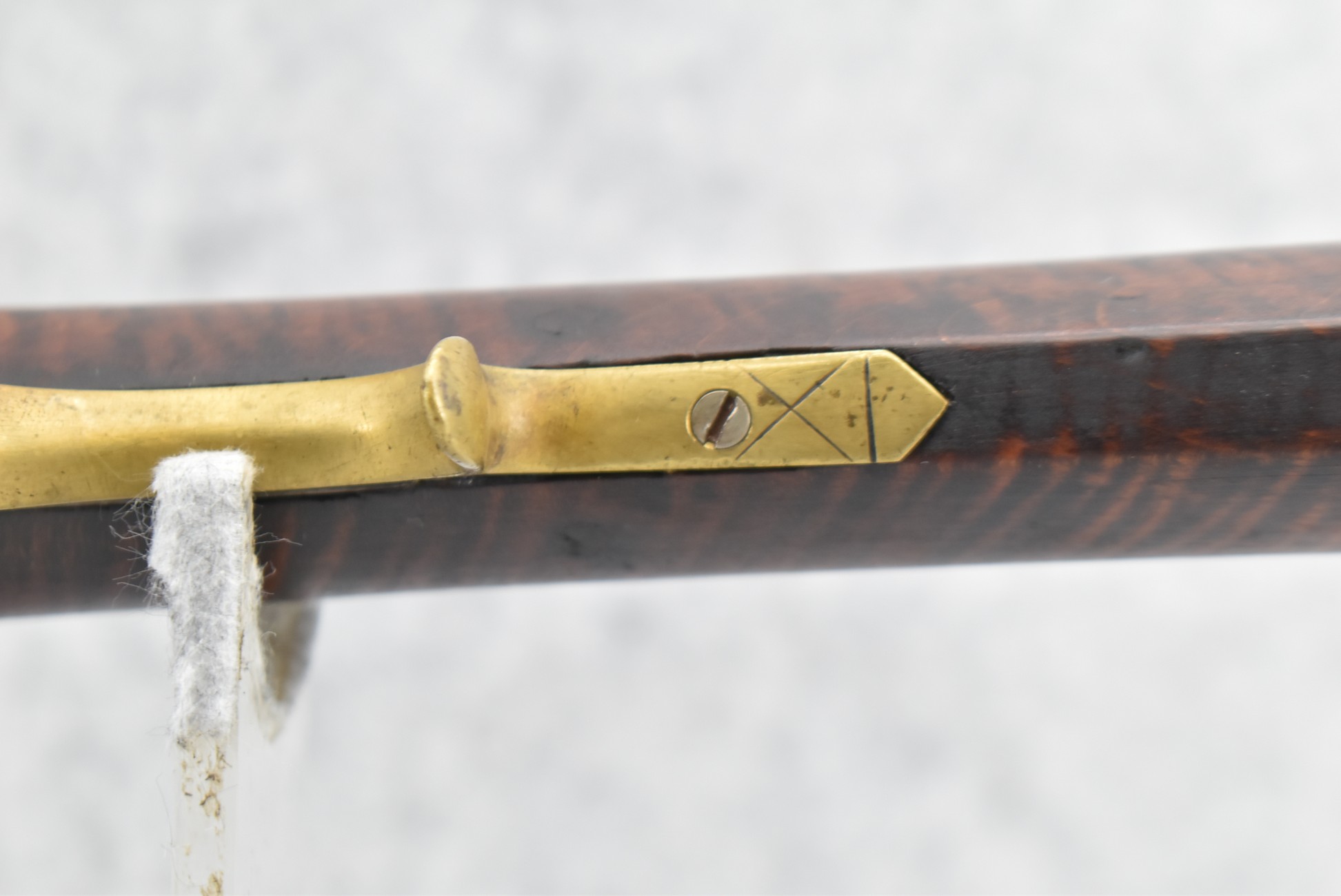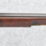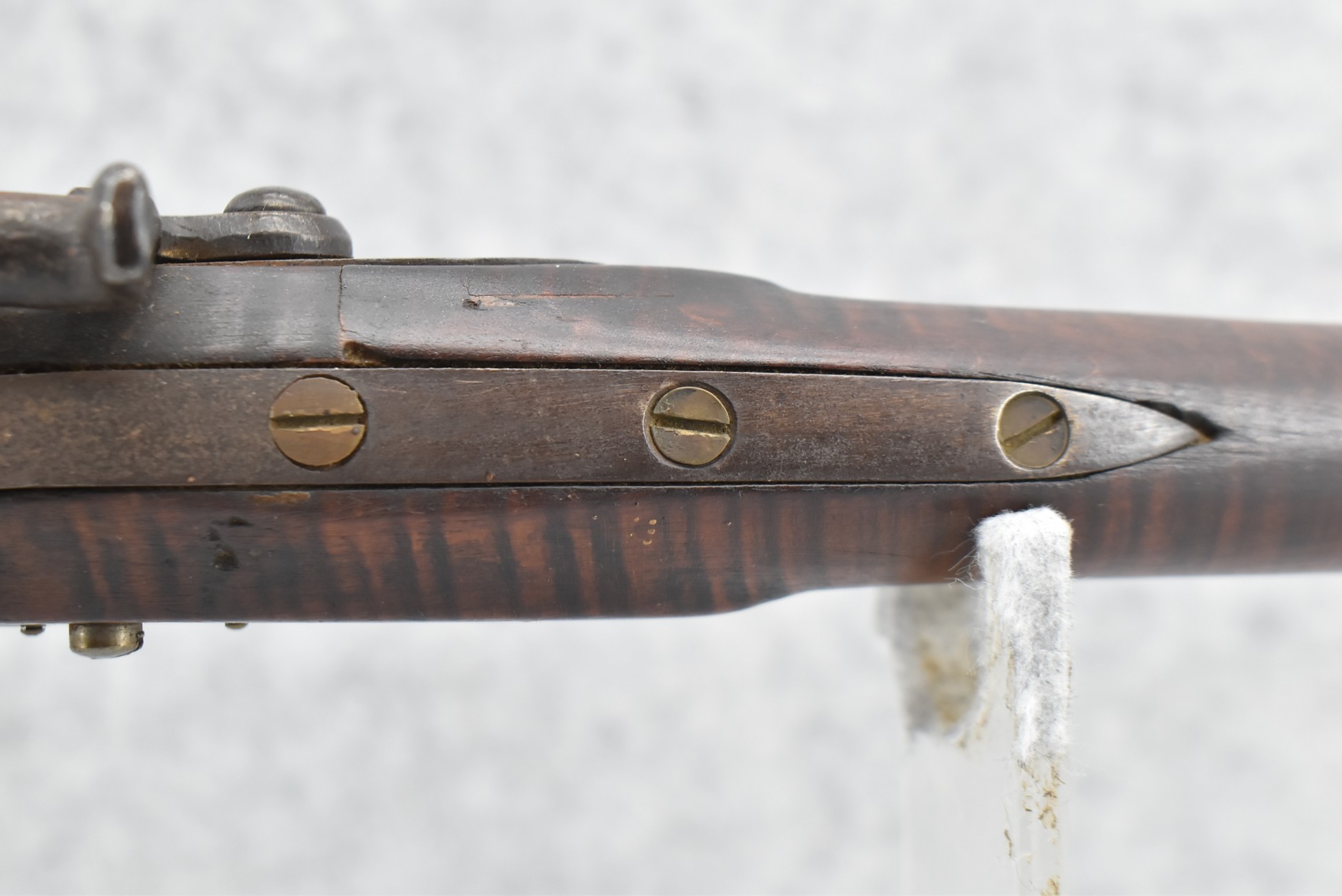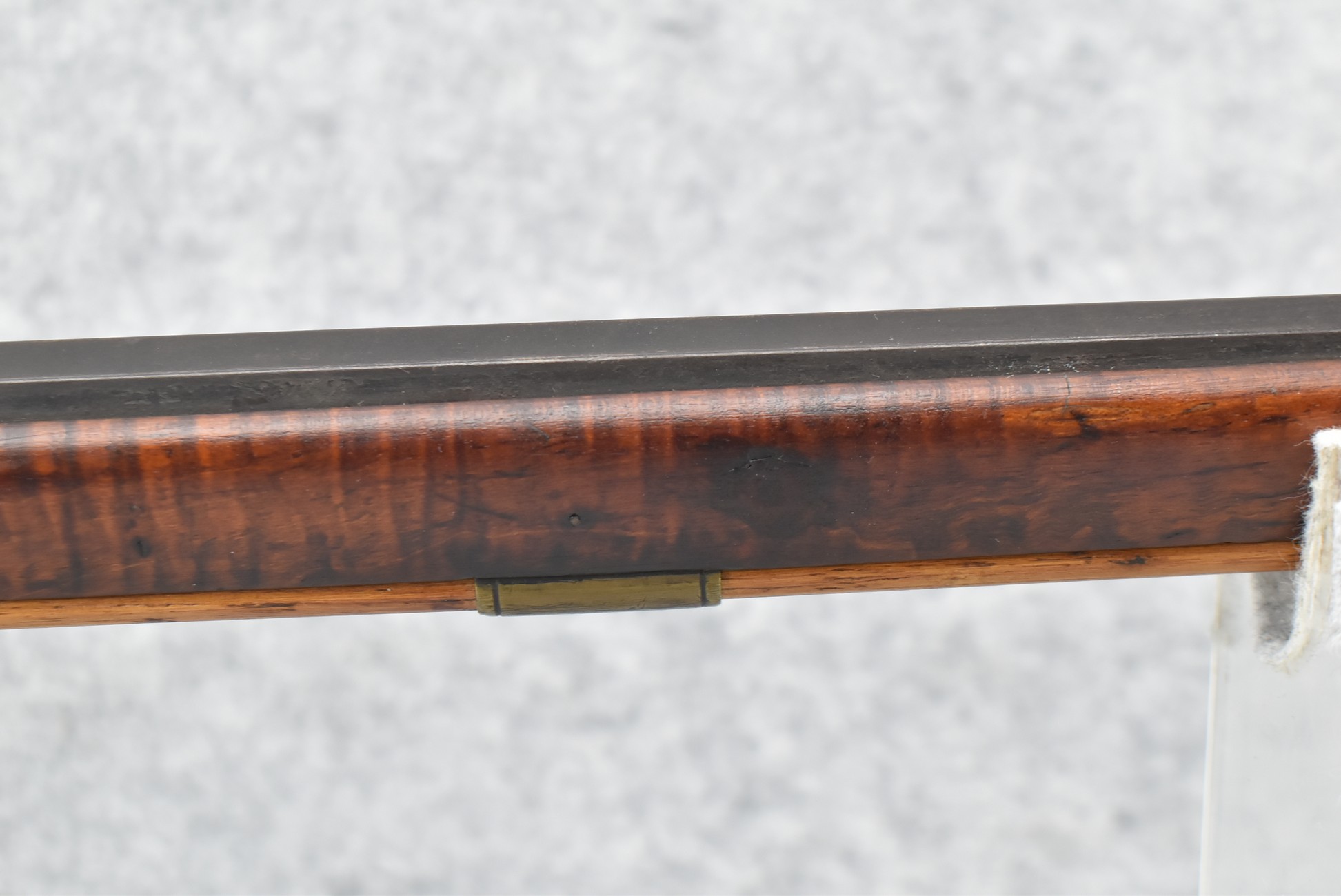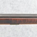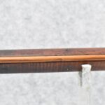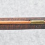158. Unsigned 40 Cal. Tiger Maple Full Wood Stock Kentucky Long Rifle – w/38 ½” Octagon Barrel w/Front & Rear Barrel Sights – w/Brass Furniture – w/Small Oval Inlay on Cheek Piece – w/Double Set Triggers – Note: Parts of Fore Stock have been Replaced in Spots – Overall Length of 54”