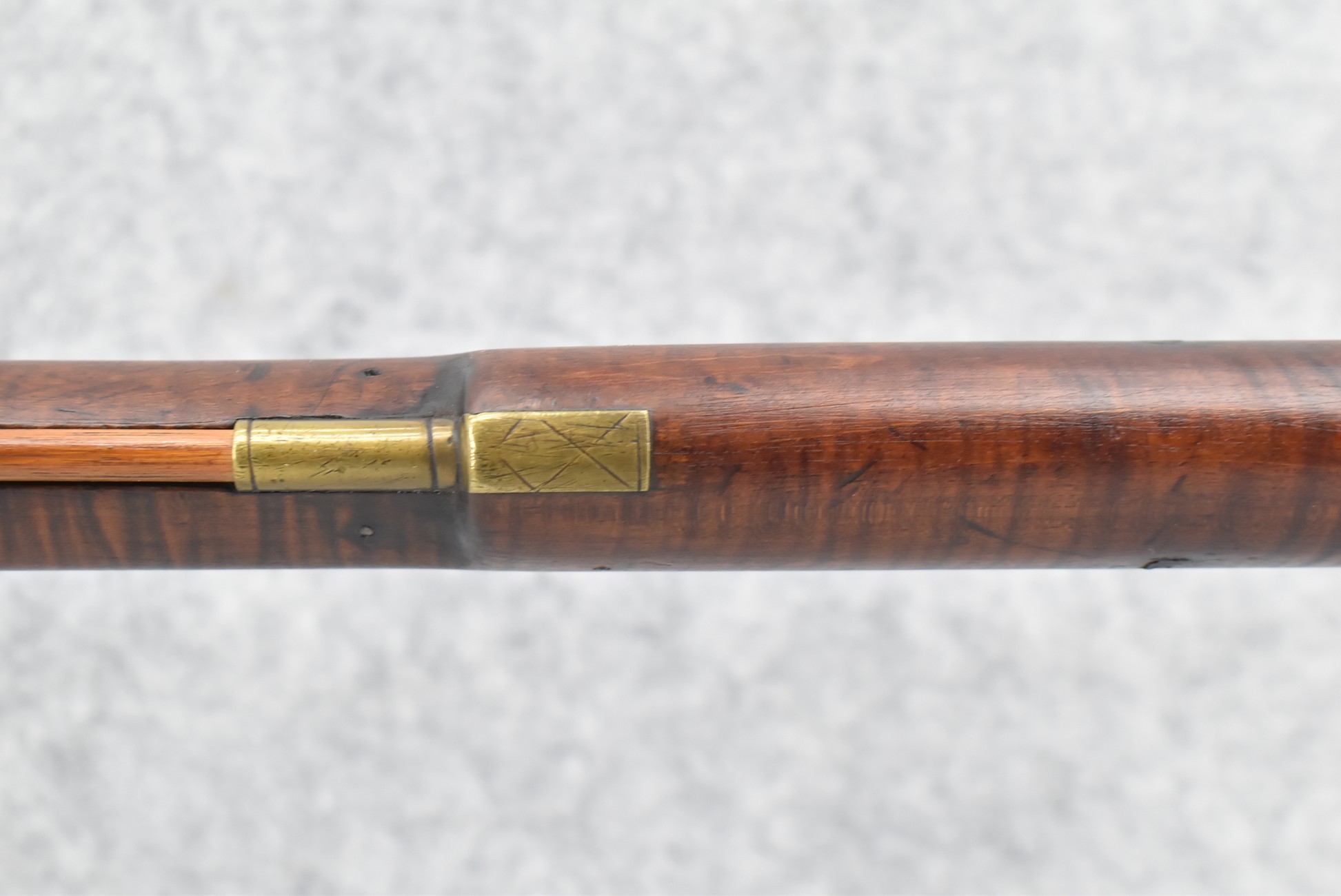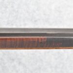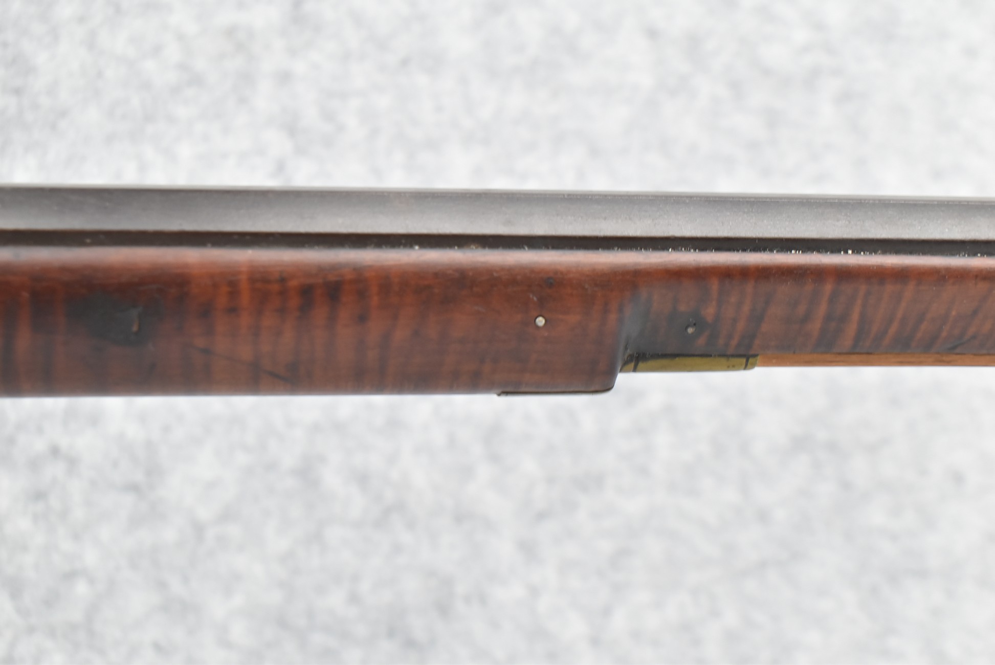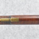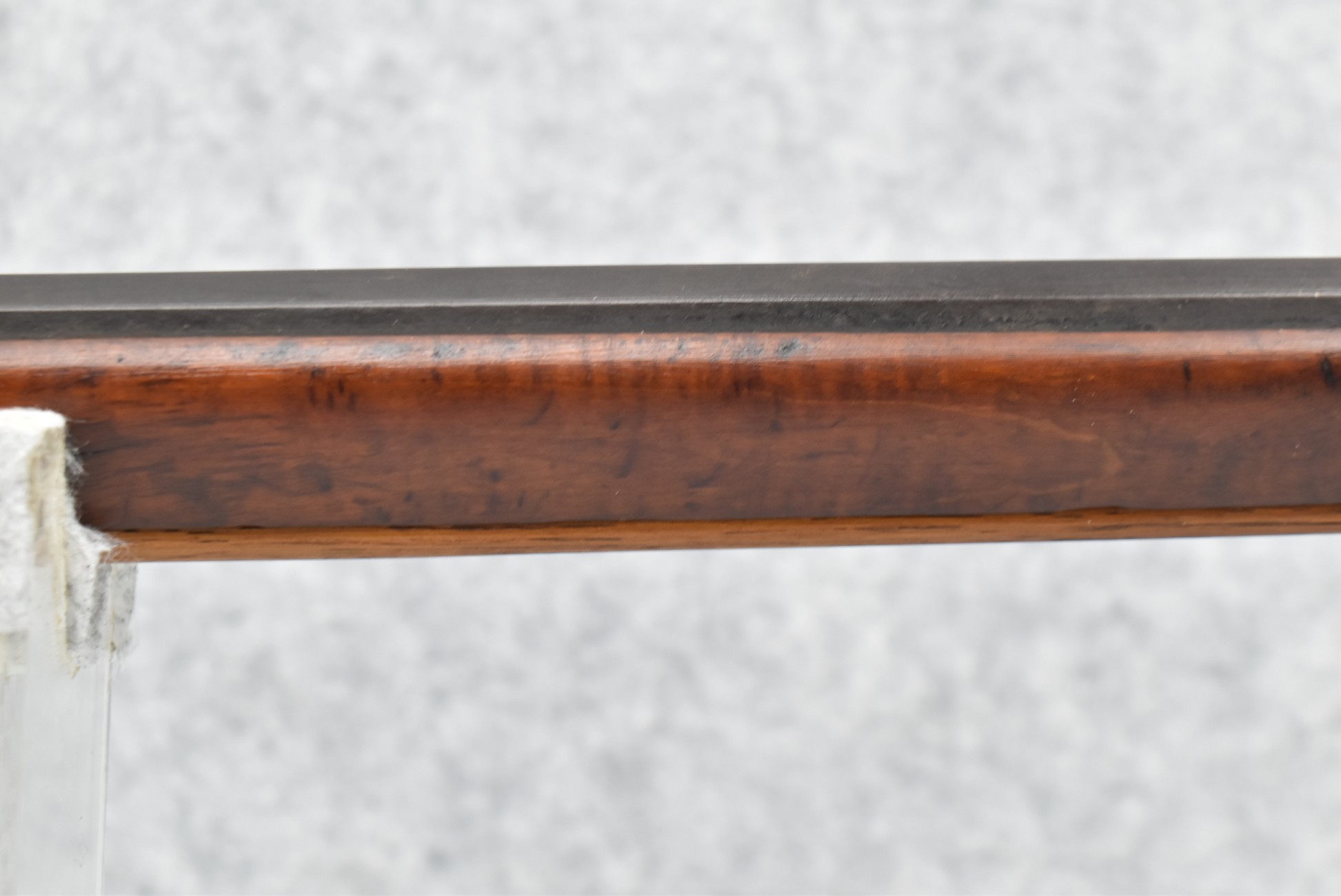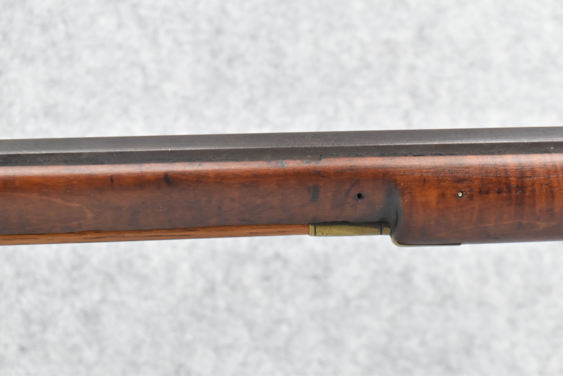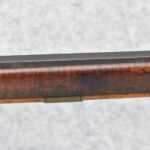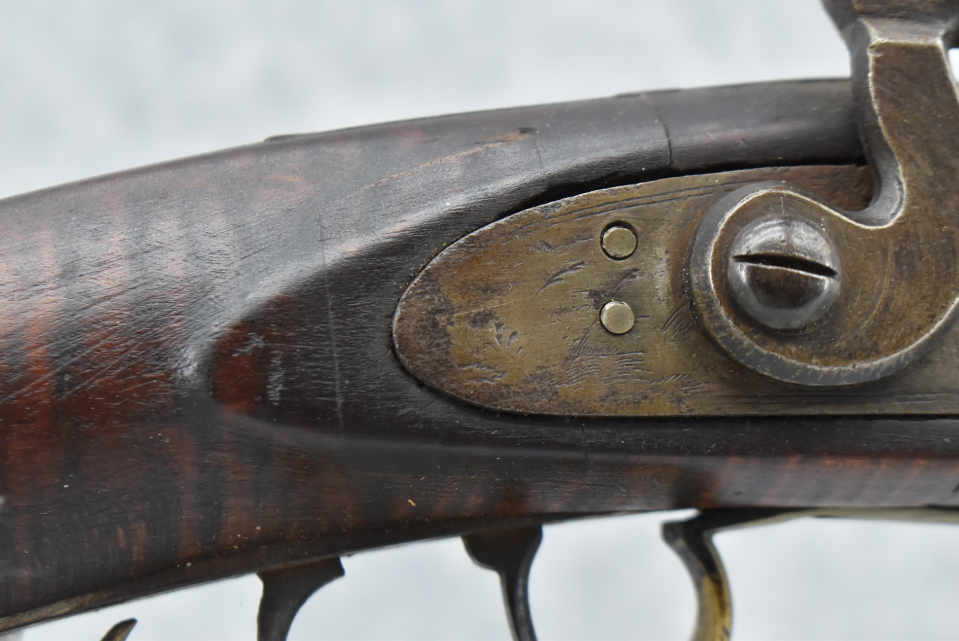 158. Unsigned 40 Cal. Tiger Maple Full Wood Stock Kentucky Long Rifle – w/38 ½” Octagon Barrel w/Front & Rear Barrel Sights – w/Brass Furniture – w/Small Oval Inlay on Cheek Piece – w/Double Set Triggers – Note: Parts of Fore Stock have been Replaced in Spots – Overall Length of 54”