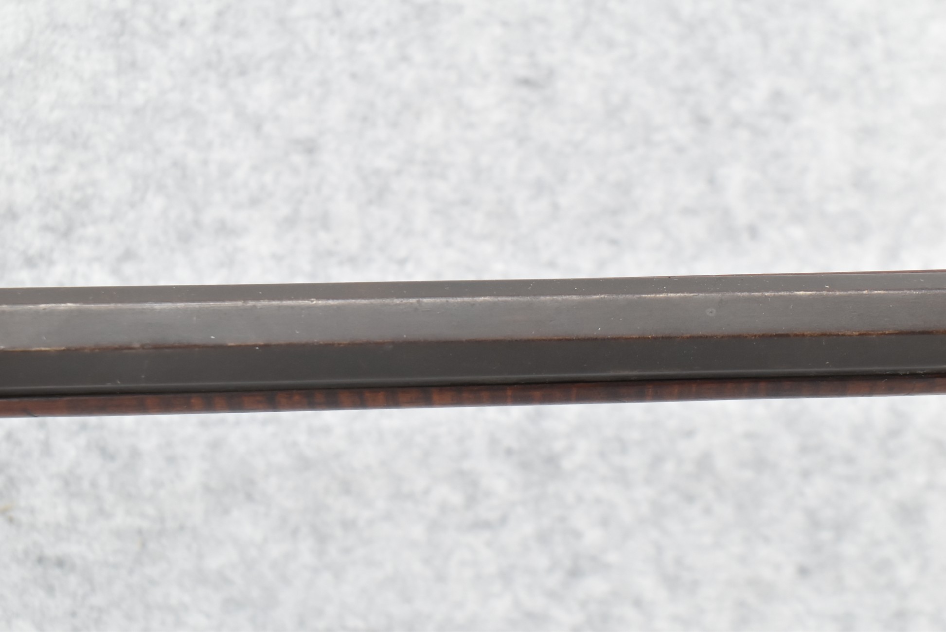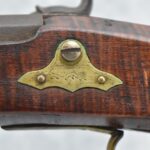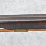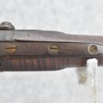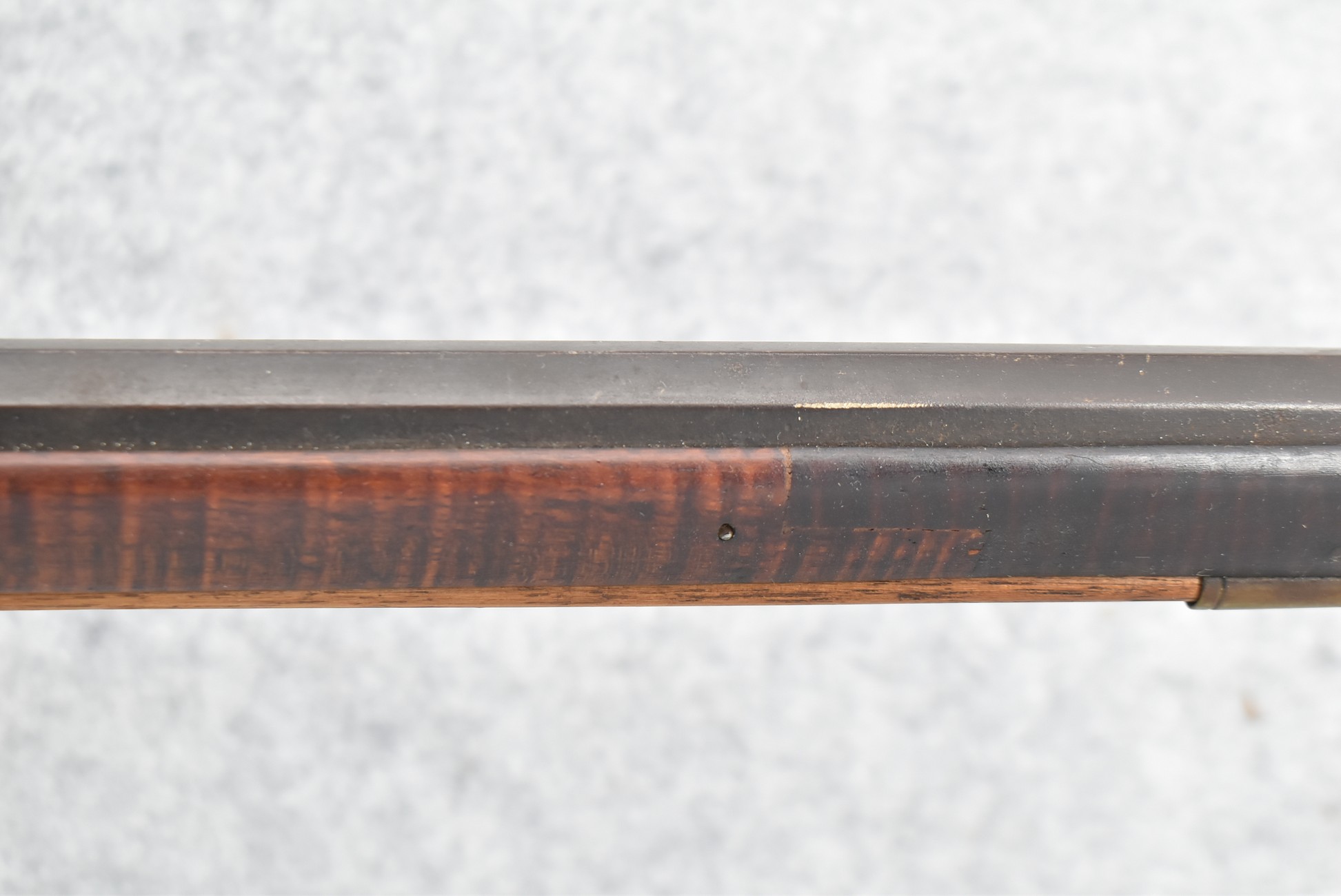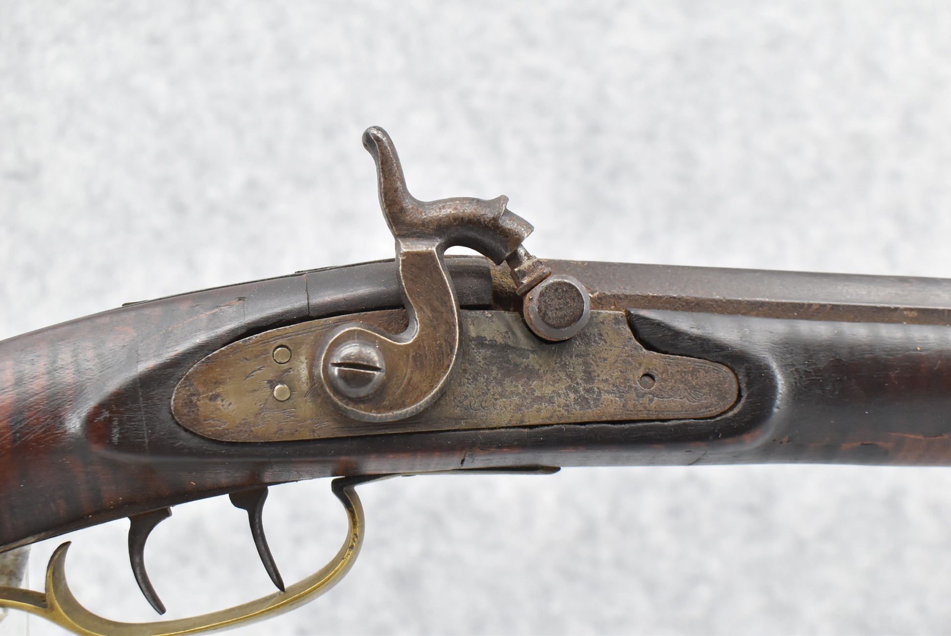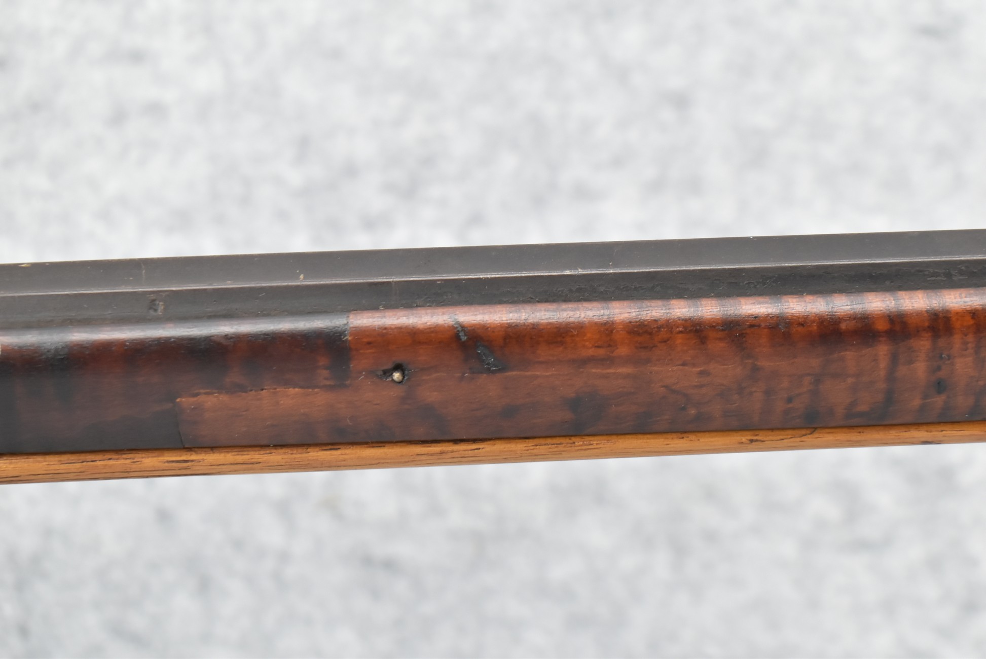 158. Unsigned 40 Cal. Tiger Maple Full Wood Stock Kentucky Long Rifle – w/38 ½” Octagon Barrel w/Front & Rear Barrel Sights – w/Brass Furniture – w/Small Oval Inlay on Cheek Piece – w/Double Set Triggers – Note: Parts of Fore Stock have been Replaced in Spots – Overall Length of 54”