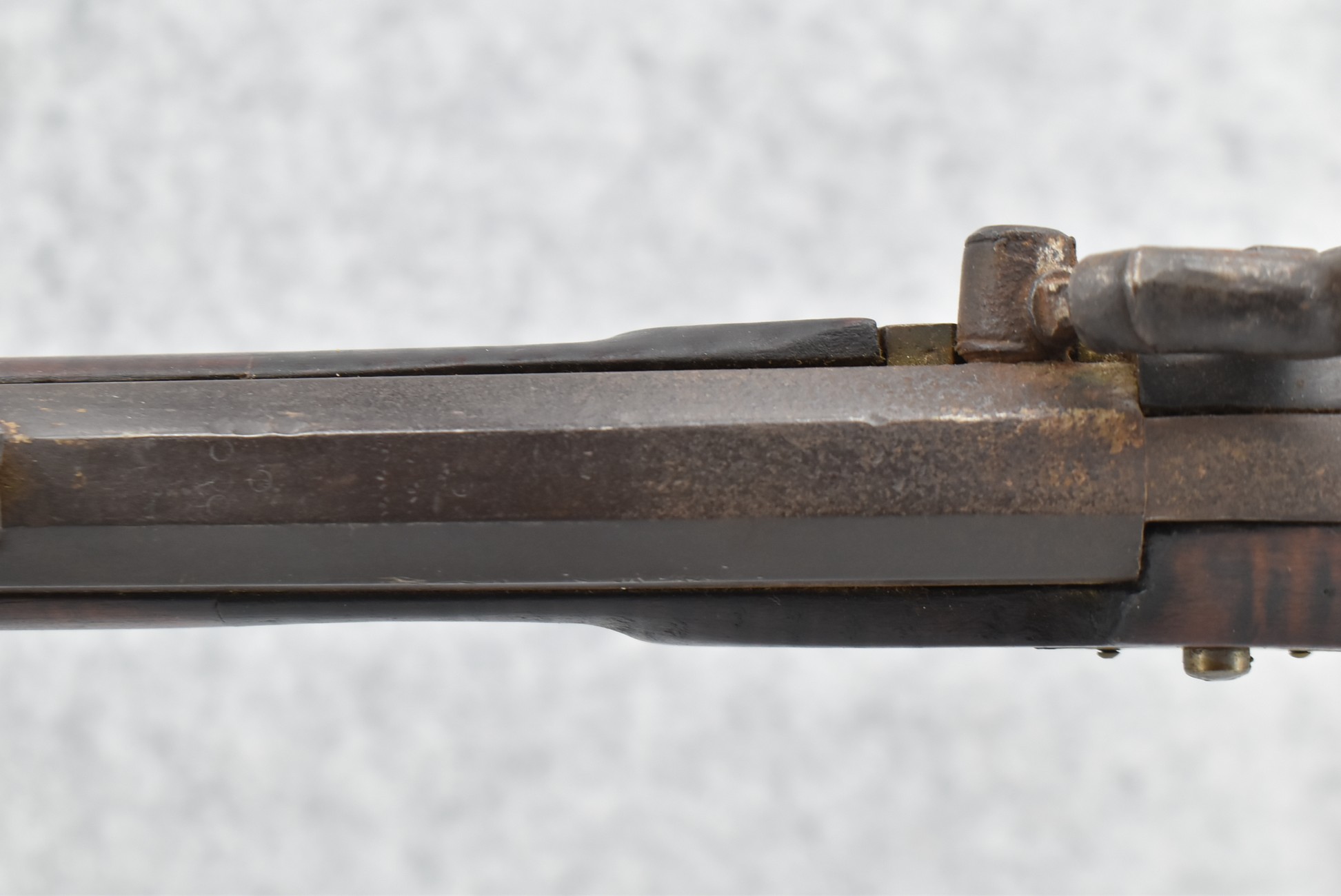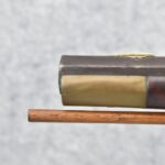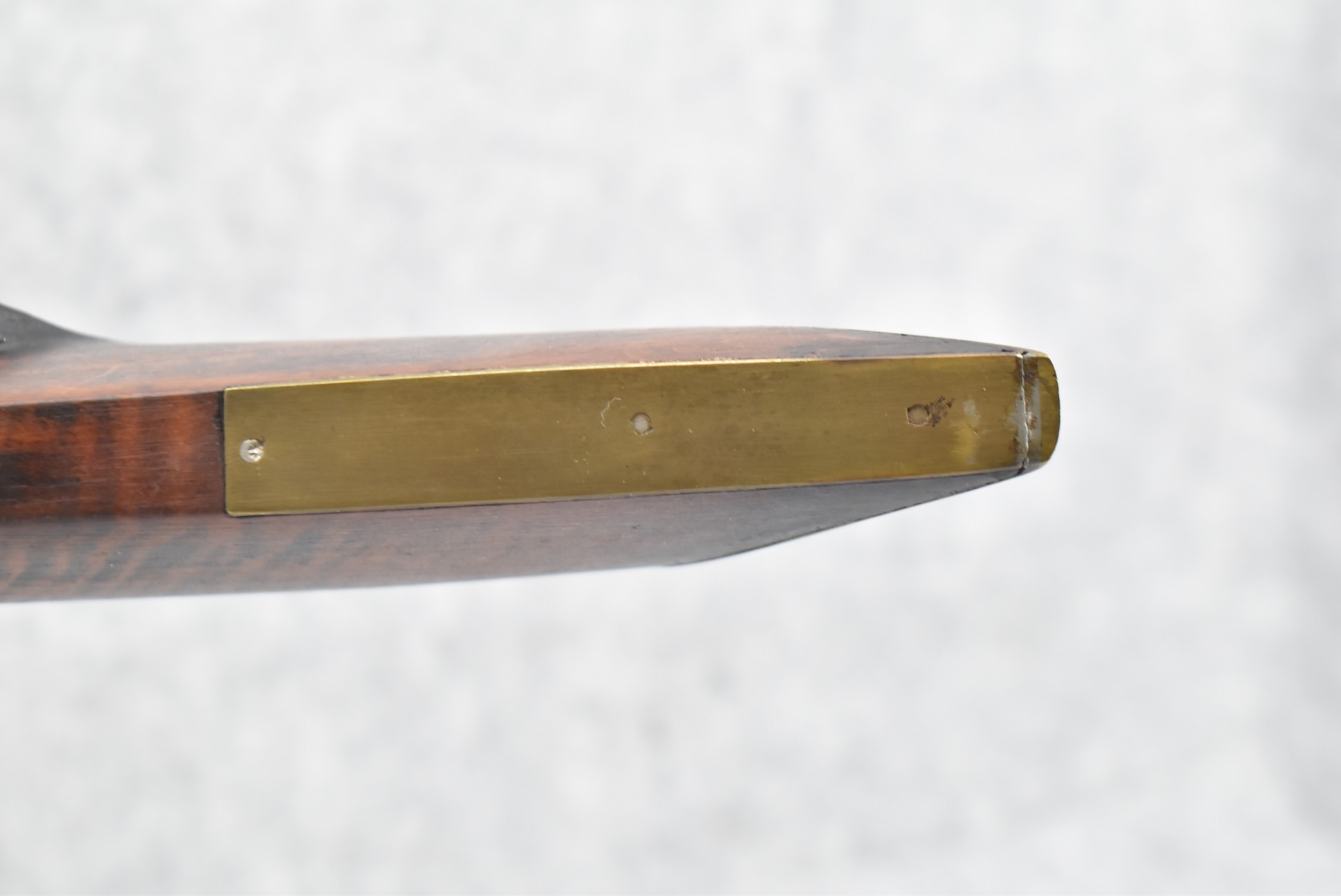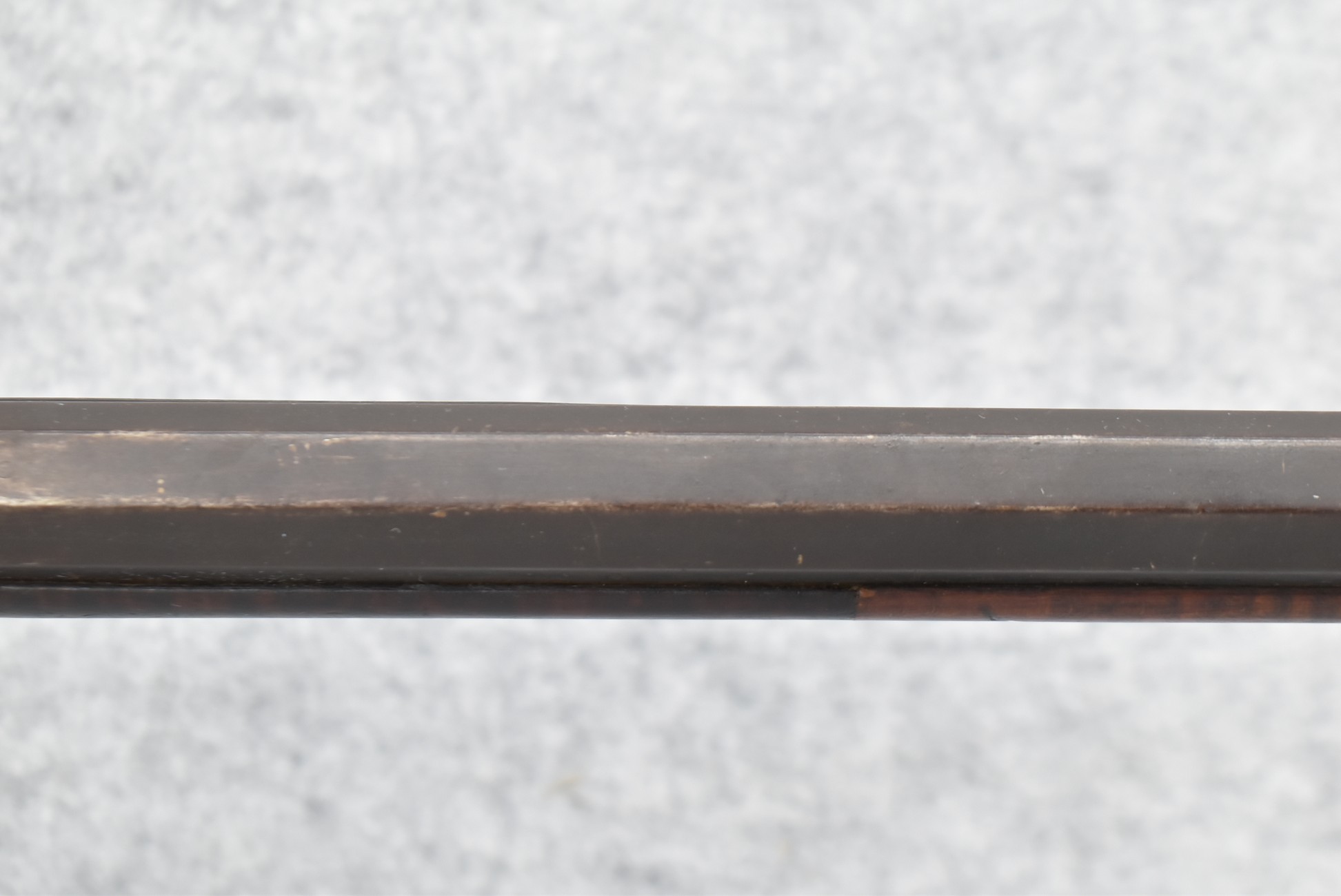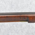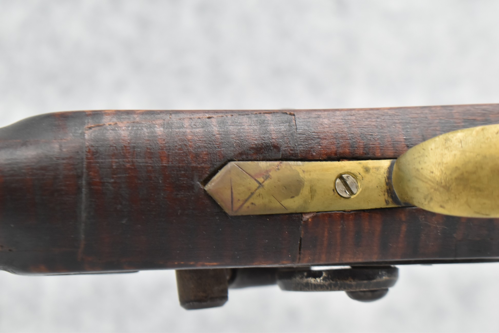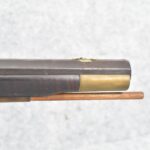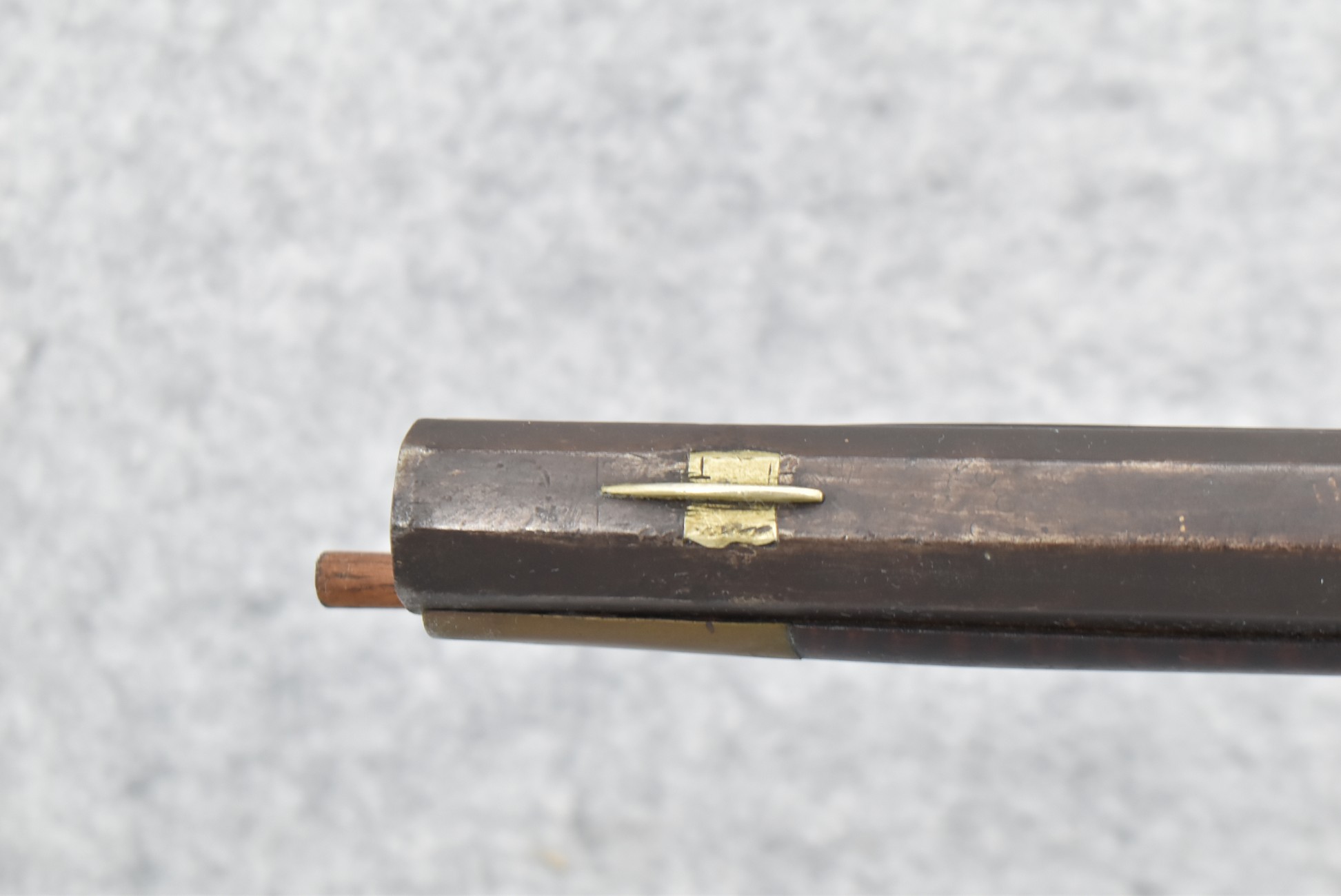 158. Unsigned 40 Cal. Tiger Maple Full Wood Stock Kentucky Long Rifle – w/38 ½” Octagon Barrel w/Front & Rear Barrel Sights – w/Brass Furniture – w/Small Oval Inlay on Cheek Piece – w/Double Set Triggers – Note: Parts of Fore Stock have been Replaced in Spots – Overall Length of 54”