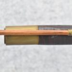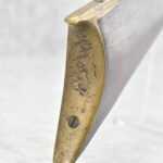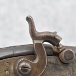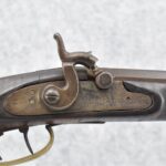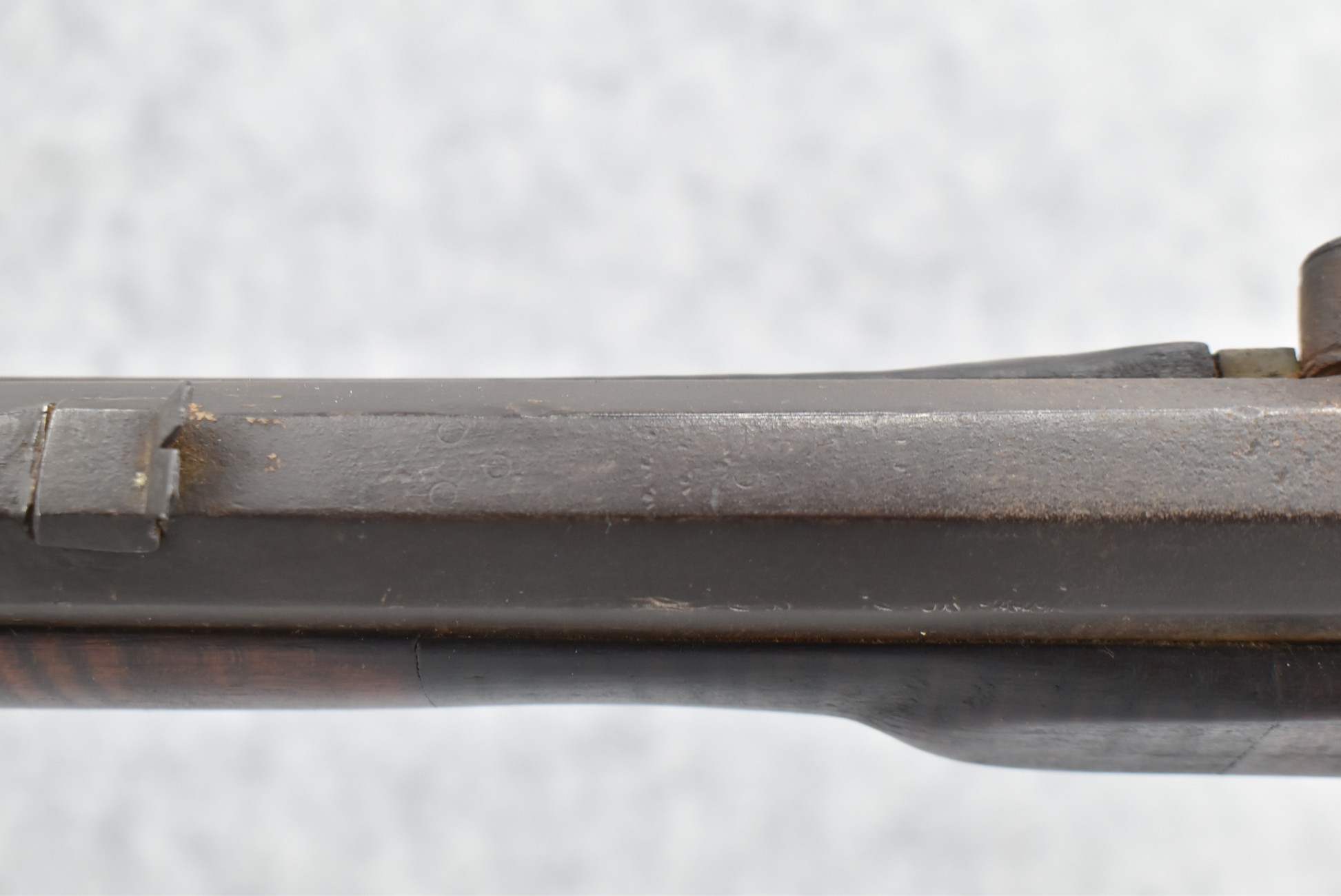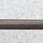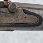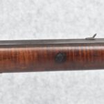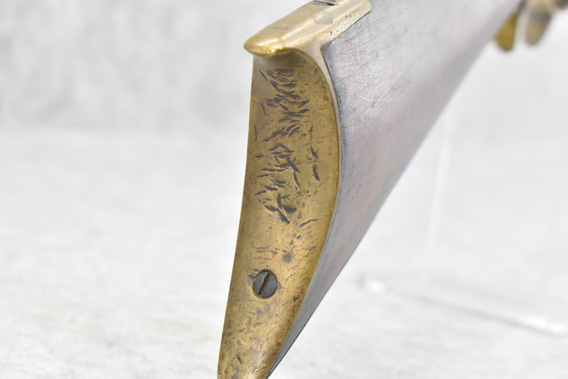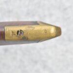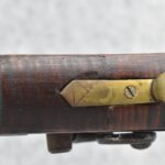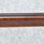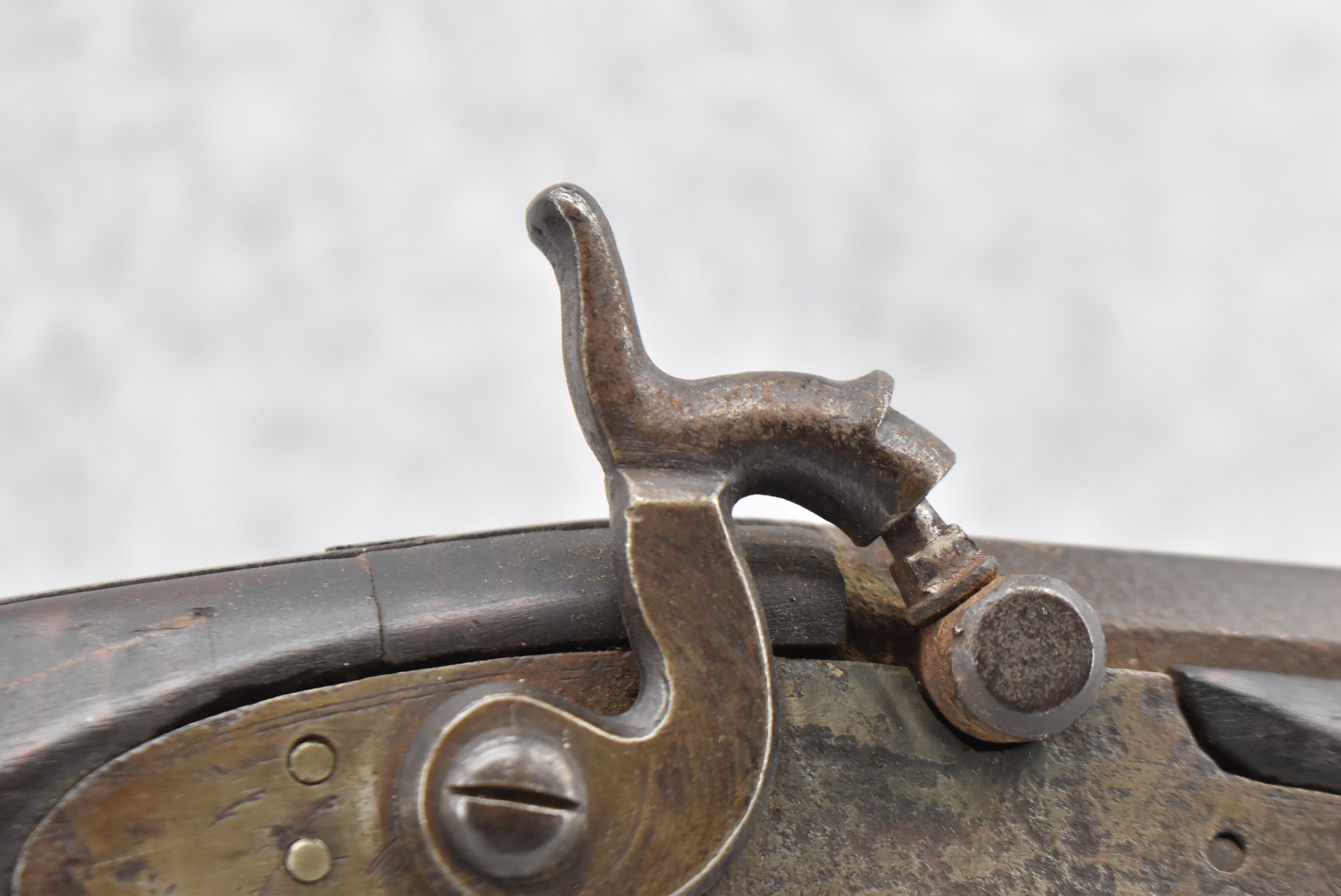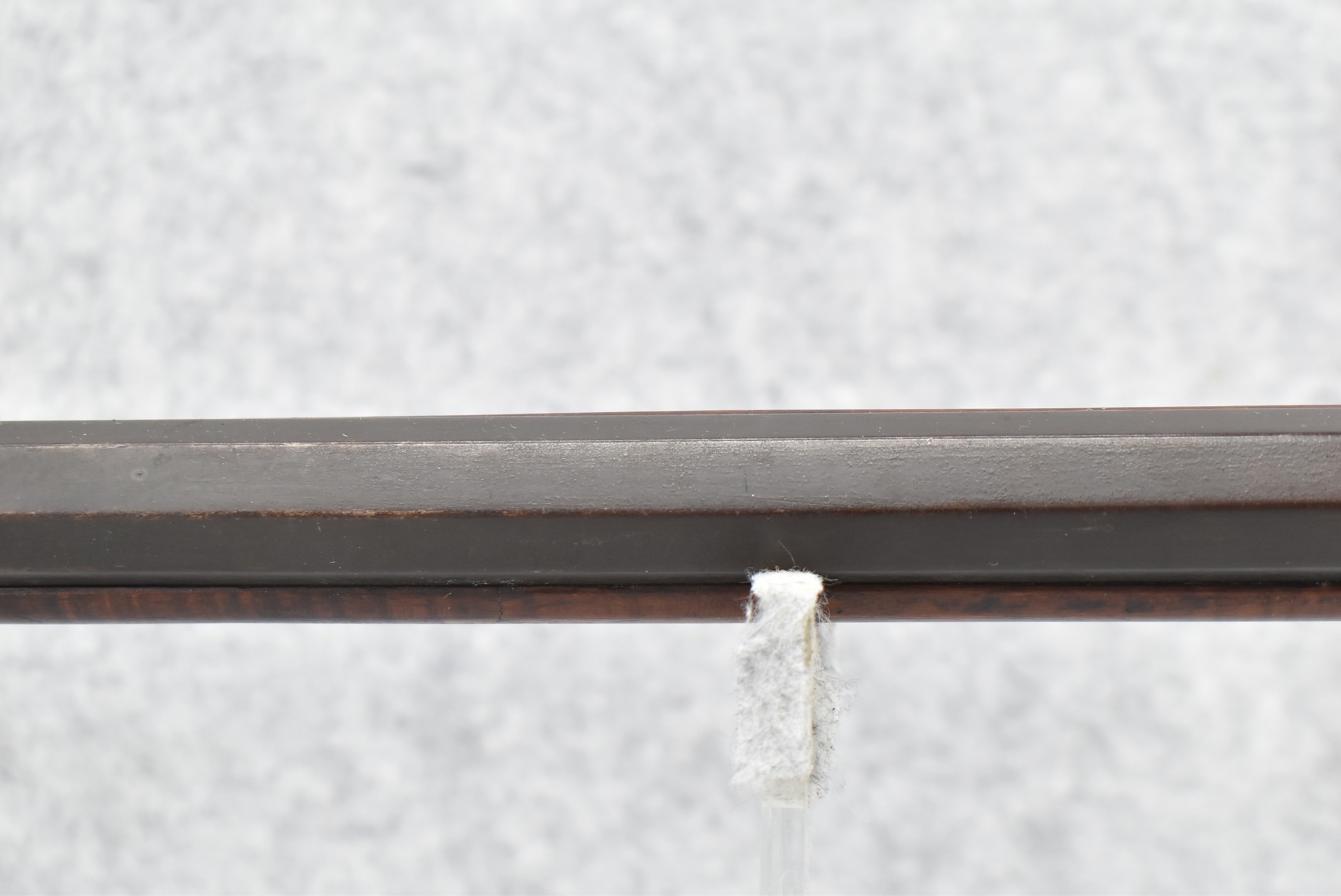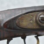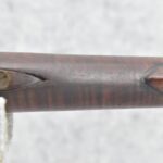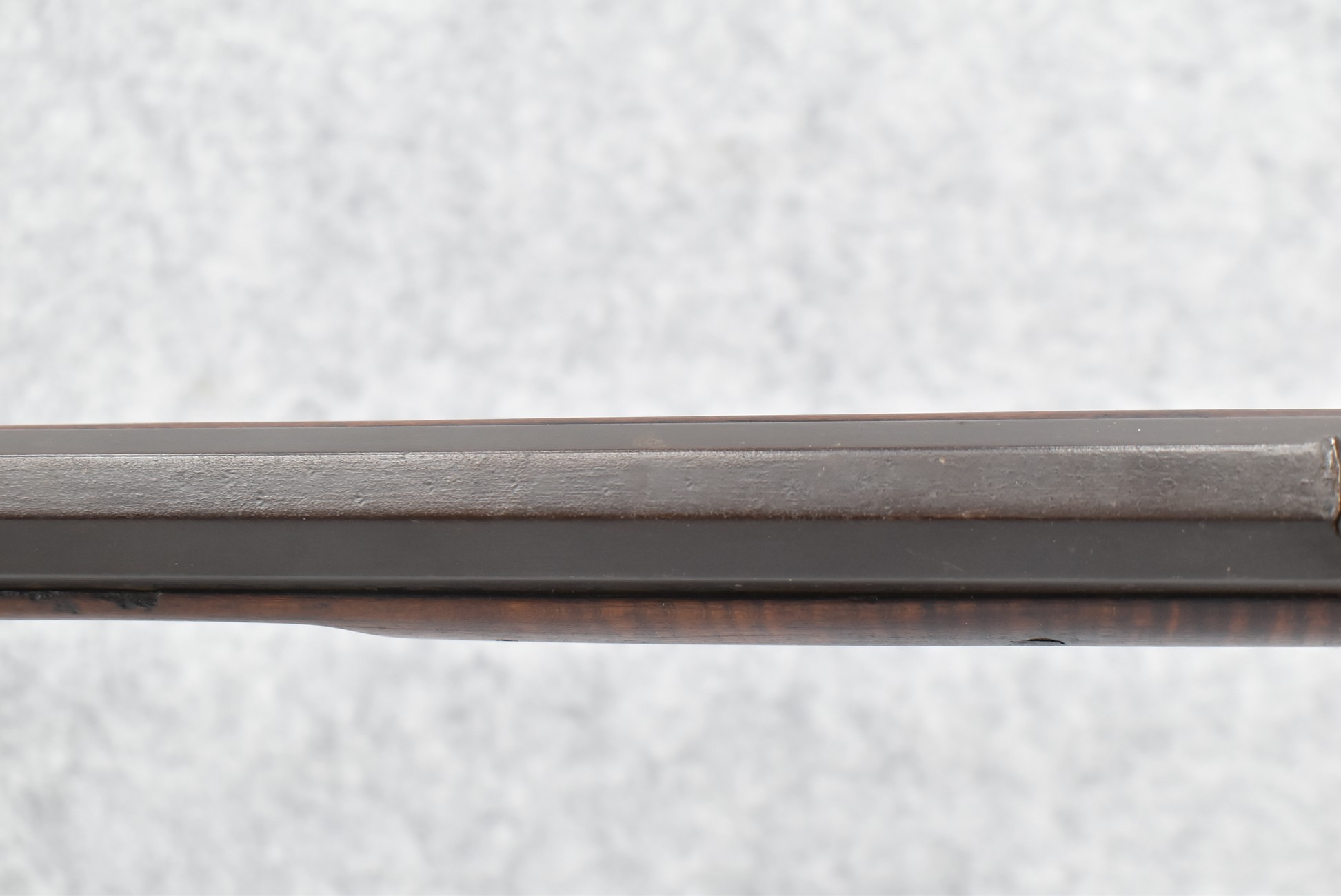 158. Unsigned 40 Cal. Tiger Maple Full Wood Stock Kentucky Long Rifle – w/38 ½” Octagon Barrel w/Front & Rear Barrel Sights – w/Brass Furniture – w/Small Oval Inlay on Cheek Piece – w/Double Set Triggers – Note: Parts of Fore Stock have been Replaced in Spots – Overall Length of 54”