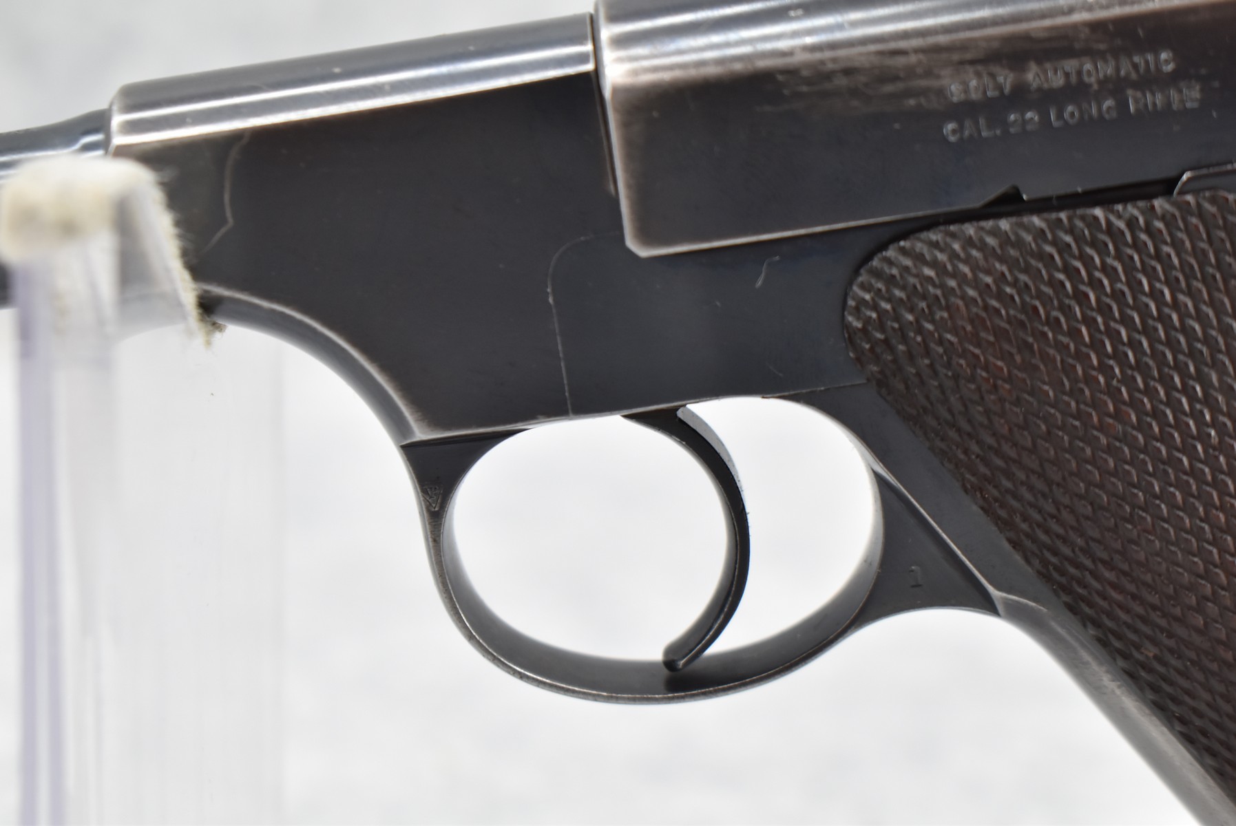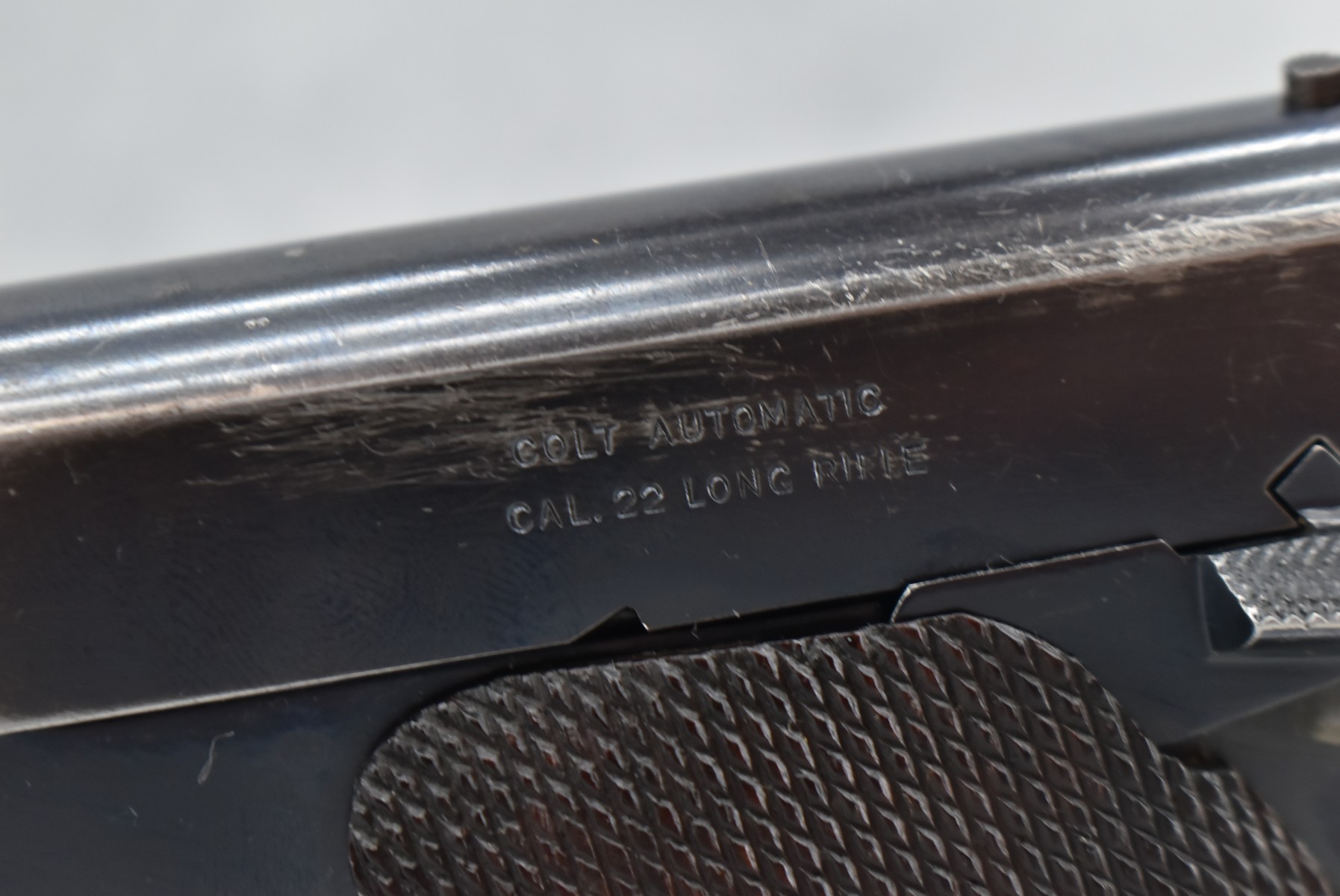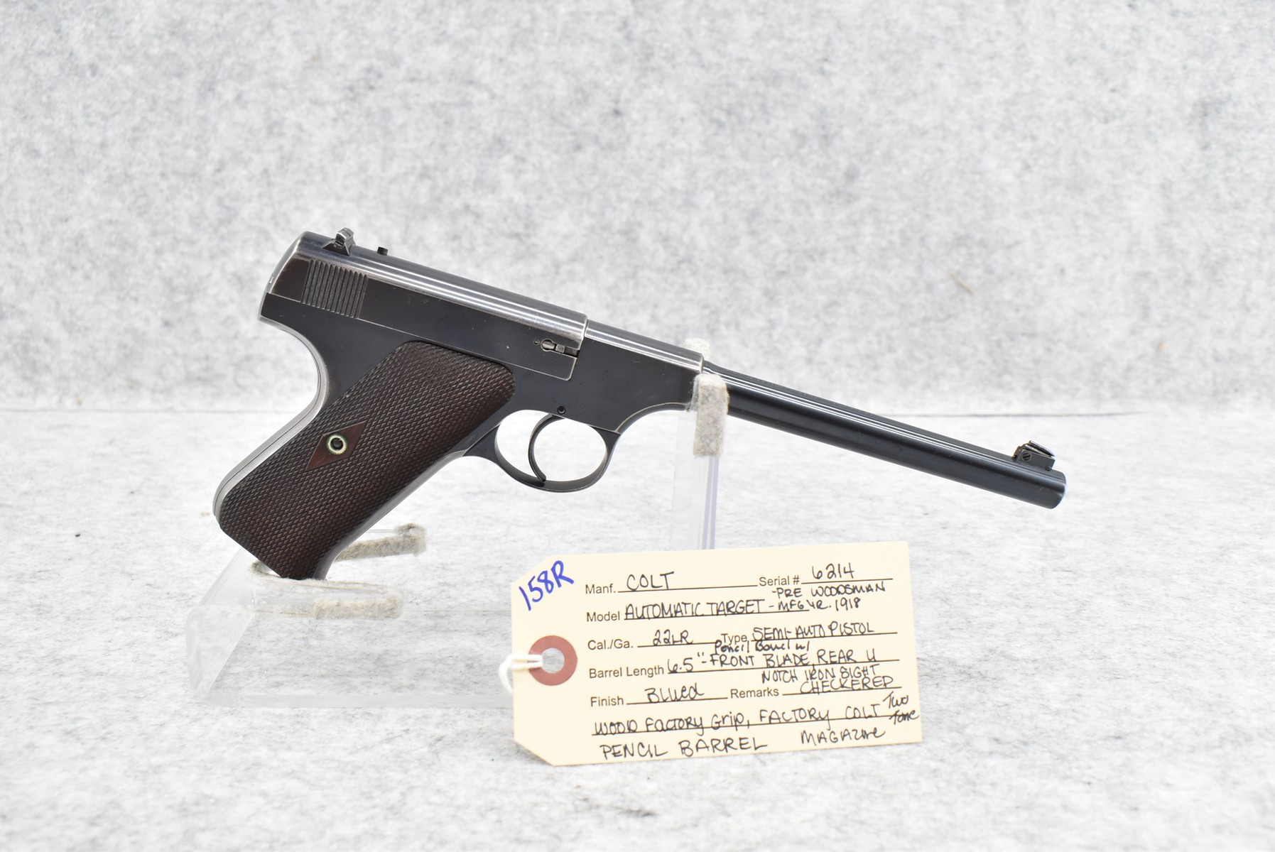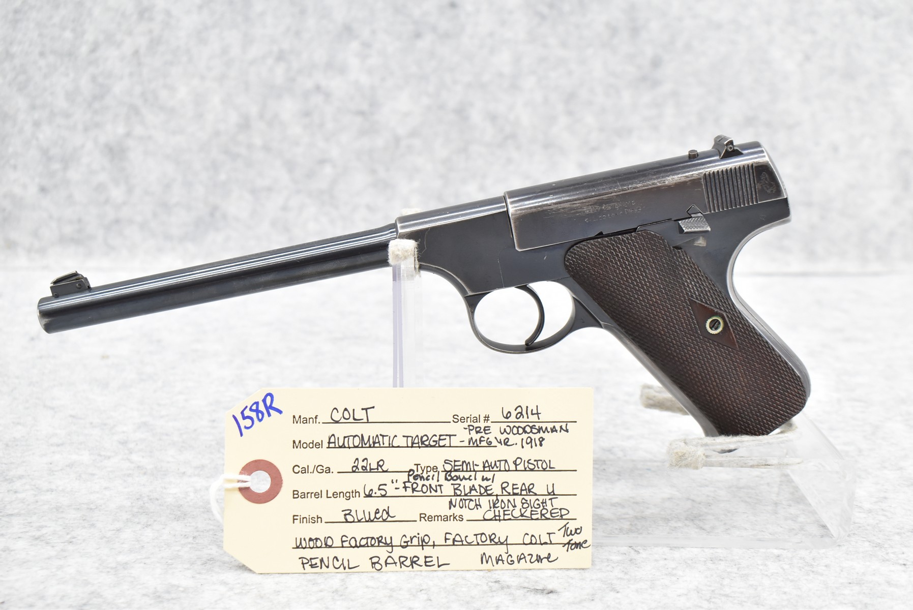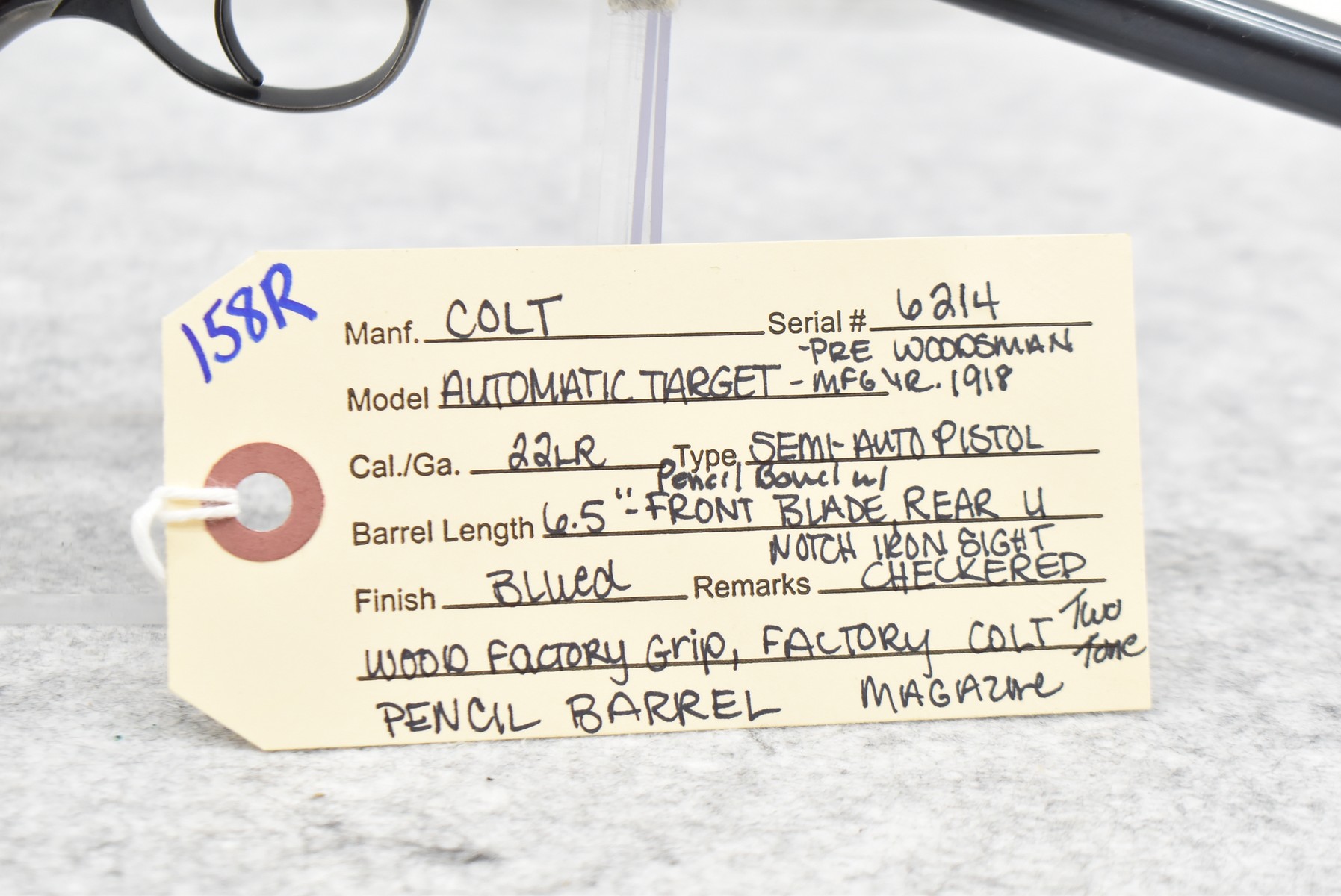 158R. Colt – Mod. Automatic Target Pre-Woodsman – 22LR Cal. Semi-Auto Pistol – w/6.5” Pencil Barrel w/Front Blade & Rear U-Notch Iron Sights – Blued Finish – w/Checkered Wood Factory Grip – w/Factory Colt Two-Tone Magazine – Mfg. 1918