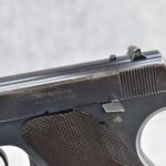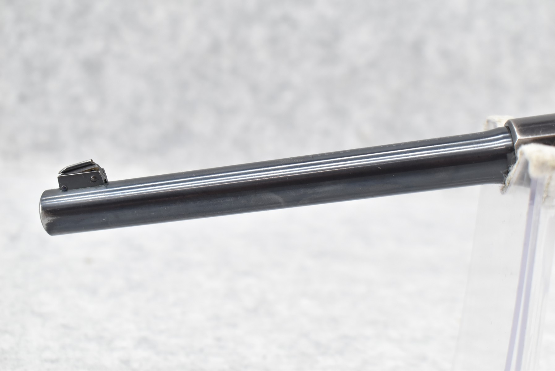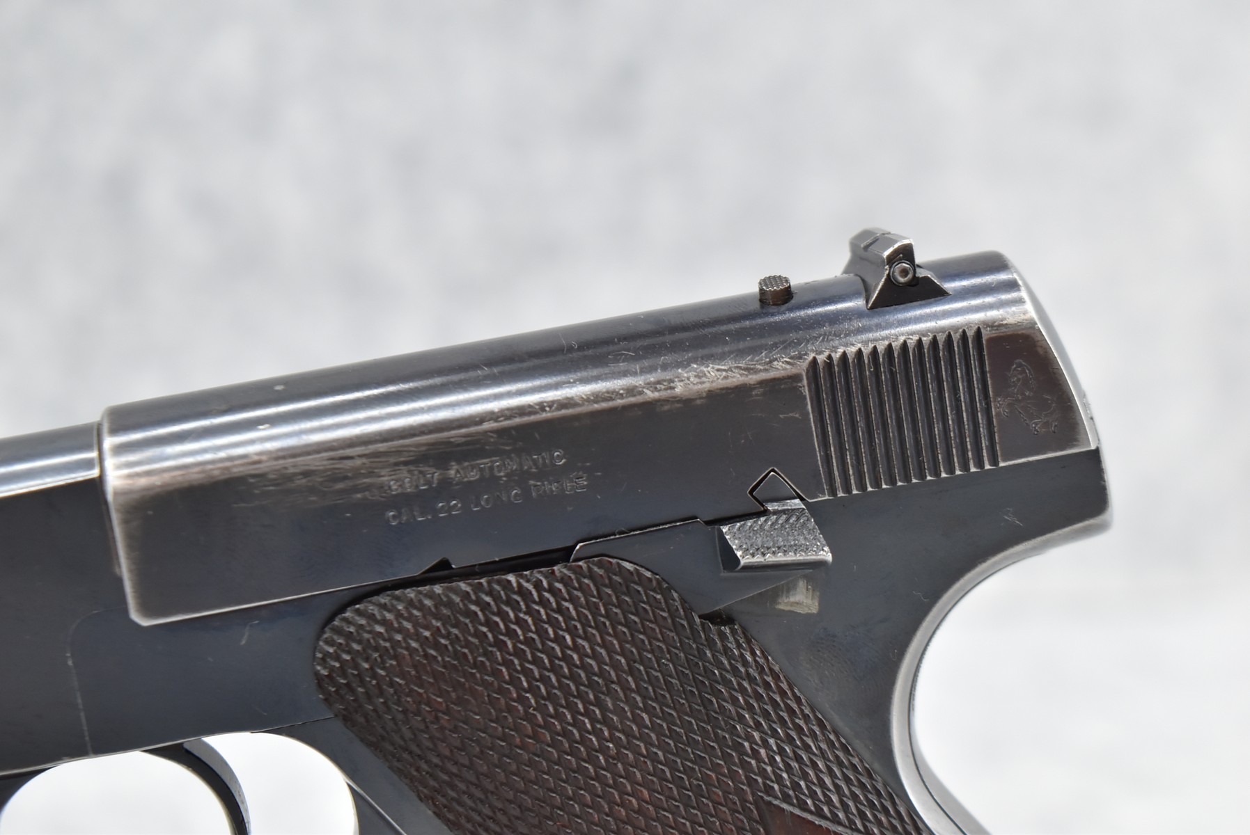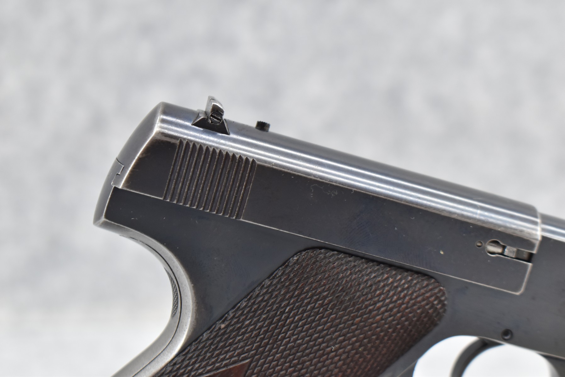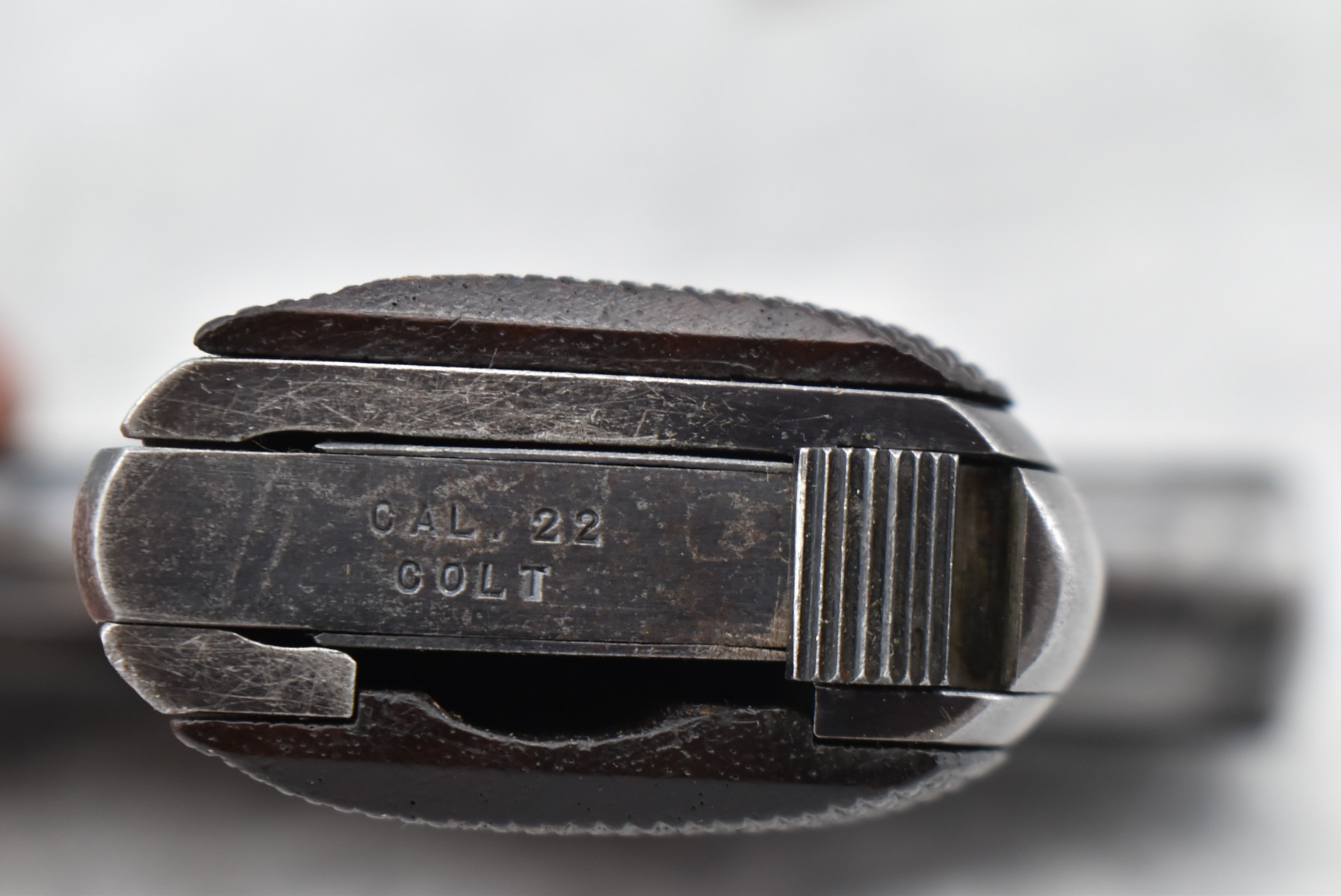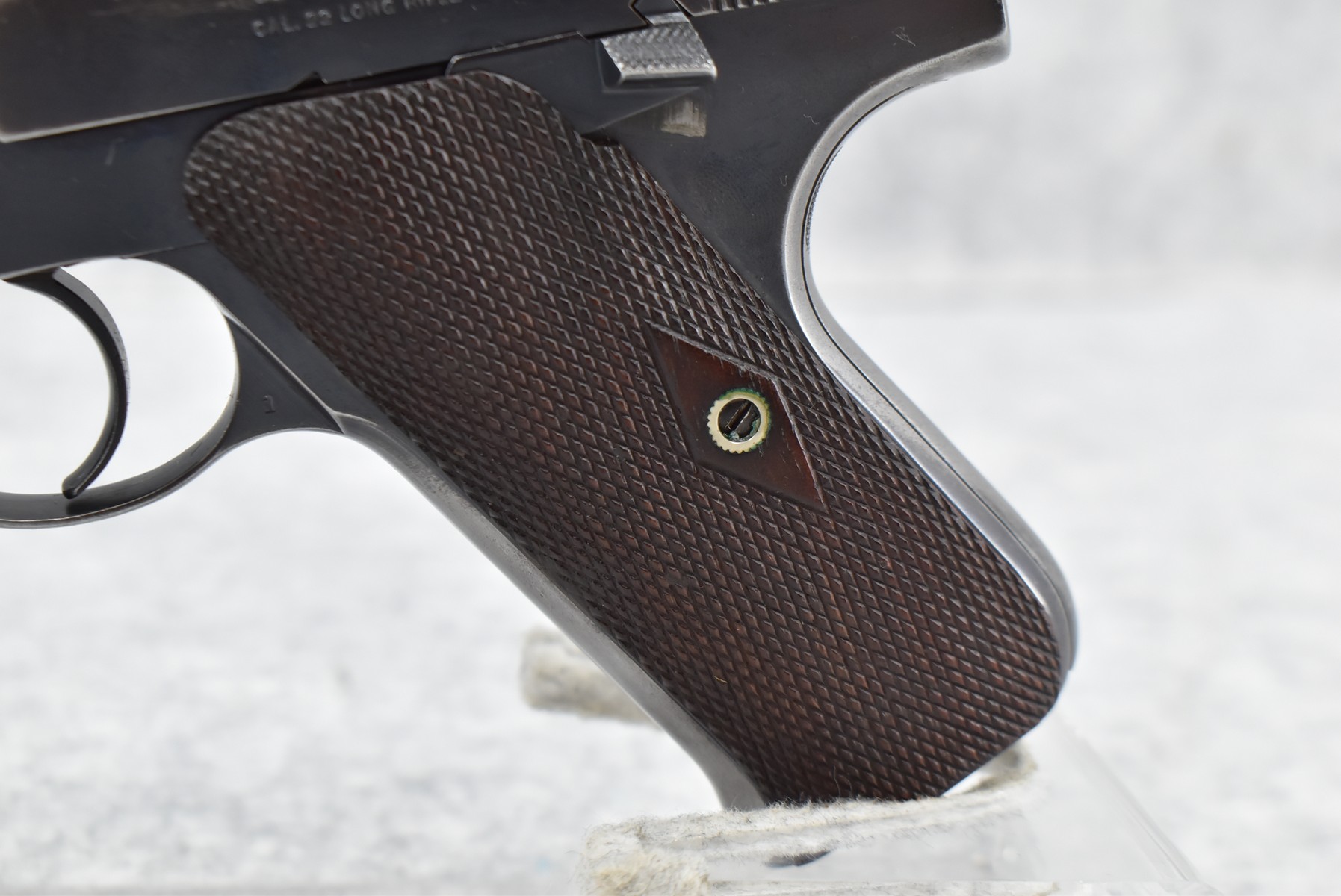158R. Colt – Mod. Automatic Target Pre-Woodsman – 22LR Cal. Semi-Auto Pistol – w/6.5” Pencil Barrel w/Front Blade & Rear U-Notch Iron Sights – Blued Finish – w/Checkered Wood Factory Grip – w/Factory Colt Two-Tone Magazine – Mfg. 1918