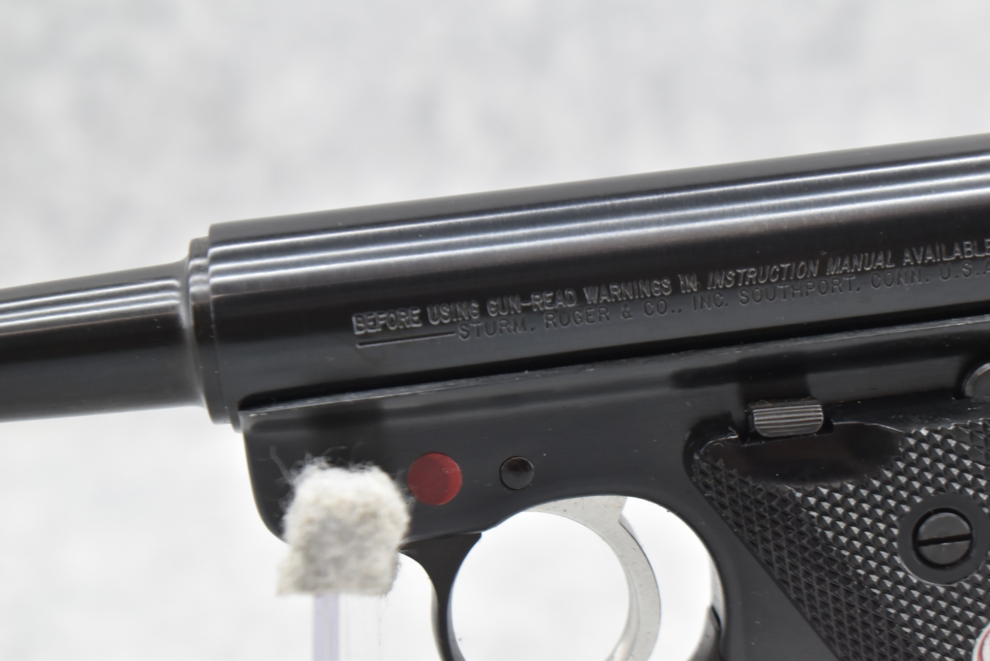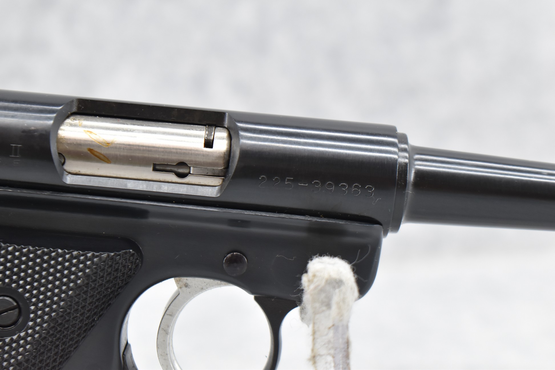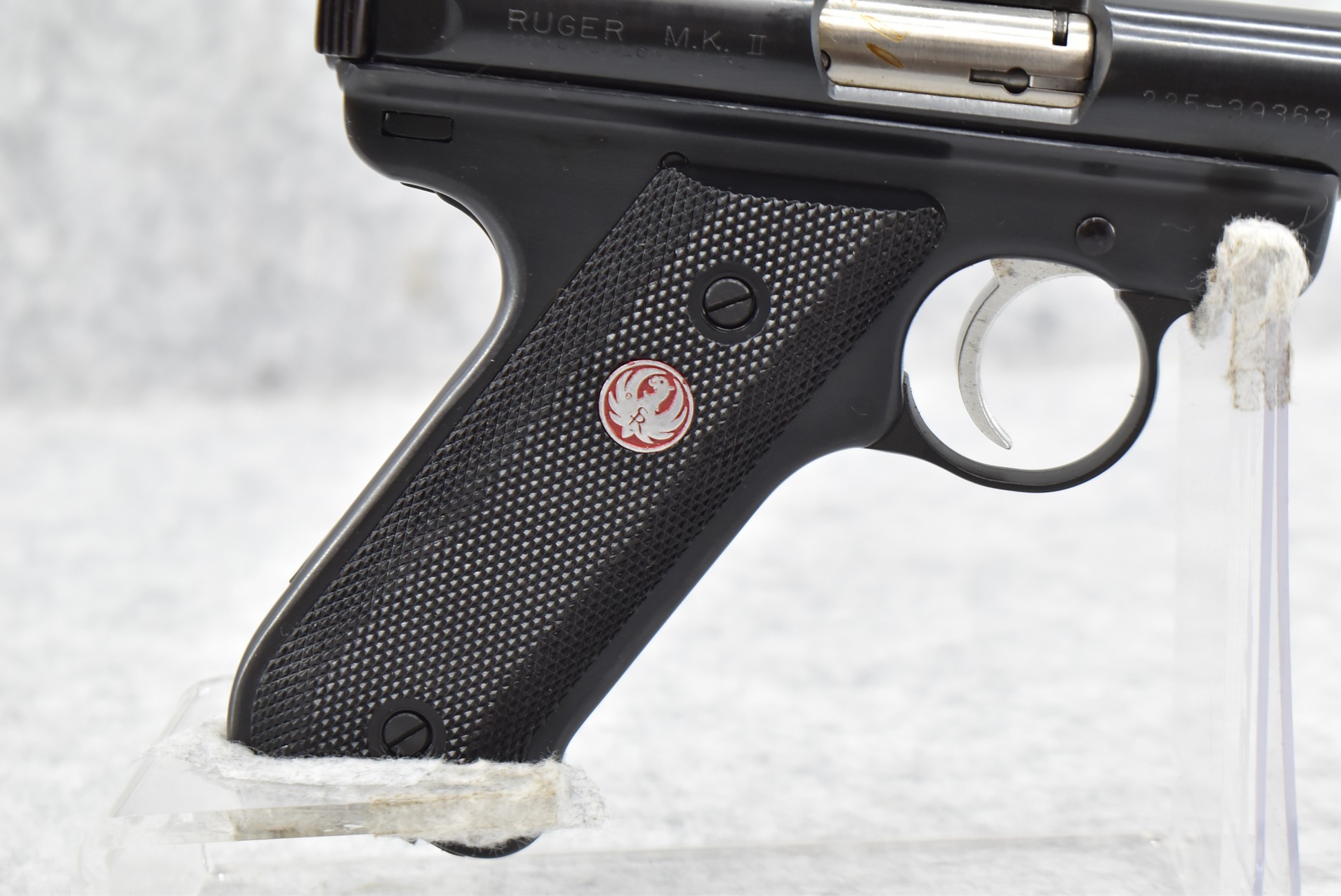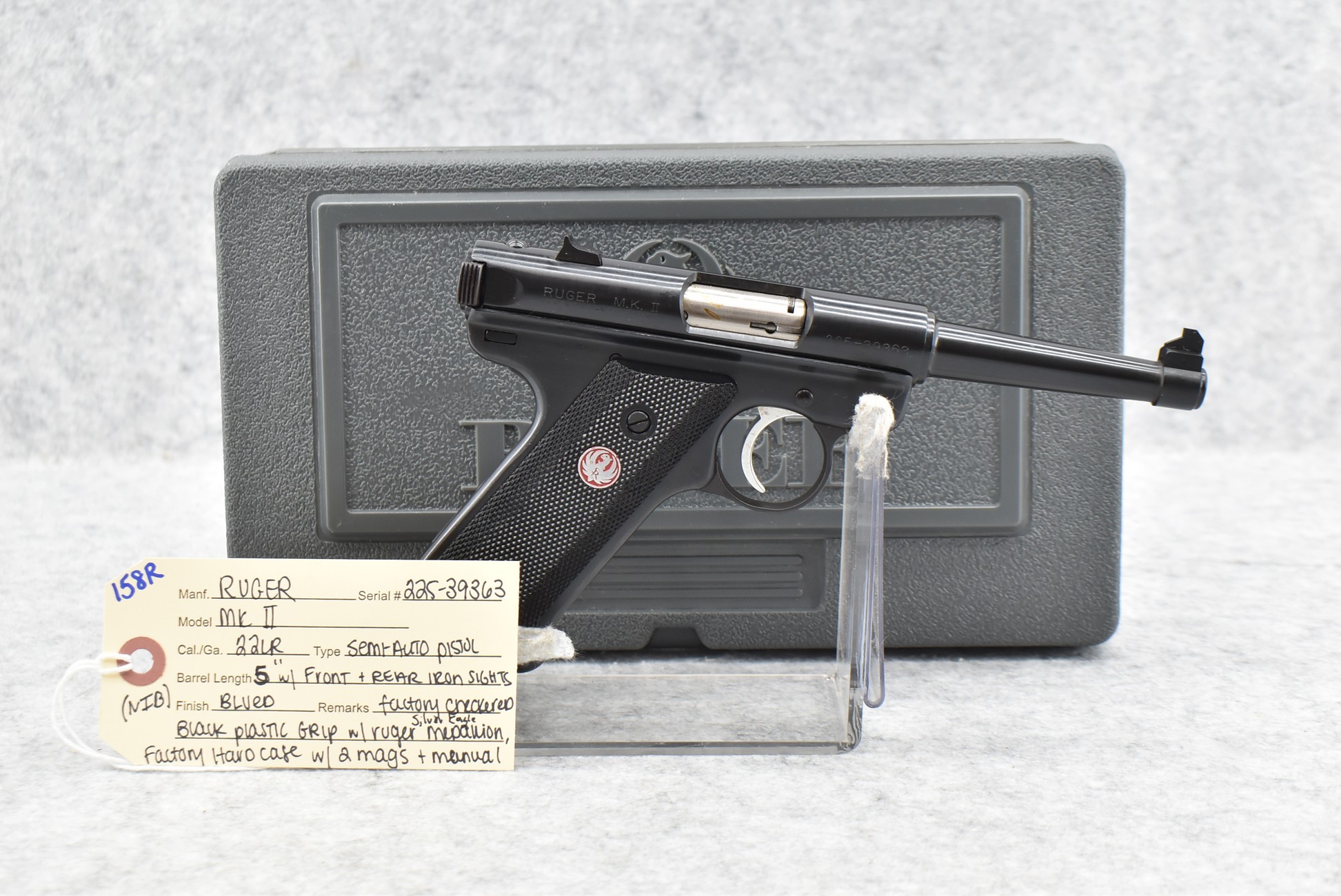 158R. Ruger – Mod. MKII – 22LR Cal. Semi-Auto Pistol – w/5” Barrel w/Front and Iron Rear Sights – Blued Finish – w/Factory Checkered Black Plastic Grip w/Ruger Silver Eagle Medallion – w/2 Magazines – New in Factory Hard Case w/Manual