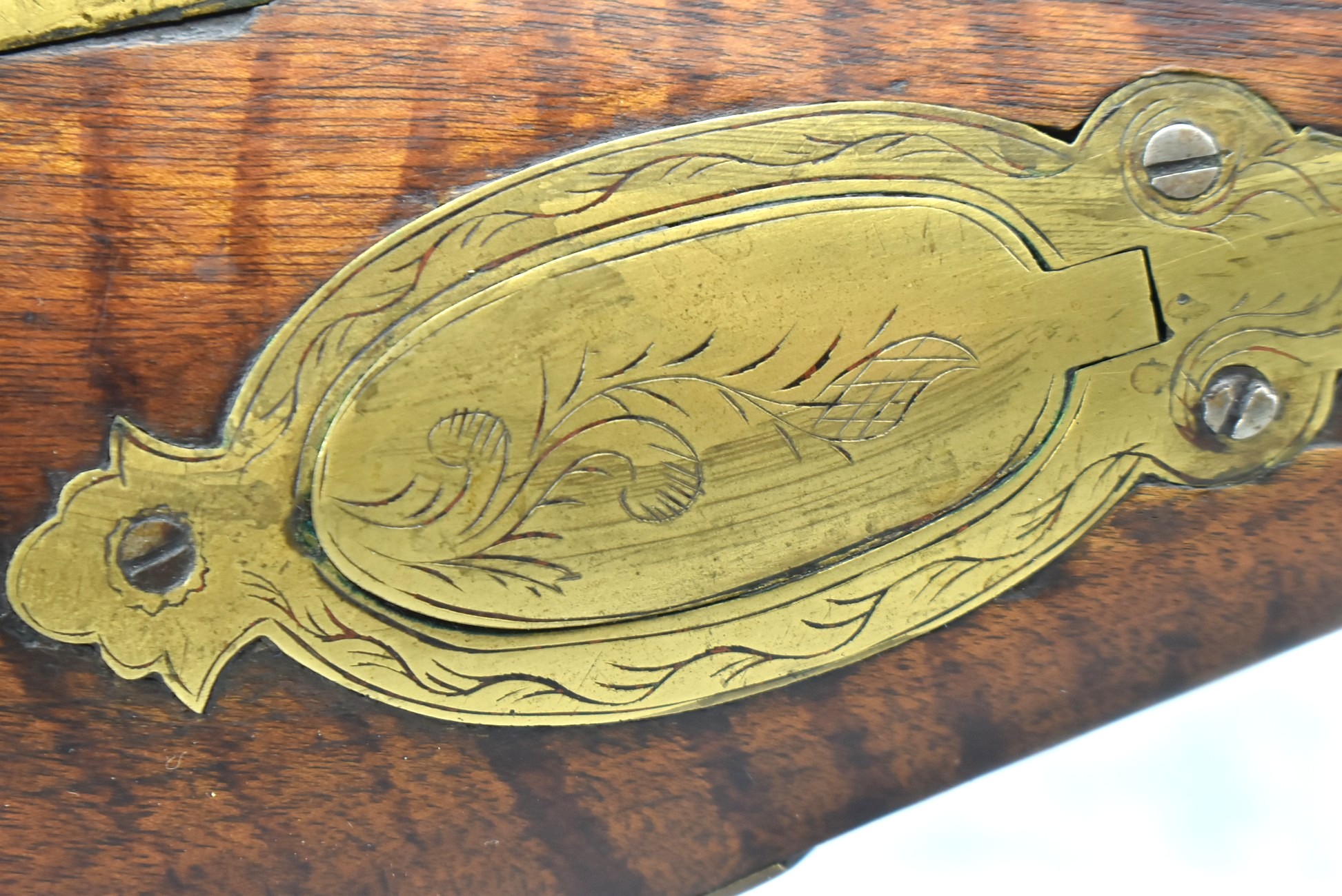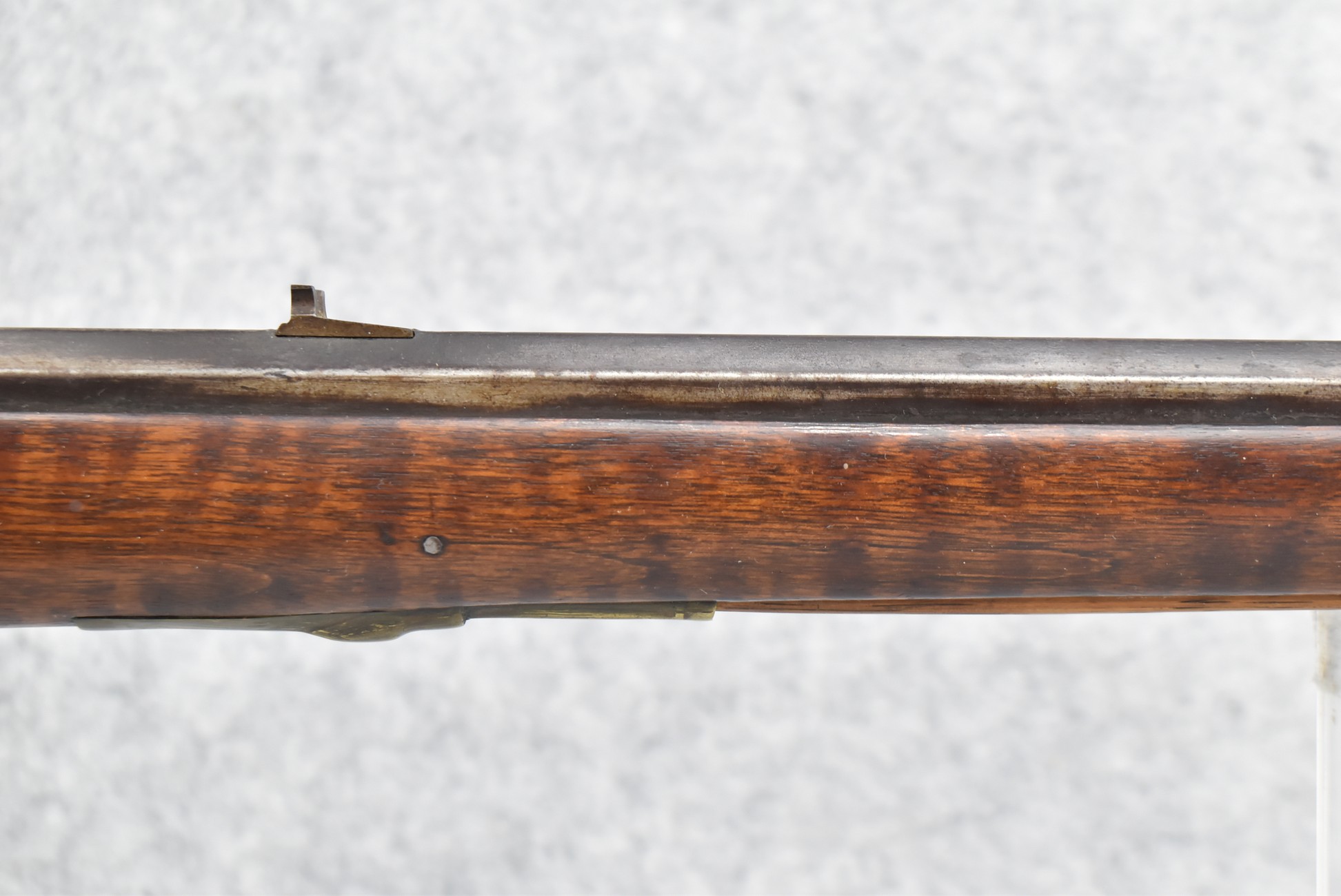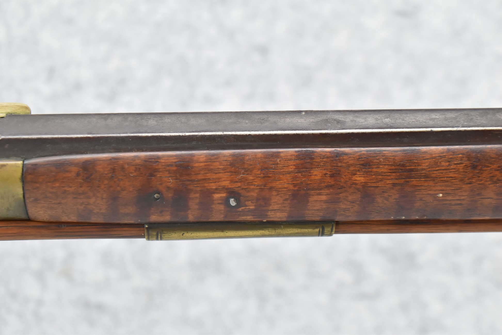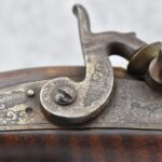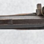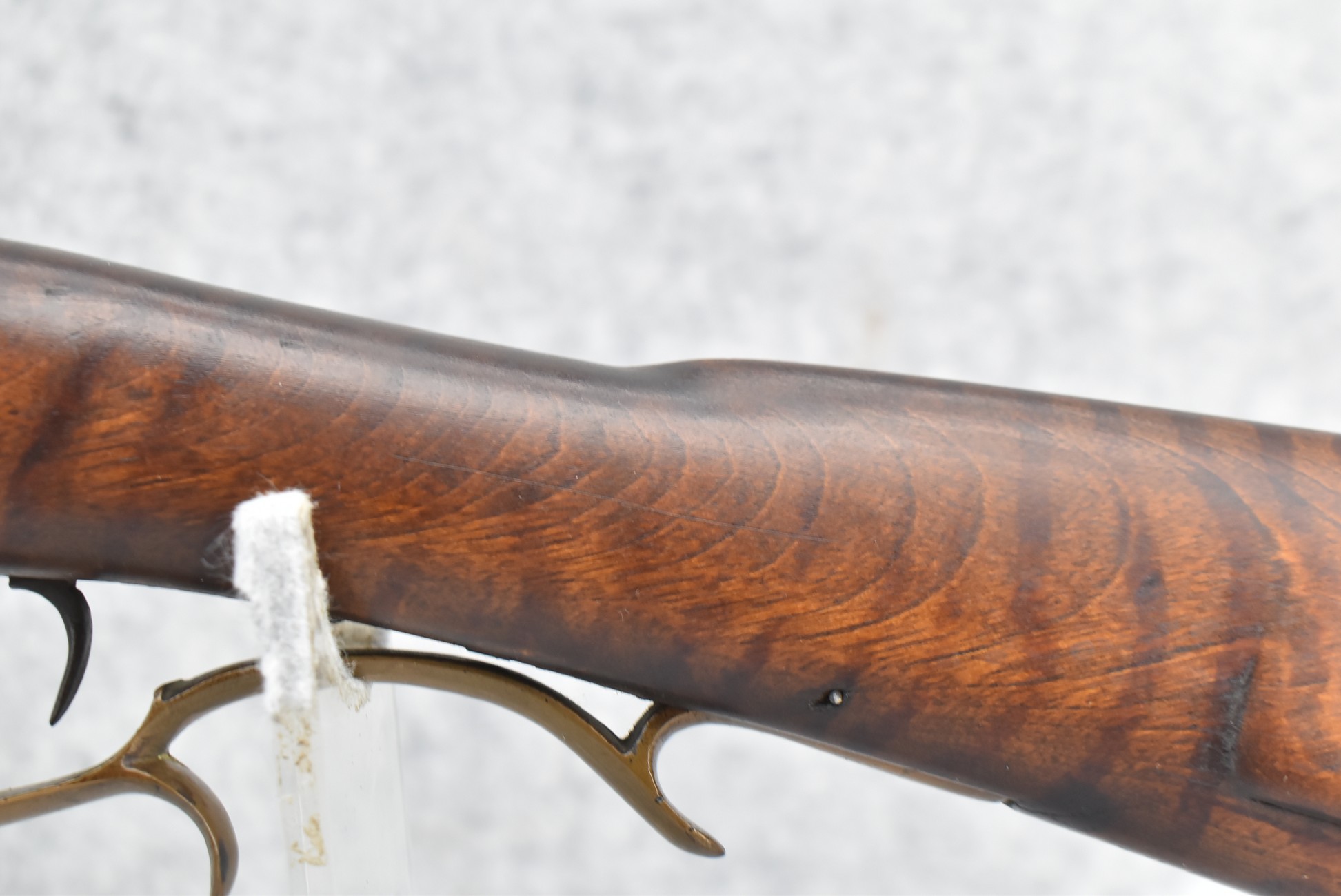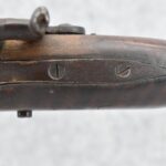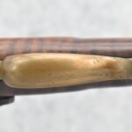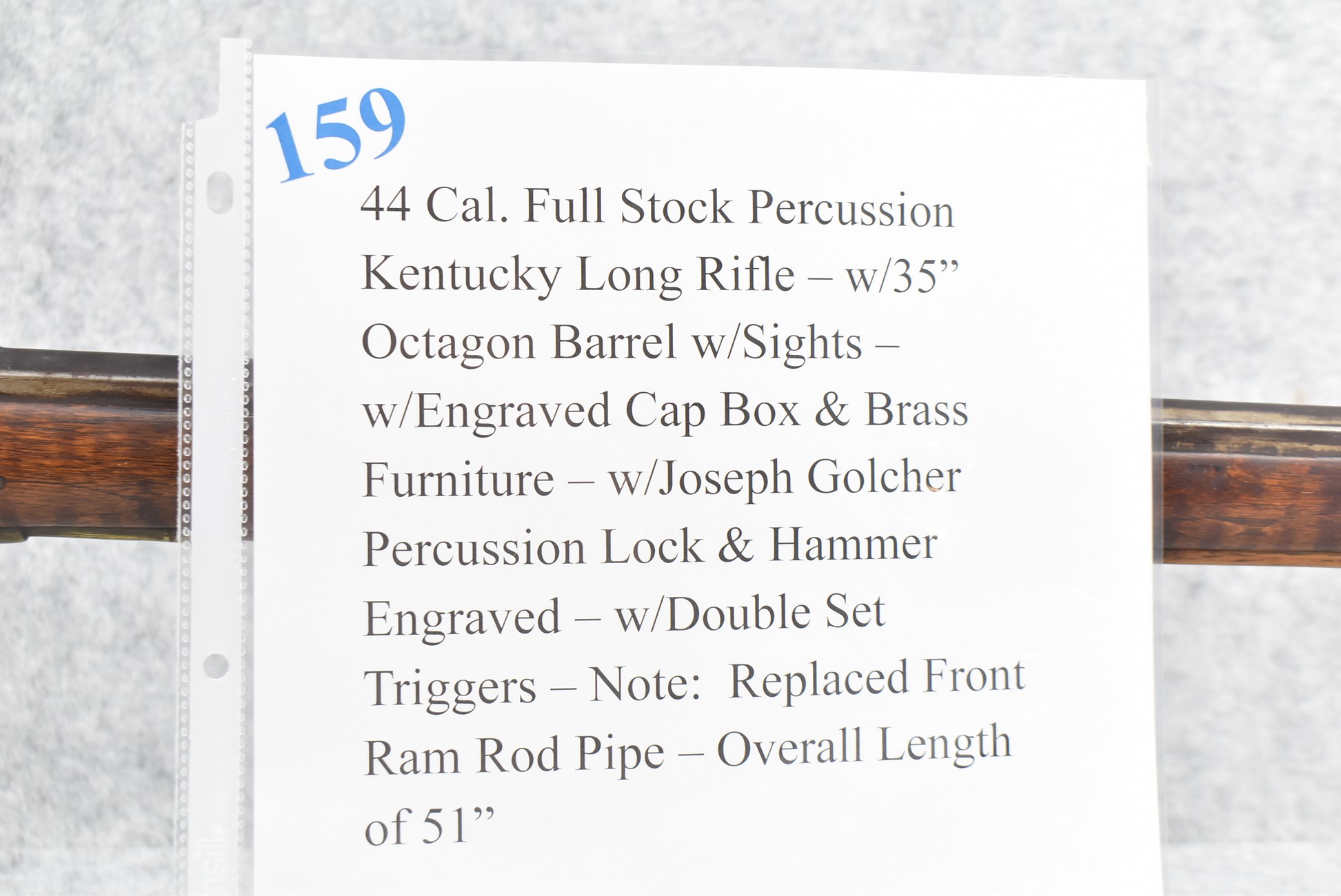 159. 44 Cal. Full Stock Percussion Kentucky Long Rifle – w/35” Octagon Barrel w/Sights – w/Engraved Cap Box & Brass Furniture – w/Joseph Golcher Percussion Lock & Hammer Engraved – w/Double Set Triggers – Note: Replaced Front Ram Rod Pipe – Overall Length of 51”