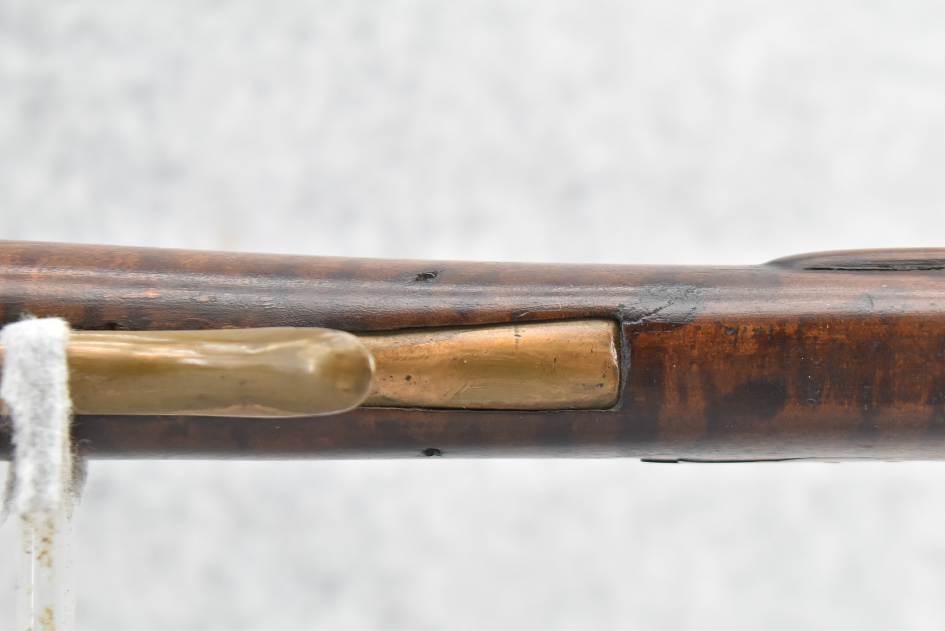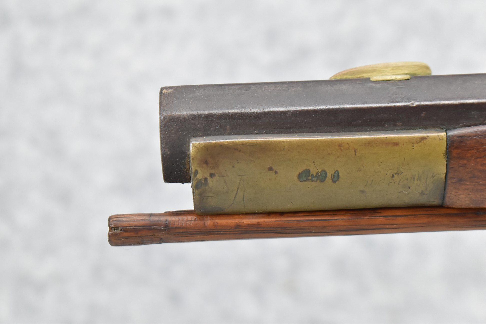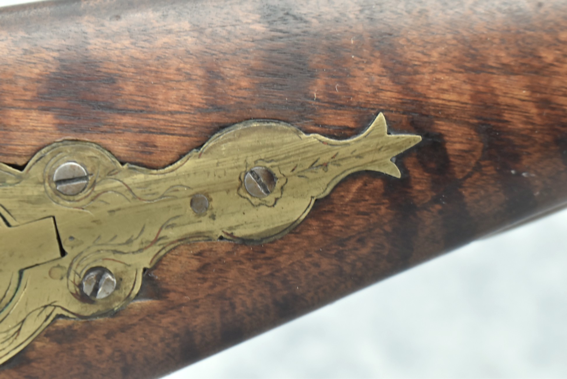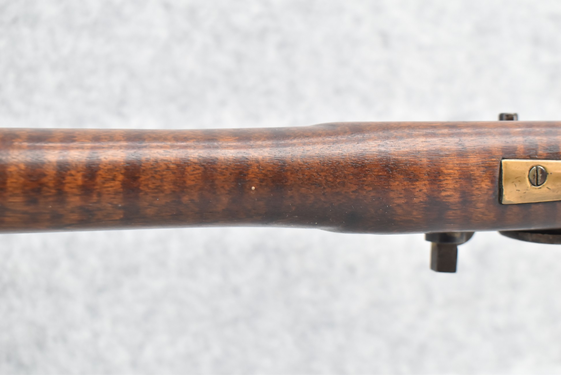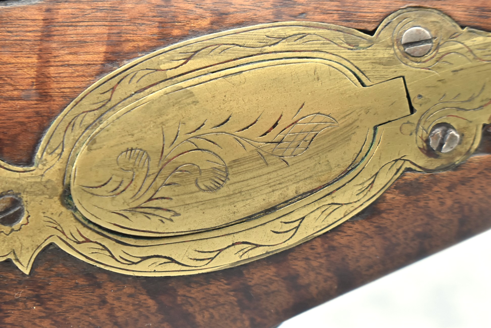 159. 44 Cal. Full Stock Percussion Kentucky Long Rifle – w/35” Octagon Barrel w/Sights – w/Engraved Cap Box & Brass Furniture – w/Joseph Golcher Percussion Lock & Hammer Engraved – w/Double Set Triggers – Note: Replaced Front Ram Rod Pipe – Overall Length of 51”