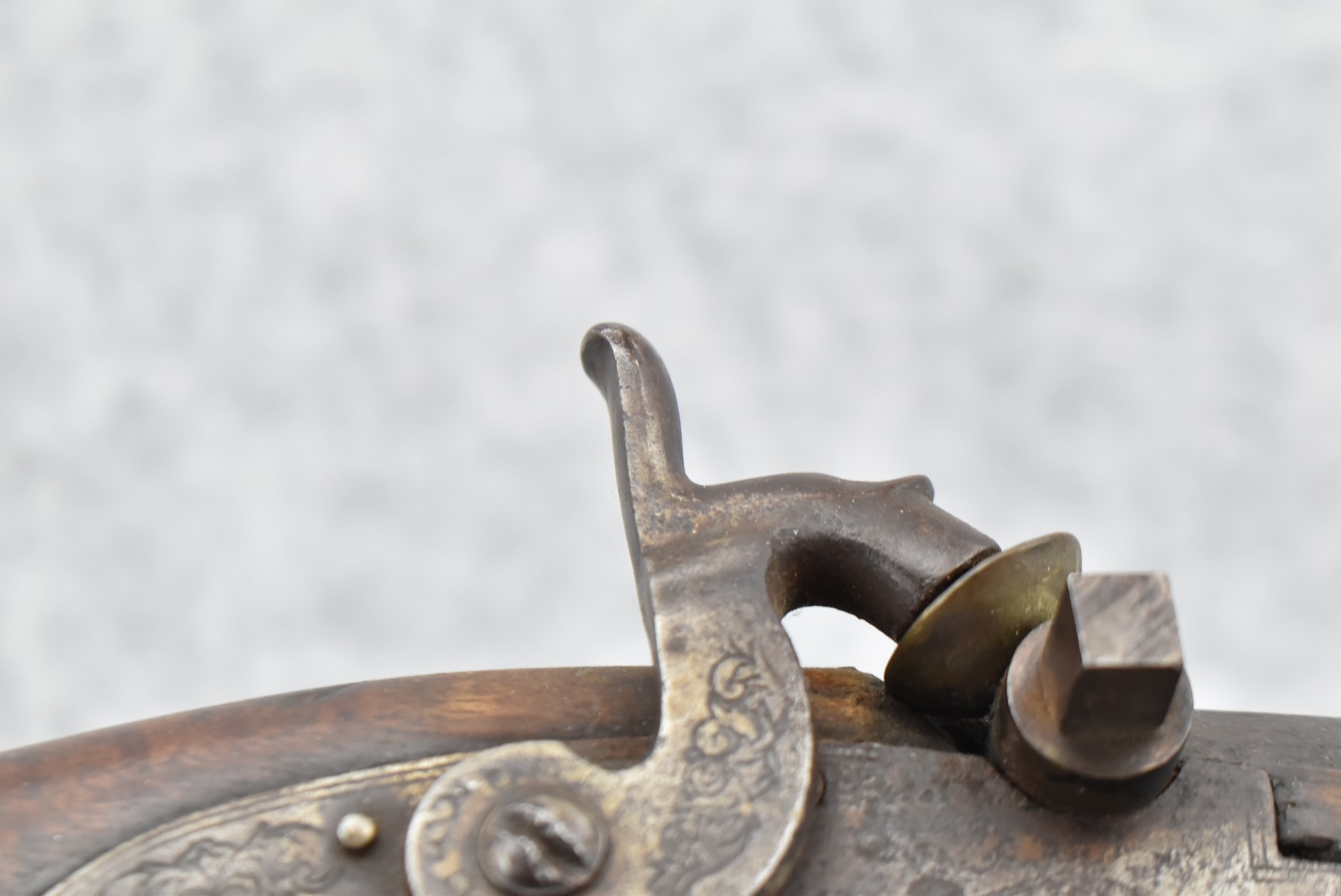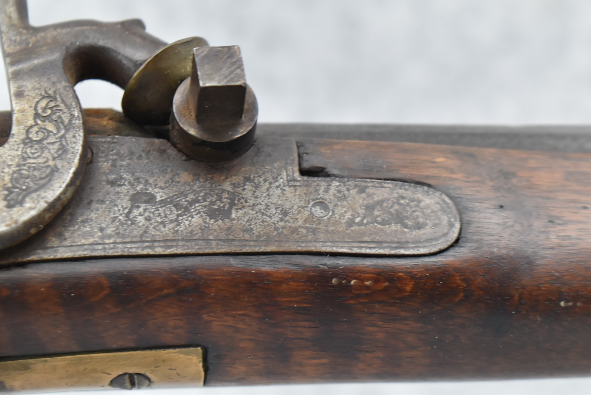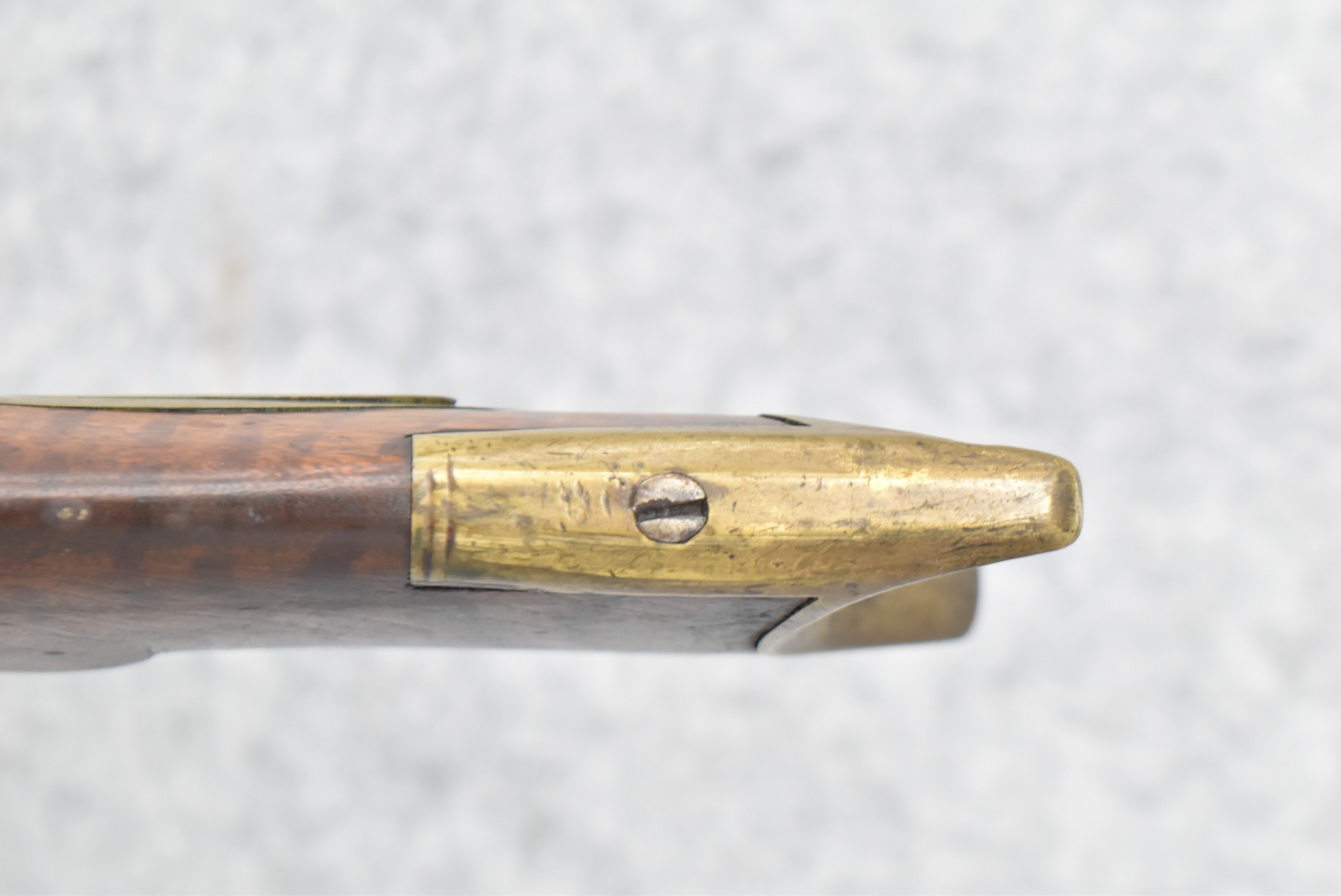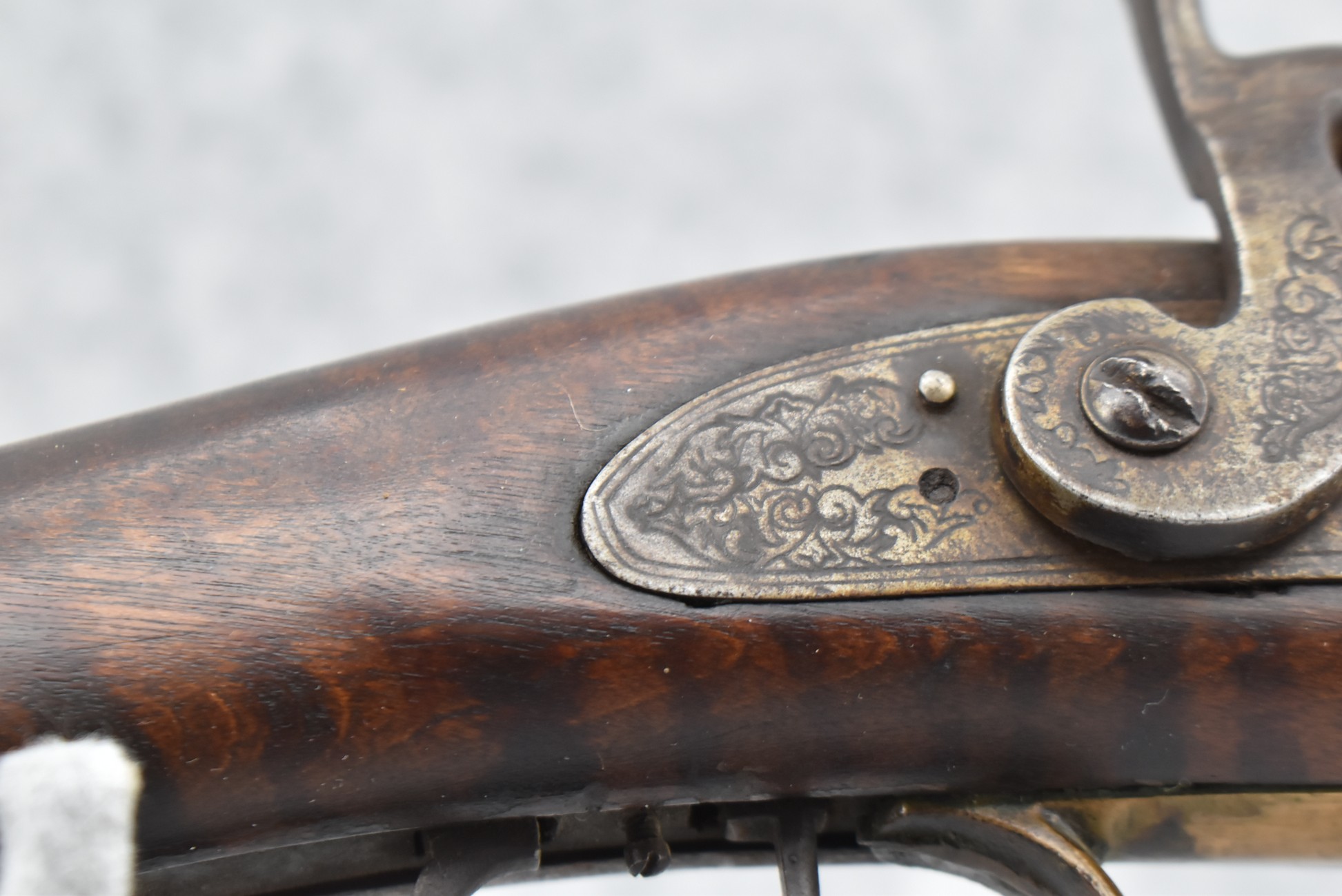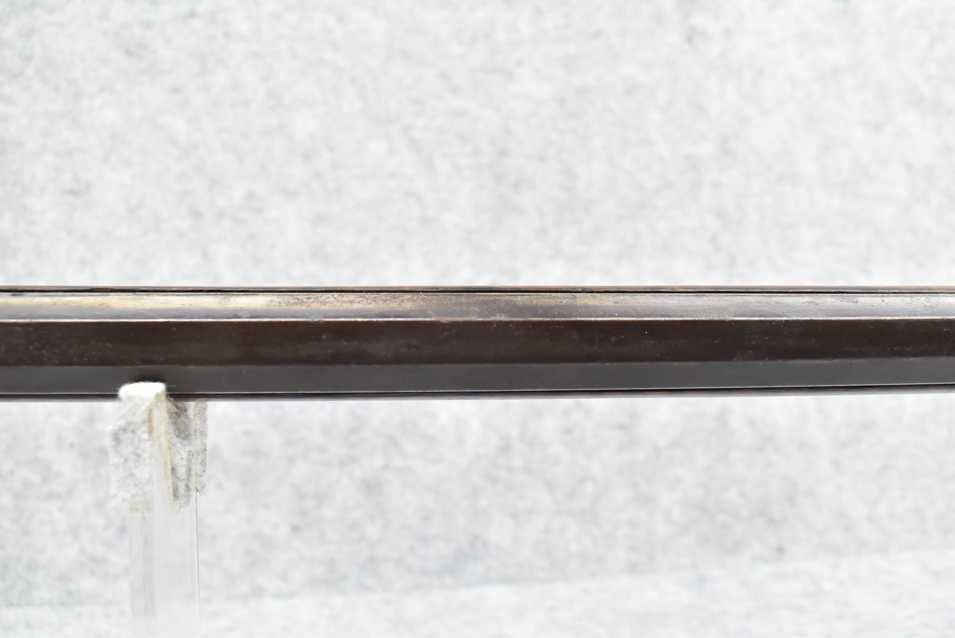 159. 44 Cal. Full Stock Percussion Kentucky Long Rifle – w/35” Octagon Barrel w/Sights – w/Engraved Cap Box & Brass Furniture – w/Joseph Golcher Percussion Lock & Hammer Engraved – w/Double Set Triggers – Note: Replaced Front Ram Rod Pipe – Overall Length of 51”