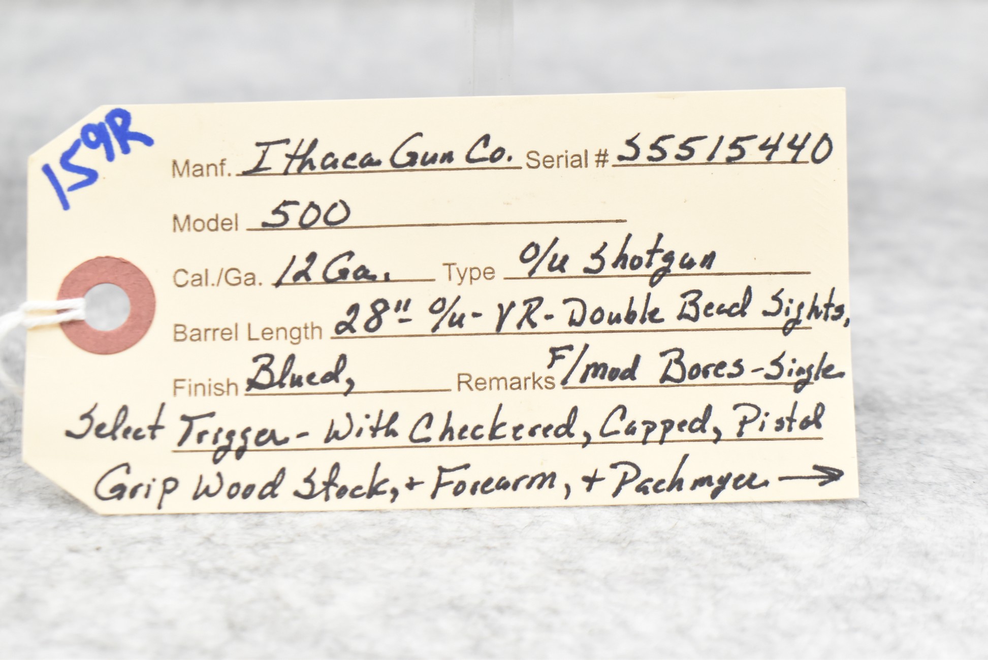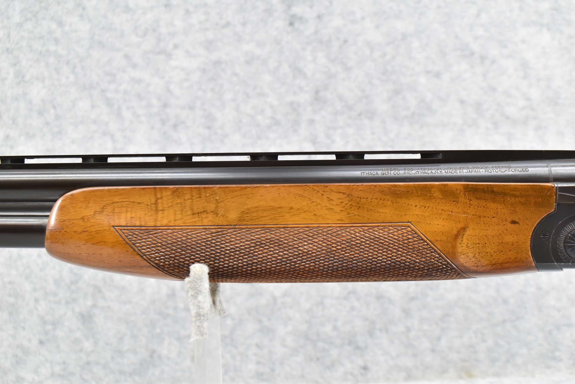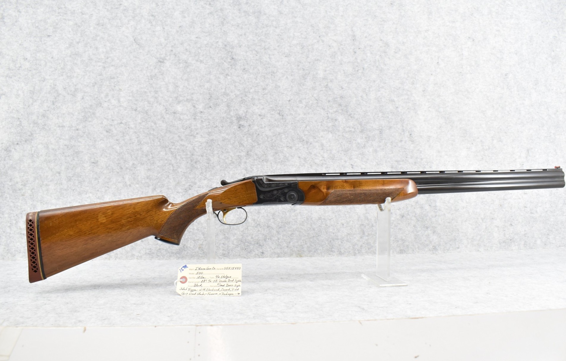 159R. Ithaca Gun Co. – Mod. 500 – 12ga. Over-Under Shotgun – w/28” F/Mod. Choked, Vent-Rib Barrels w/Double Bead Sights – Blued Finish – w/Engraved Frame on All Sides – w/Checkered Capped Pistol Grip Wood Stocks w/Pachmayr Butt Pad