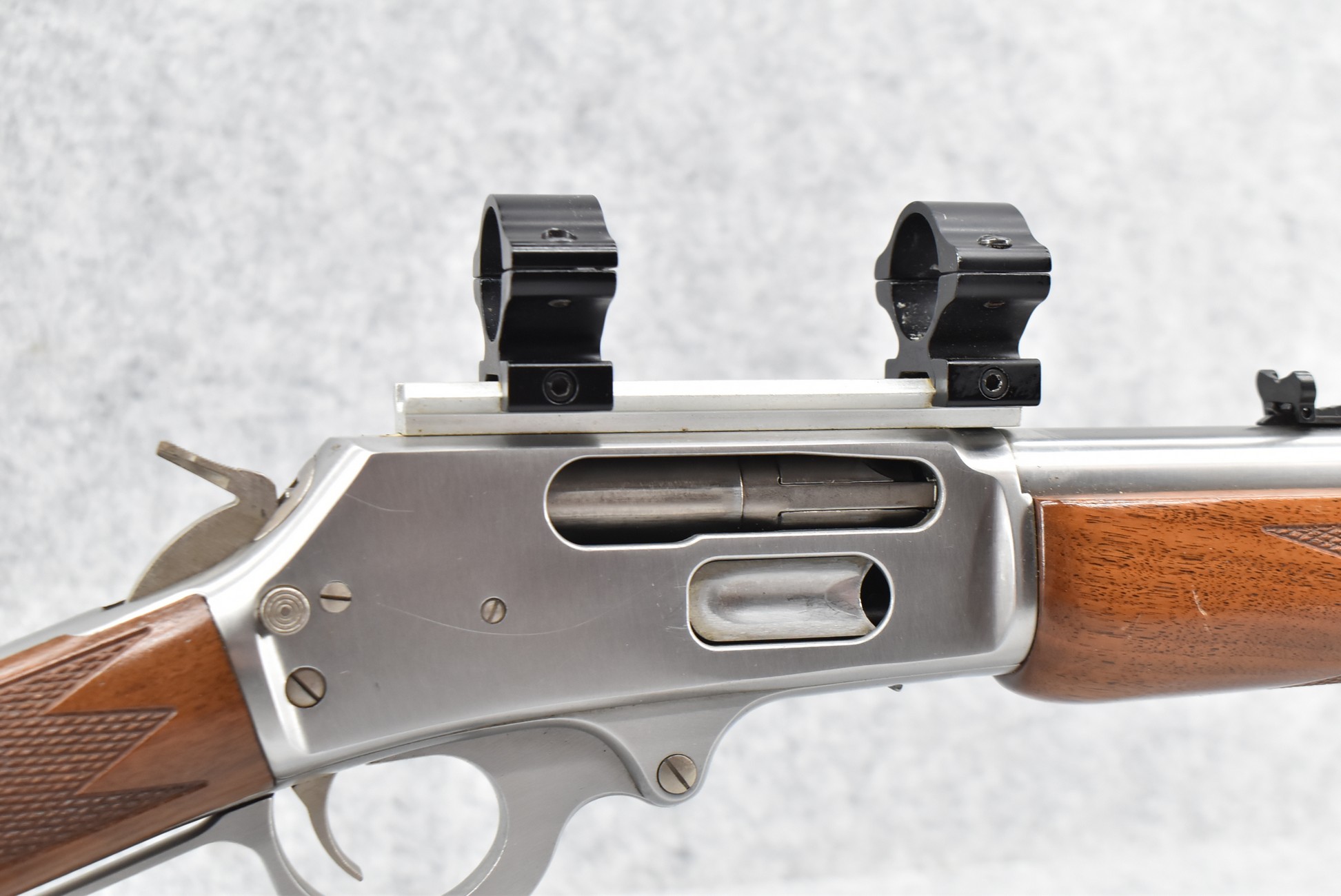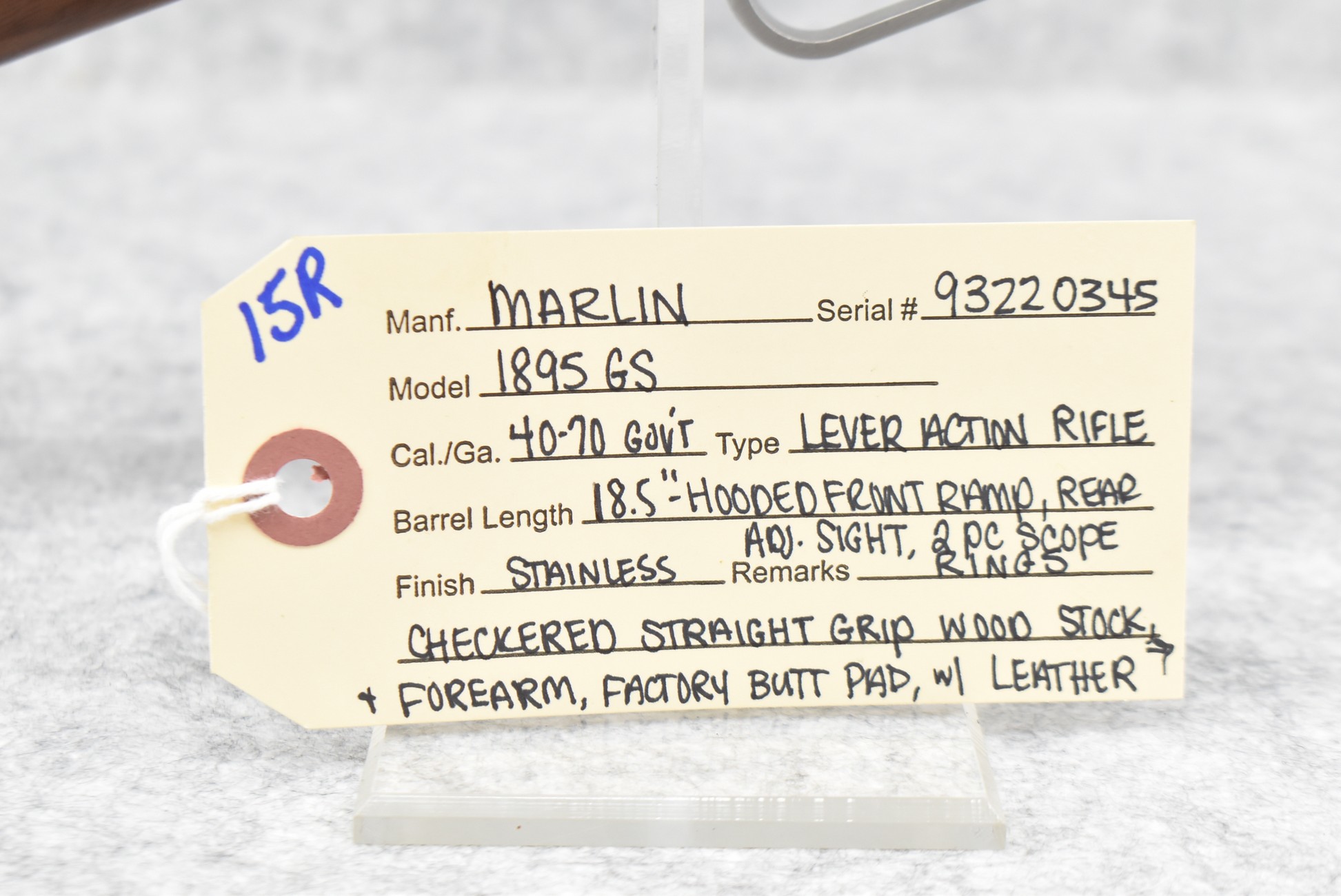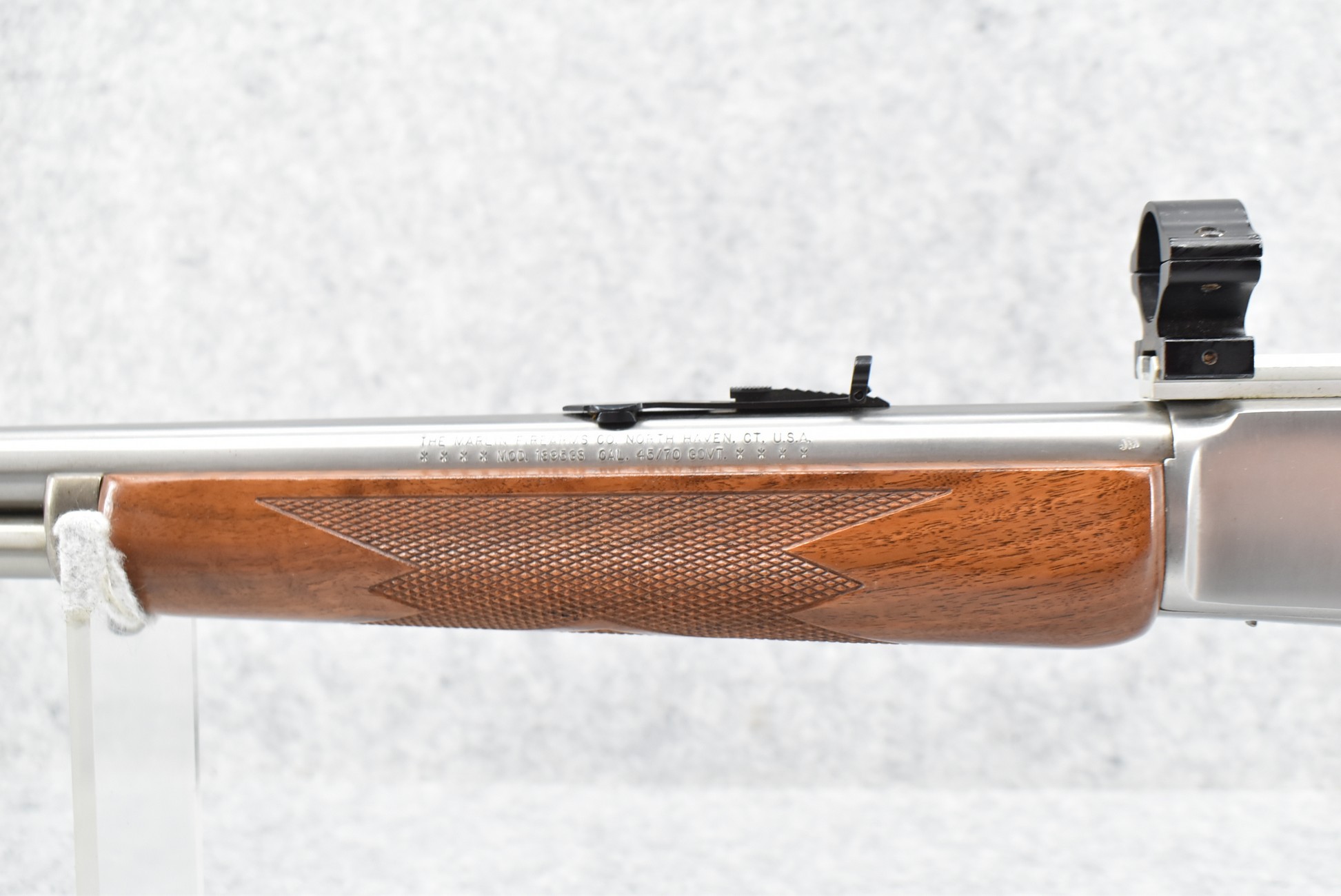 15R. Marlin – Mod. 1895 GS – 45-70 Gov’t Cal. Lever Action Rifle – w/18½” Barrel w/Hooded Ramp Front and Adjustable Rear Sights – Stainless Finish – w/Checkered Straight Grip Wood Stocks w/Factory Butt Pad – w/Tubular Magazine – w/2-Piece Scope Rings – w/Leather Sling