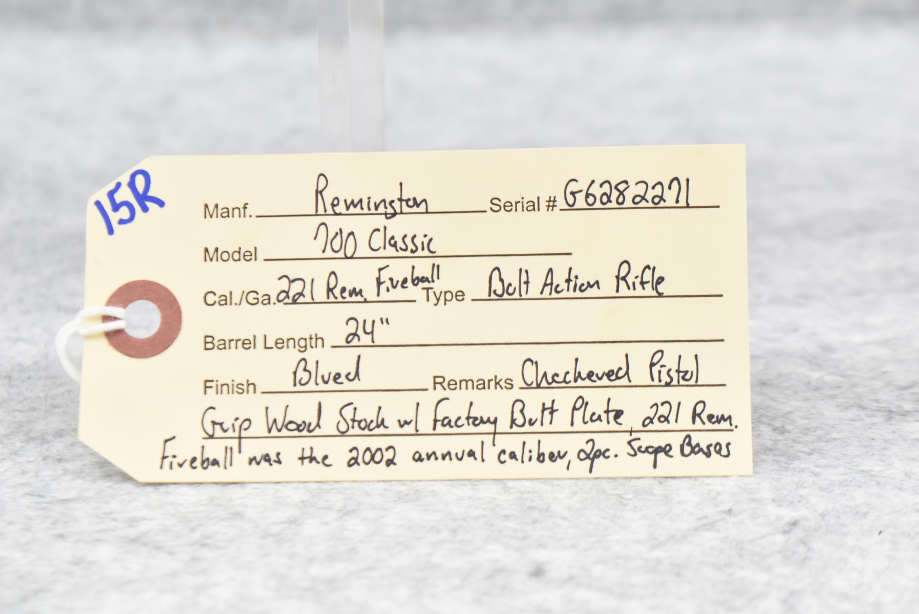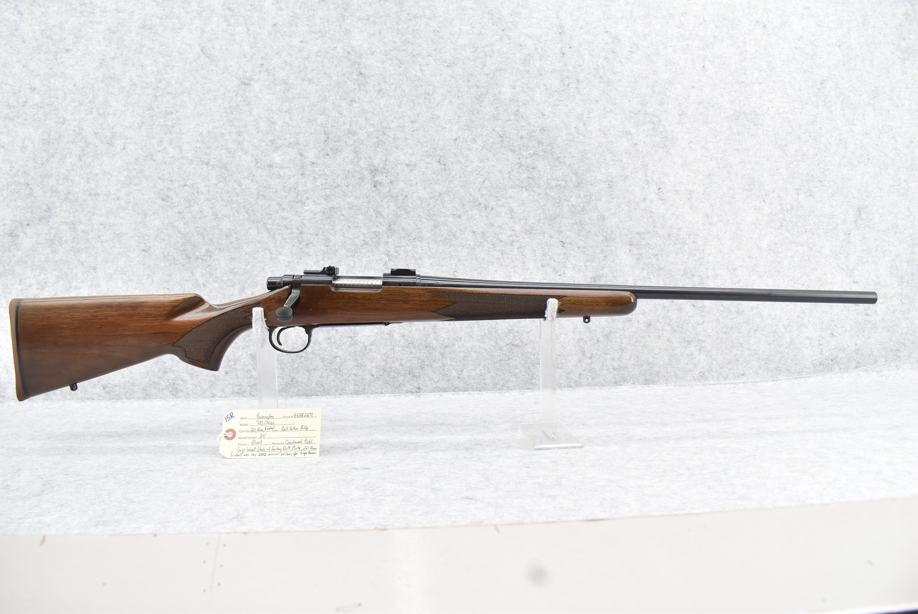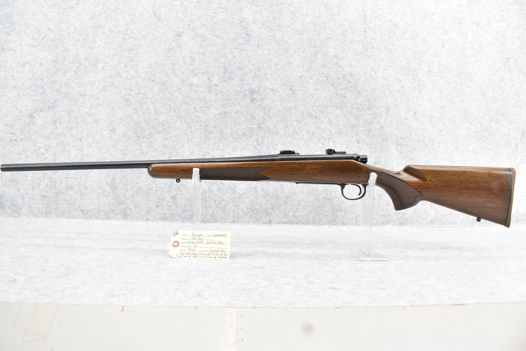 15R. Remington – Mod. 700 Classic – 221 Rem. Fireball Cal. Bolt Action Rifle – w/24” Barrel – Blued Finish – w/Checkered Pistol Grip Wood Stock w/Factory Butt Plate – w/2pc. Scope Bases – 221 Rem. Fireball Was the 2002 Annual Caliber – w/Manual