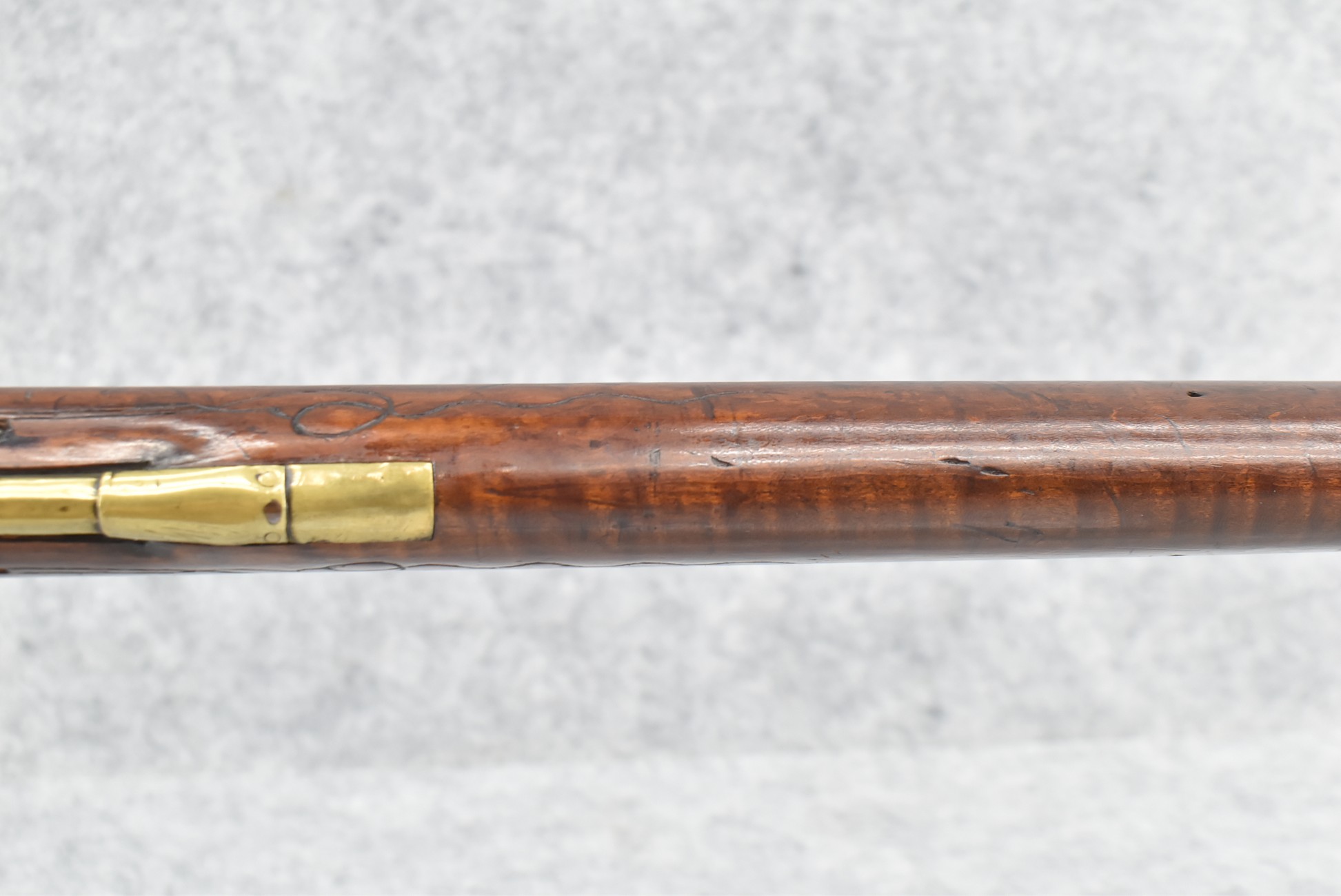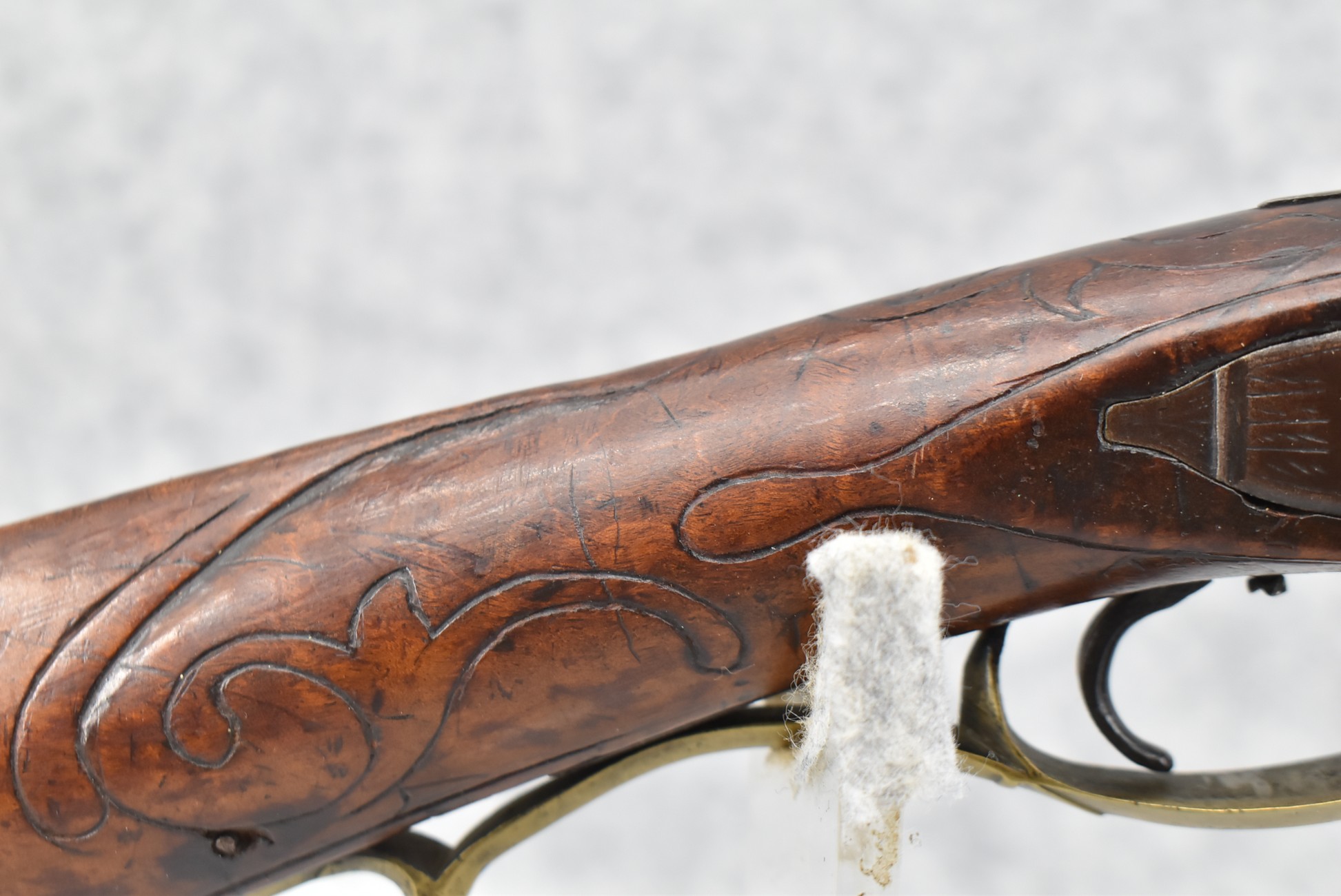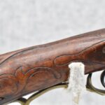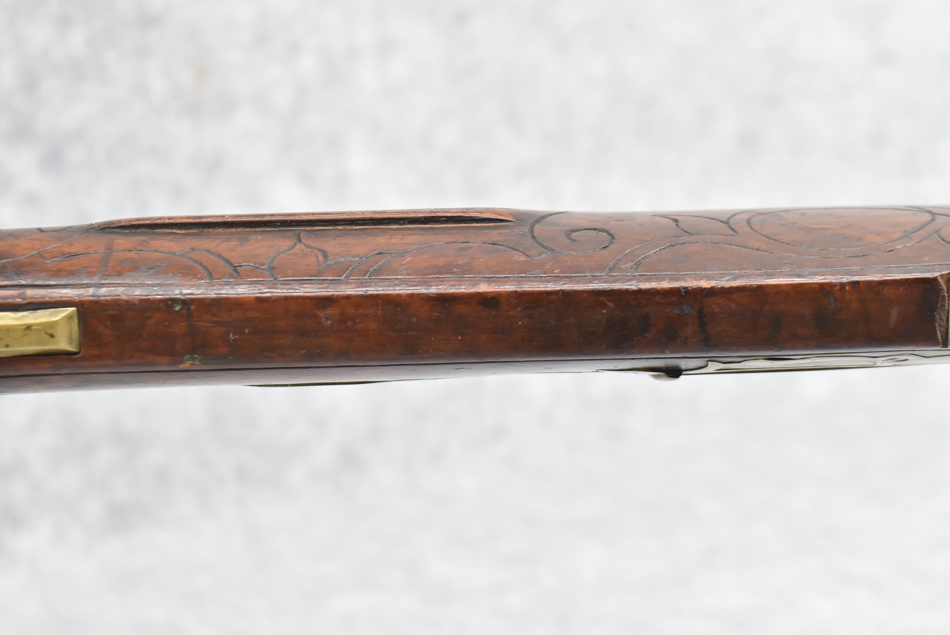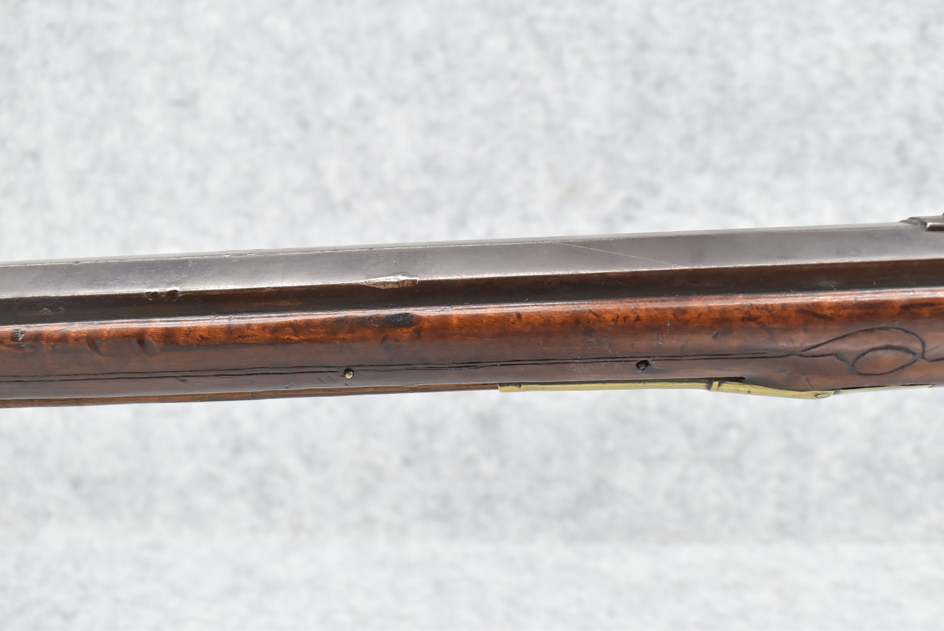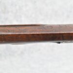 161. Unsigned 35 Cal. Percussion Kentucky Long Rifle Attributed to Jonathan Dunmeyer in Somerset County, PA – w/41” Octagon Barrel w/Sights – w/Full Length Tiger Maple Incised Carved Stock at Wrist, Cheek Piece, Side at Rear Entry Pipe – w/Very Nice 4pc. Patch Box Identical to #130 in Kentucky Rifle & Patch Boxes Vol. 2 by Chandler & Whisker, & Identical Engraving Work – Percussion Cap Lock Signed “D” in Script – w/Brass Furniture – w/Double Set Triggers – Nice Gun! – Some Thought That This Gun Could be a Benjamin Troutman Who Was Also From Somerset County w/A Jonathan Dunmeyer Patch Box, but Many Feel it is a Jonathan Dunmeyer