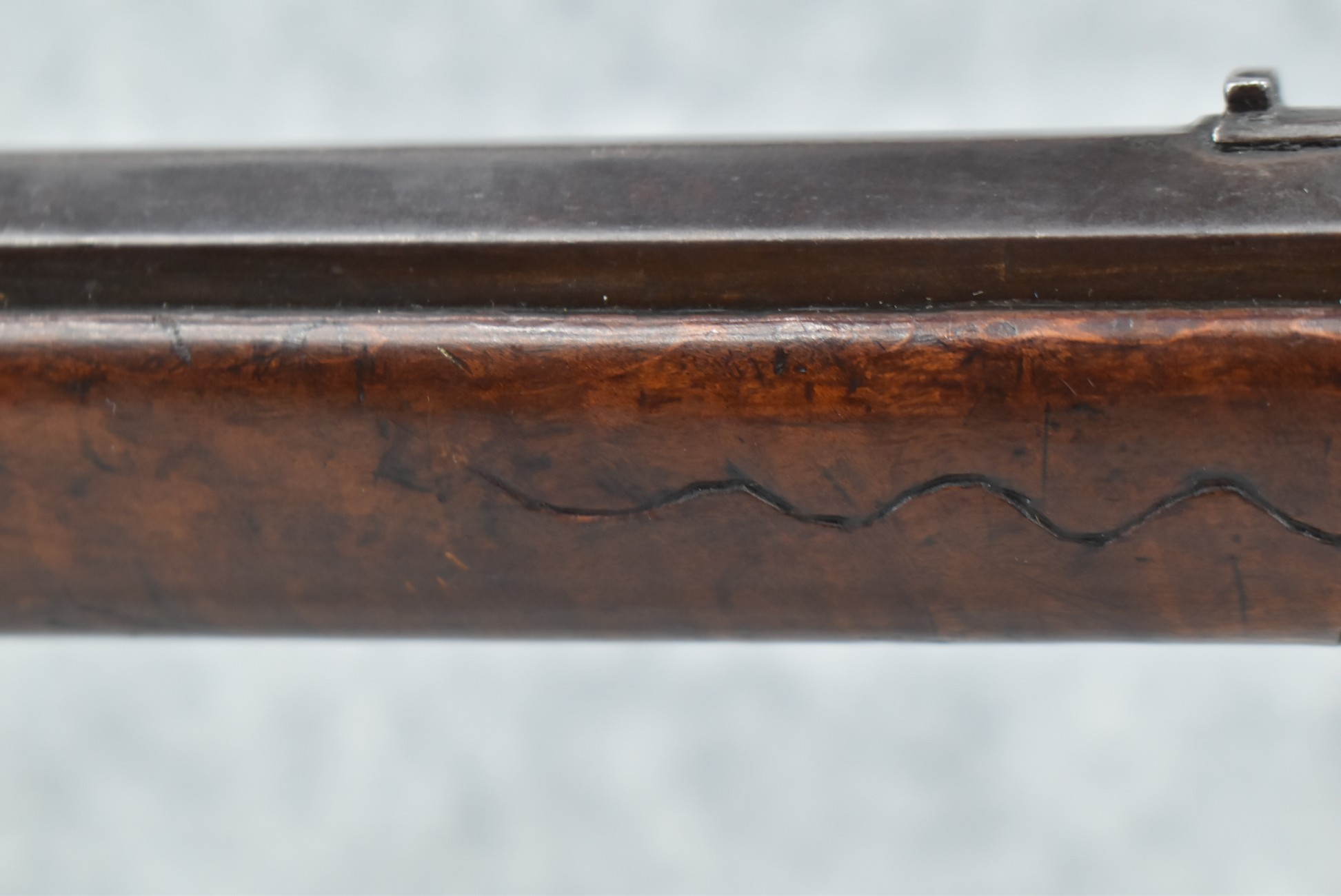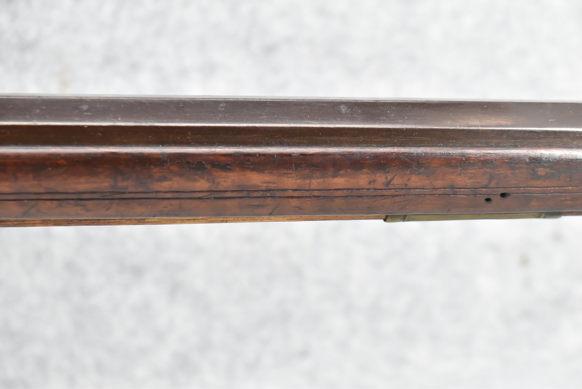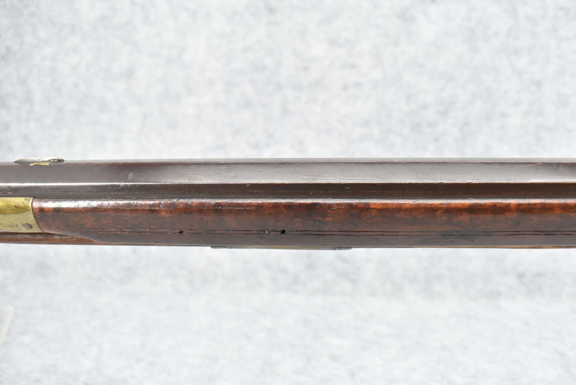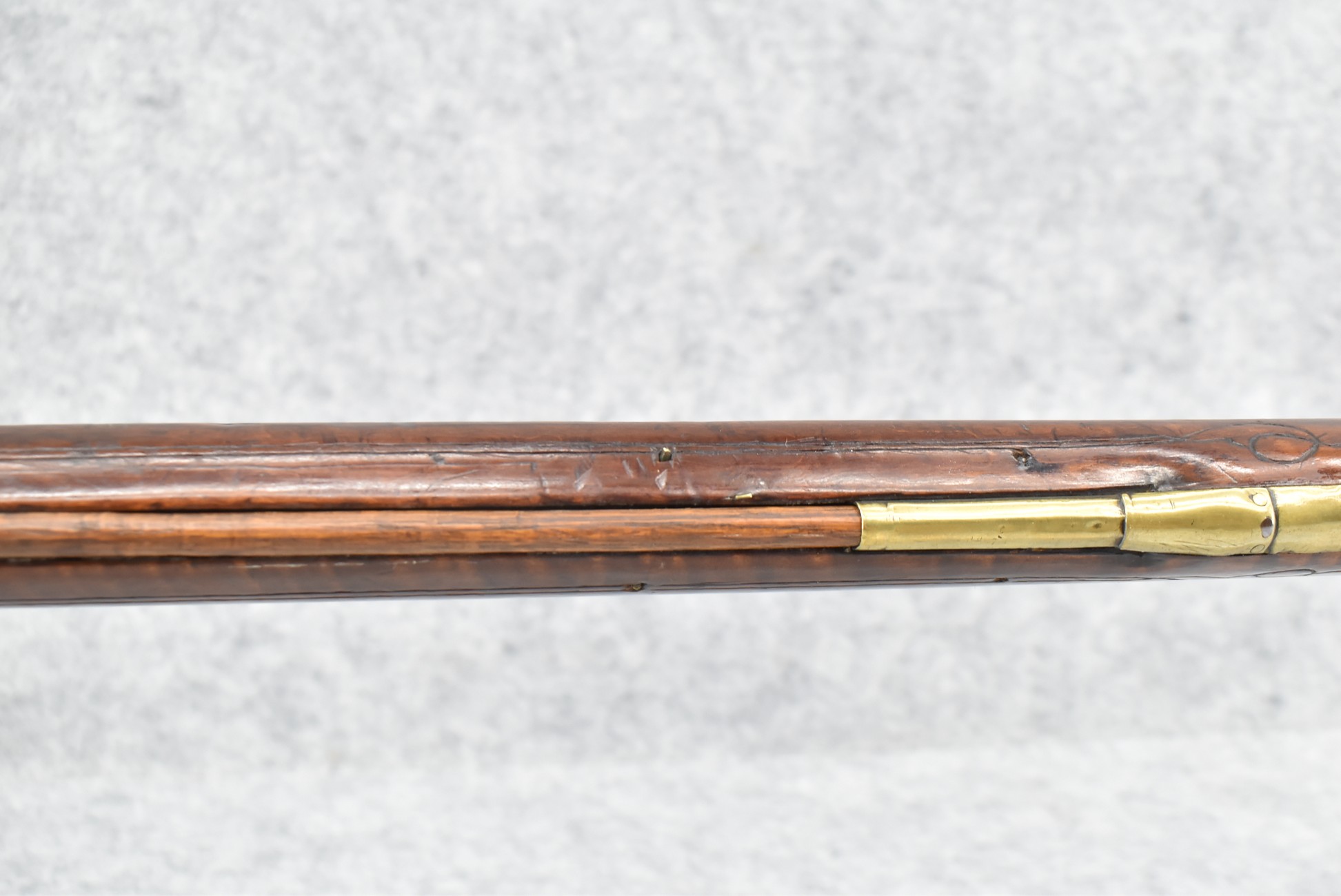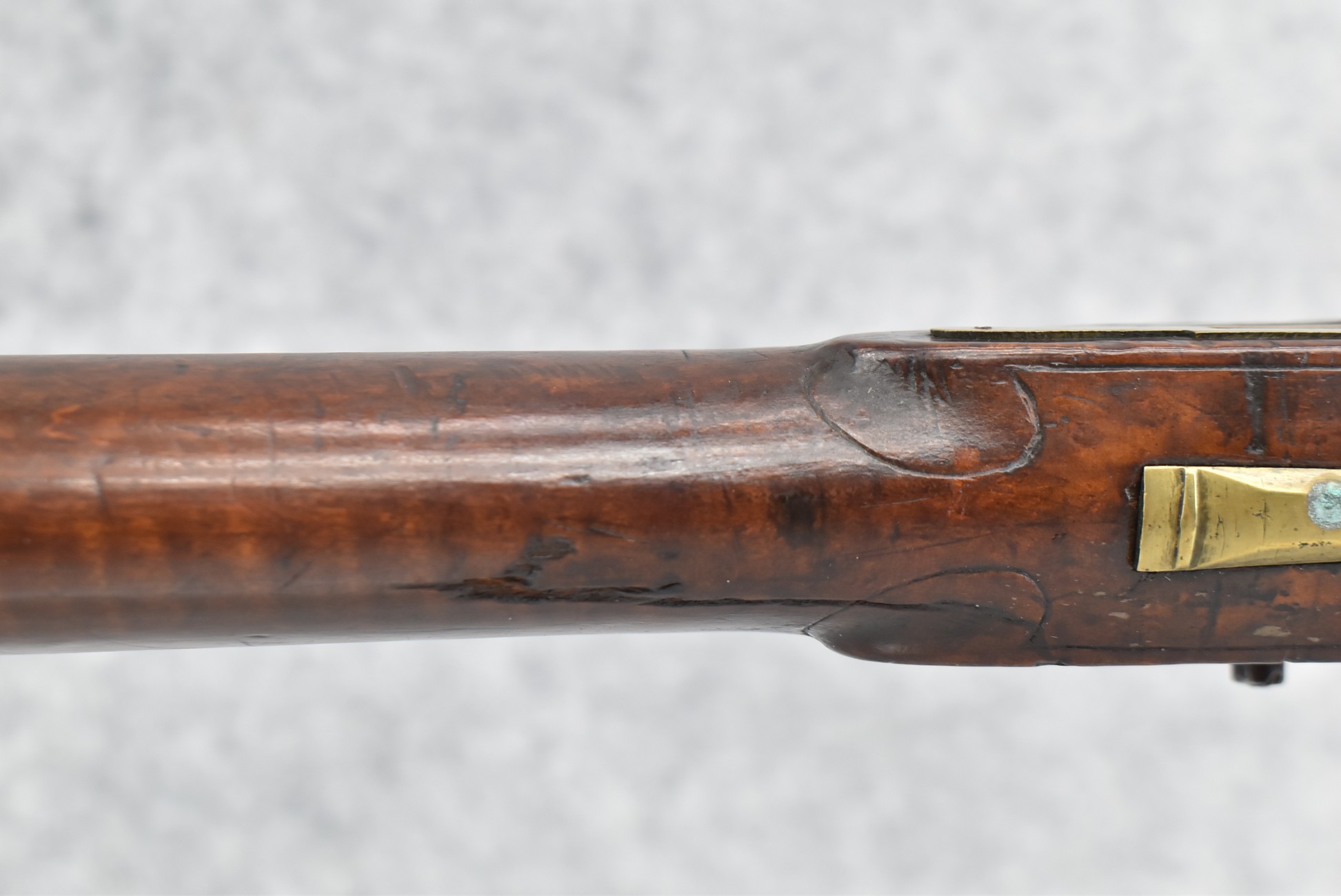 161. Unsigned 35 Cal. Percussion Kentucky Long Rifle Attributed to Jonathan Dunmeyer in Somerset County, PA – w/41” Octagon Barrel w/Sights – w/Full Length Tiger Maple Incised Carved Stock at Wrist, Cheek Piece, Side at Rear Entry Pipe – w/Very Nice 4pc. Patch Box Identical to #130 in Kentucky Rifle & Patch Boxes Vol. 2 by Chandler & Whisker, & Identical Engraving Work – Percussion Cap Lock Signed “D” in Script – w/Brass Furniture – w/Double Set Triggers – Nice Gun! – Some Thought That This Gun Could be a Benjamin Troutman Who Was Also From Somerset County w/A Jonathan Dunmeyer Patch Box, but Many Feel it is a Jonathan Dunmeyer