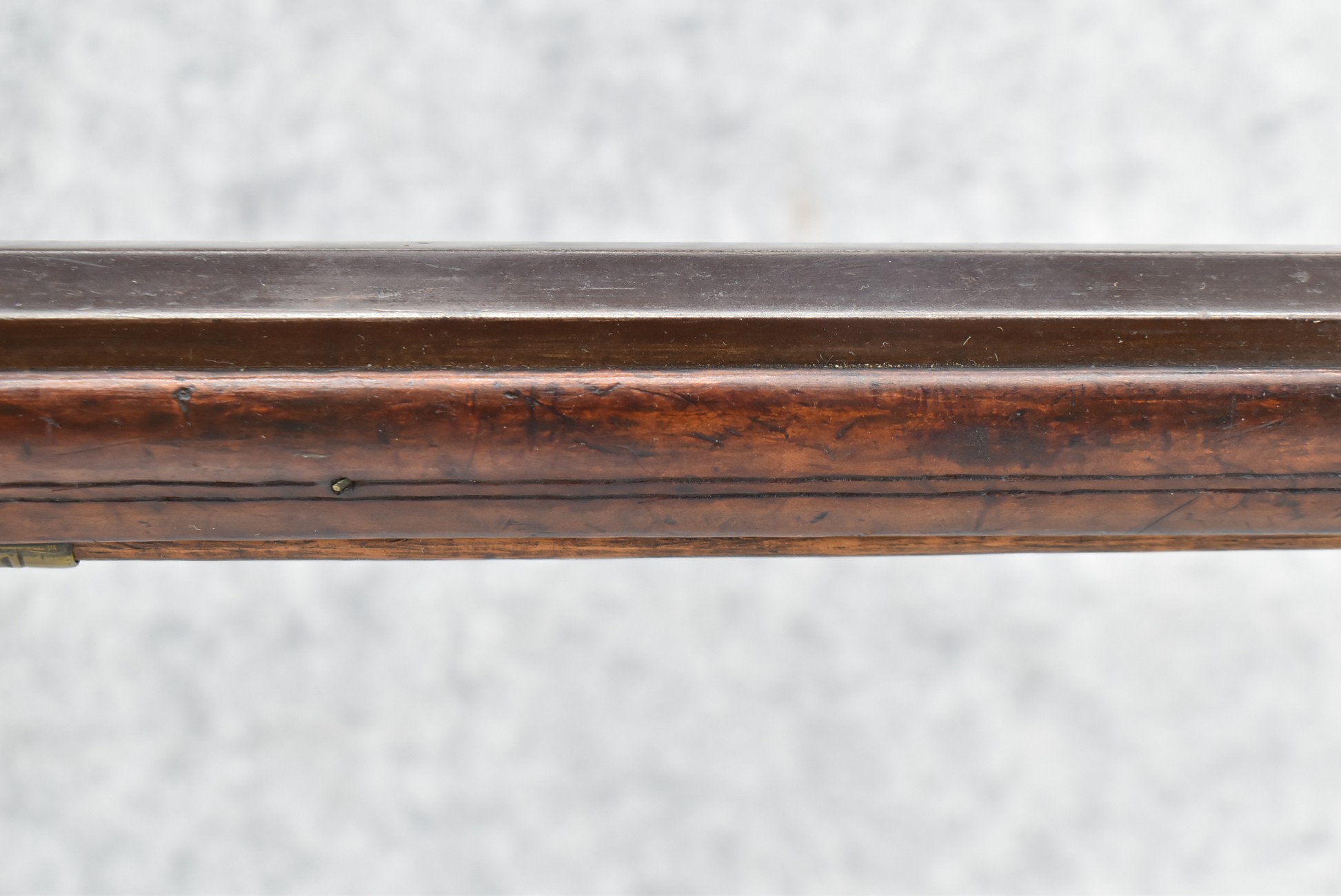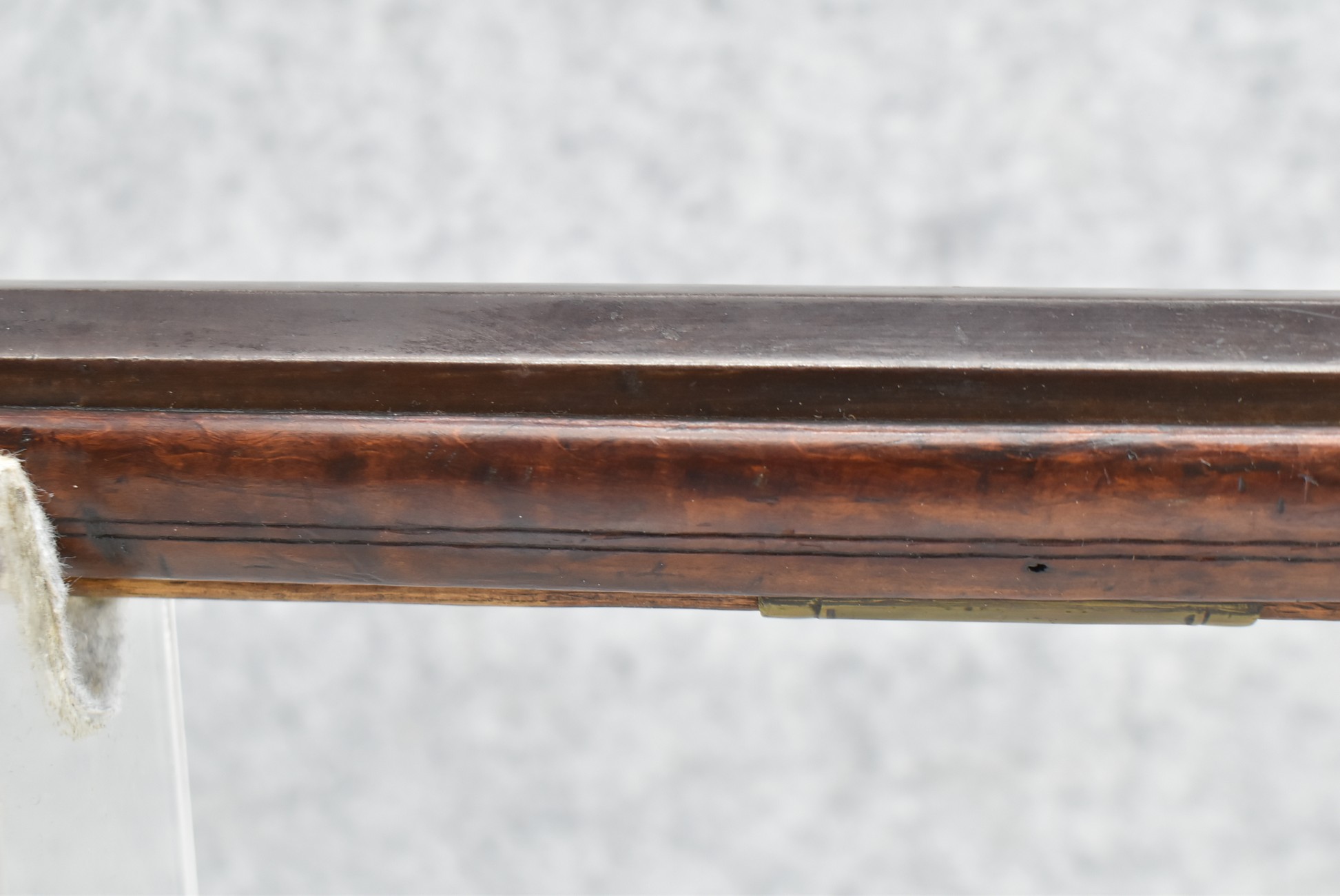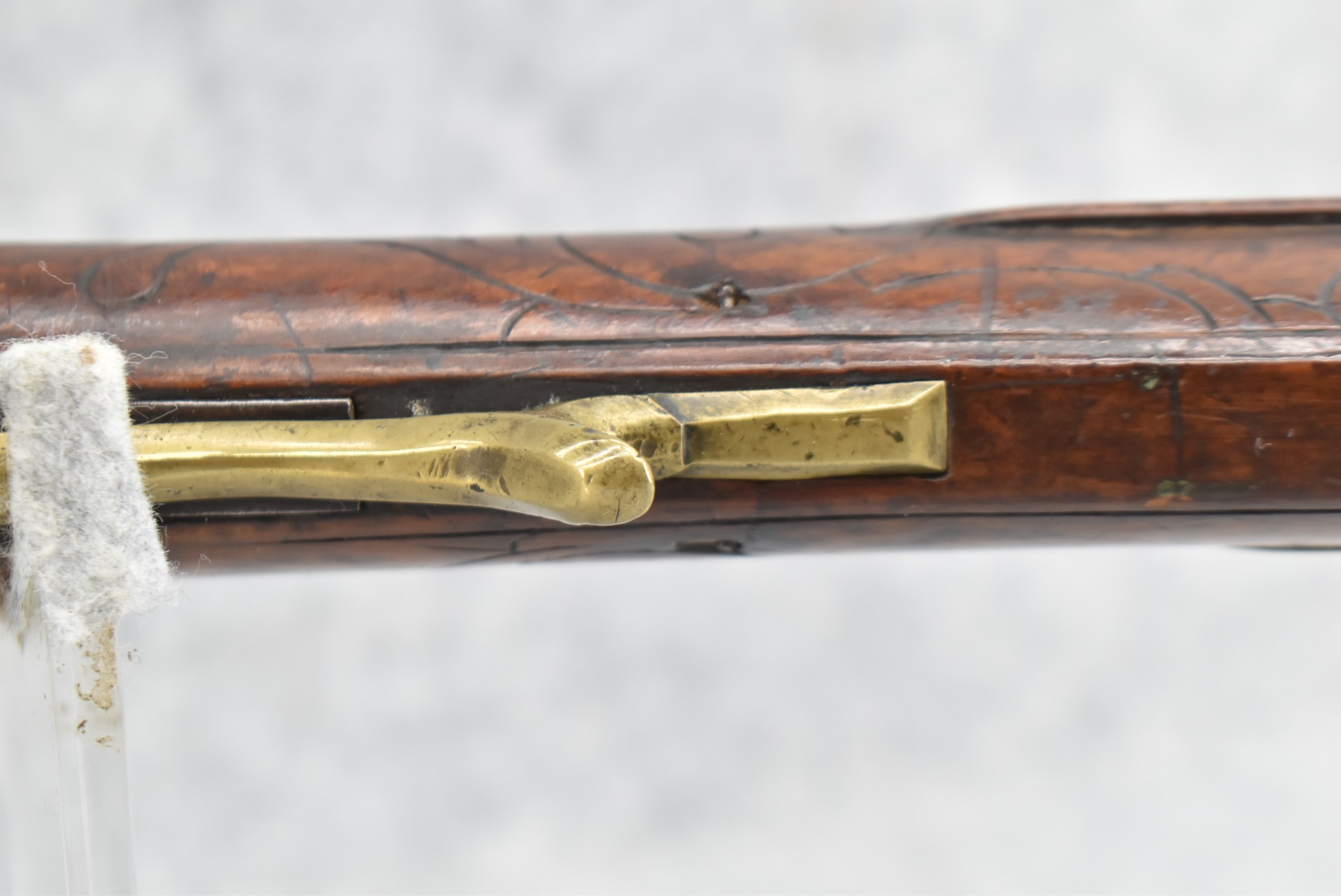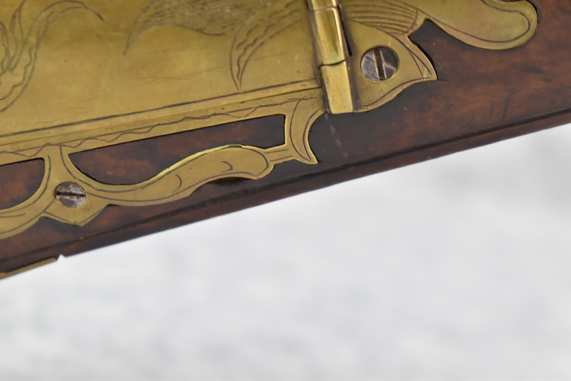 161. Unsigned 35 Cal. Percussion Kentucky Long Rifle Attributed to Jonathan Dunmeyer in Somerset County, PA – w/41” Octagon Barrel w/Sights – w/Full Length Tiger Maple Incised Carved Stock at Wrist, Cheek Piece, Side at Rear Entry Pipe – w/Very Nice 4pc. Patch Box Identical to #130 in Kentucky Rifle & Patch Boxes Vol. 2 by Chandler & Whisker, & Identical Engraving Work – Percussion Cap Lock Signed “D” in Script – w/Brass Furniture – w/Double Set Triggers – Nice Gun! – Some Thought That This Gun Could be a Benjamin Troutman Who Was Also From Somerset County w/A Jonathan Dunmeyer Patch Box, but Many Feel it is a Jonathan Dunmeyer