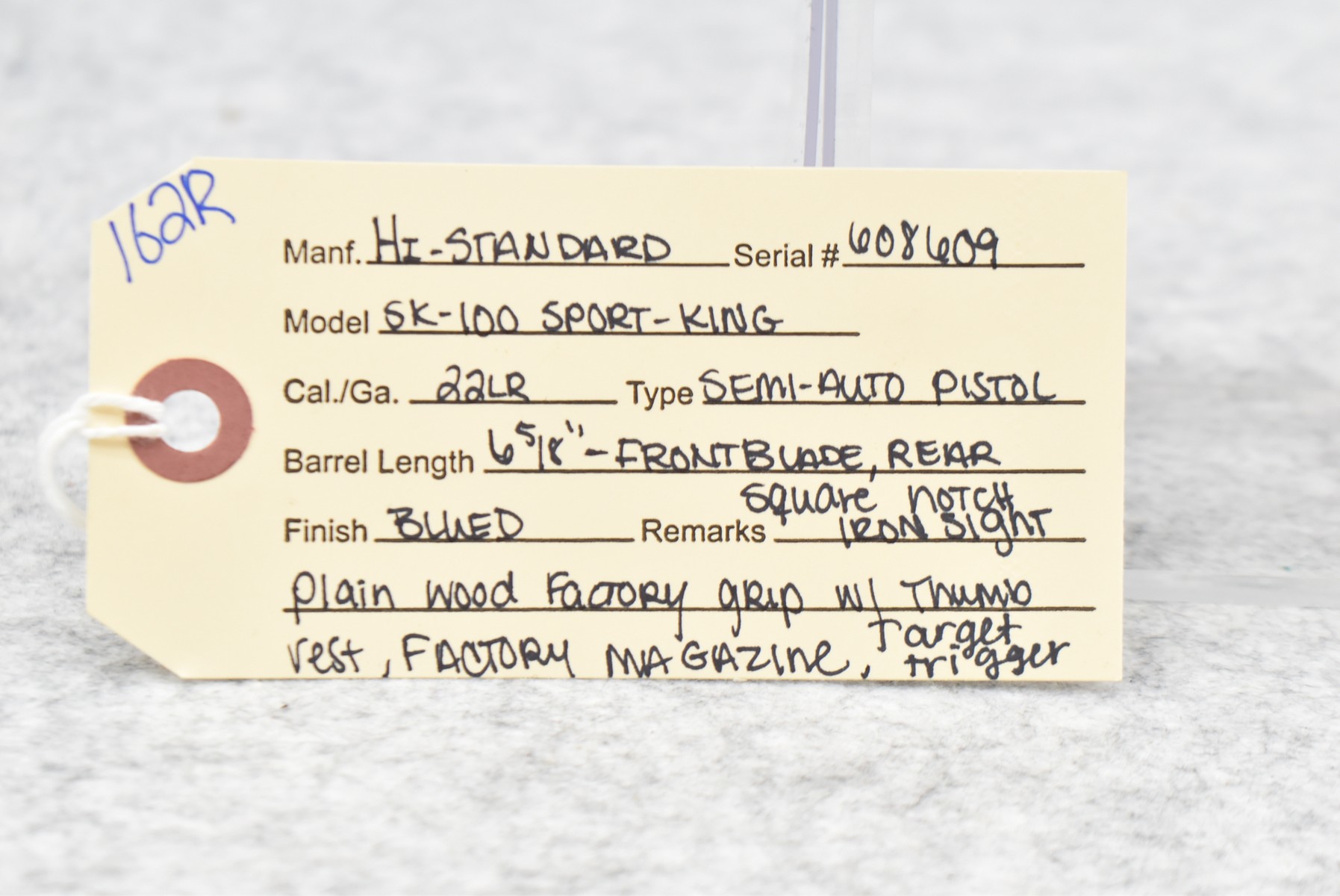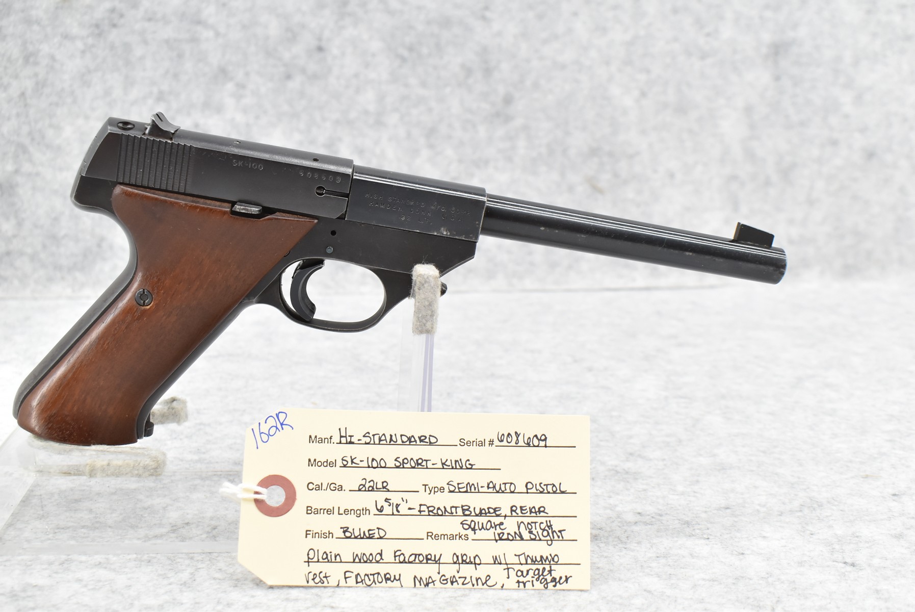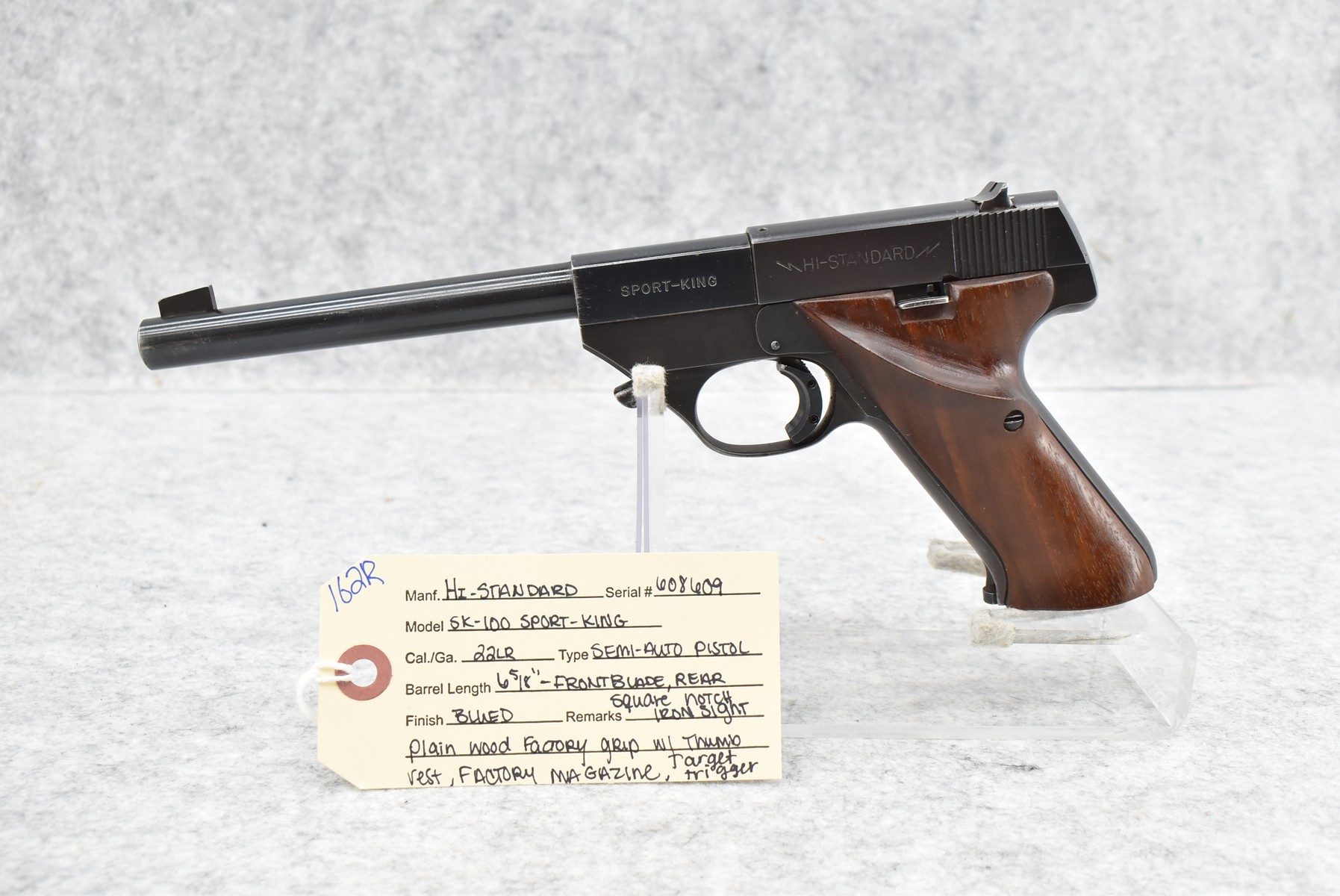 162R.     Hi-Standard – Mod. SK-100 Sport-King – 22LR Cal. Semi-Auto Pistol – w/6 5/8” Barrel w/Front Blade & Rear Square Notch Iron Sights – Blued Finish – w/Plain Wood Factory Grip w/Thumb Rest – w/Factory Magazine