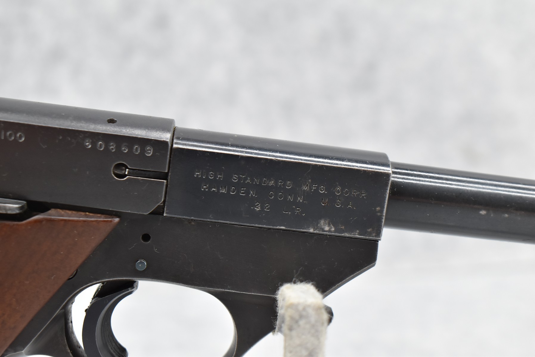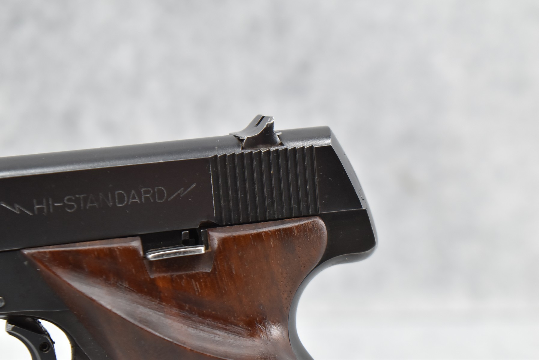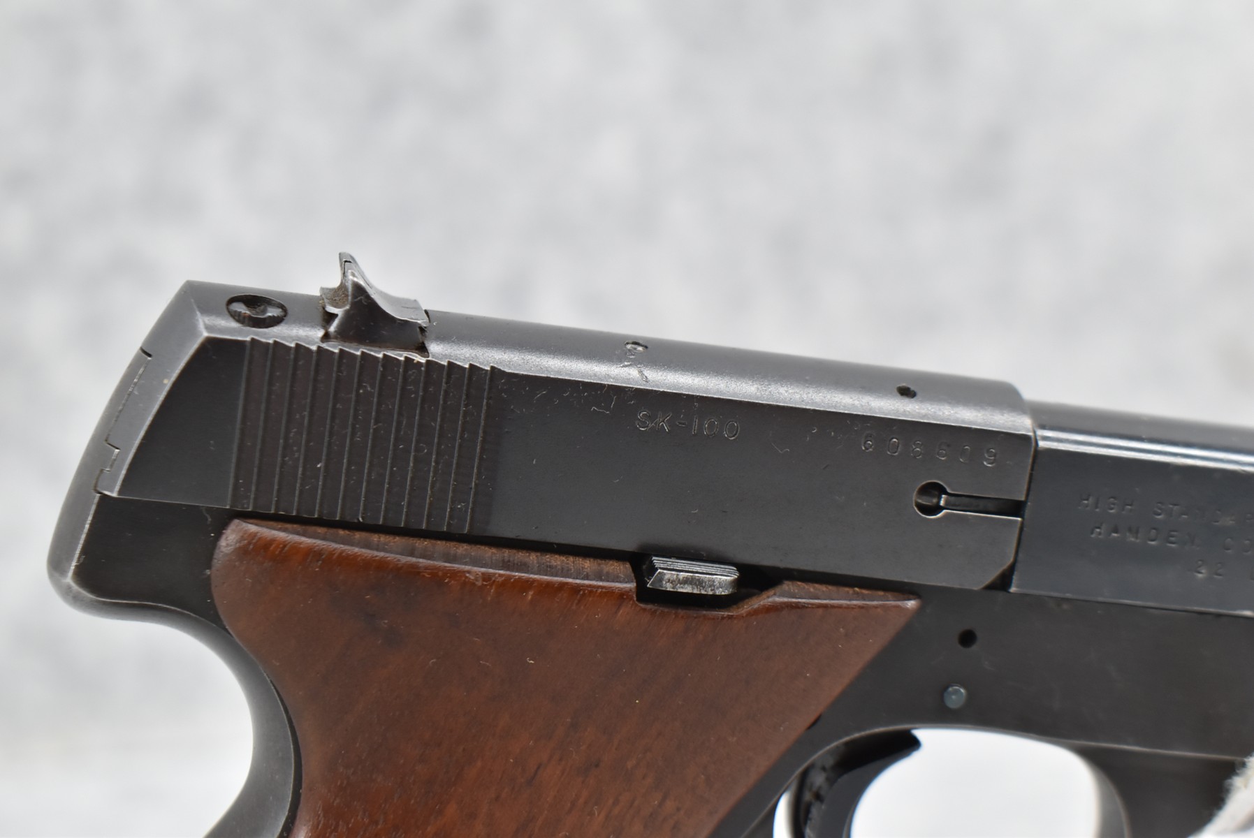 162R.     Hi-Standard – Mod. SK-100 Sport-King – 22LR Cal. Semi-Auto Pistol – w/6 5/8” Barrel w/Front Blade & Rear Square Notch Iron Sights – Blued Finish – w/Plain Wood Factory Grip w/Thumb Rest – w/Factory Magazine