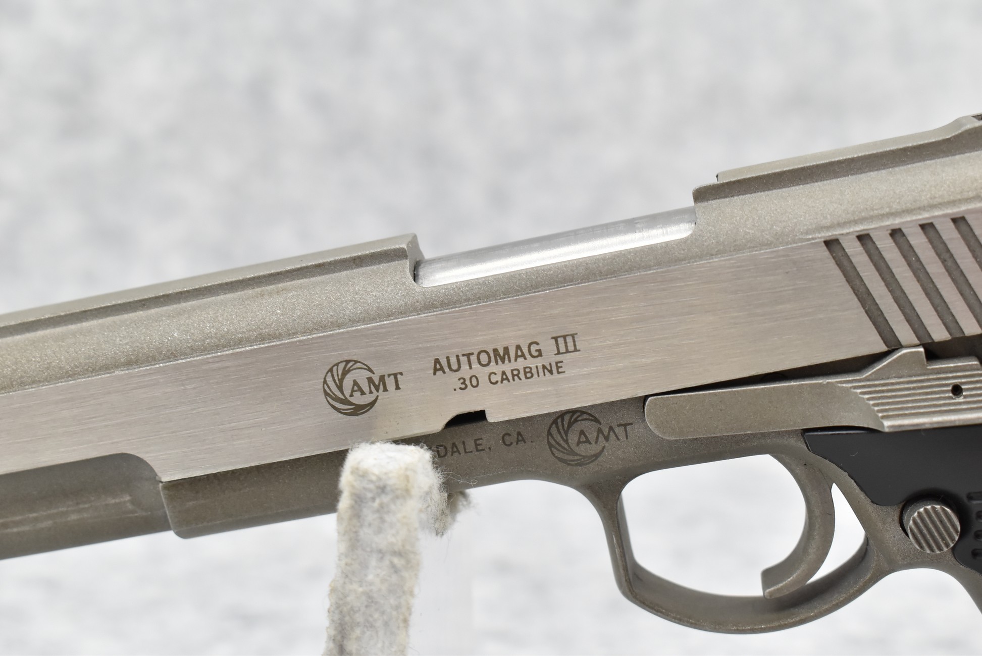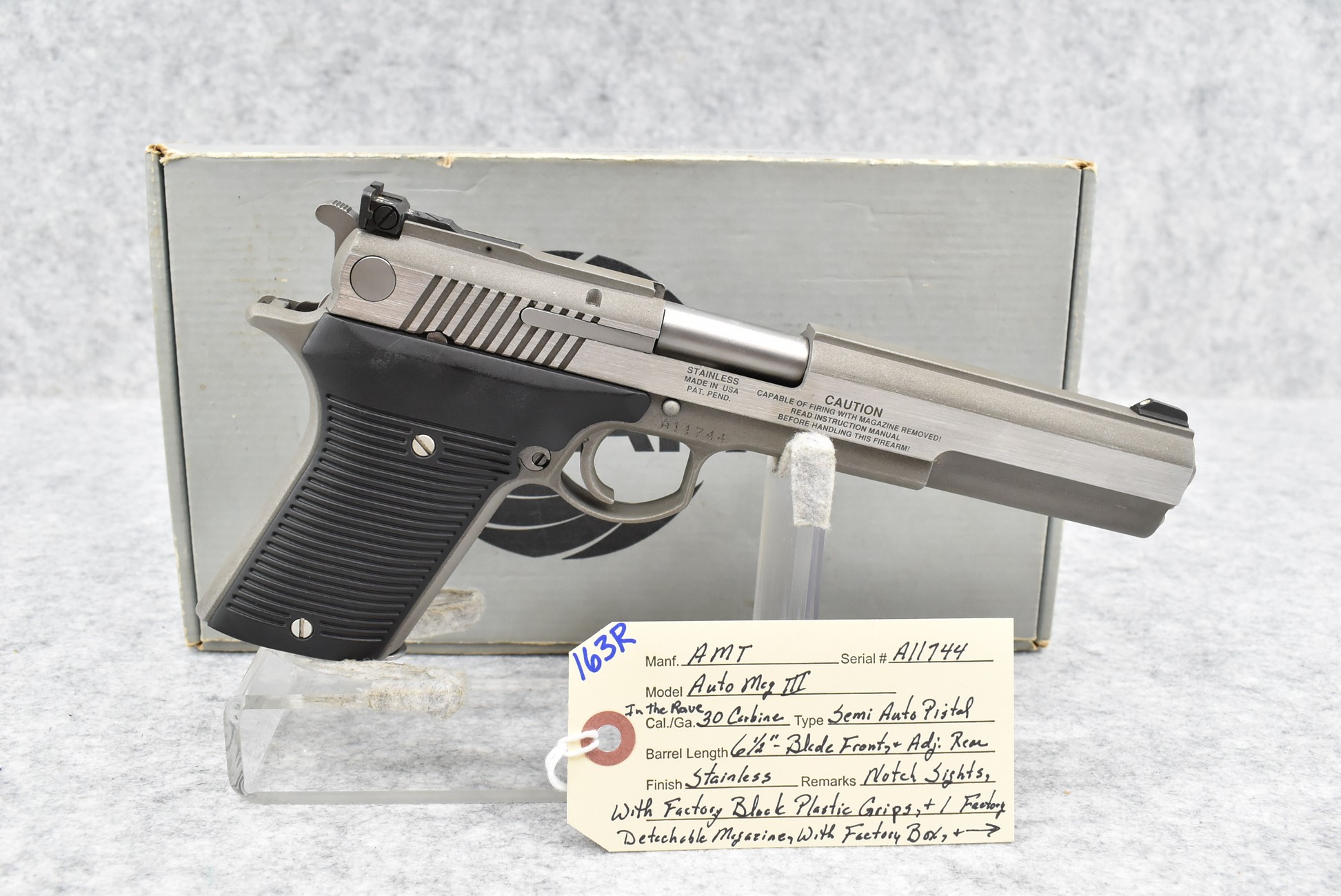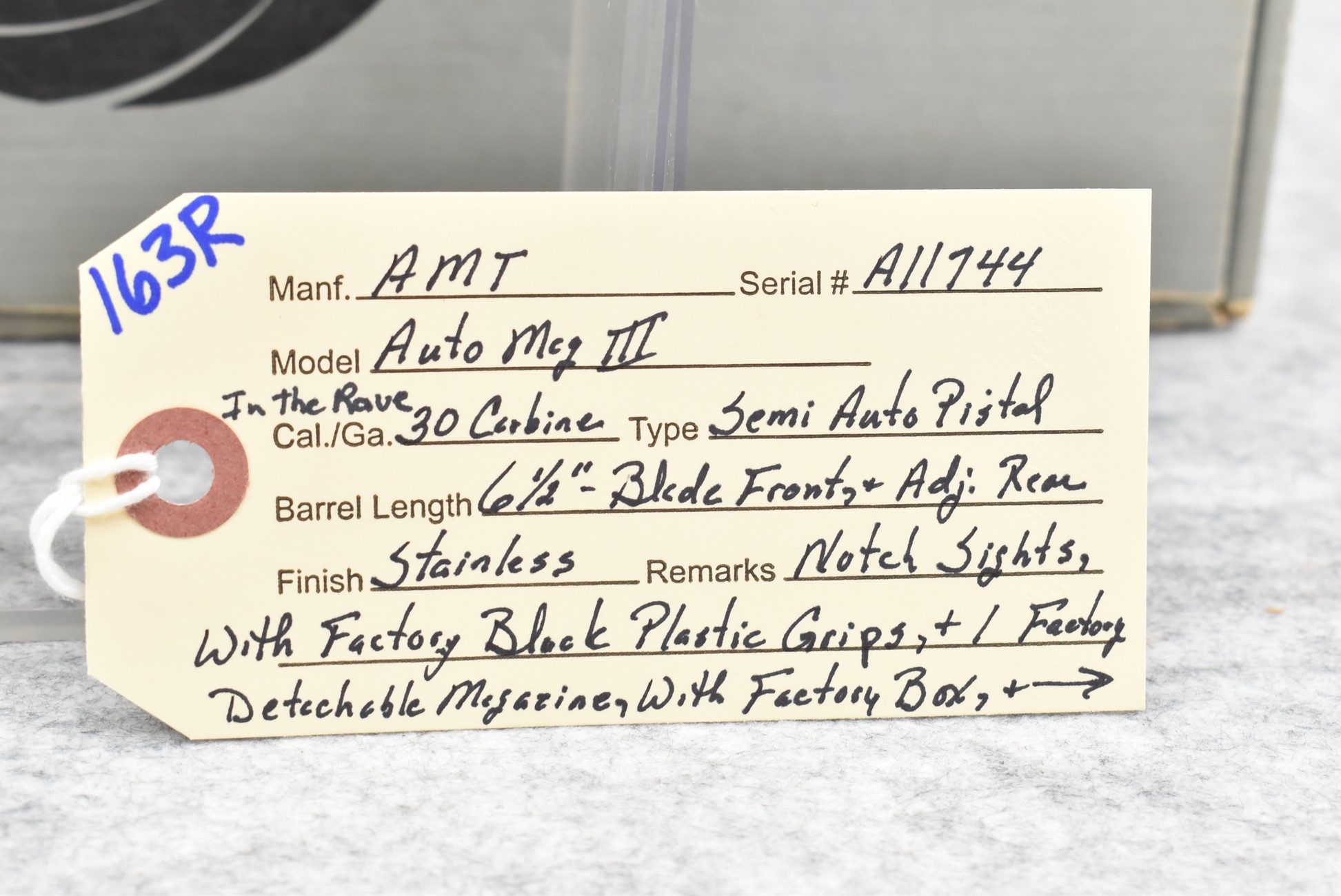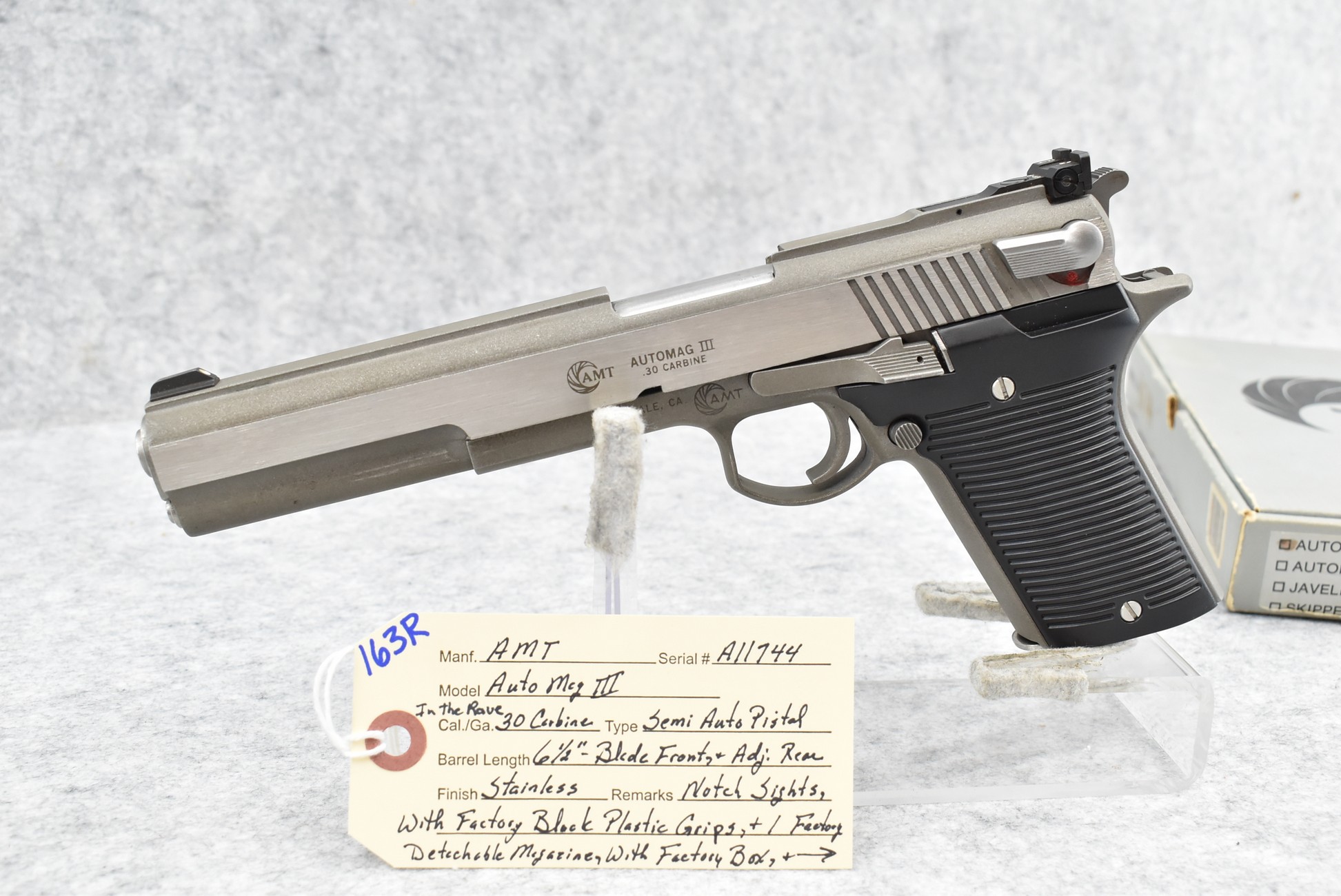 163R.     AMT – Mod. Auto Mag III – In the Rare 30 Carbine Cal. Semi-Auto Pistol – w/6 ½” Barrel w/Blade Front & Adj. Rear Notch Sights – Stainless Finish – w/Factory Black Plastic Grips – w/Factory Detachable Magazine – w/Factory Box & Manual