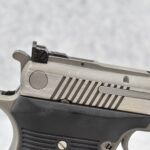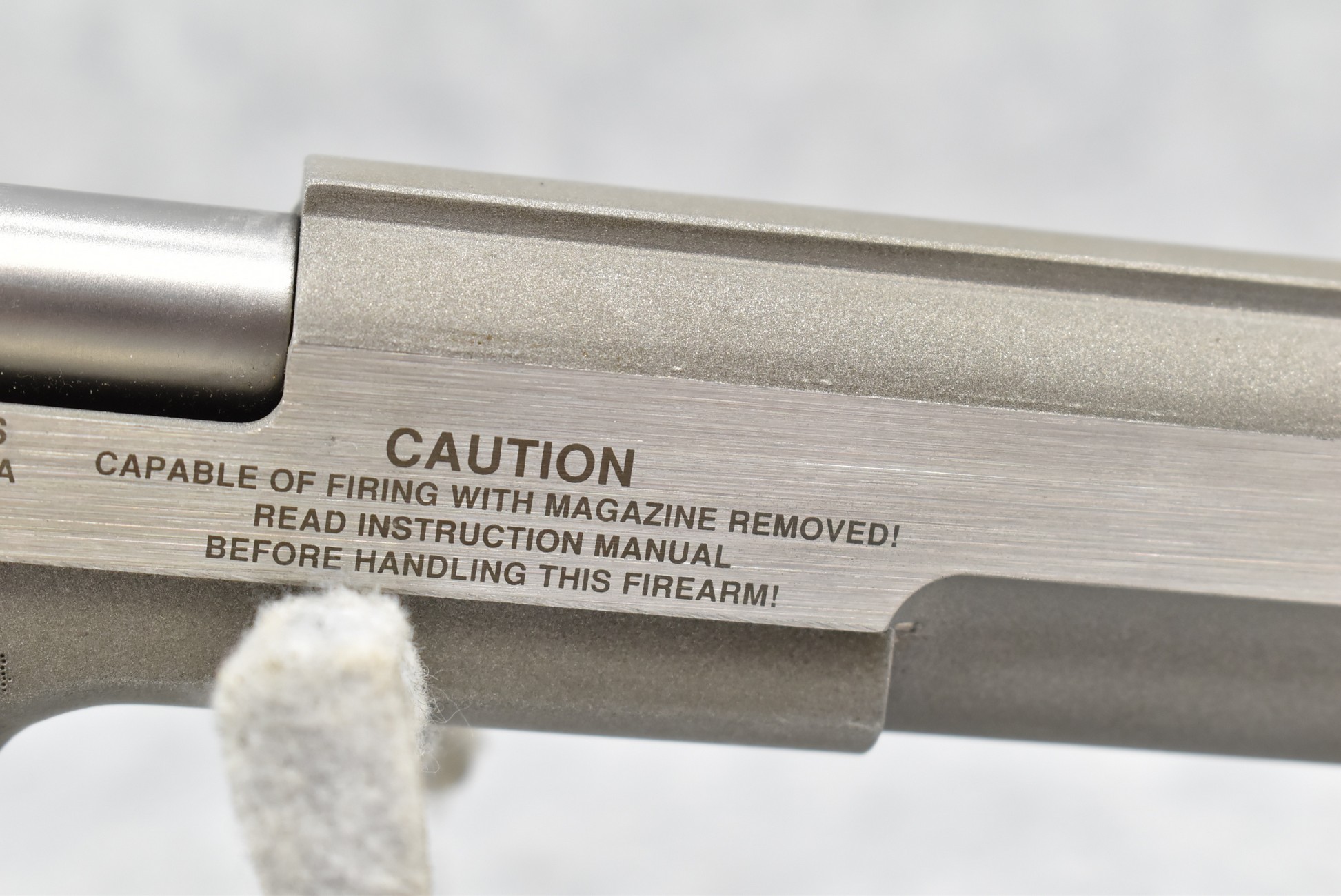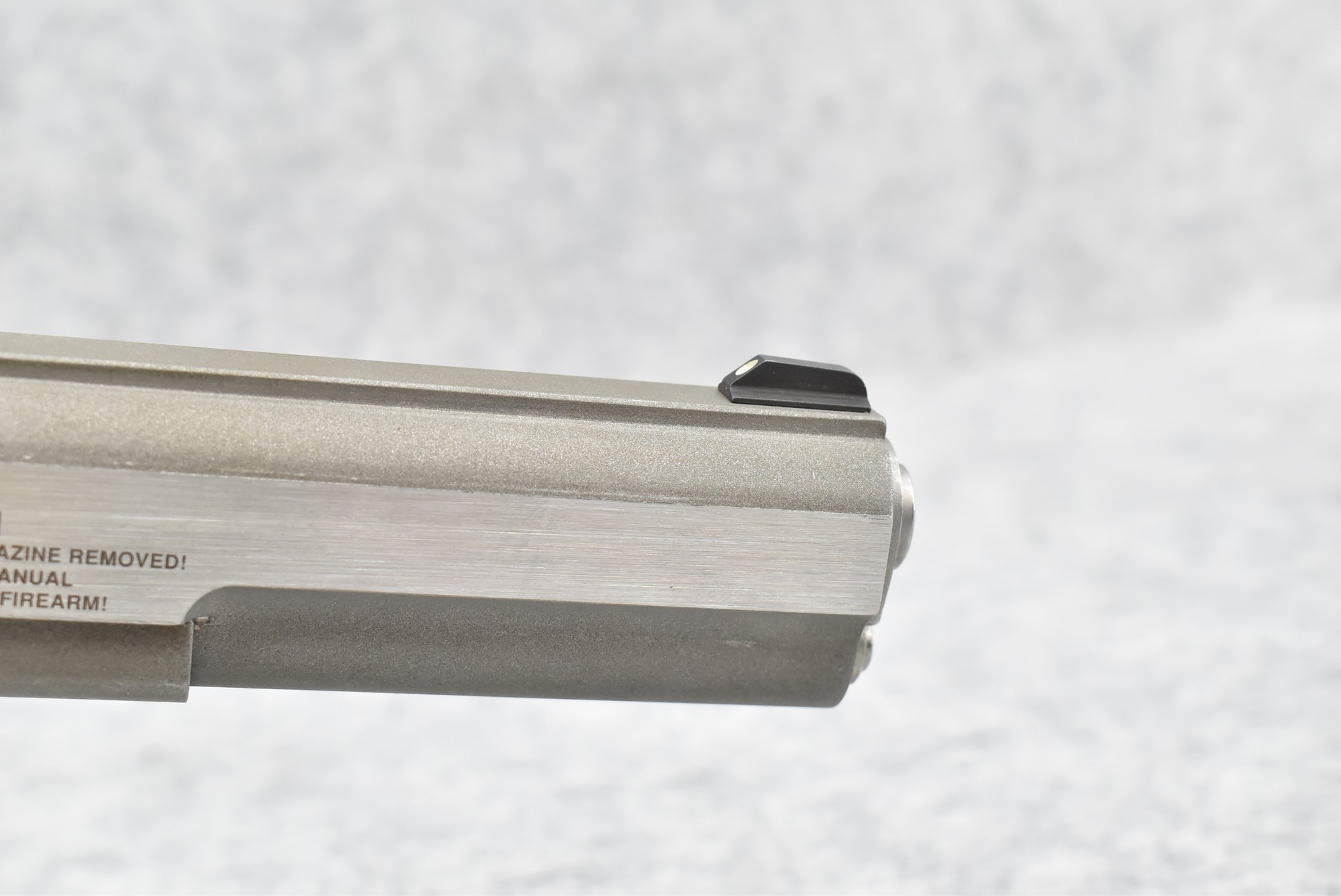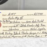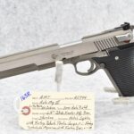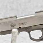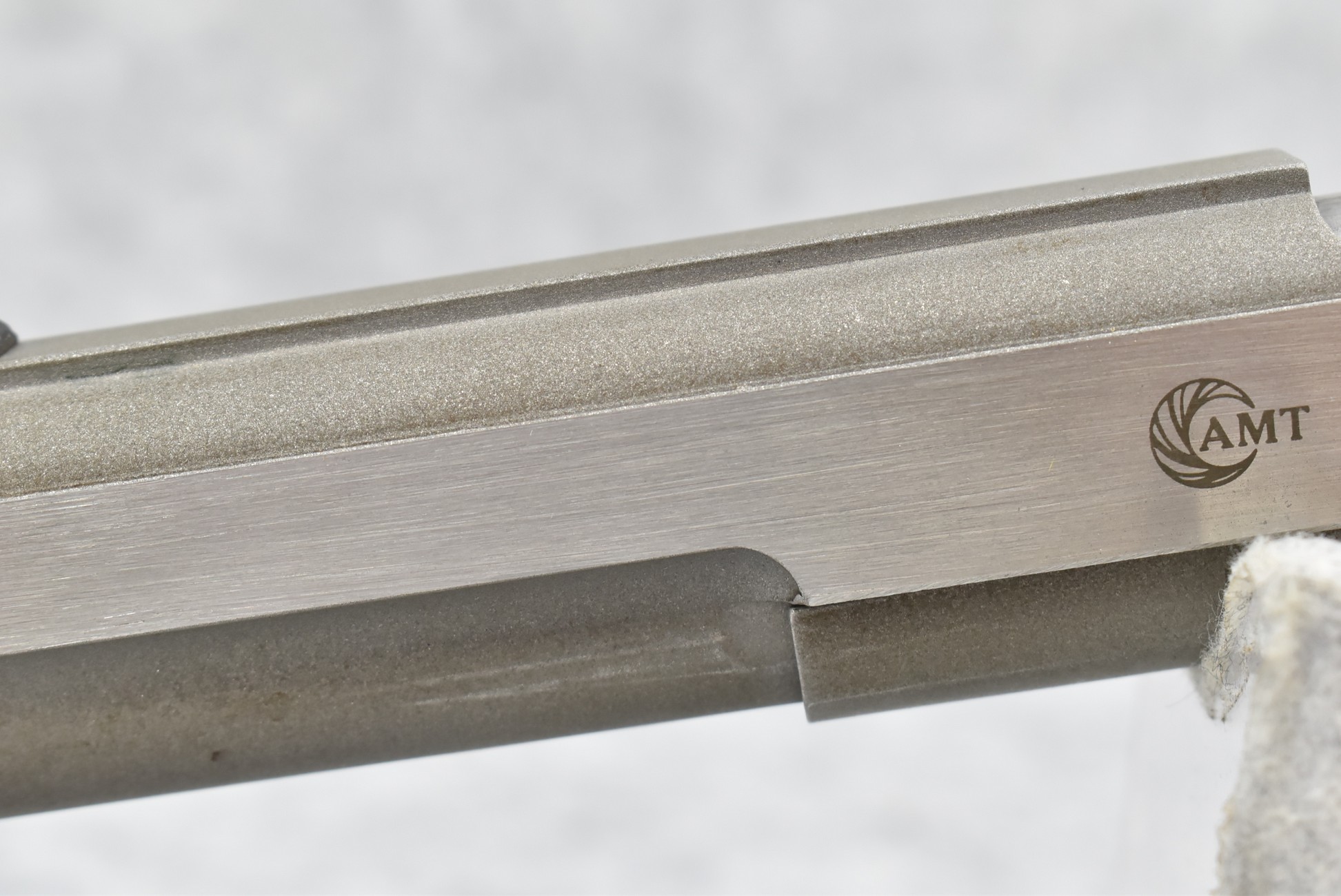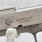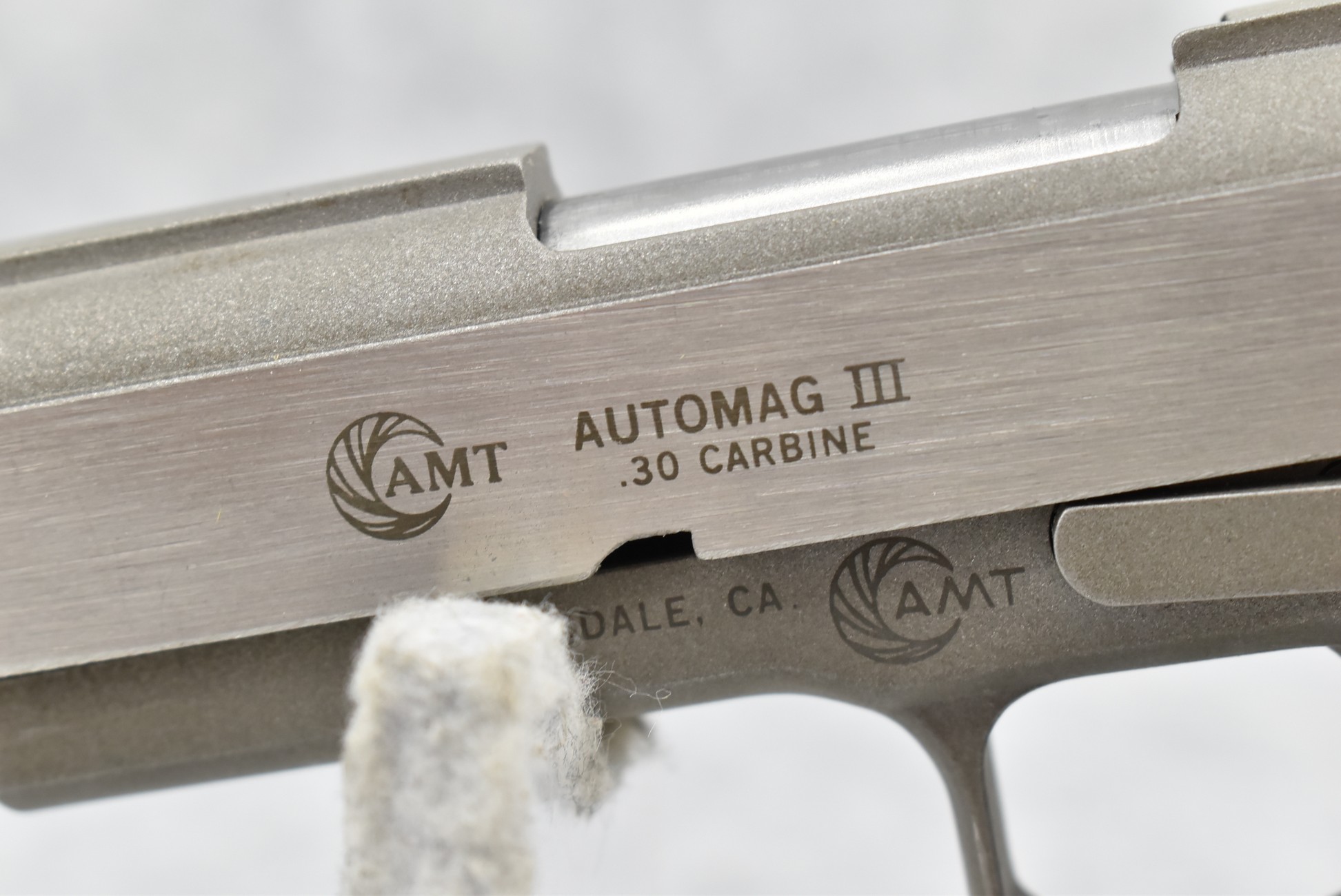 163R.     AMT – Mod. Auto Mag III – In the Rare 30 Carbine Cal. Semi-Auto Pistol – w/6 ½” Barrel w/Blade Front & Adj. Rear Notch Sights – Stainless Finish – w/Factory Black Plastic Grips – w/Factory Detachable Magazine – w/Factory Box & Manual