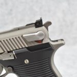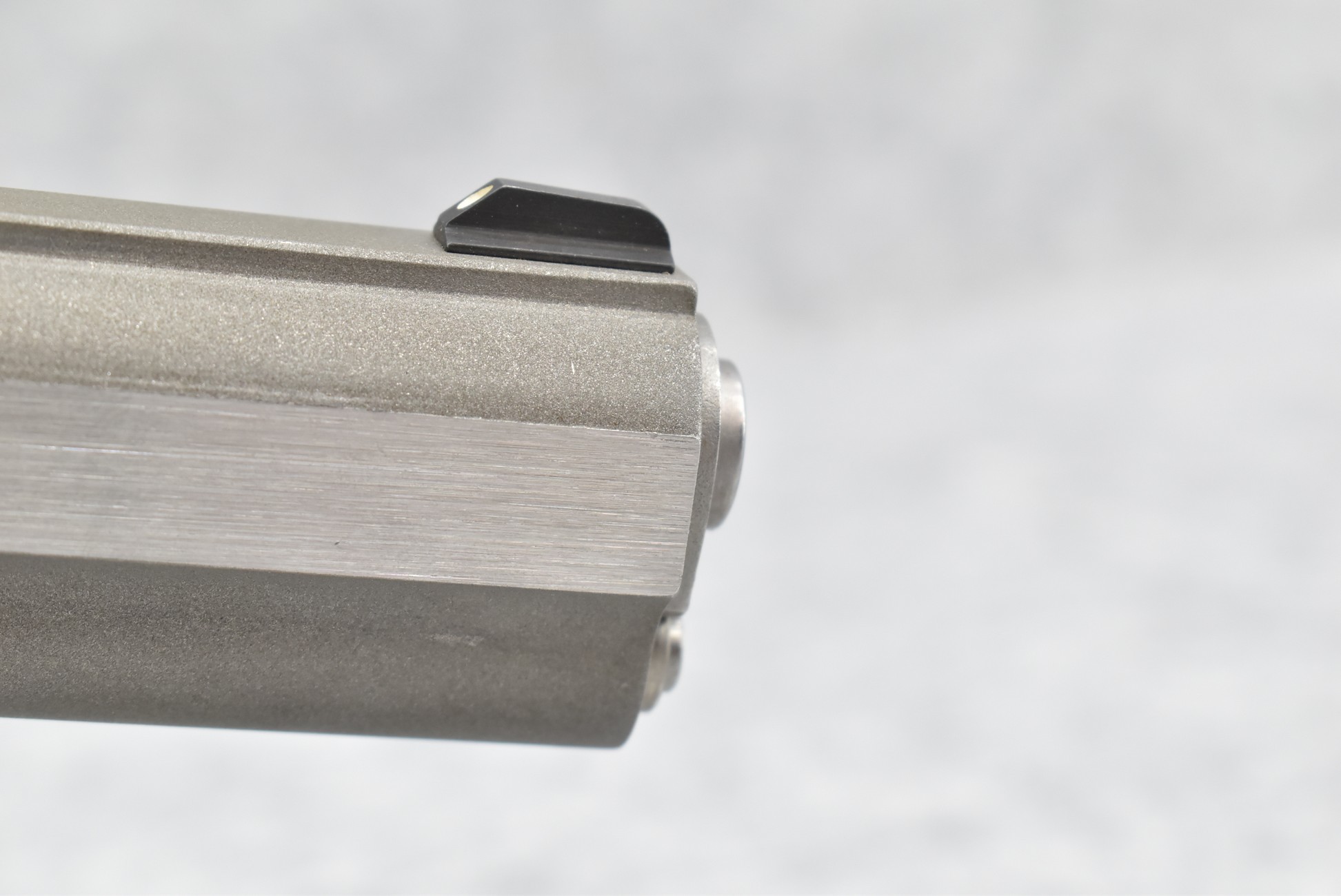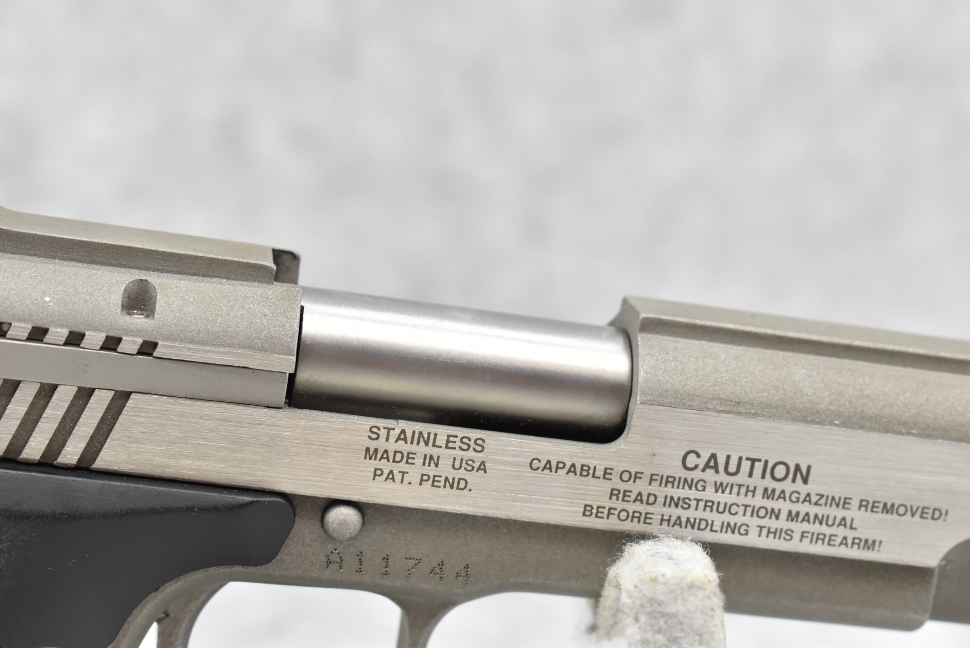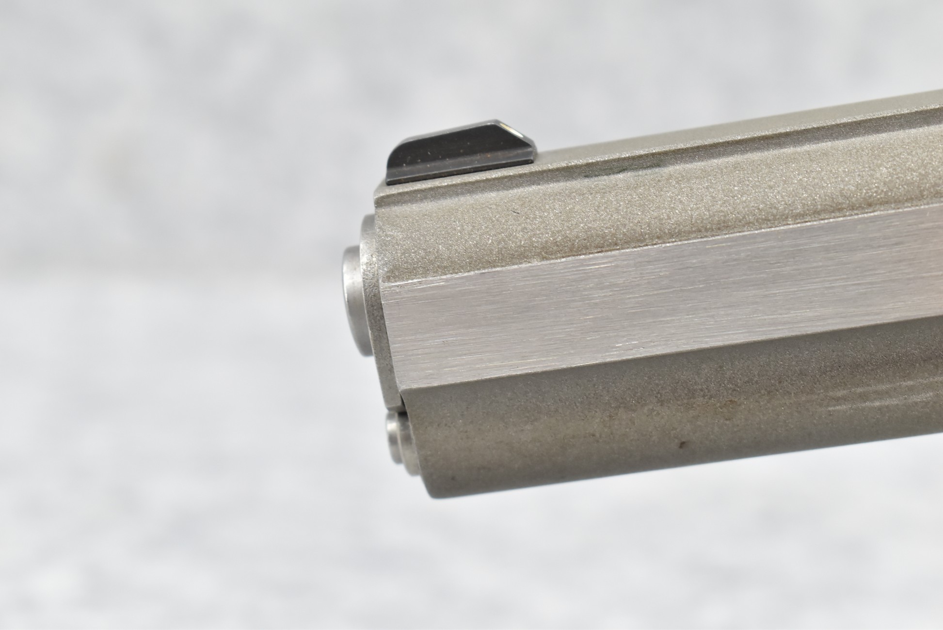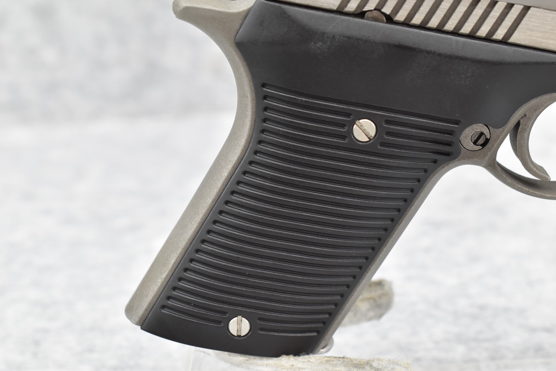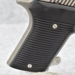 163R.     AMT – Mod. Auto Mag III – In the Rare 30 Carbine Cal. Semi-Auto Pistol – w/6 ½” Barrel w/Blade Front & Adj. Rear Notch Sights – Stainless Finish – w/Factory Black Plastic Grips – w/Factory Detachable Magazine – w/Factory Box & Manual