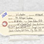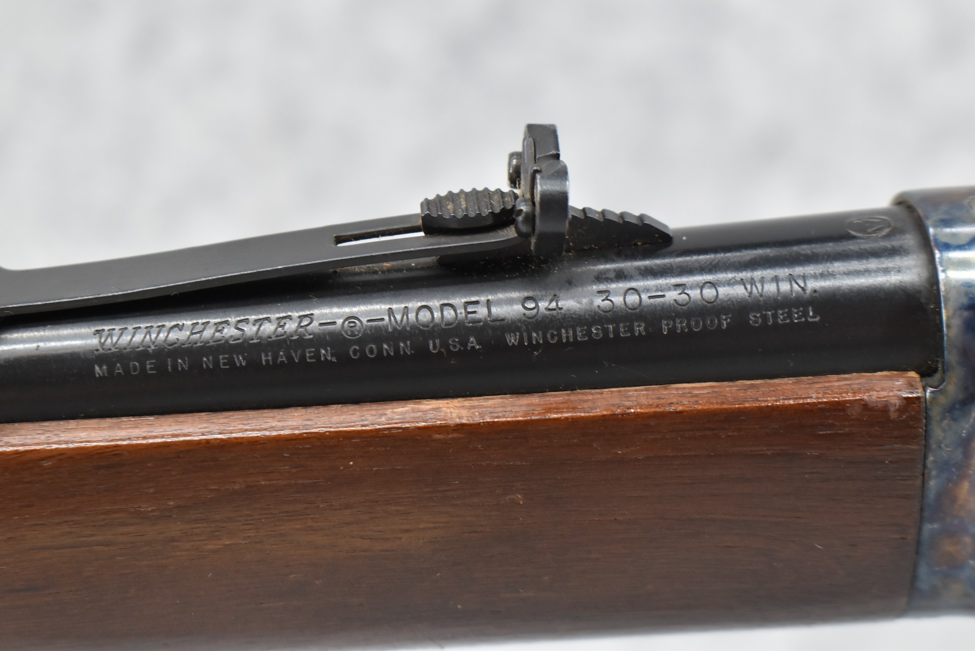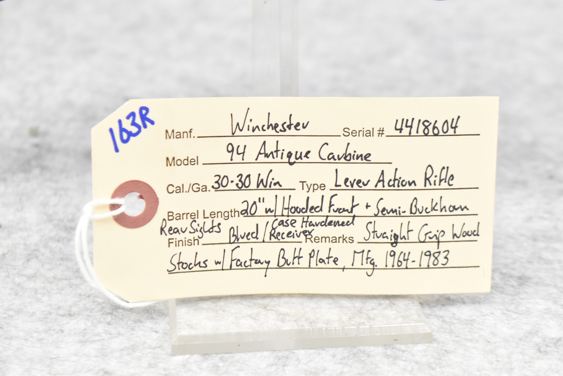 163R. Winchester – Mod. 94 “Antique” Carbine – 30-30 Win. Cal. Lever Action Rifle – w/20” Barrel w/Hooded Front & Semi-Buckhorn Rear Sights – Blued Finish w/Case Hardened Receiver – w/Straight Grip Wood Stocks w/Factory Butt Plate – Mfg. 1964-1983