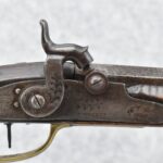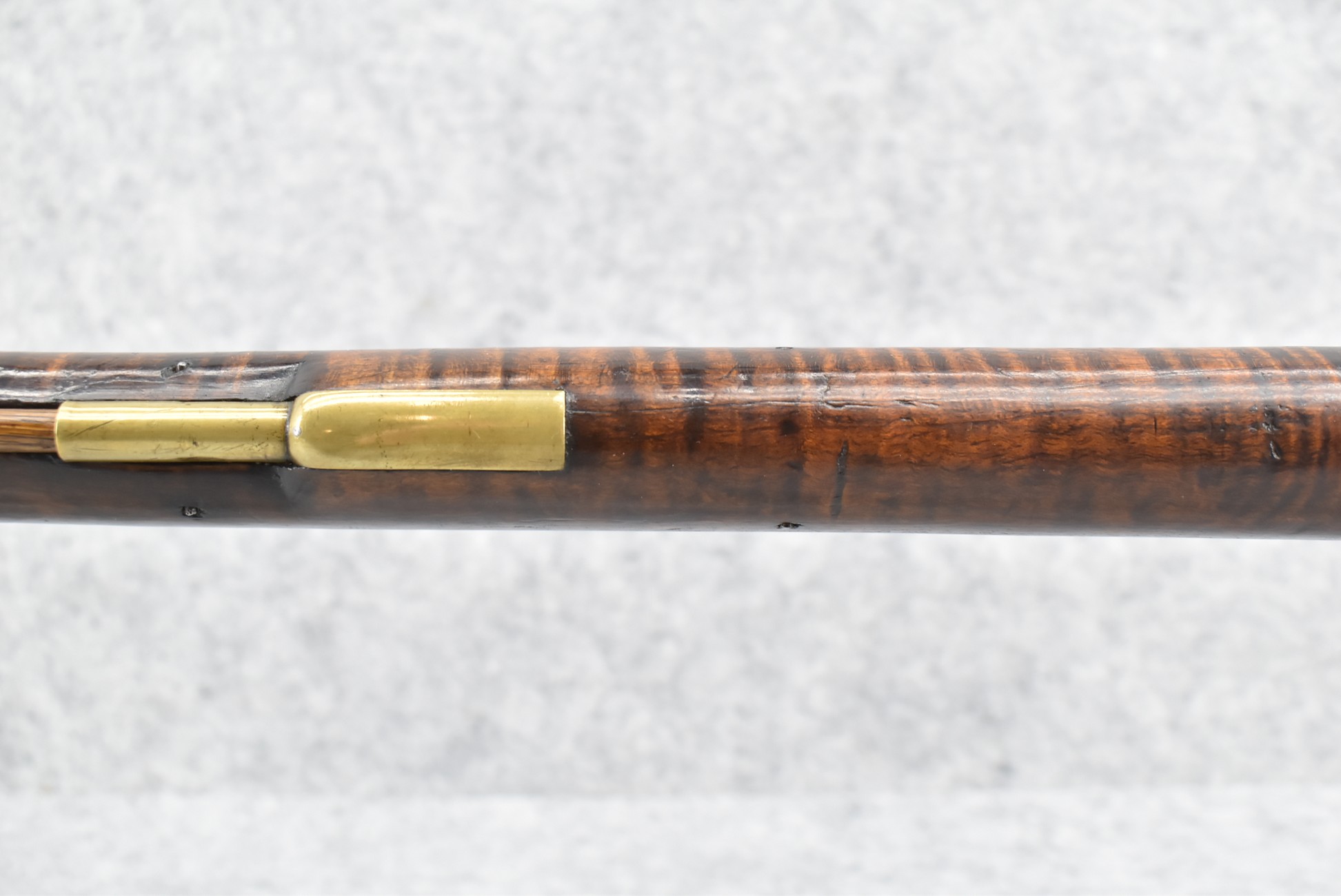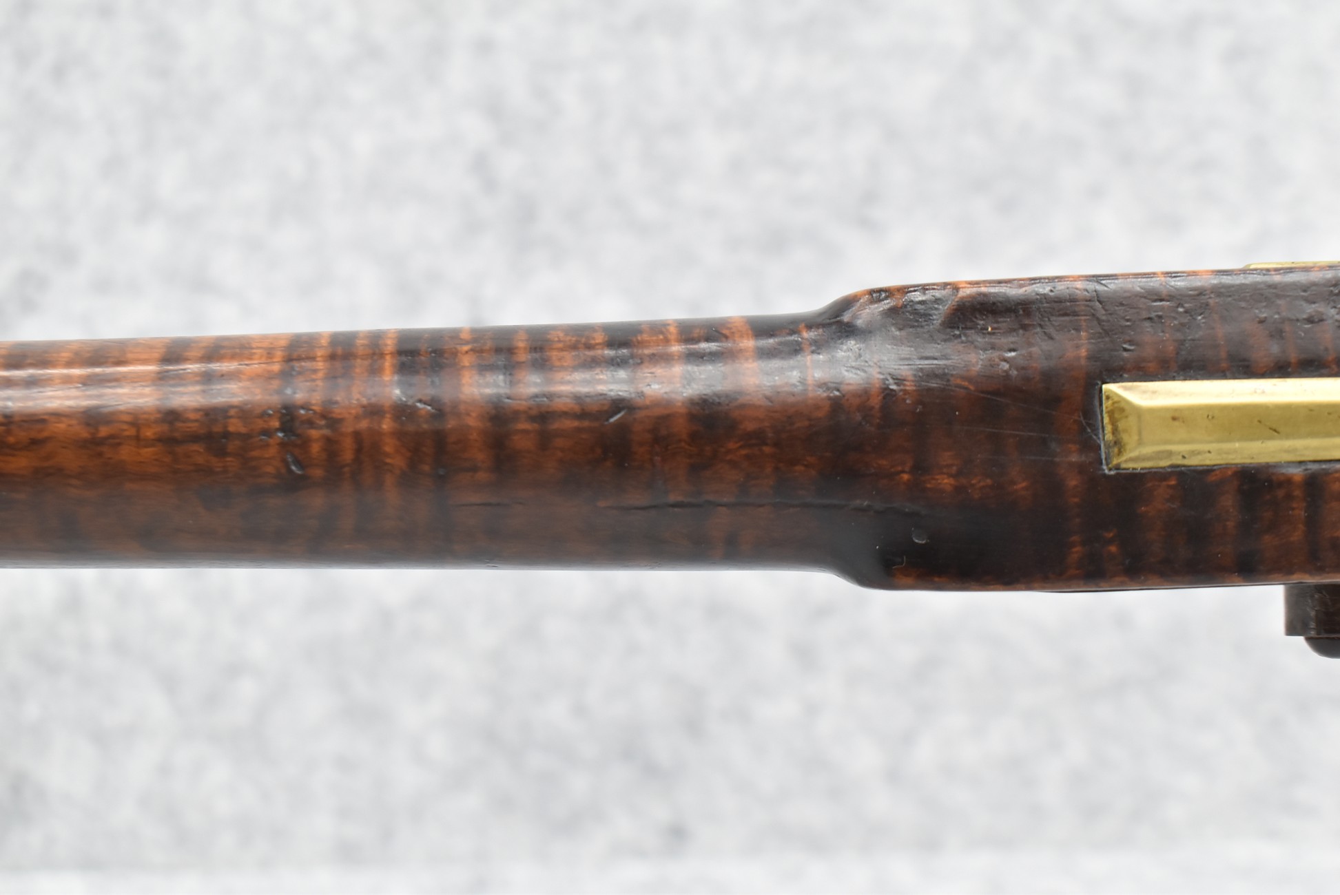 164. Signed J Mier (Jacob) of Somerset PA (1793-1873) 50 Cal. Percussion Full Stock Kentucky Long Rifle – w/40” Signed Octagon Barrel w/Sights – w/Full Length Tiger Maple Wood Stock w/4pc. Engraved Patch Box & Brass Furniture – Lock Plate Marked “London Warranted” – Converted to Percussion w/Bedford Style Hammer, Lock Loose – w/Engraved 2 Bolt Back Lock Plate – w/Double Set Triggers – Note: Small Crack From Trigger Guard to Patch Box – There is Some Thought That This Could be John Mier – Overall Length of 56”