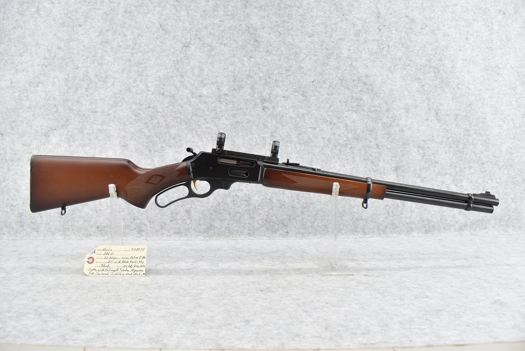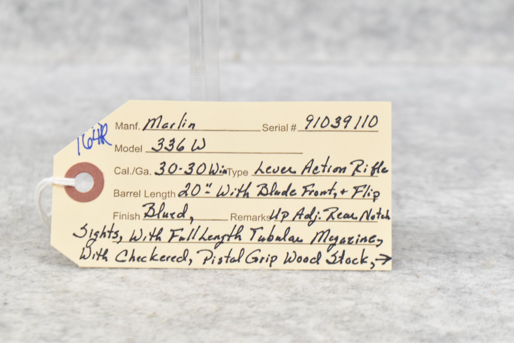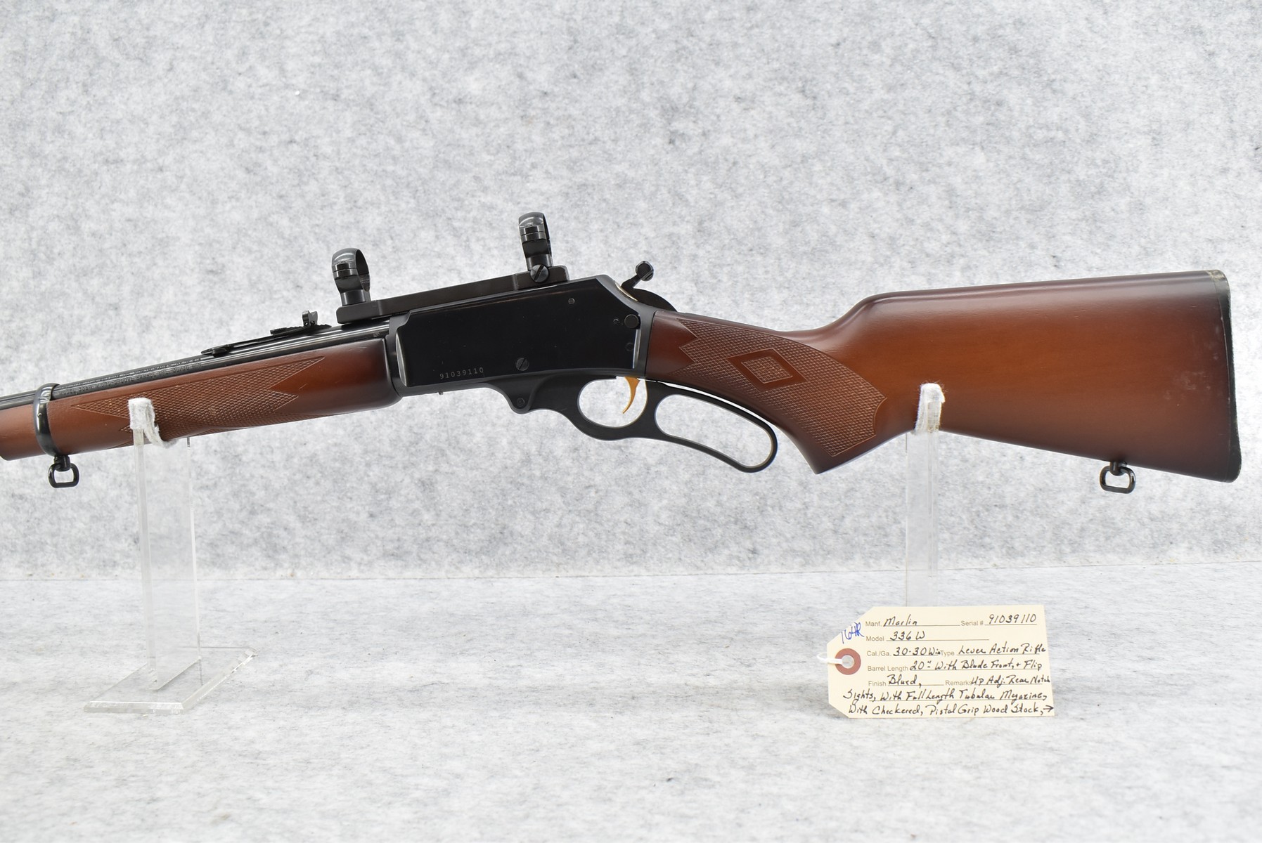 164R. Marlin – Mod. 336 W – 30-30 Win. Cal. Lever Action Rifle – w/20” Barrel w/Blade Front & Flip Up Adj. Rear Notch Sights w/Full Length Tubular Magazine – Blued Finish – w/Checkered Pistol Grip Wood Stocks w/Factory Butt Plate – w/Sling Loops – w/Scope Rings & Mounting Base