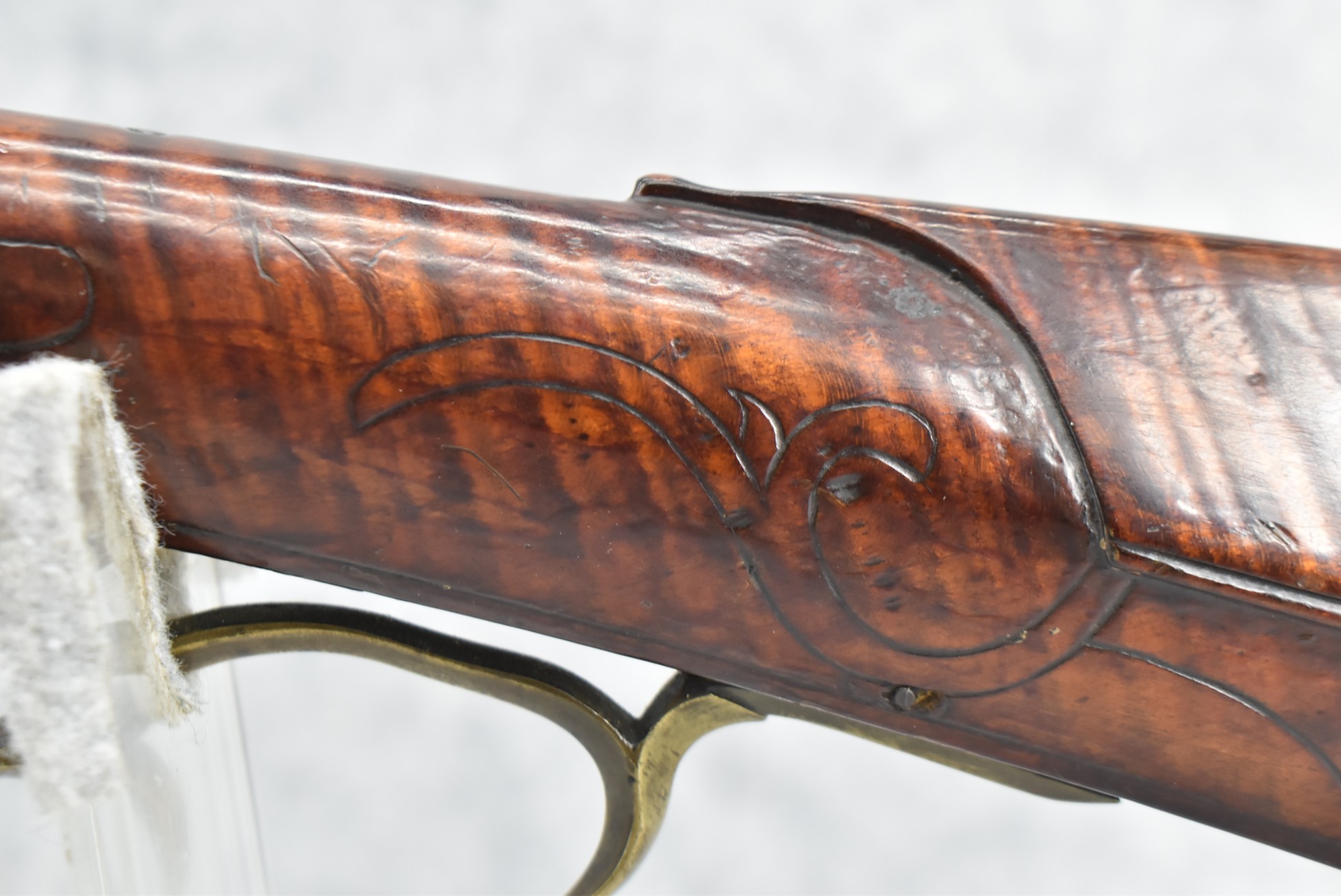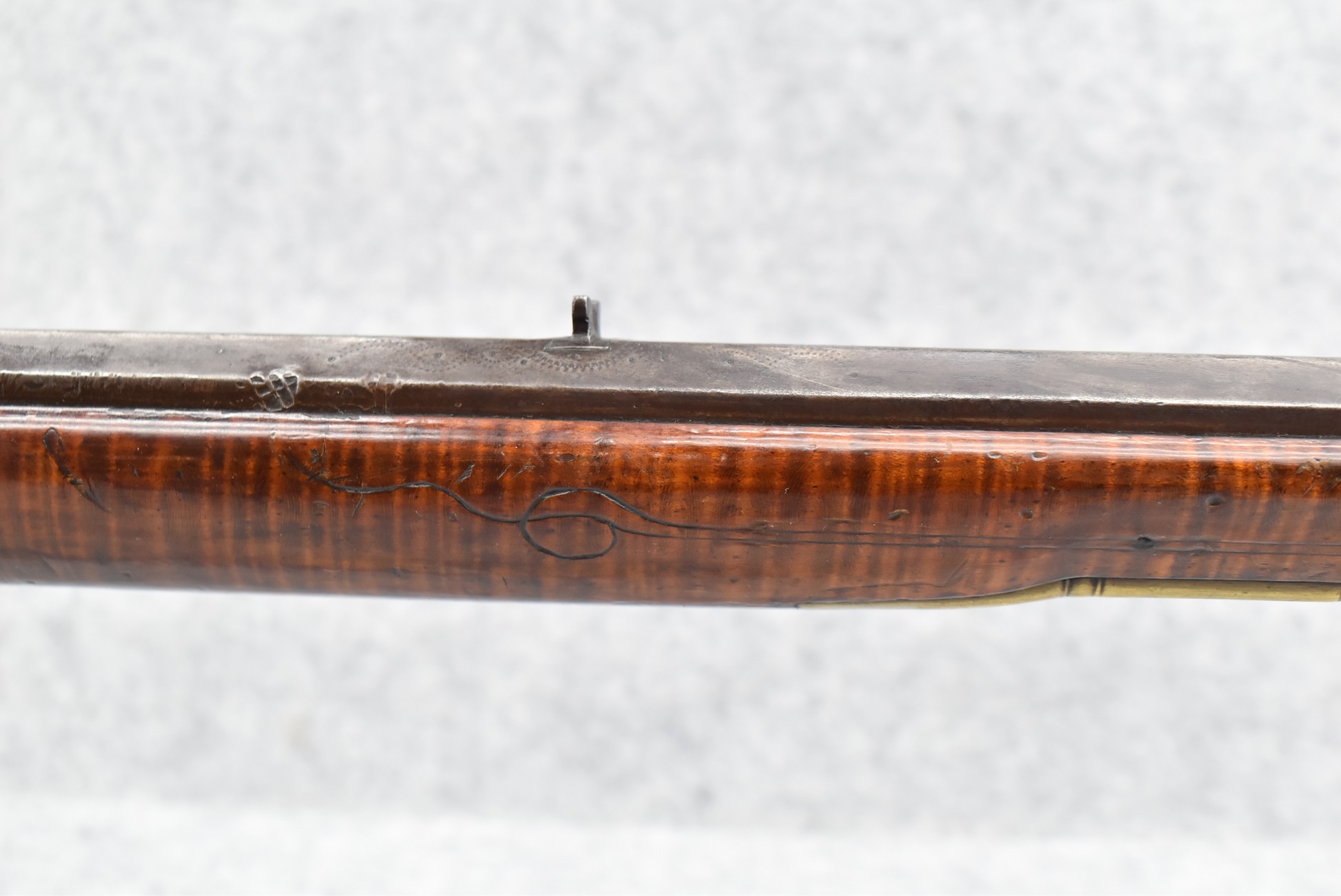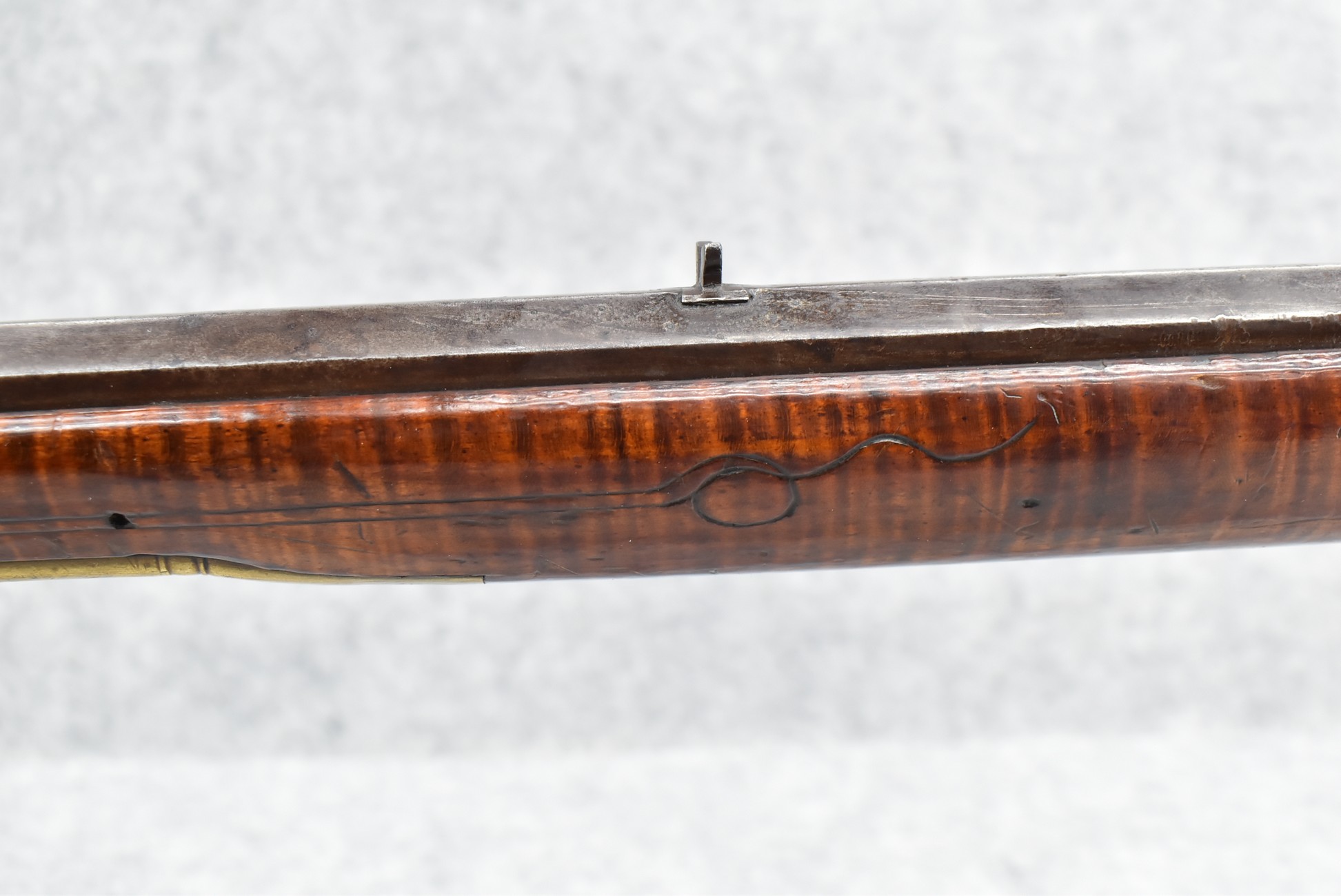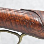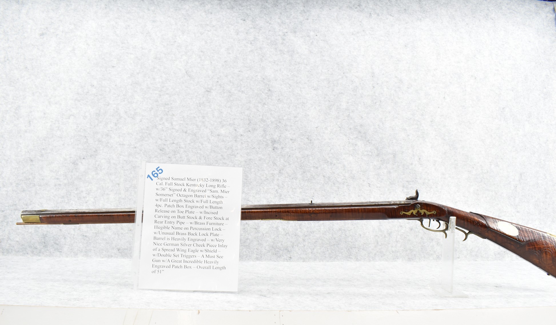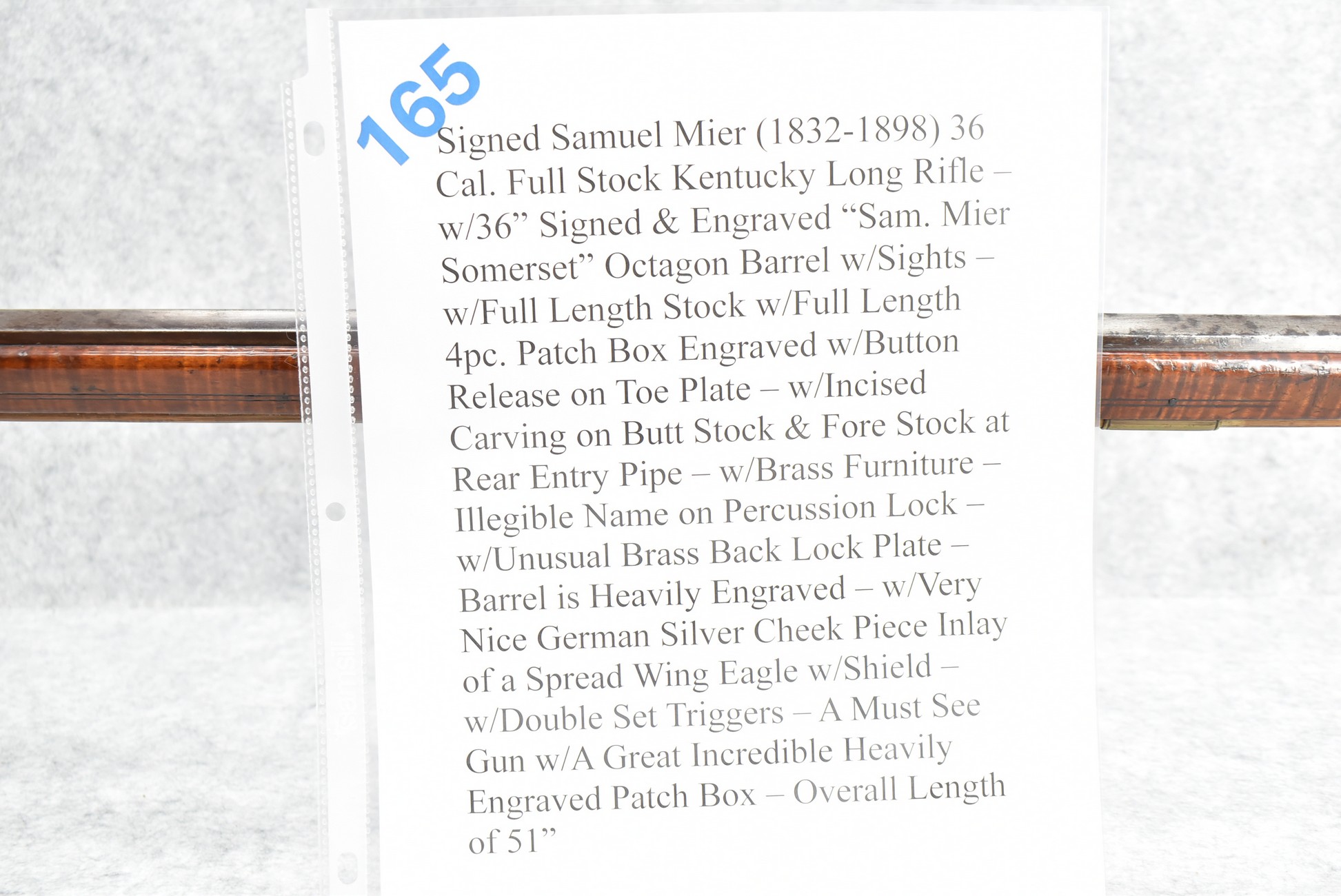 165. Signed Samuel Mier (1832-1898) 36 Cal. Full Stock Kentucky Long Rifle – w/36” Signed & Engraved “Sam. Mier Somerset” Octagon Barrel w/Sights – w/Full Length Stock w/Full Length 4pc. Patch Box Engraved w/Button Release on Toe Plate – w/Incised Carving on Butt Stock & Fore Stock at Rear Entry Pipe – w/Brass Furniture – Illegible Name on Percussion Lock – w/Unusual Brass Back Lock Plate – Barrel is Heavily Engraved – w/Very Nice German Silver Cheek Piece Inlay of a Spread Wing Eagle w/Shield – w/Double Set Triggers – A Must See Gun w/A Great Incredible Heavily Engraved Patch Box – Overall Length of 51”