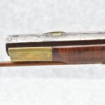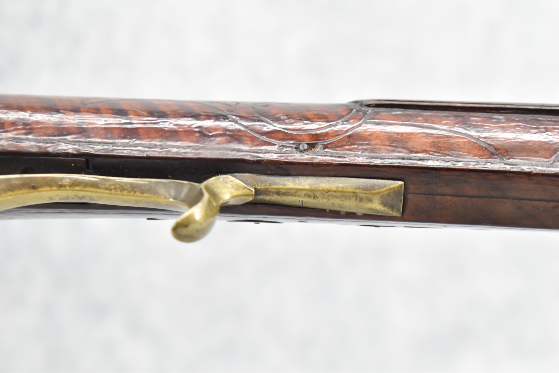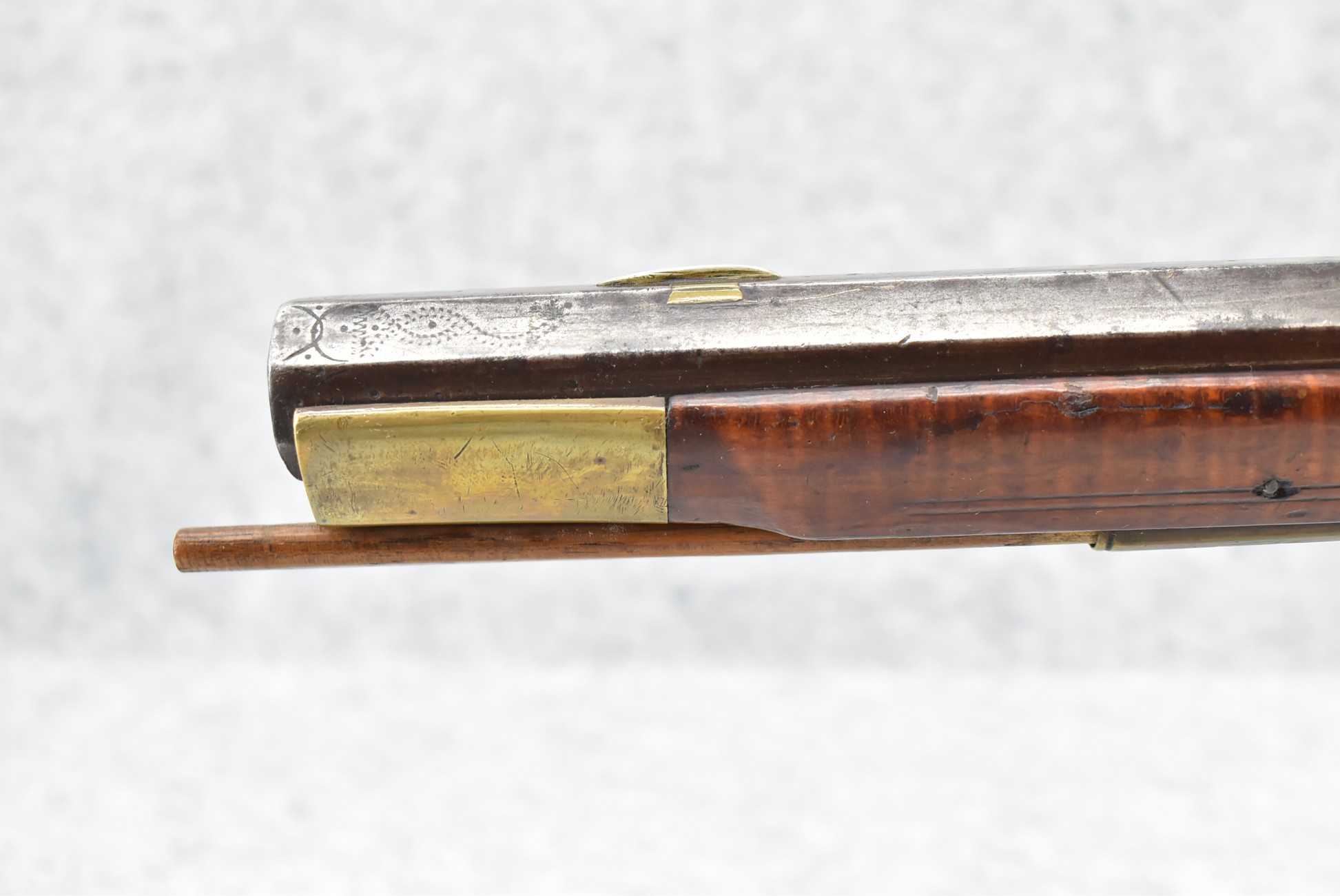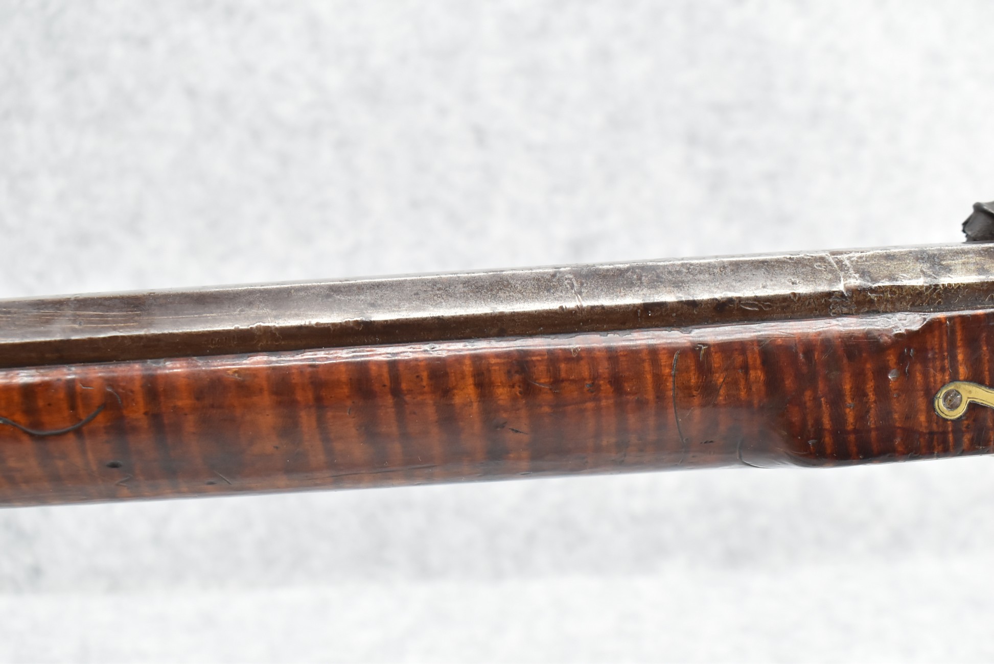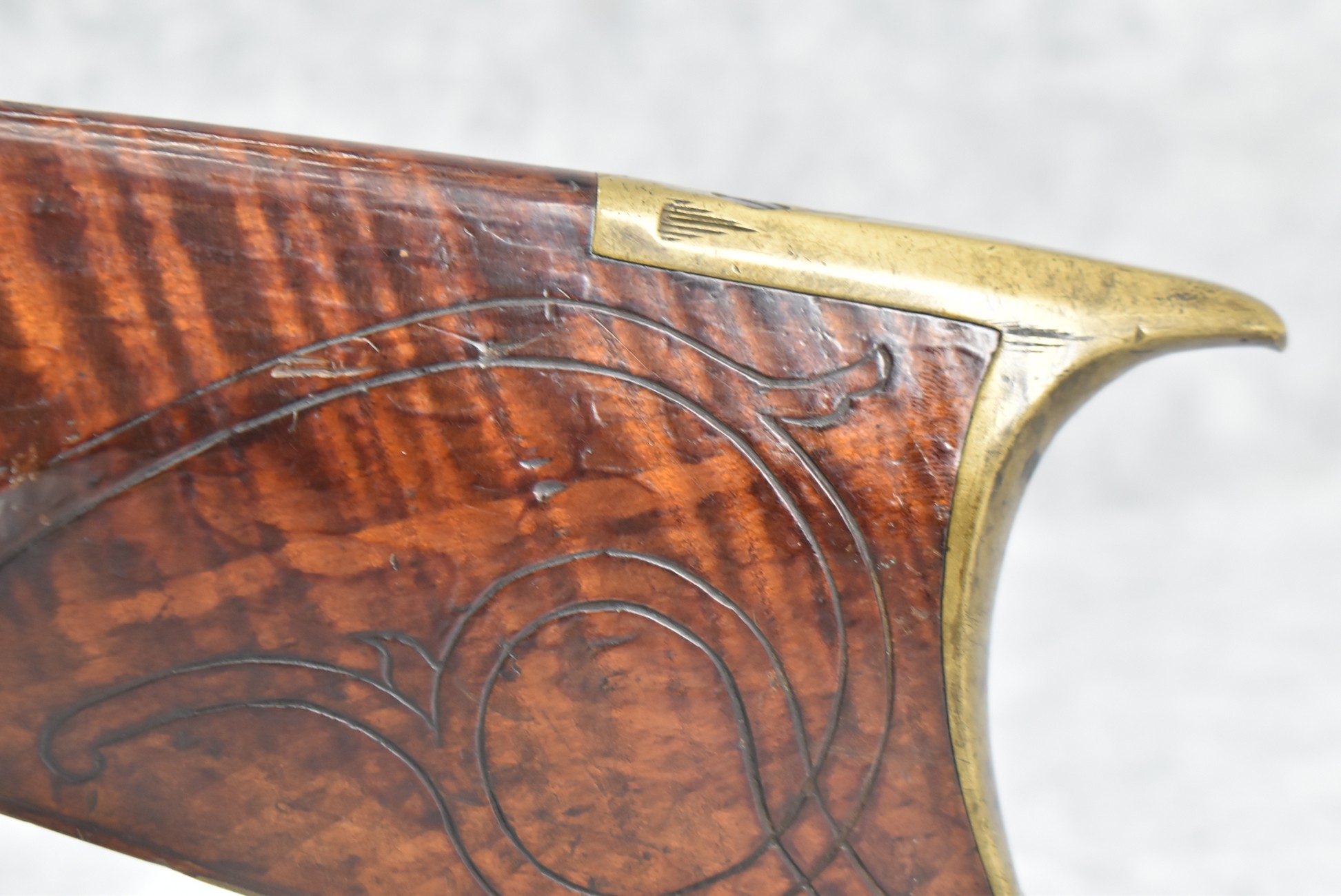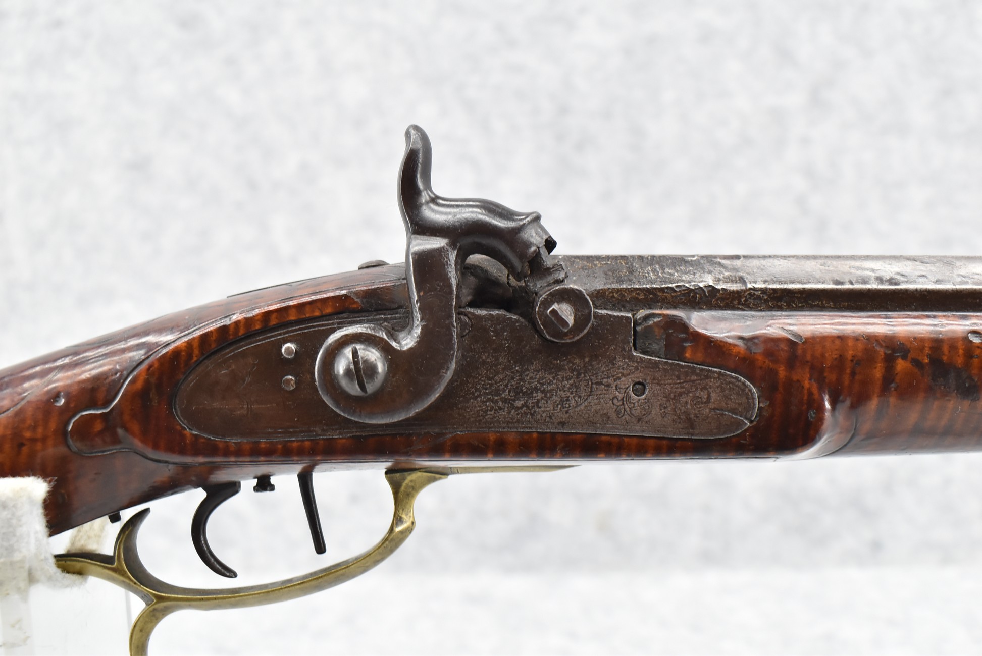 165. Signed Samuel Mier (1832-1898) 36 Cal. Full Stock Kentucky Long Rifle – w/36” Signed & Engraved “Sam. Mier Somerset” Octagon Barrel w/Sights – w/Full Length Stock w/Full Length 4pc. Patch Box Engraved w/Button Release on Toe Plate – w/Incised Carving on Butt Stock & Fore Stock at Rear Entry Pipe – w/Brass Furniture – Illegible Name on Percussion Lock – w/Unusual Brass Back Lock Plate – Barrel is Heavily Engraved – w/Very Nice German Silver Cheek Piece Inlay of a Spread Wing Eagle w/Shield – w/Double Set Triggers – A Must See Gun w/A Great Incredible Heavily Engraved Patch Box – Overall Length of 51”