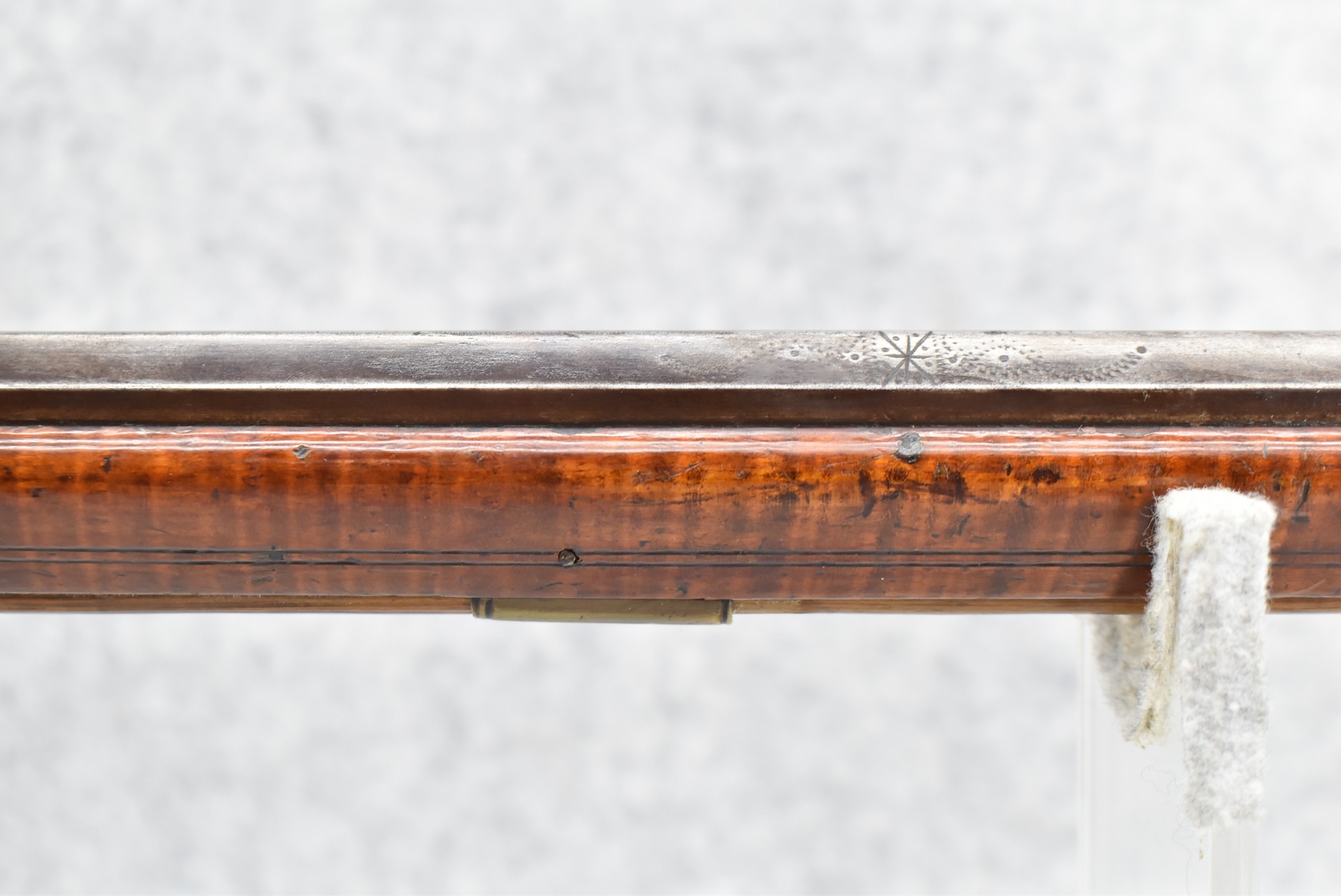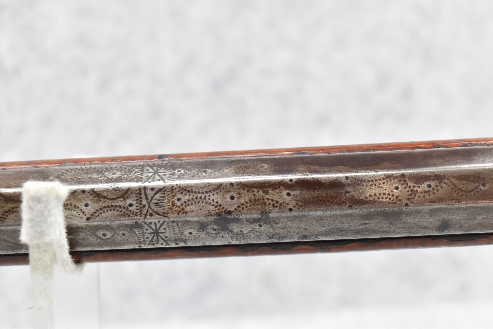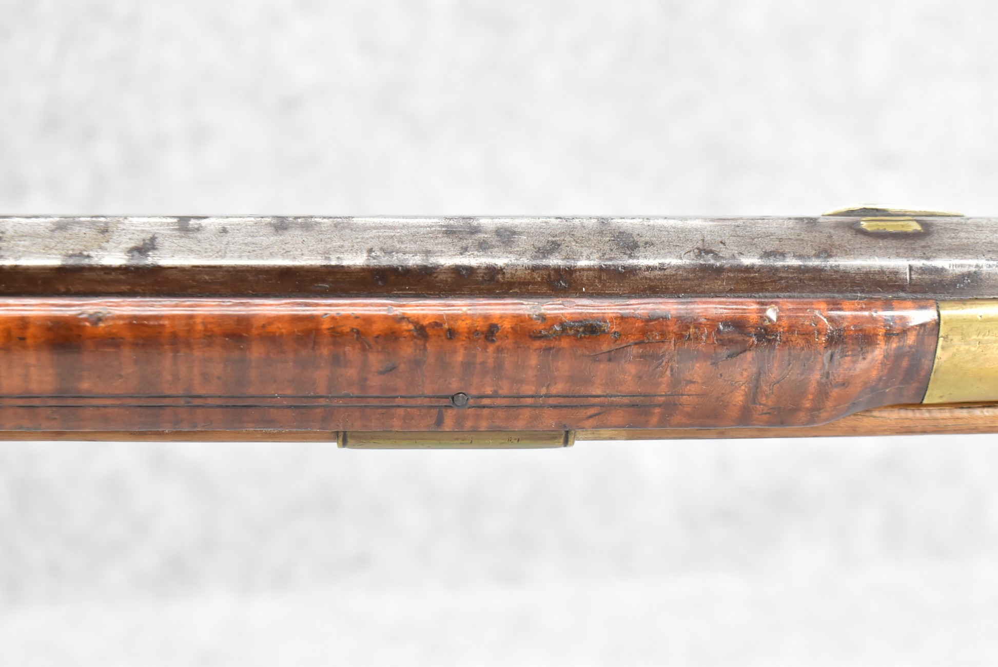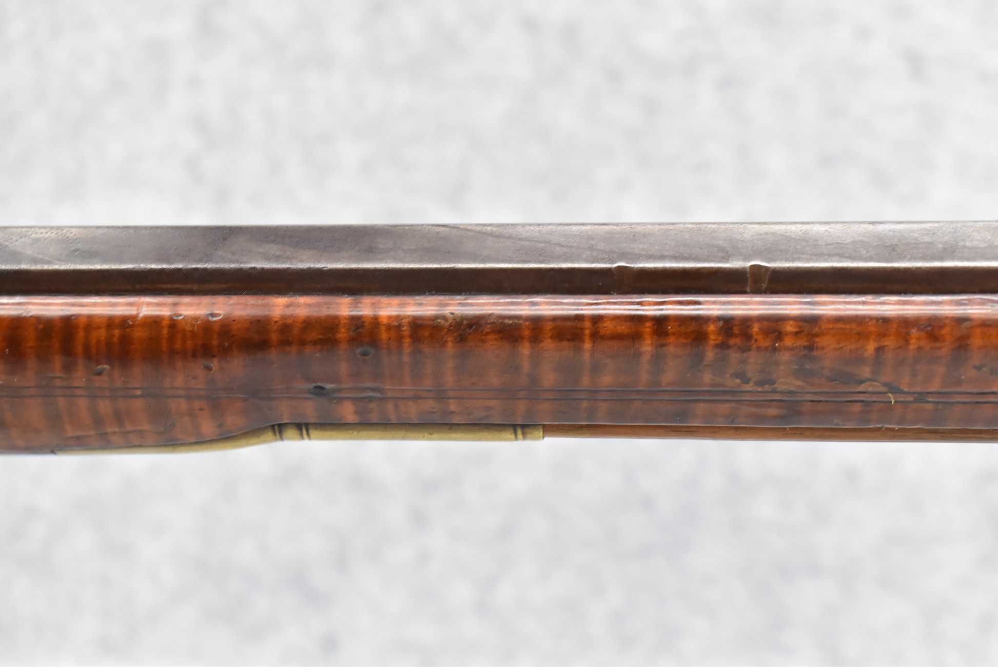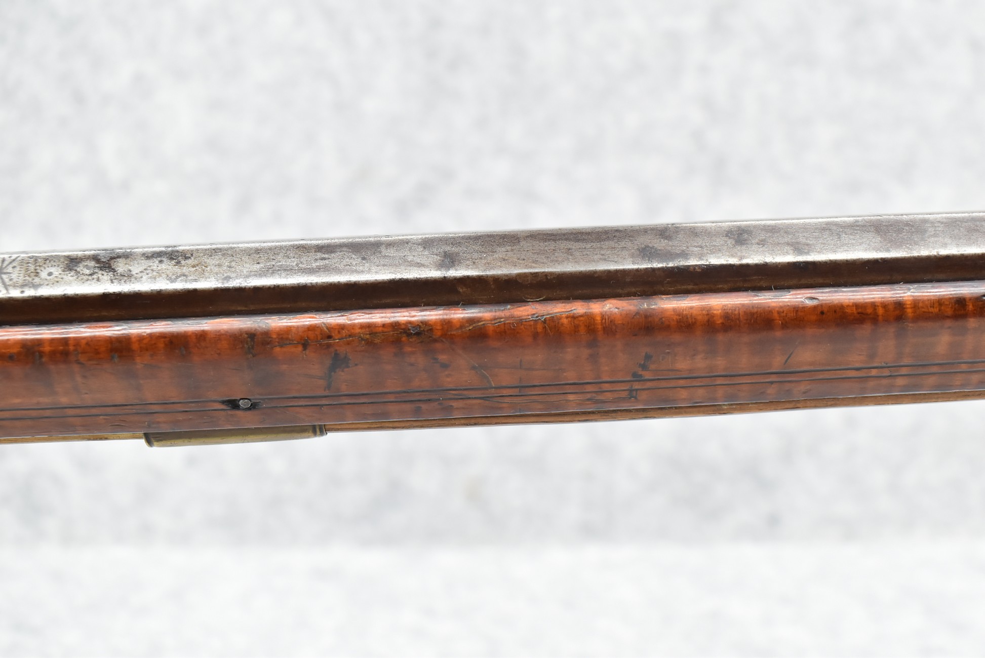 165. Signed Samuel Mier (1832-1898) 36 Cal. Full Stock Kentucky Long Rifle – w/36” Signed & Engraved “Sam. Mier Somerset” Octagon Barrel w/Sights – w/Full Length Stock w/Full Length 4pc. Patch Box Engraved w/Button Release on Toe Plate – w/Incised Carving on Butt Stock & Fore Stock at Rear Entry Pipe – w/Brass Furniture – Illegible Name on Percussion Lock – w/Unusual Brass Back Lock Plate – Barrel is Heavily Engraved – w/Very Nice German Silver Cheek Piece Inlay of a Spread Wing Eagle w/Shield – w/Double Set Triggers – A Must See Gun w/A Great Incredible Heavily Engraved Patch Box – Overall Length of 51”