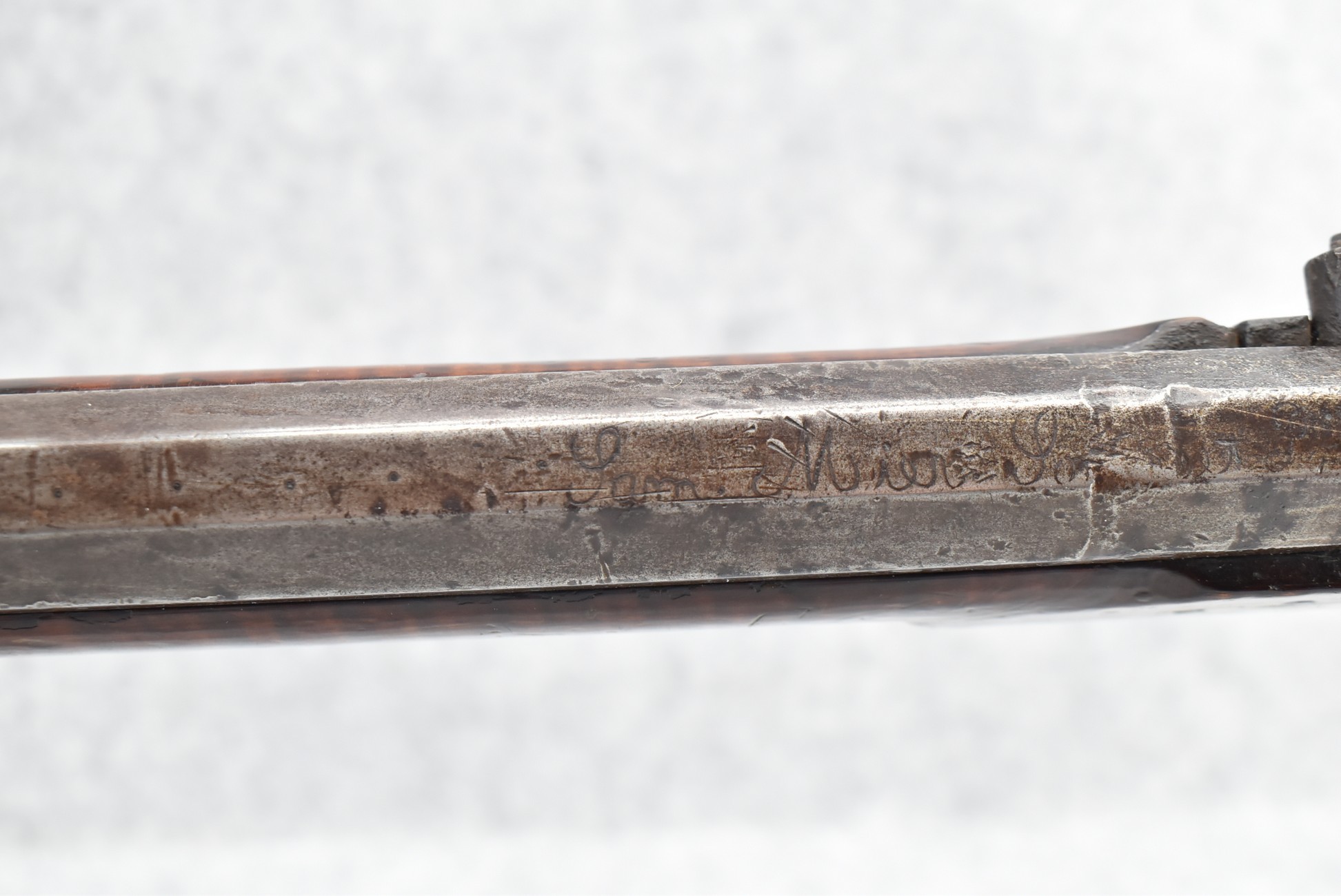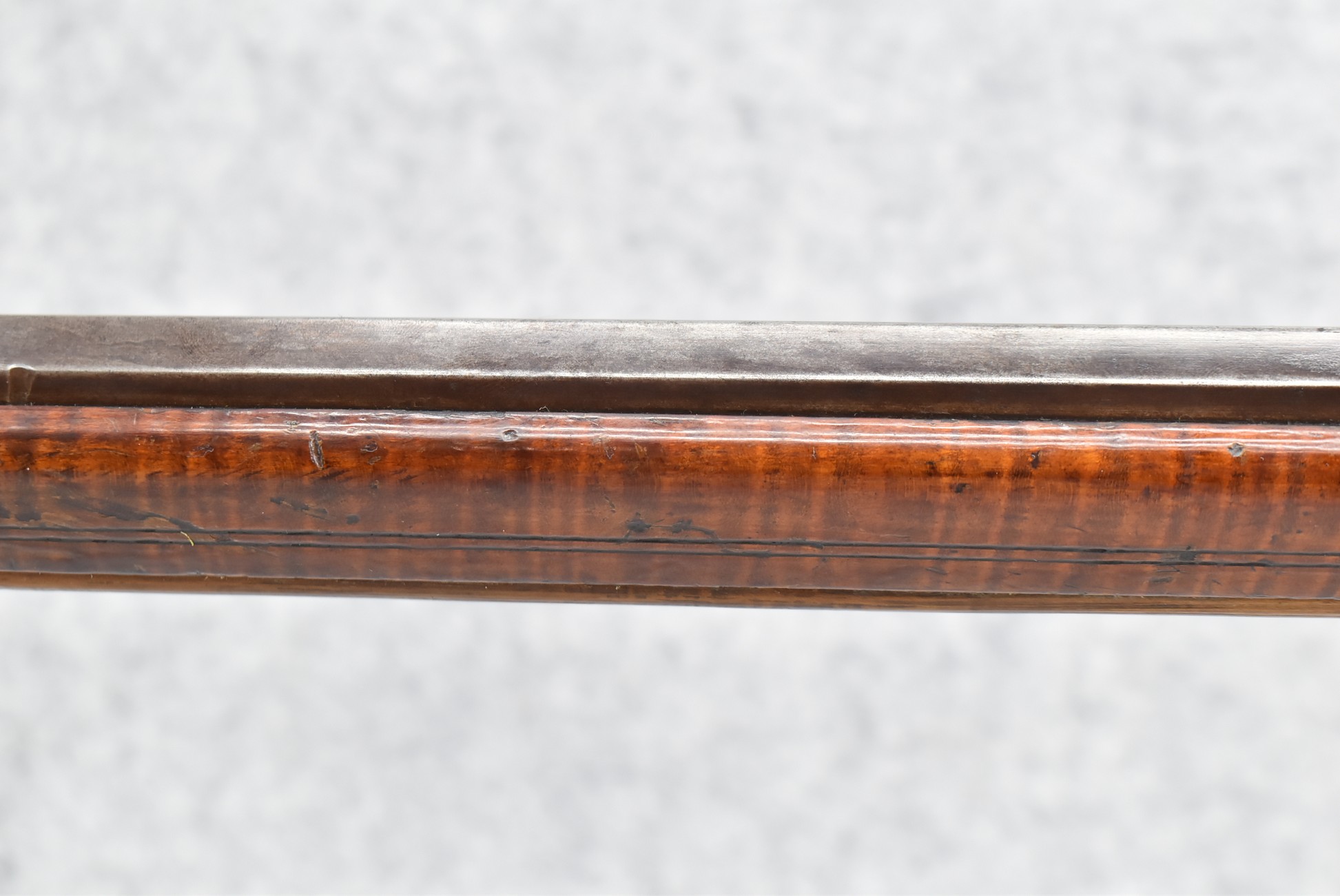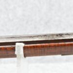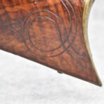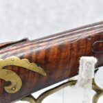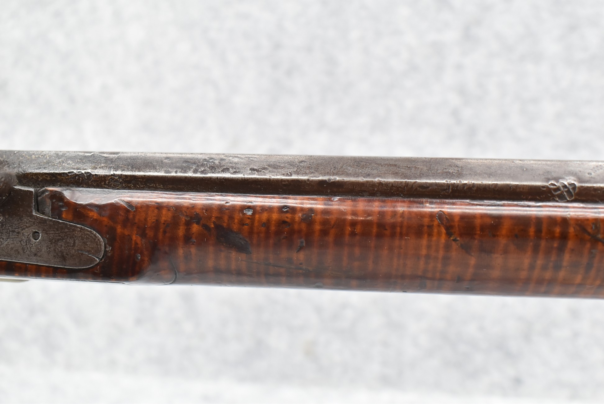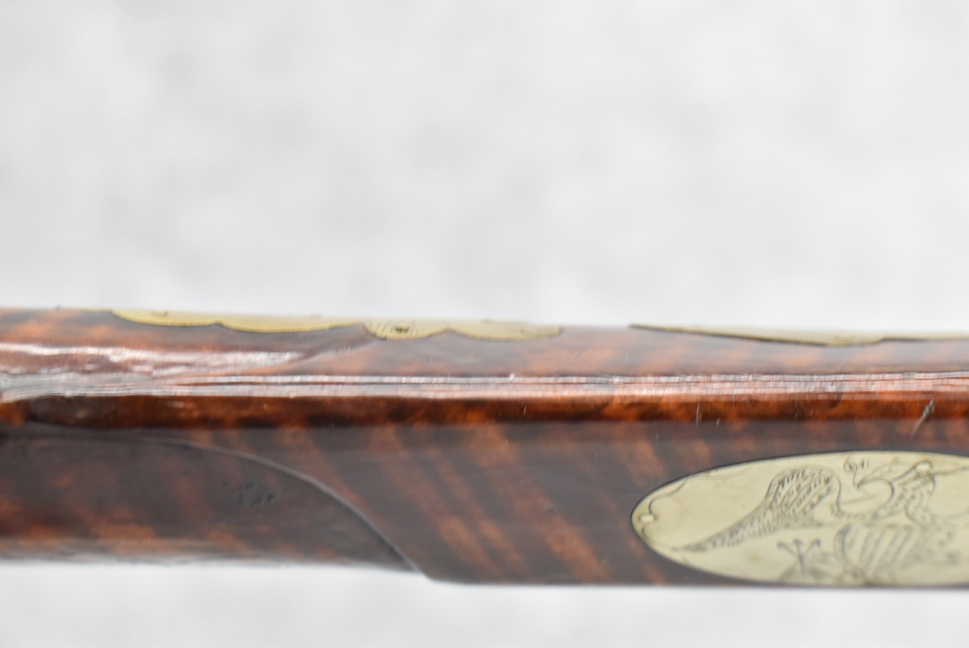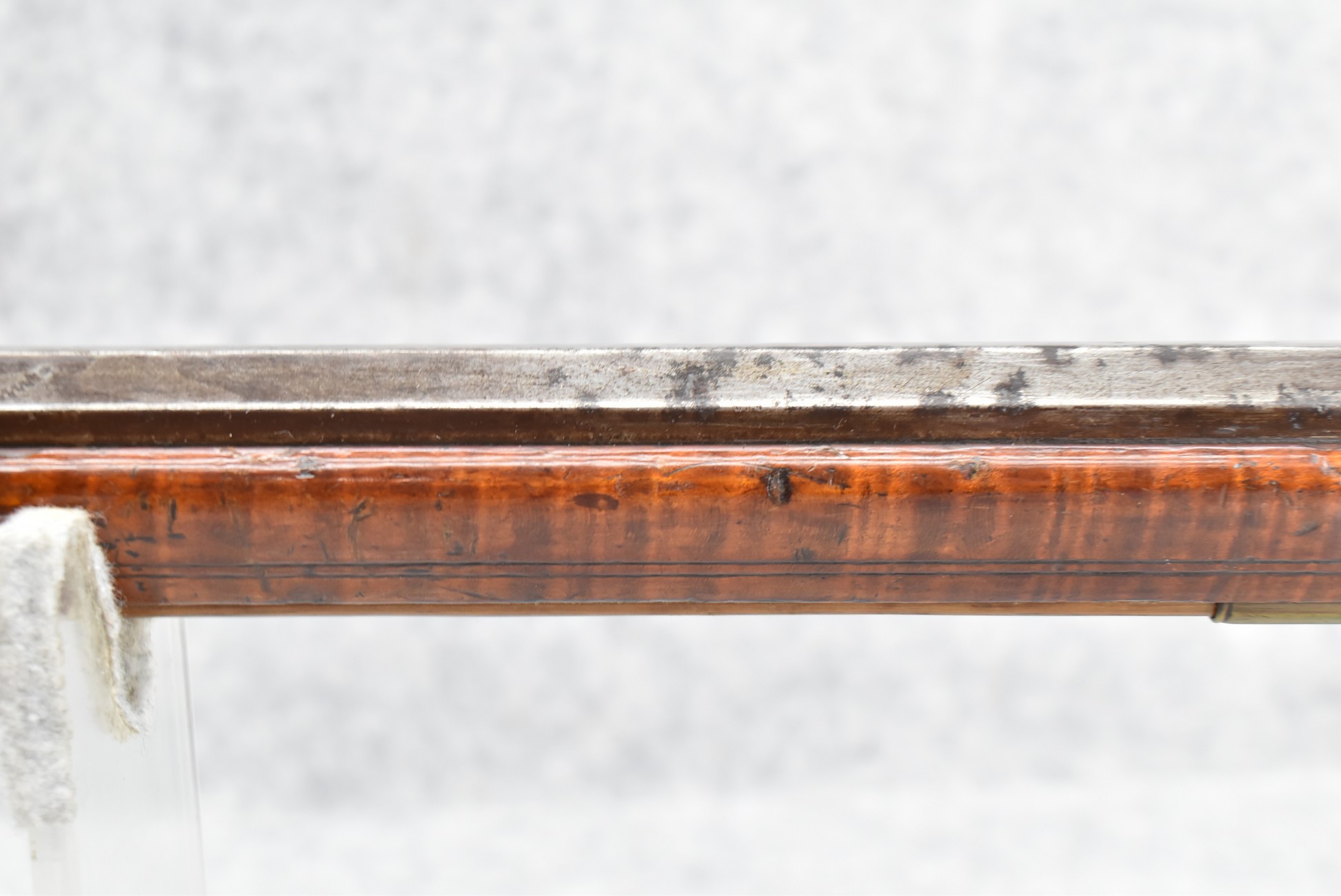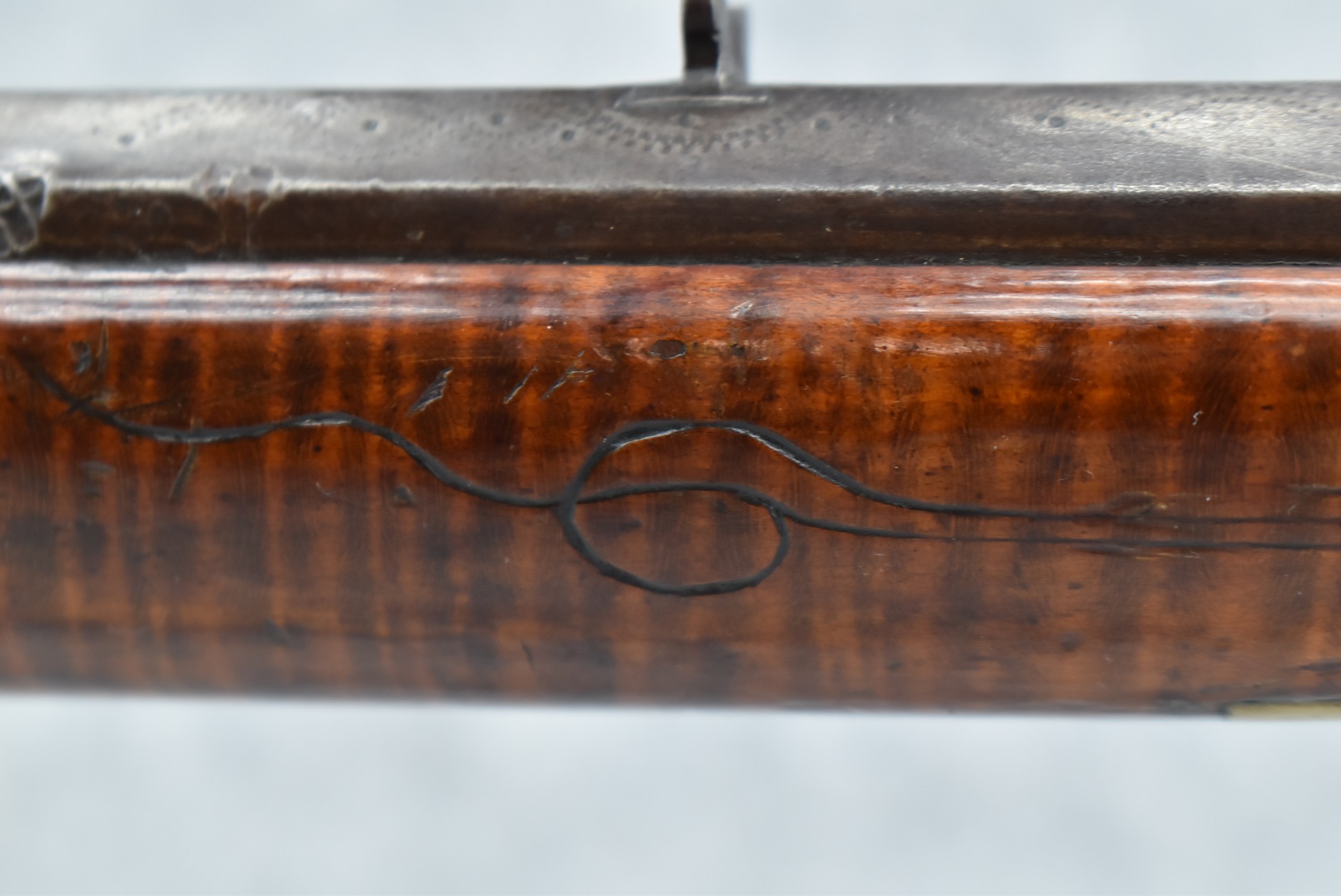 165. Signed Samuel Mier (1832-1898) 36 Cal. Full Stock Kentucky Long Rifle – w/36” Signed & Engraved “Sam. Mier Somerset” Octagon Barrel w/Sights – w/Full Length Stock w/Full Length 4pc. Patch Box Engraved w/Button Release on Toe Plate – w/Incised Carving on Butt Stock & Fore Stock at Rear Entry Pipe – w/Brass Furniture – Illegible Name on Percussion Lock – w/Unusual Brass Back Lock Plate – Barrel is Heavily Engraved – w/Very Nice German Silver Cheek Piece Inlay of a Spread Wing Eagle w/Shield – w/Double Set Triggers – A Must See Gun w/A Great Incredible Heavily Engraved Patch Box – Overall Length of 51”