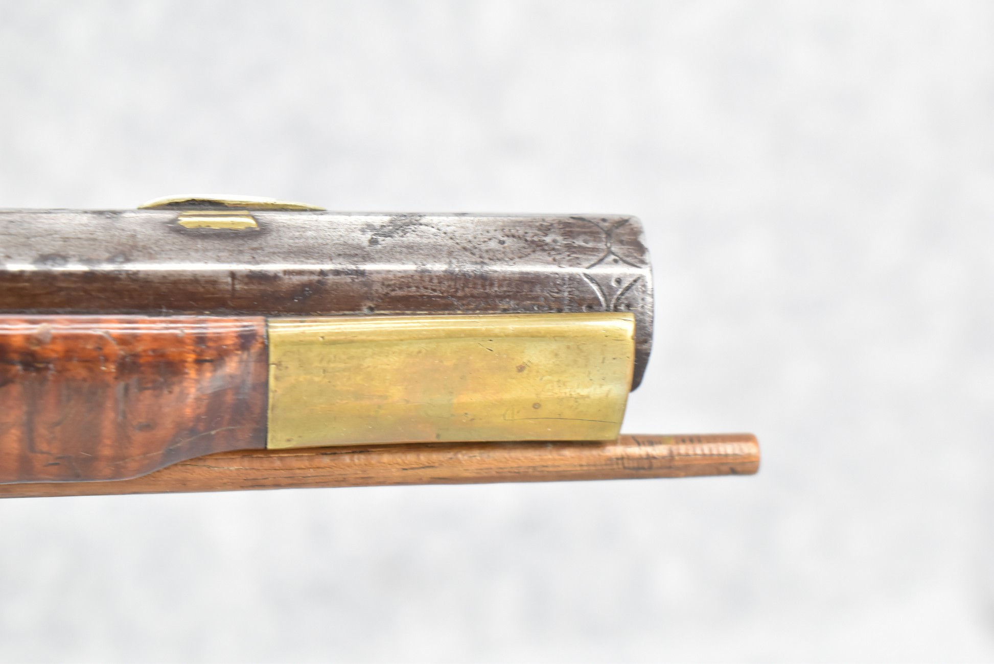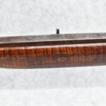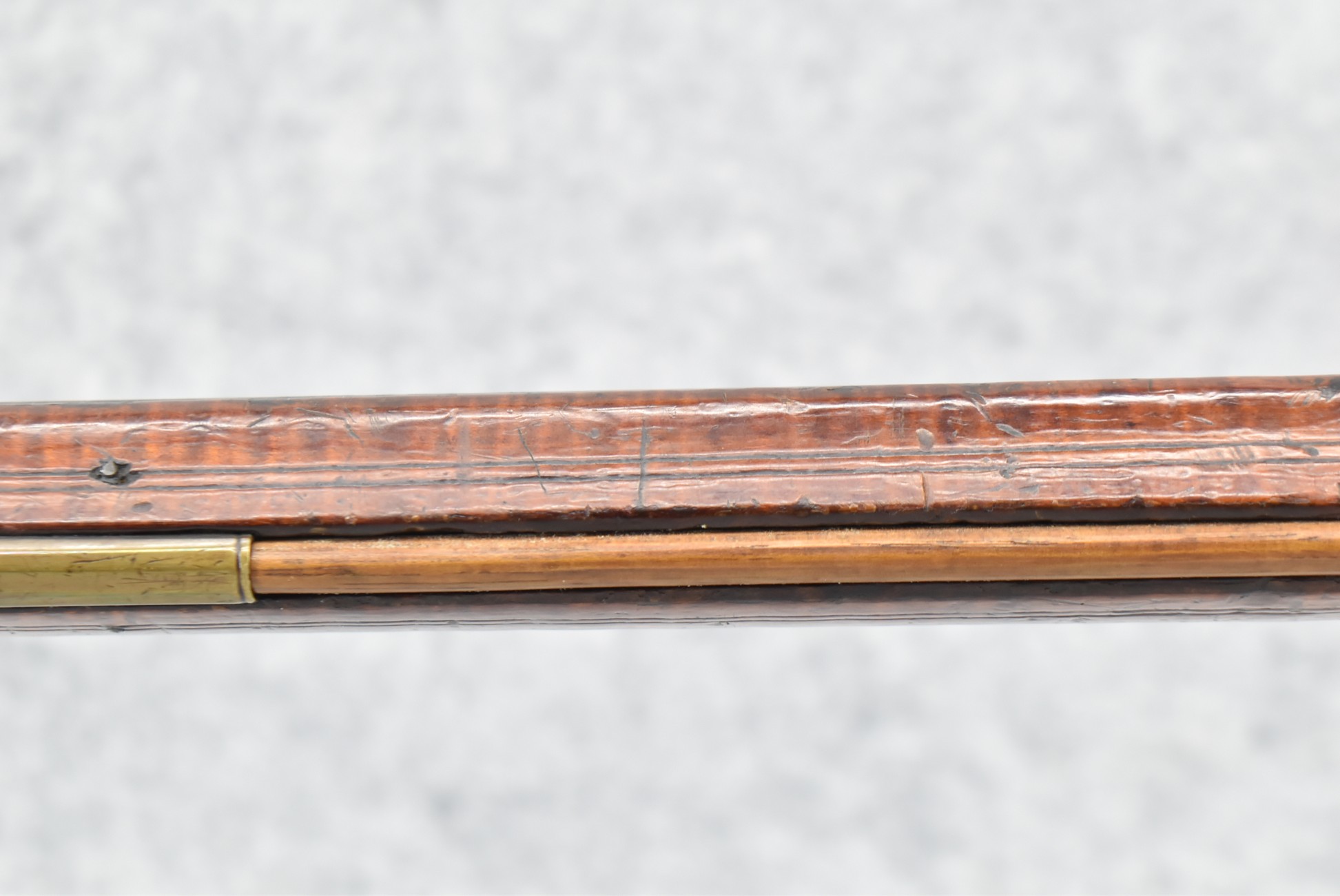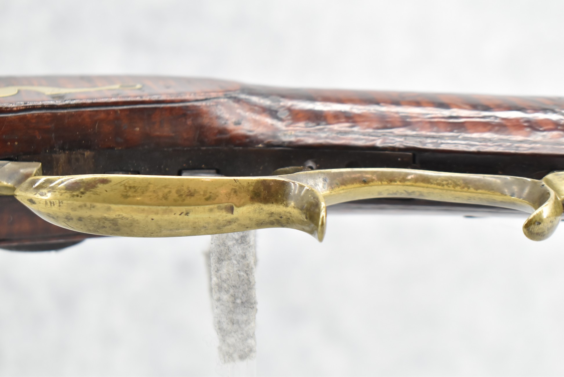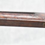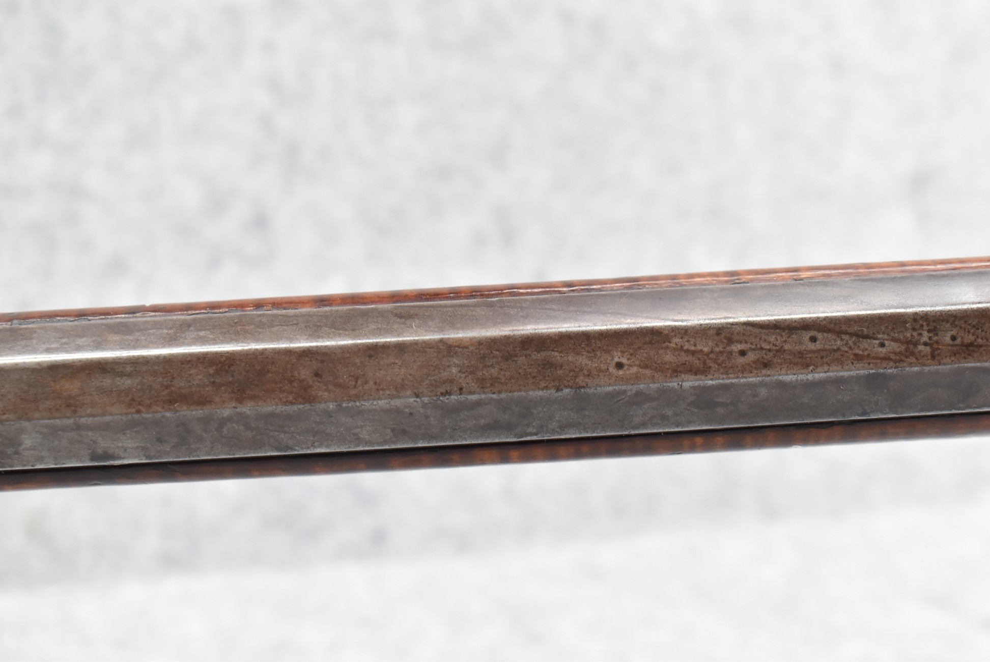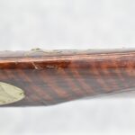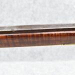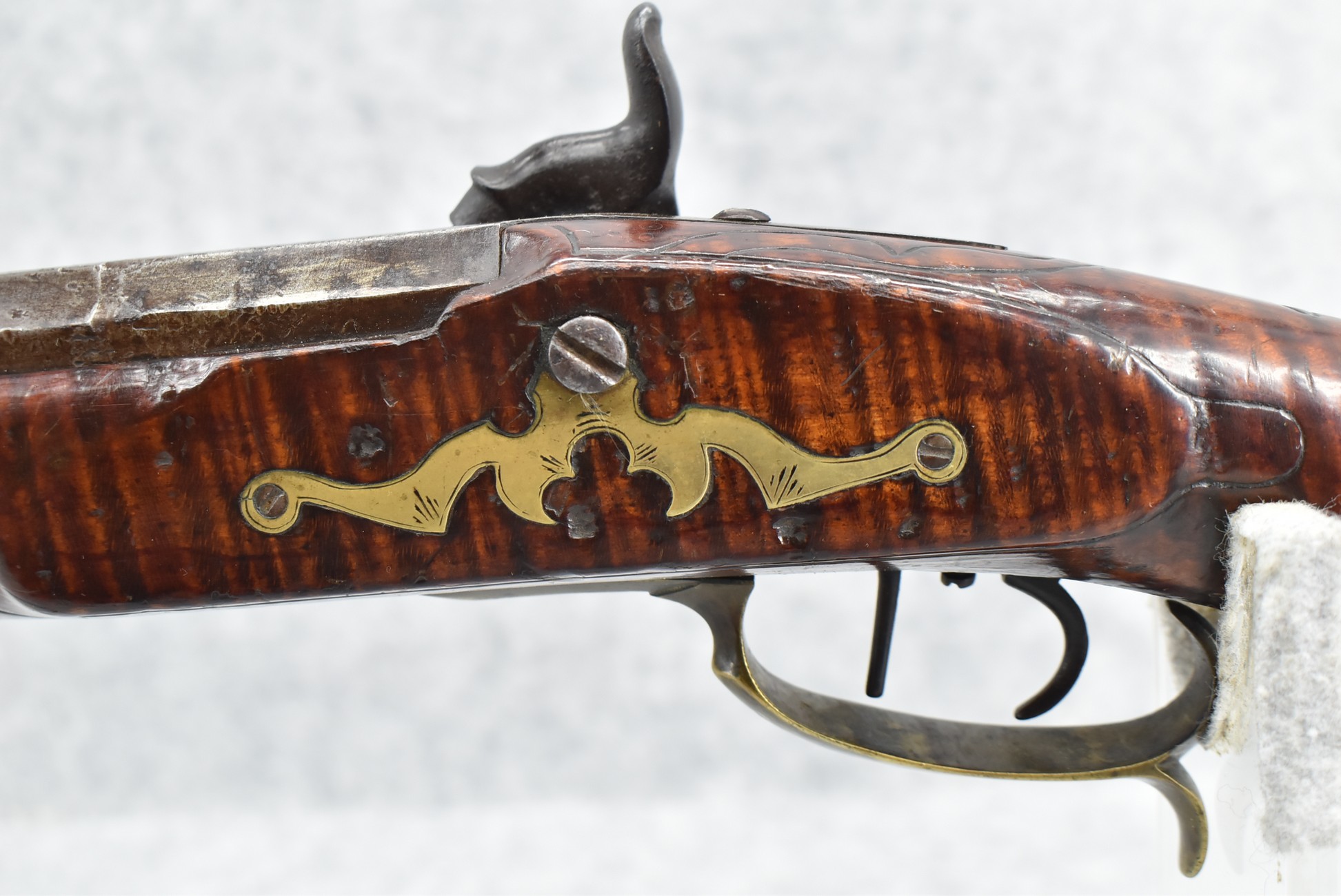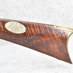165. Signed Samuel Mier (1832-1898) 36 Cal. Full Stock Kentucky Long Rifle – w/36” Signed & Engraved “Sam. Mier Somerset” Octagon Barrel w/Sights – w/Full Length Stock w/Full Length 4pc. Patch Box Engraved w/Button Release on Toe Plate – w/Incised Carving on Butt Stock & Fore Stock at Rear Entry Pipe – w/Brass Furniture – Illegible Name on Percussion Lock – w/Unusual Brass Back Lock Plate – Barrel is Heavily Engraved – w/Very Nice German Silver Cheek Piece Inlay of a Spread Wing Eagle w/Shield – w/Double Set Triggers – A Must See Gun w/A Great Incredible Heavily Engraved Patch Box – Overall Length of 51”