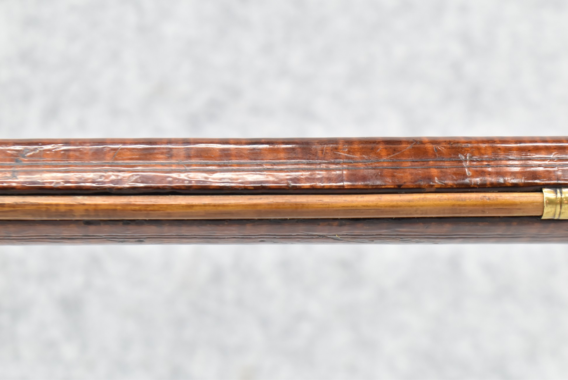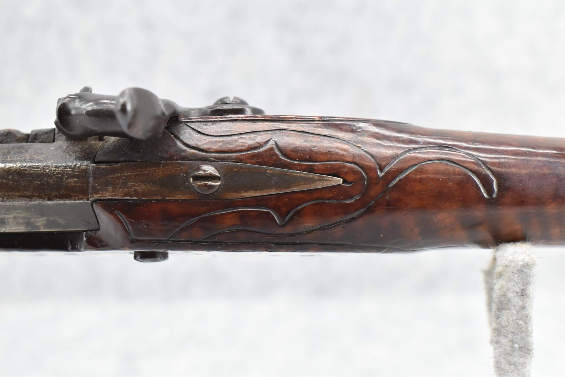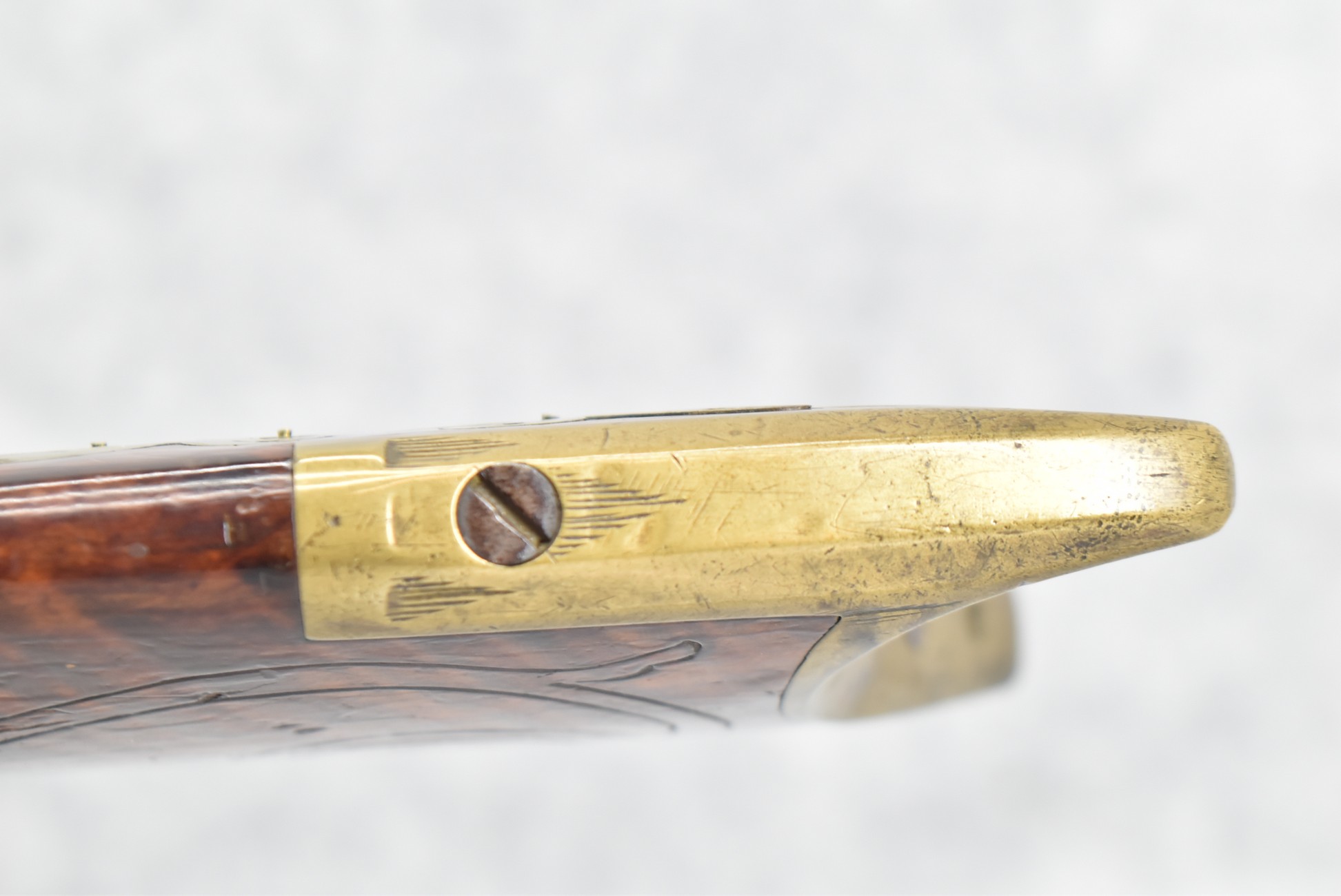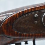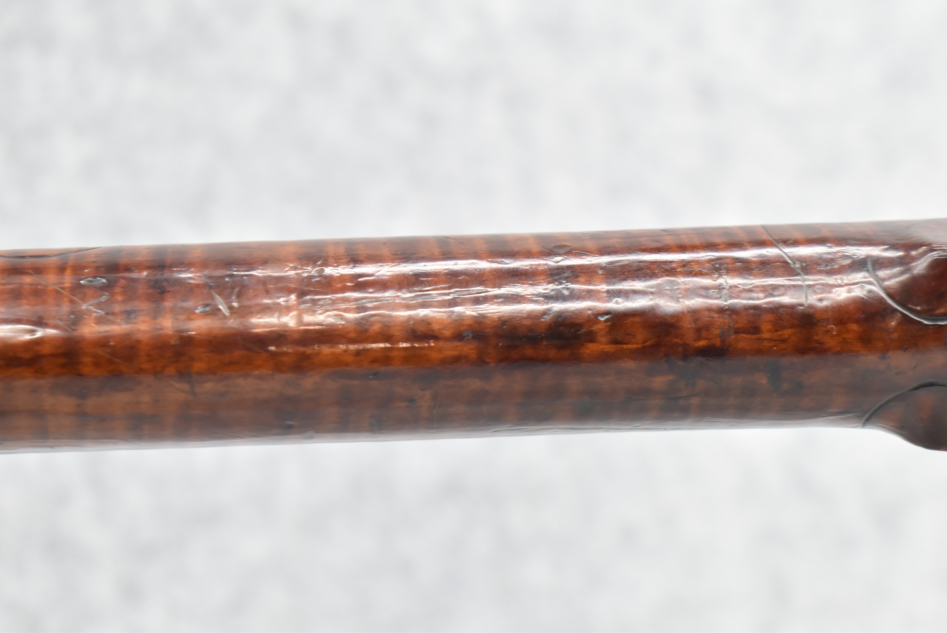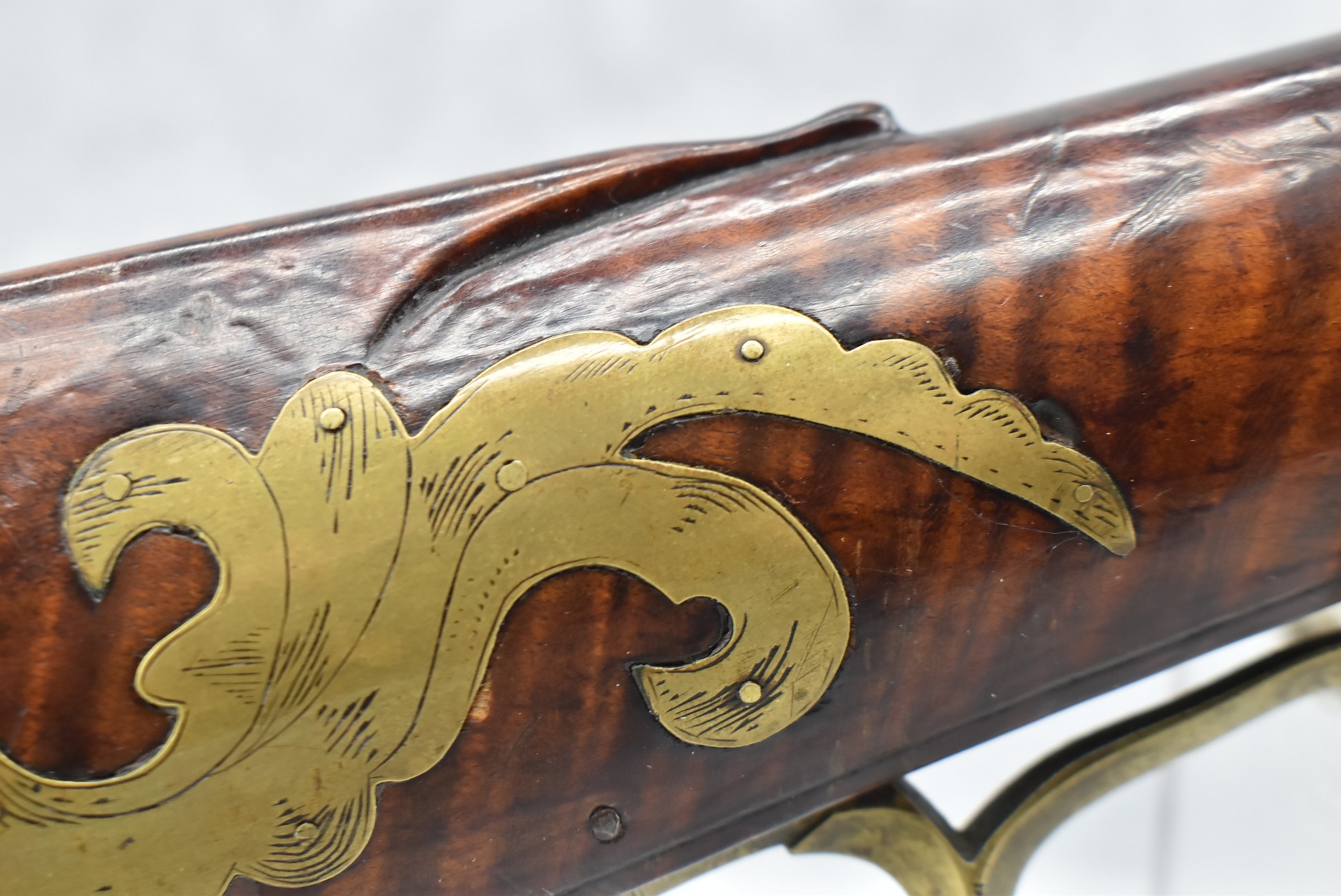 165. Signed Samuel Mier (1832-1898) 36 Cal. Full Stock Kentucky Long Rifle – w/36” Signed & Engraved “Sam. Mier Somerset” Octagon Barrel w/Sights – w/Full Length Stock w/Full Length 4pc. Patch Box Engraved w/Button Release on Toe Plate – w/Incised Carving on Butt Stock & Fore Stock at Rear Entry Pipe – w/Brass Furniture – Illegible Name on Percussion Lock – w/Unusual Brass Back Lock Plate – Barrel is Heavily Engraved – w/Very Nice German Silver Cheek Piece Inlay of a Spread Wing Eagle w/Shield – w/Double Set Triggers – A Must See Gun w/A Great Incredible Heavily Engraved Patch Box – Overall Length of 51”