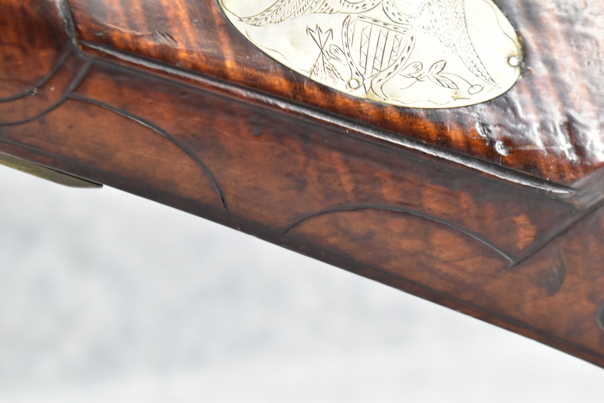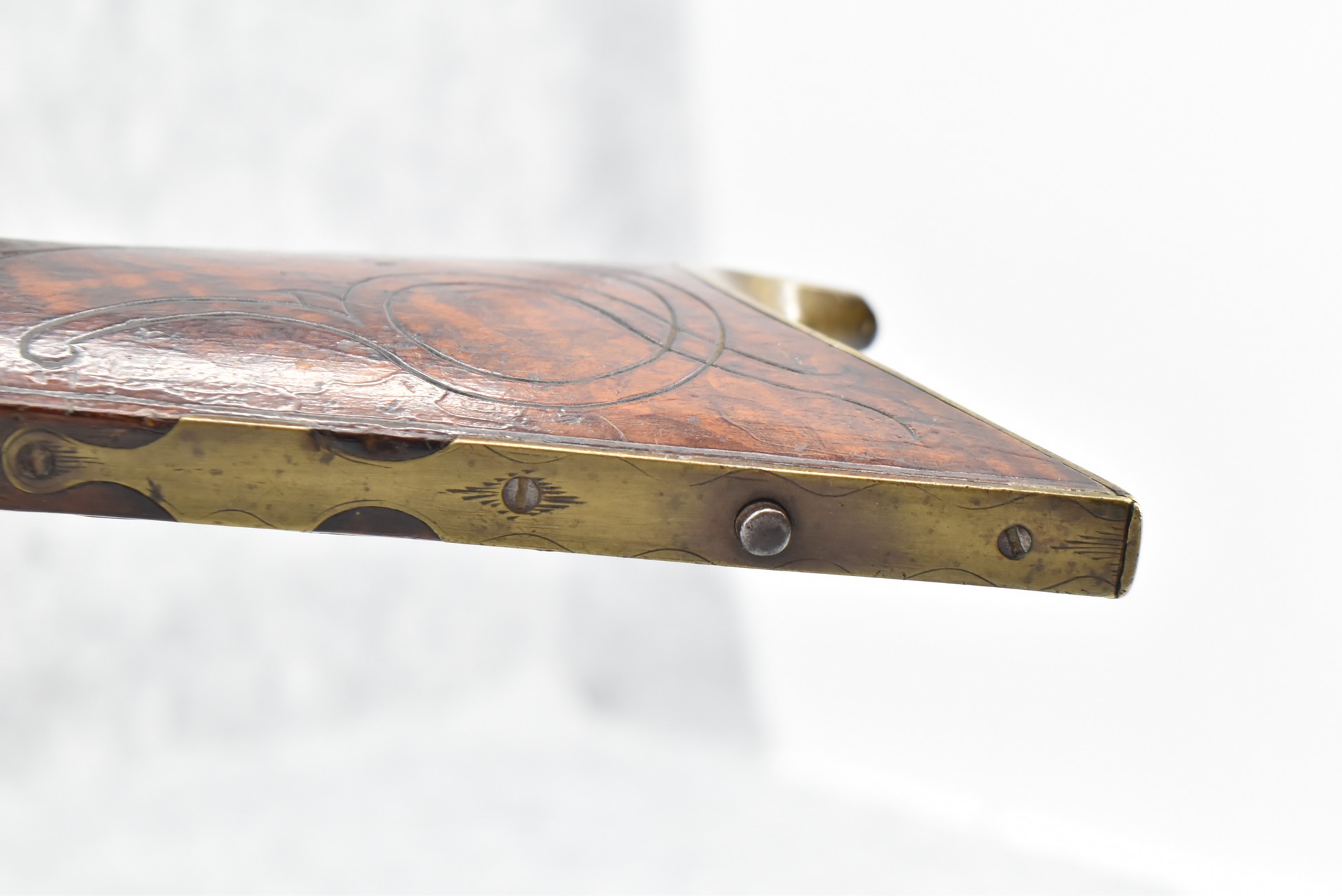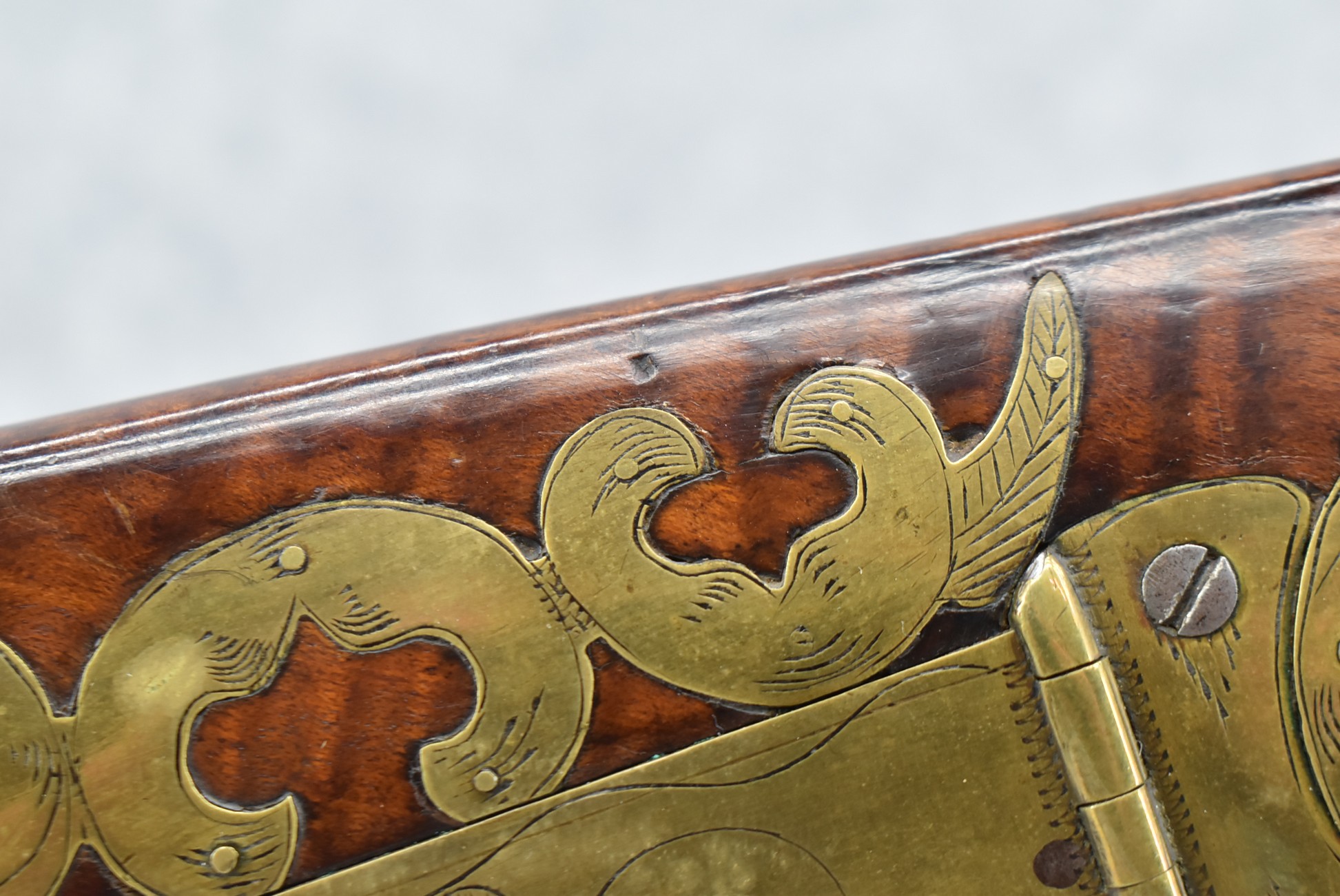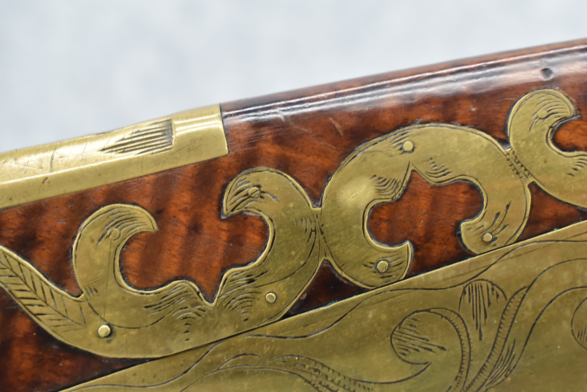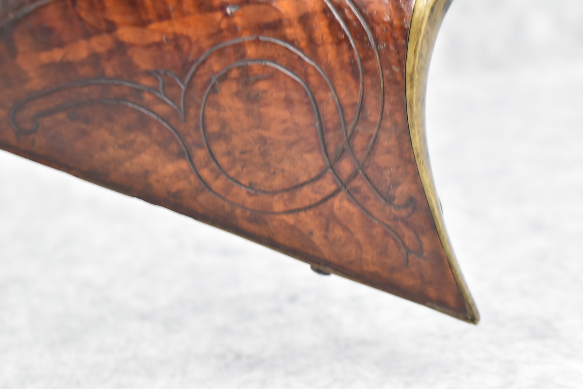 165. Signed Samuel Mier (1832-1898) 36 Cal. Full Stock Kentucky Long Rifle – w/36” Signed & Engraved “Sam. Mier Somerset” Octagon Barrel w/Sights – w/Full Length Stock w/Full Length 4pc. Patch Box Engraved w/Button Release on Toe Plate – w/Incised Carving on Butt Stock & Fore Stock at Rear Entry Pipe – w/Brass Furniture – Illegible Name on Percussion Lock – w/Unusual Brass Back Lock Plate – Barrel is Heavily Engraved – w/Very Nice German Silver Cheek Piece Inlay of a Spread Wing Eagle w/Shield – w/Double Set Triggers – A Must See Gun w/A Great Incredible Heavily Engraved Patch Box – Overall Length of 51”