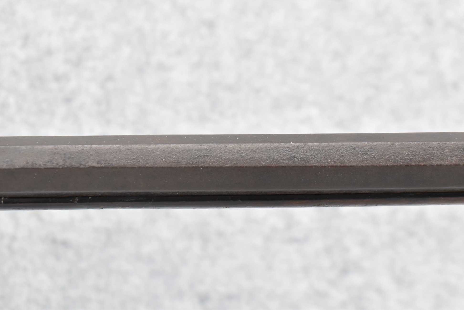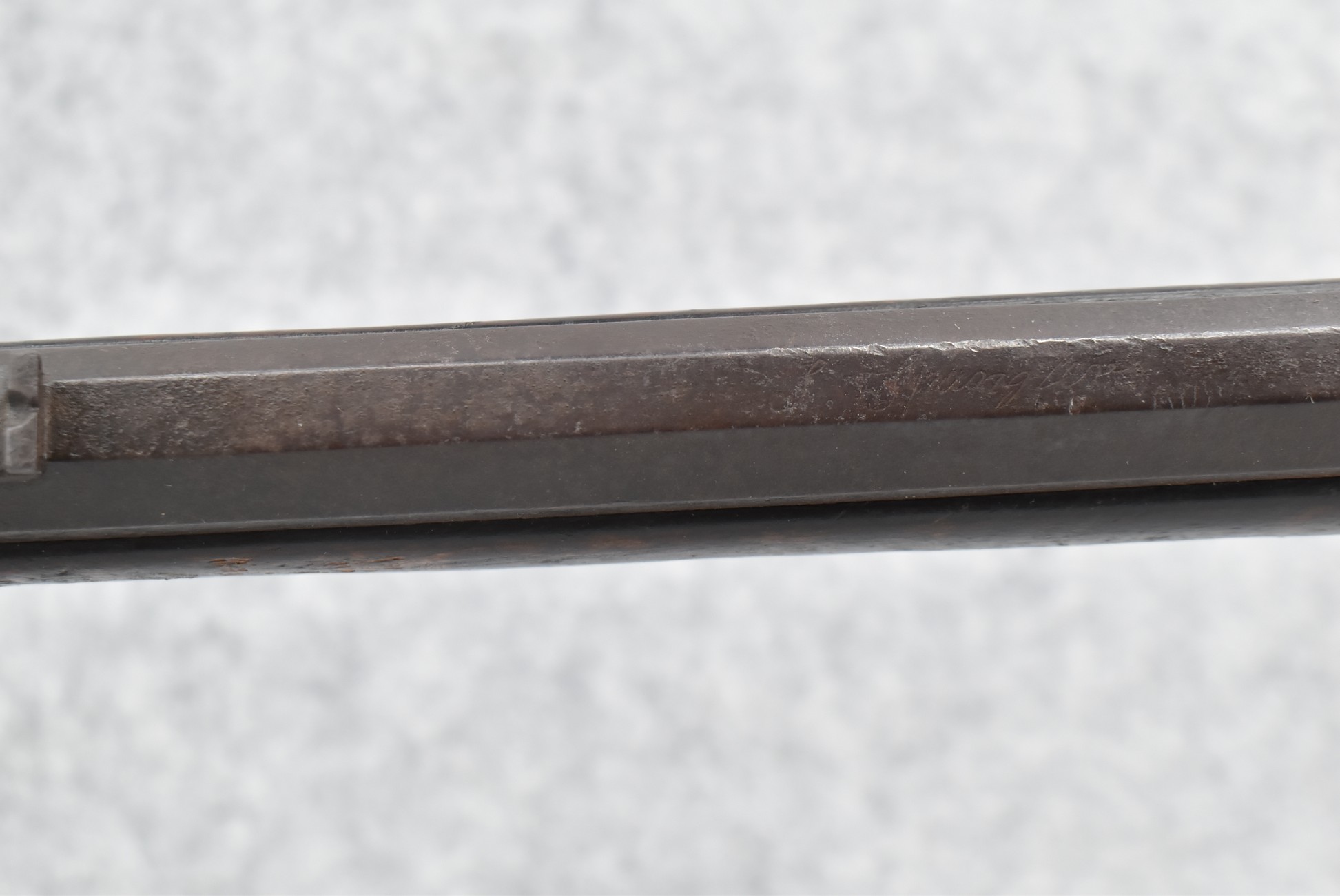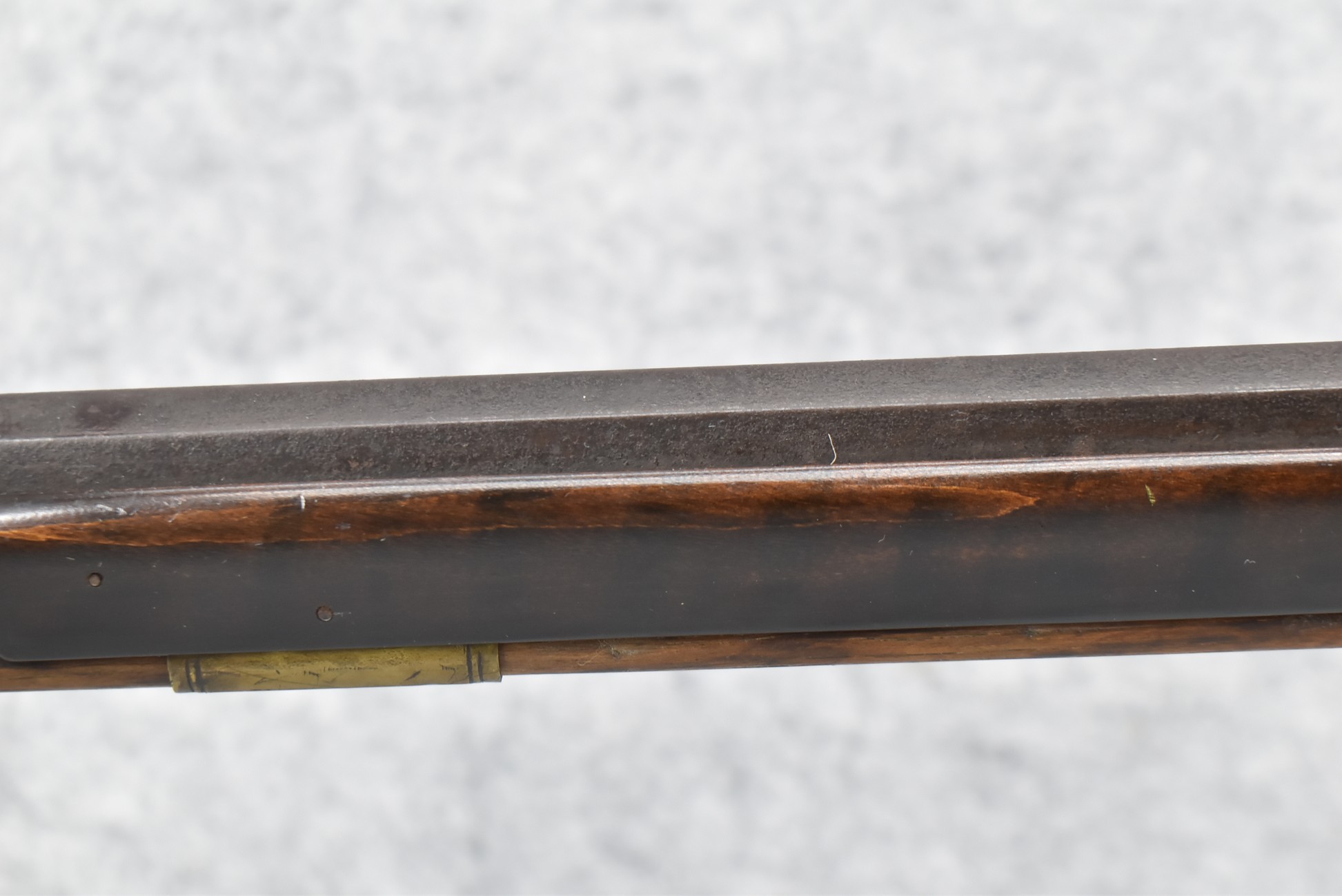 165. Signed Samuel Mier (1832-1898) 36 Cal. Full Stock Kentucky Long Rifle – w/36” Signed & Engraved “Sam. Mier Somerset” Octagon Barrel w/Sights – w/Full Length Stock w/Full Length 4pc. Patch Box Engraved w/Button Release on Toe Plate – w/Incised Carving on Butt Stock & Fore Stock at Rear Entry Pipe – w/Brass Furniture – Illegible Name on Percussion Lock – w/Unusual Brass Back Lock Plate – Barrel is Heavily Engraved – w/Very Nice German Silver Cheek Piece Inlay of a Spread Wing Eagle w/Shield – w/Double Set Triggers – A Must See Gun w/A Great Incredible Heavily Engraved Patch Box – Overall Length of 51”