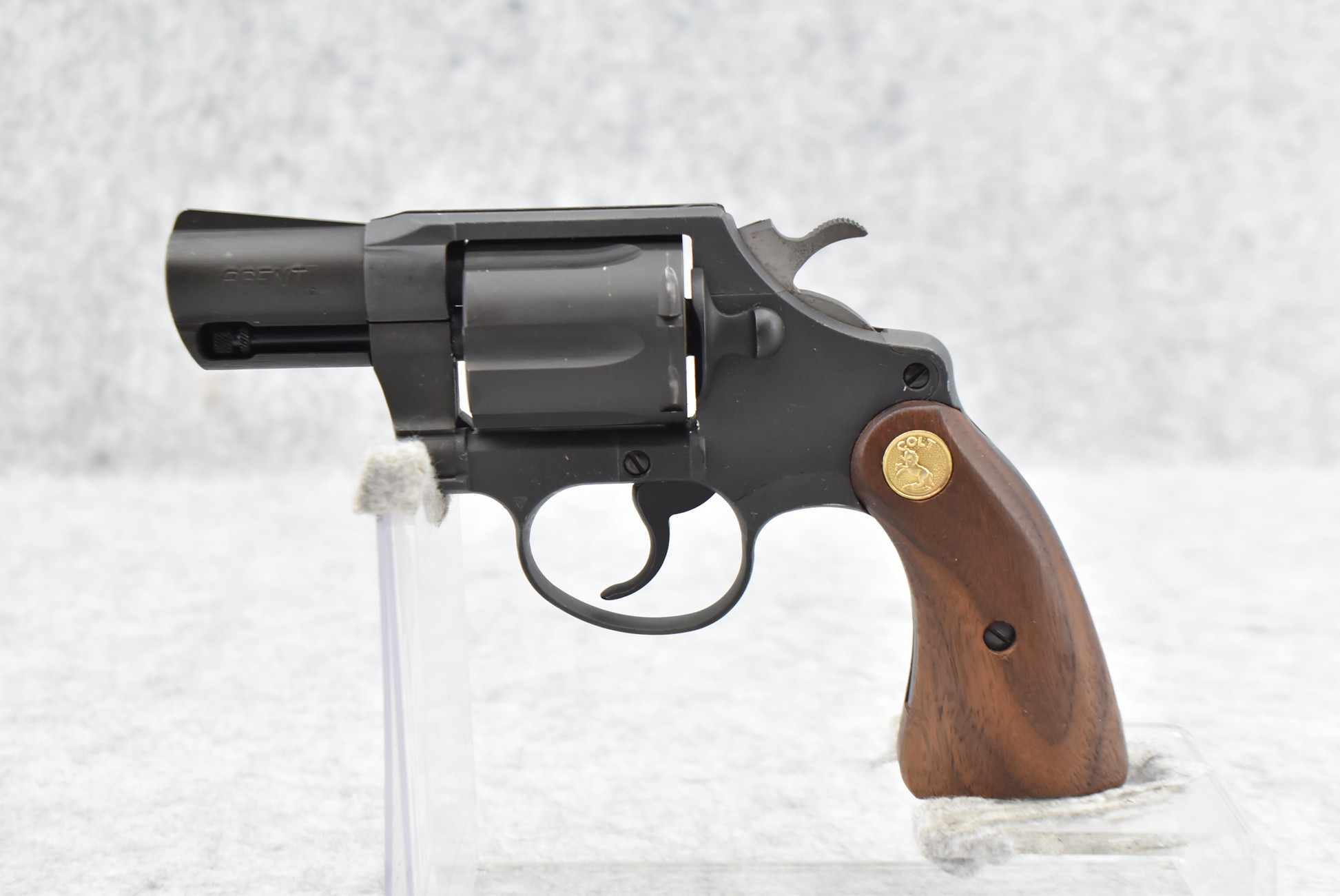 165R. Colt – Mod. Agent 2nd Issue – 38 Spl. Cal. Double Action Revolver – w/2” Barrel w/Blade Front and Rear Grooved Sights – Parkerized Finish – w/Factory Smooth Wood Grips w/Colt Medallion – w/Factory Wood Grain Foam Box and Sleeve w/Manual – Manufactured 1983
