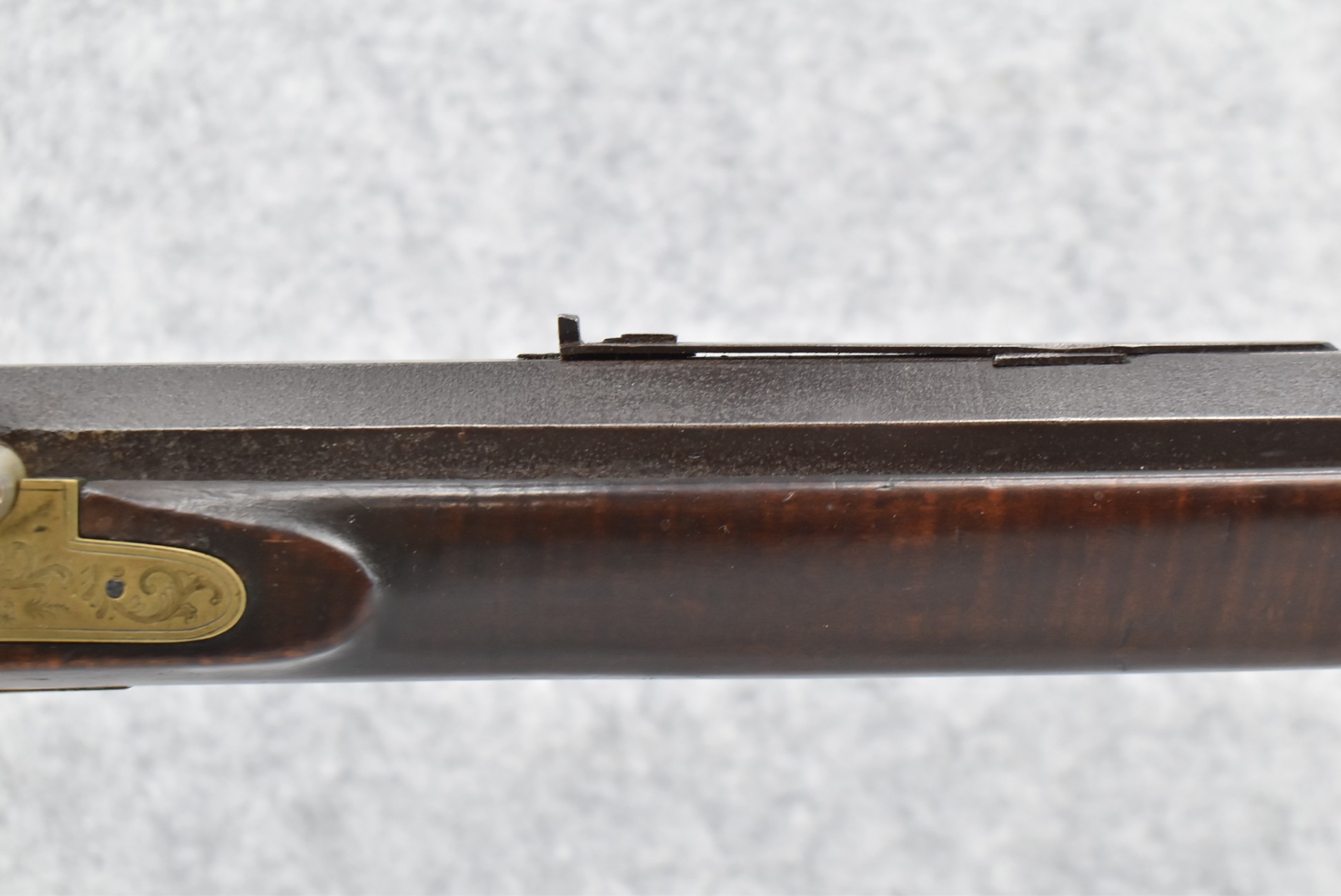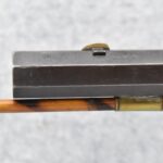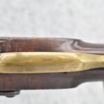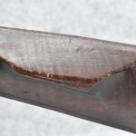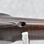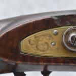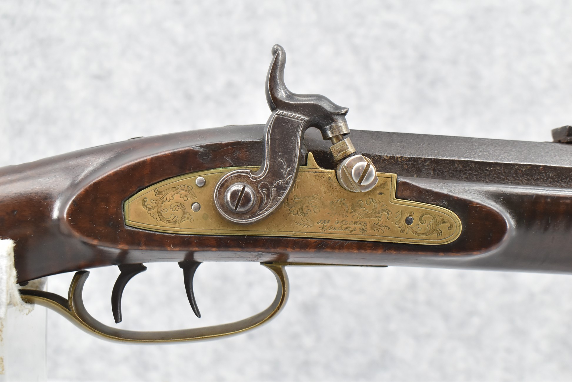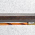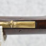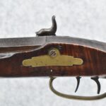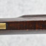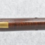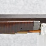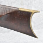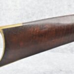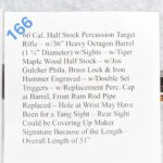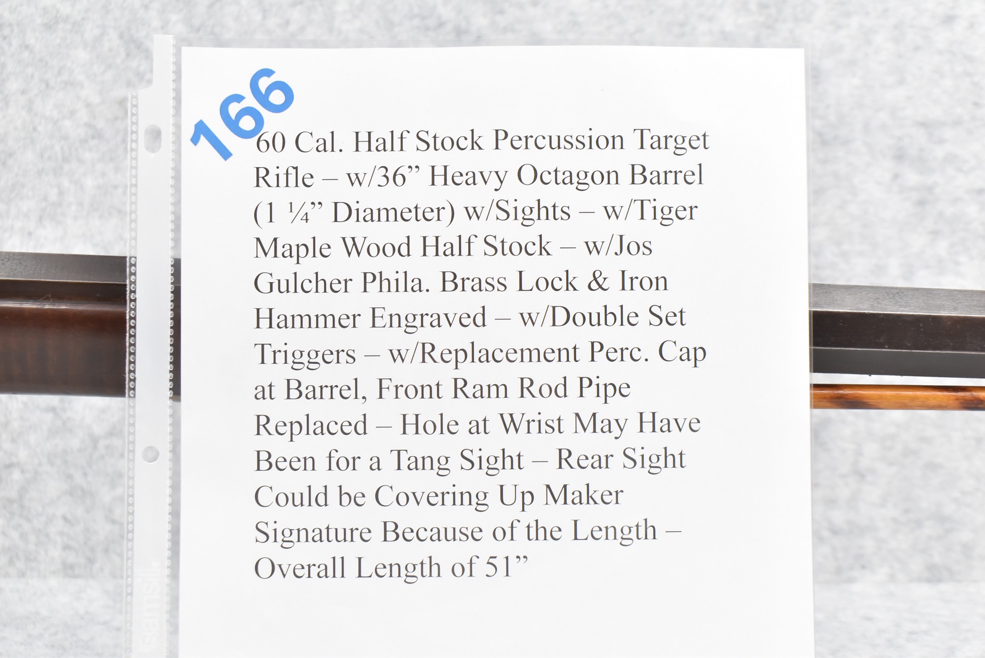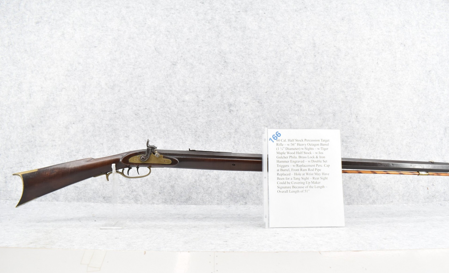 166. 60 Cal. Half Stock Percussion Target Rifle – w/36” Heavy Octagon Barrel (1 ¼” Diameter) w/Sights – w/Tiger Maple Wood Half Stock – w/Jos Gulcher Phila. Brass Lock & Iron Hammer Engraved – w/Double Set Triggers – w/Replacement Perc. Cap at Barrel, Front Ram Rod Pipe Replaced – Hole at Wrist May Have Been for a Tang Sight – Rear Sight Could be Covering Up Maker Signature Because of the Length – Overall Length of 51”