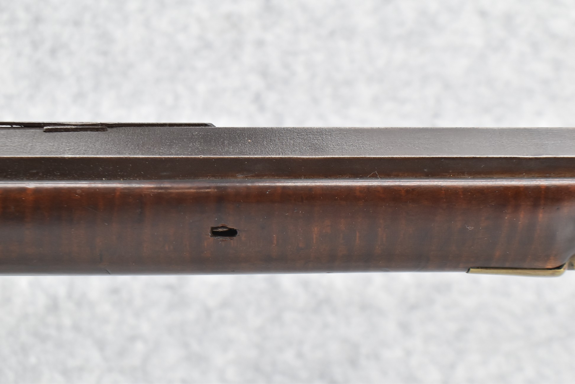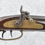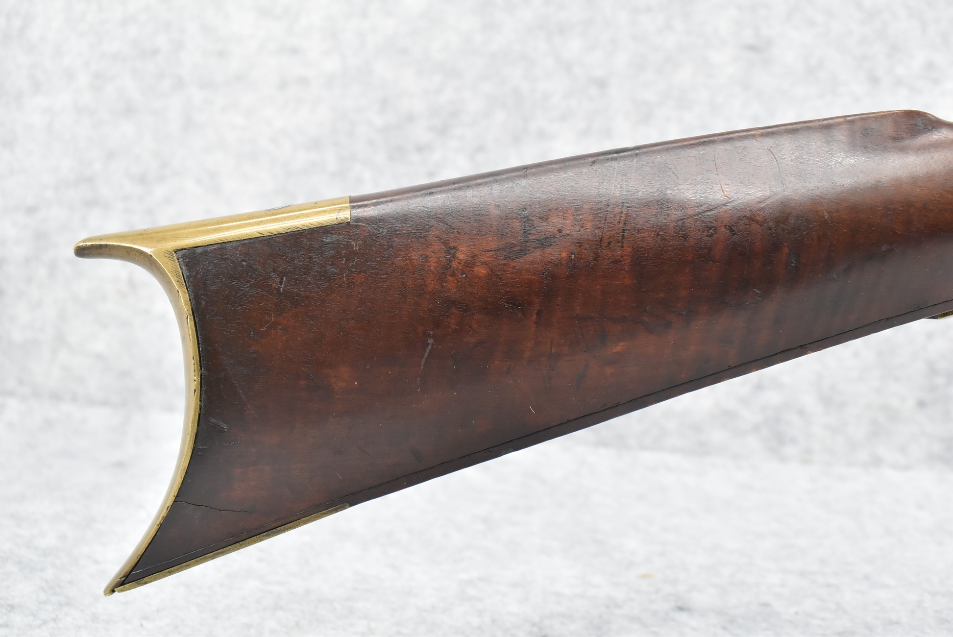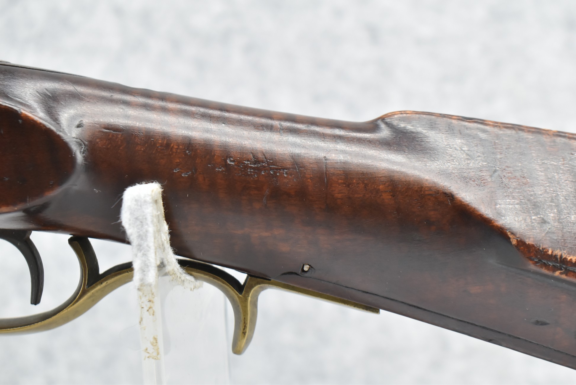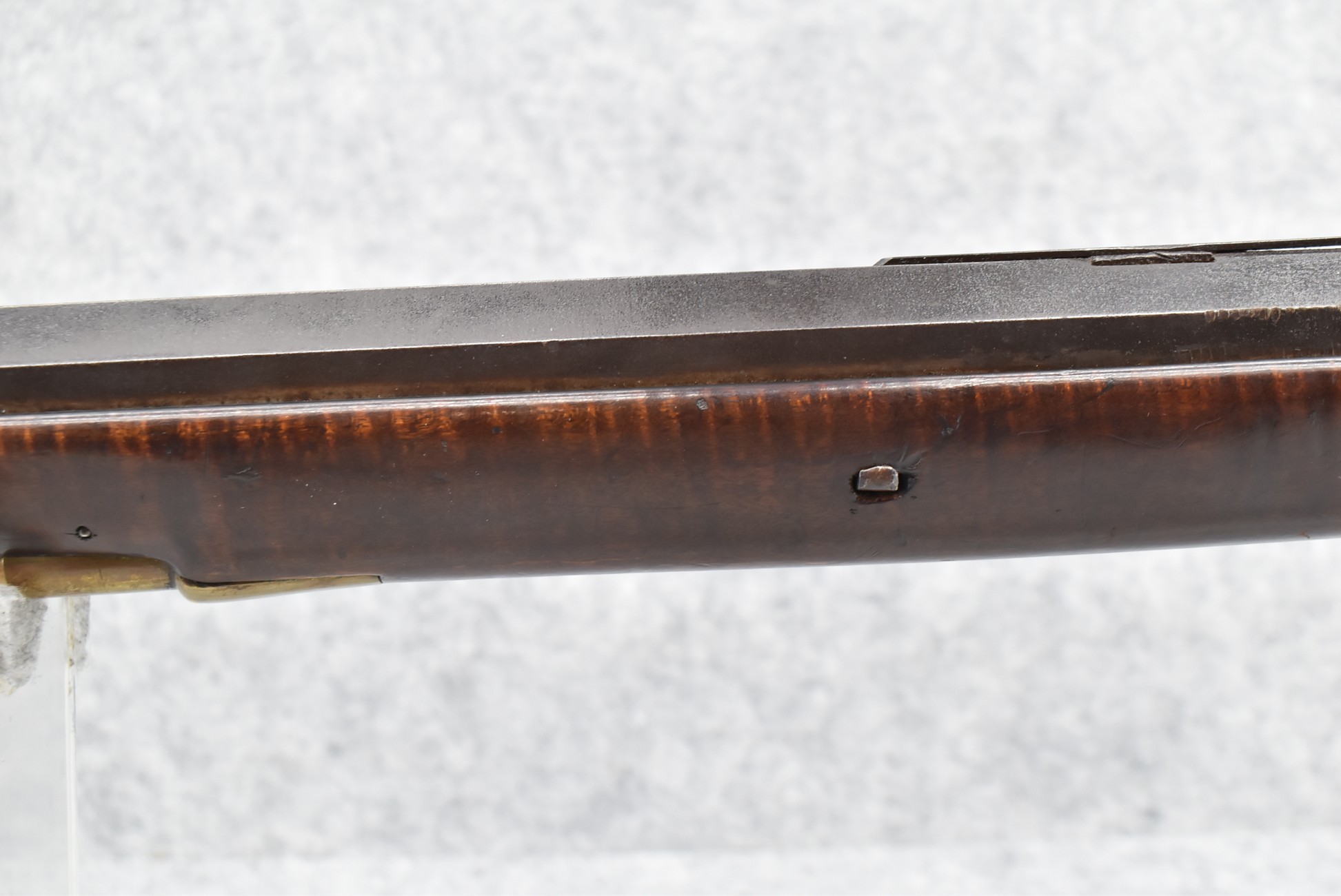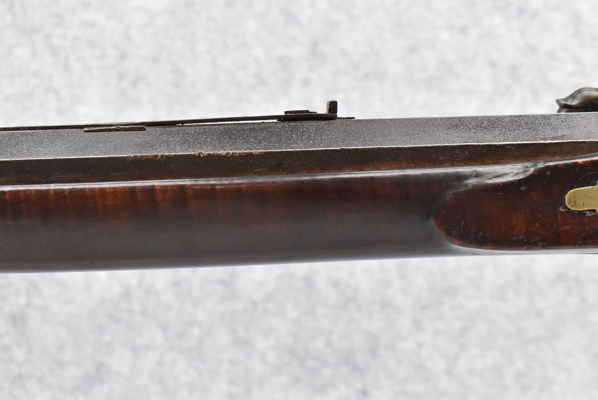 166. 60 Cal. Half Stock Percussion Target Rifle – w/36” Heavy Octagon Barrel (1 ¼” Diameter) w/Sights – w/Tiger Maple Wood Half Stock – w/Jos Gulcher Phila. Brass Lock & Iron Hammer Engraved – w/Double Set Triggers – w/Replacement Perc. Cap at Barrel, Front Ram Rod Pipe Replaced – Hole at Wrist May Have Been for a Tang Sight – Rear Sight Could be Covering Up Maker Signature Because of the Length – Overall Length of 51”