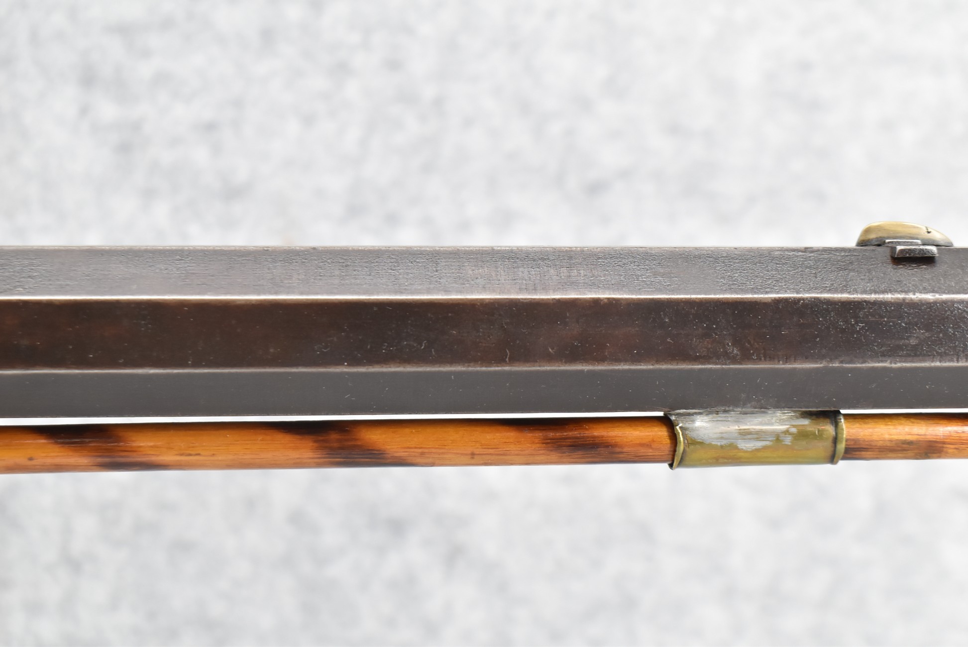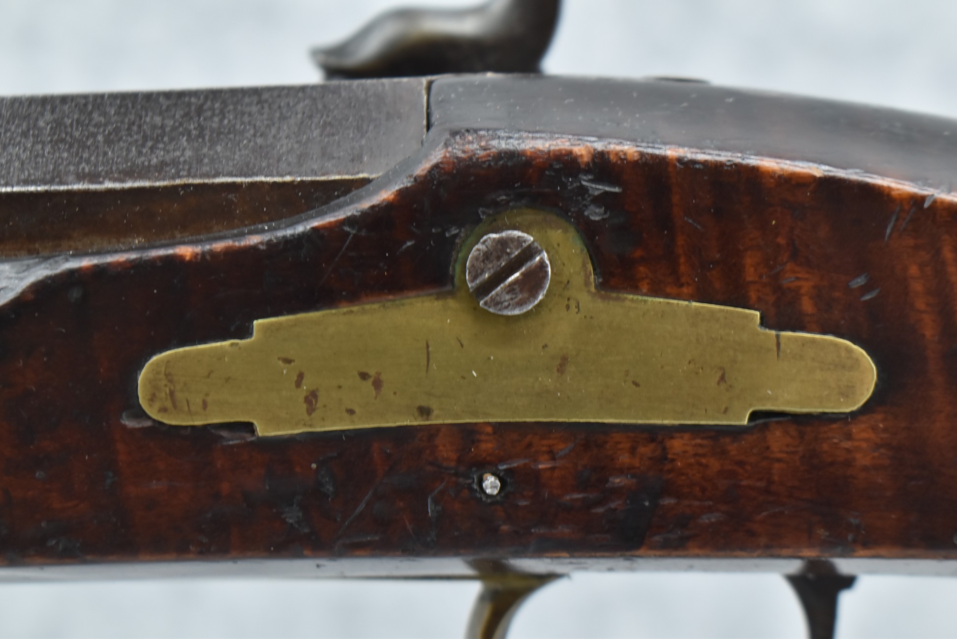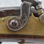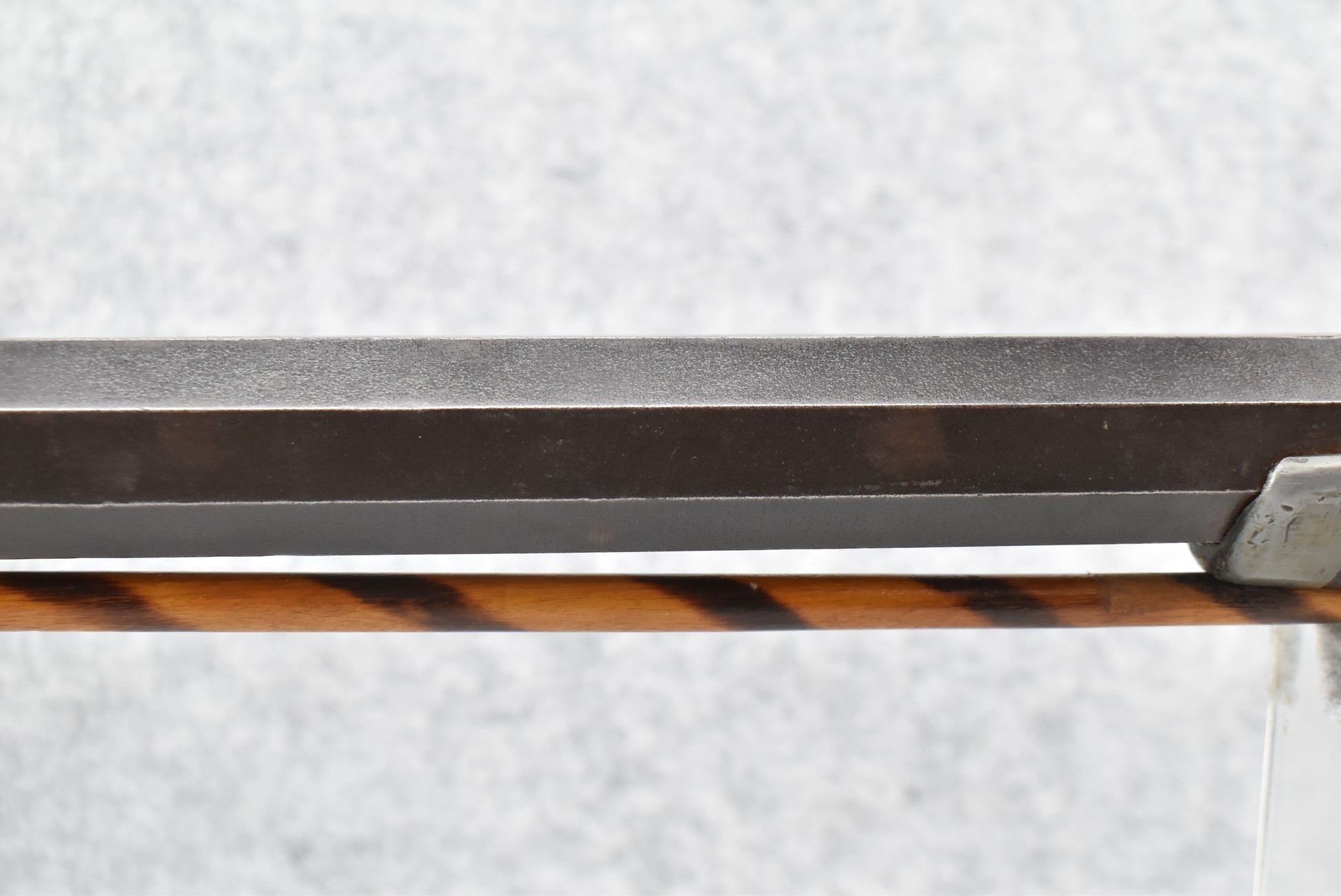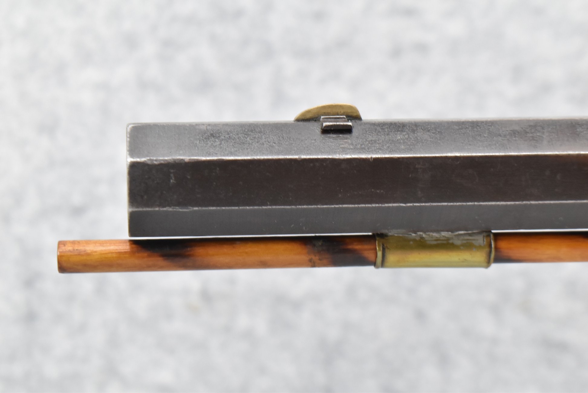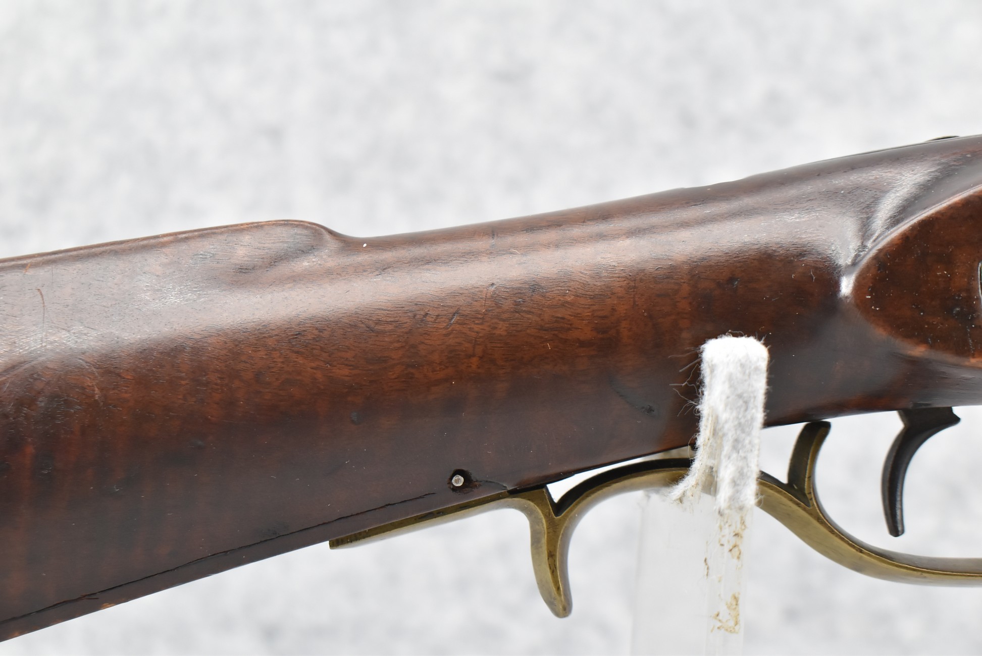 166. 60 Cal. Half Stock Percussion Target Rifle – w/36” Heavy Octagon Barrel (1 ¼” Diameter) w/Sights – w/Tiger Maple Wood Half Stock – w/Jos Gulcher Phila. Brass Lock & Iron Hammer Engraved – w/Double Set Triggers – w/Replacement Perc. Cap at Barrel, Front Ram Rod Pipe Replaced – Hole at Wrist May Have Been for a Tang Sight – Rear Sight Could be Covering Up Maker Signature Because of the Length – Overall Length of 51”