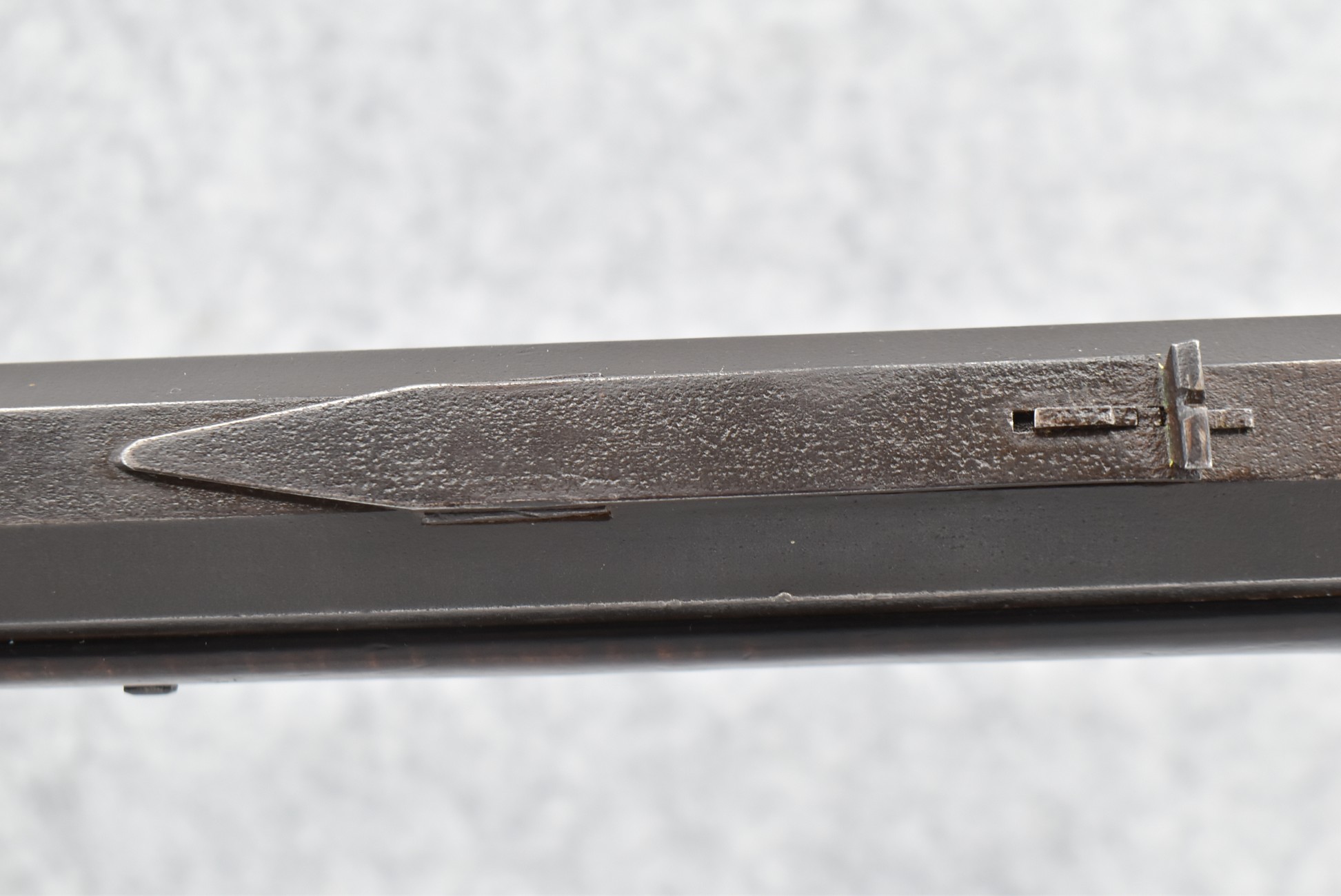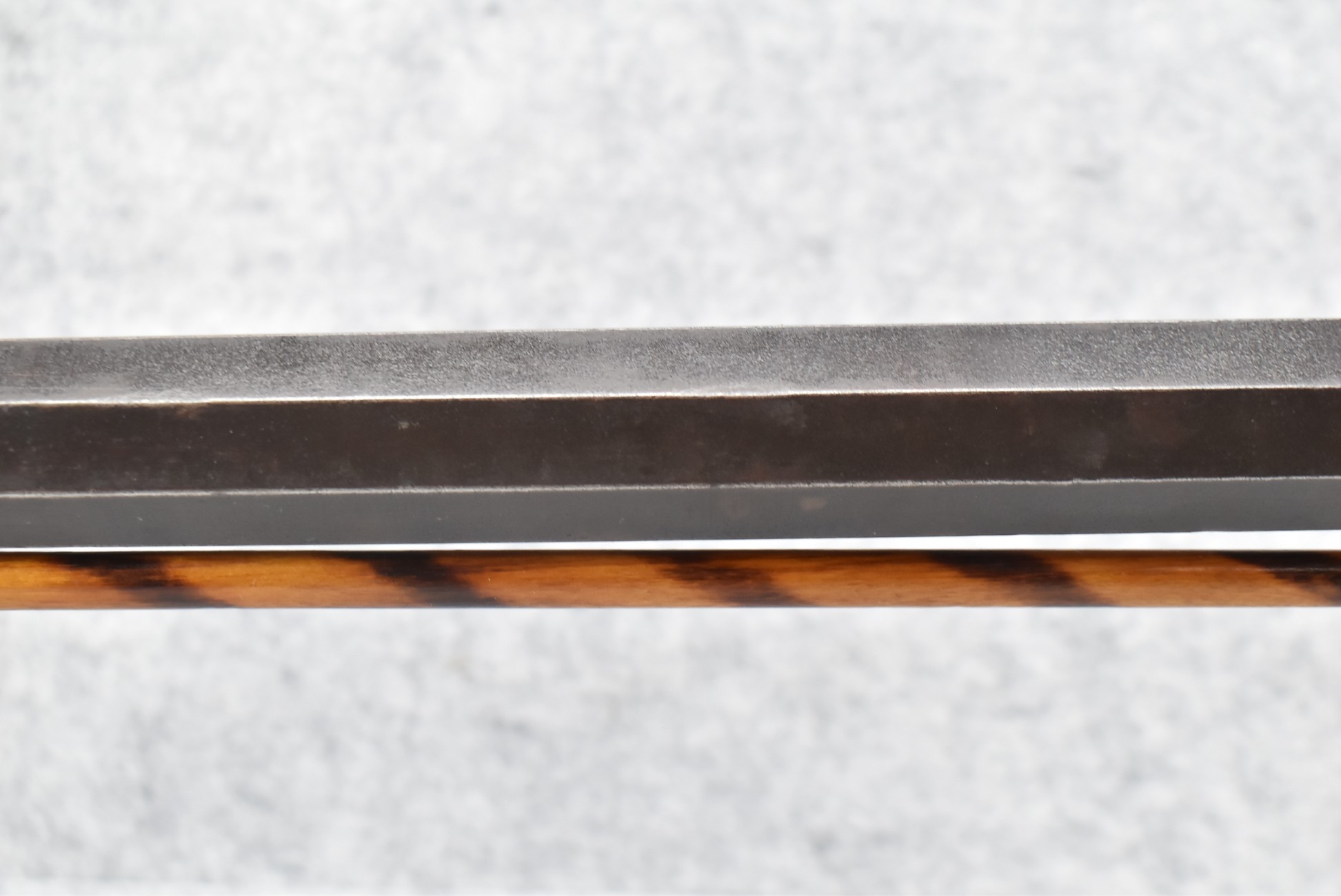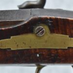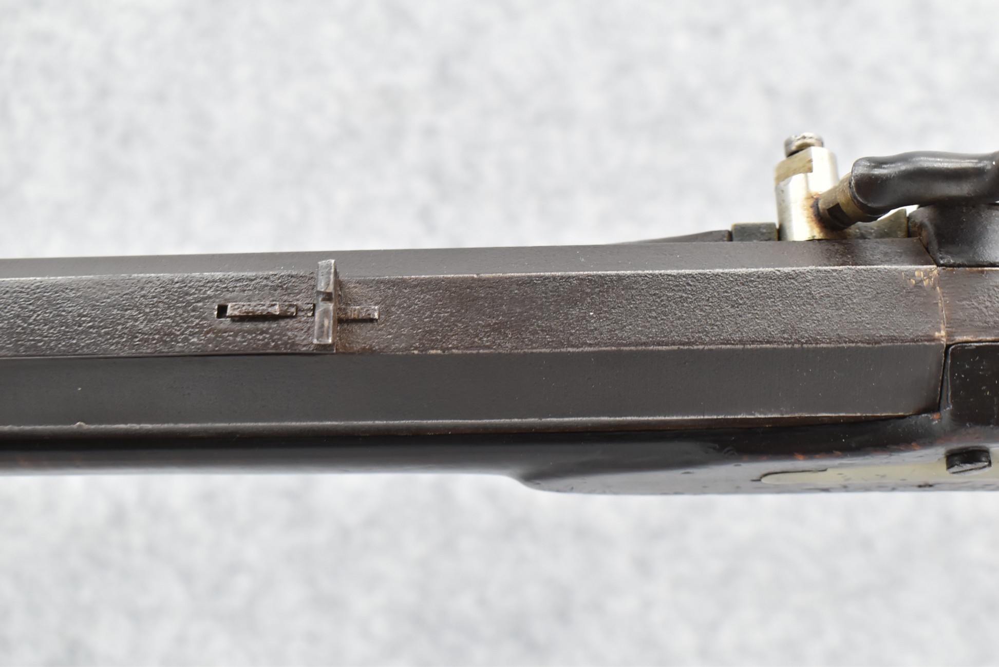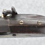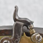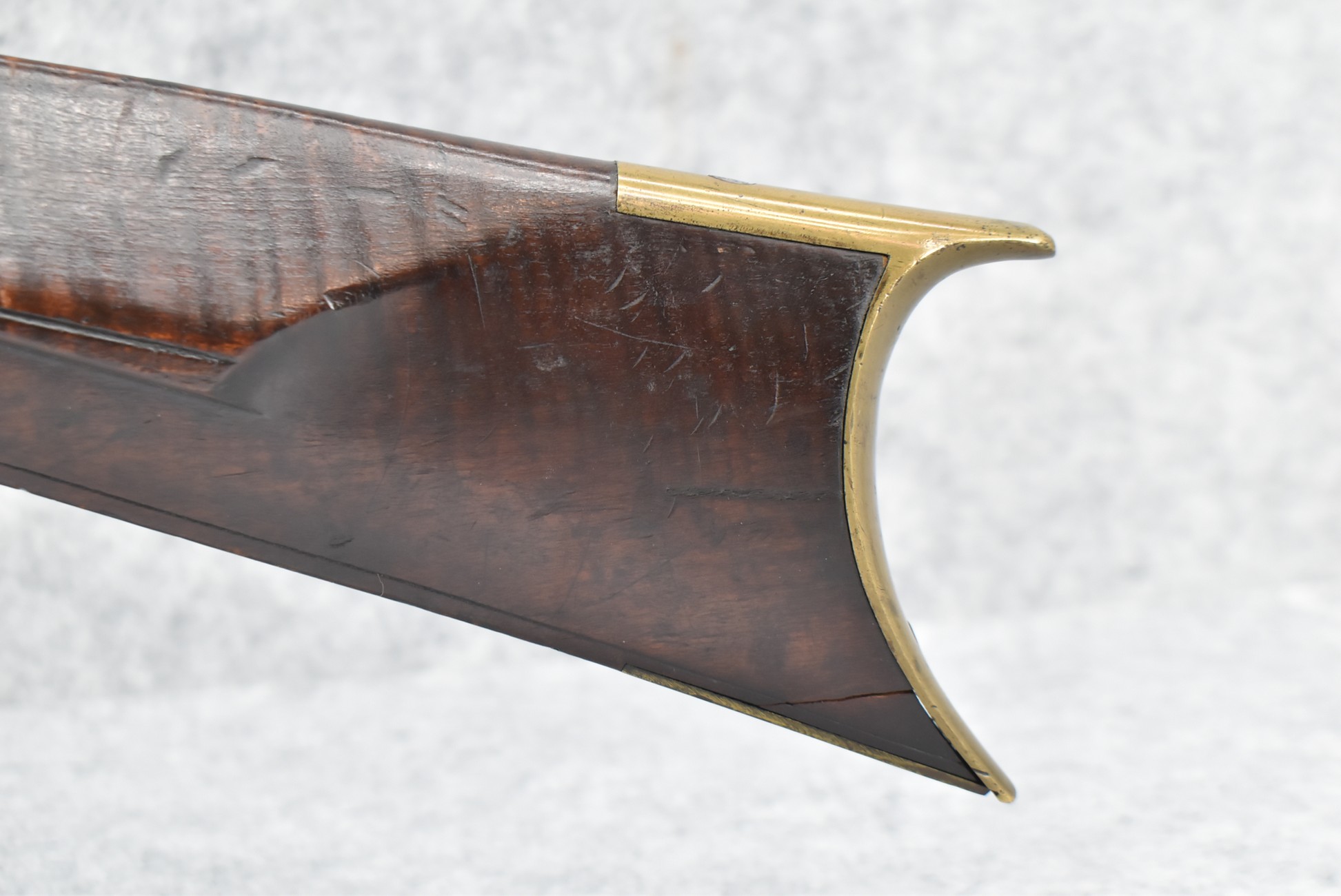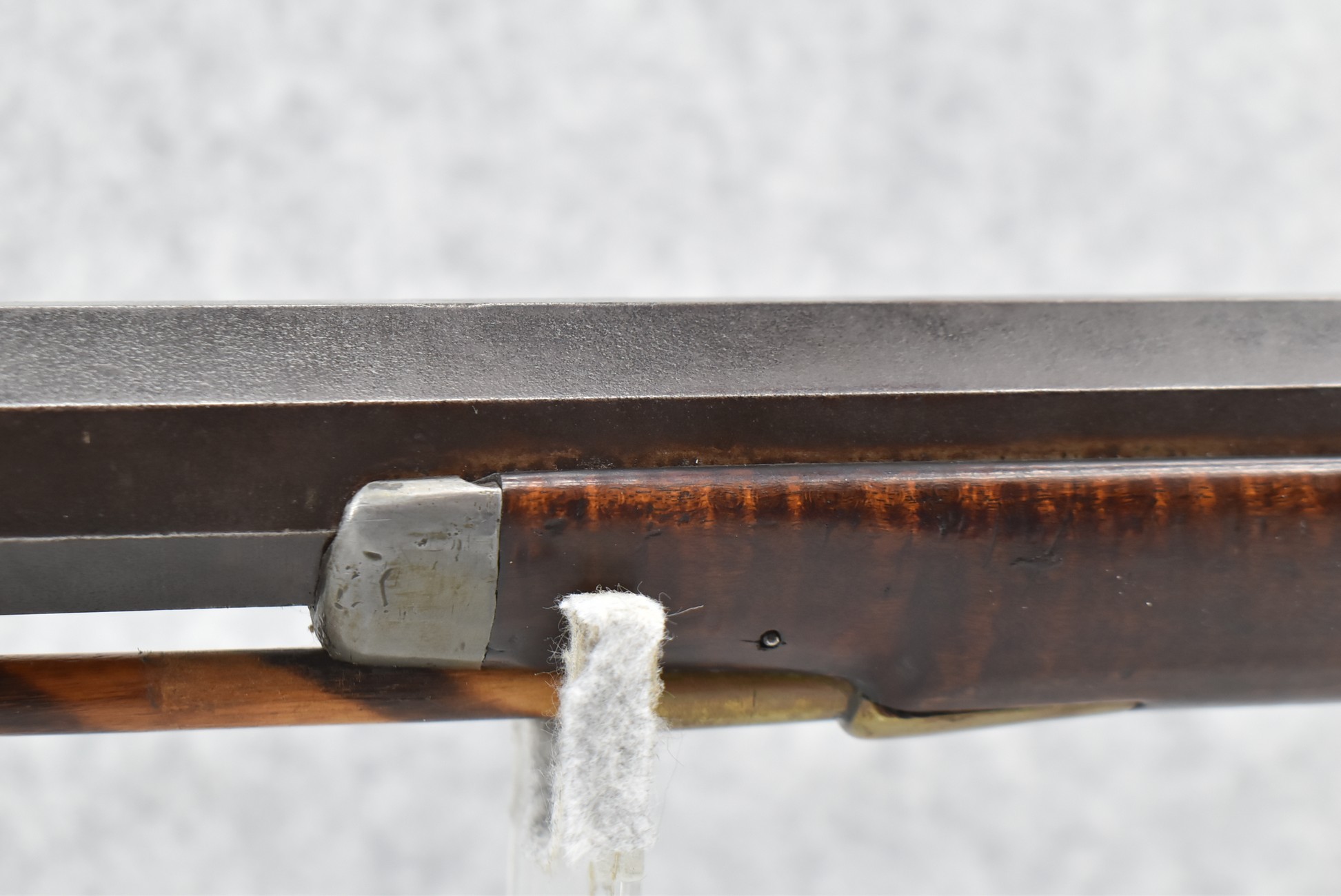 166. 60 Cal. Half Stock Percussion Target Rifle – w/36” Heavy Octagon Barrel (1 ¼” Diameter) w/Sights – w/Tiger Maple Wood Half Stock – w/Jos Gulcher Phila. Brass Lock & Iron Hammer Engraved – w/Double Set Triggers – w/Replacement Perc. Cap at Barrel, Front Ram Rod Pipe Replaced – Hole at Wrist May Have Been for a Tang Sight – Rear Sight Could be Covering Up Maker Signature Because of the Length – Overall Length of 51”
