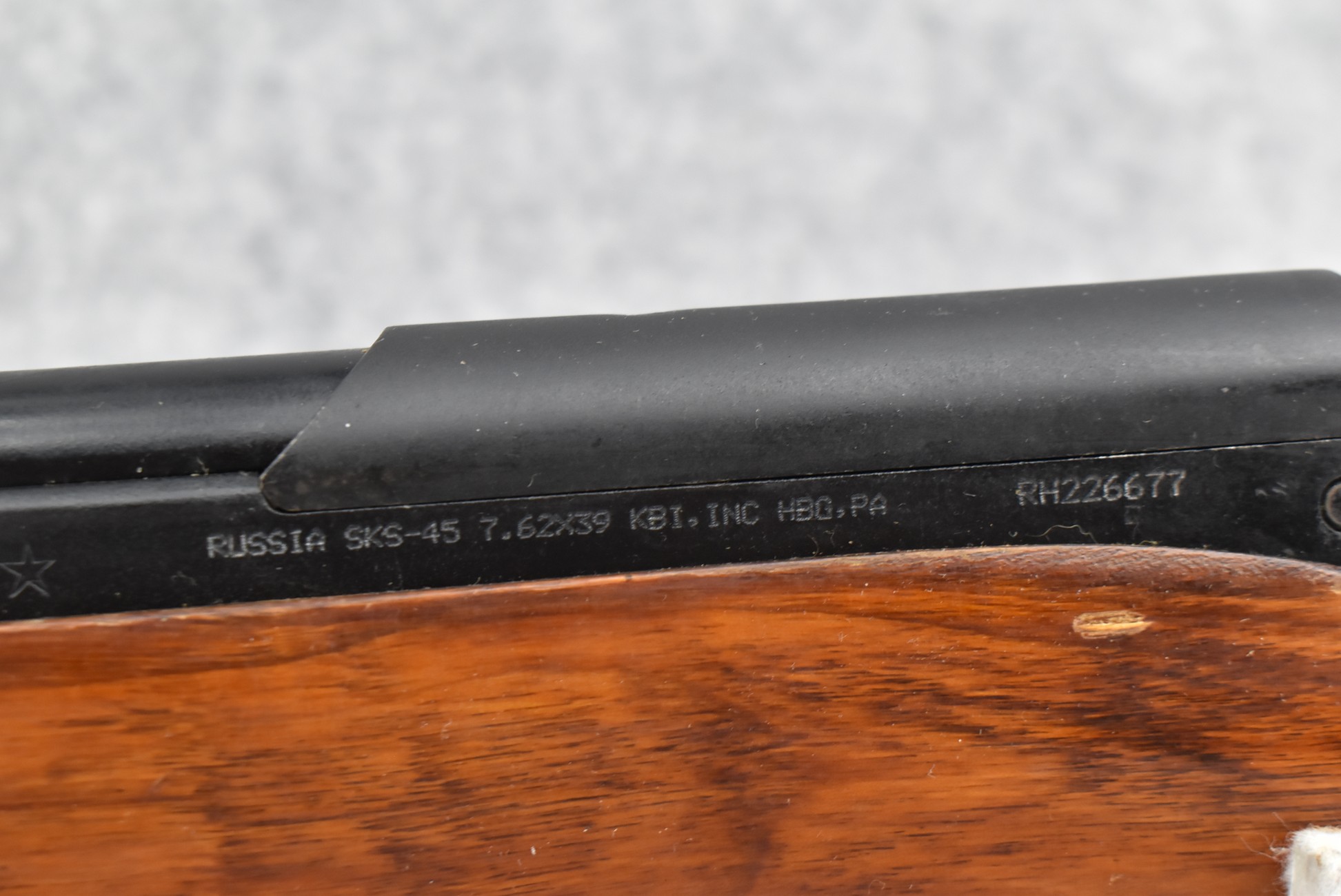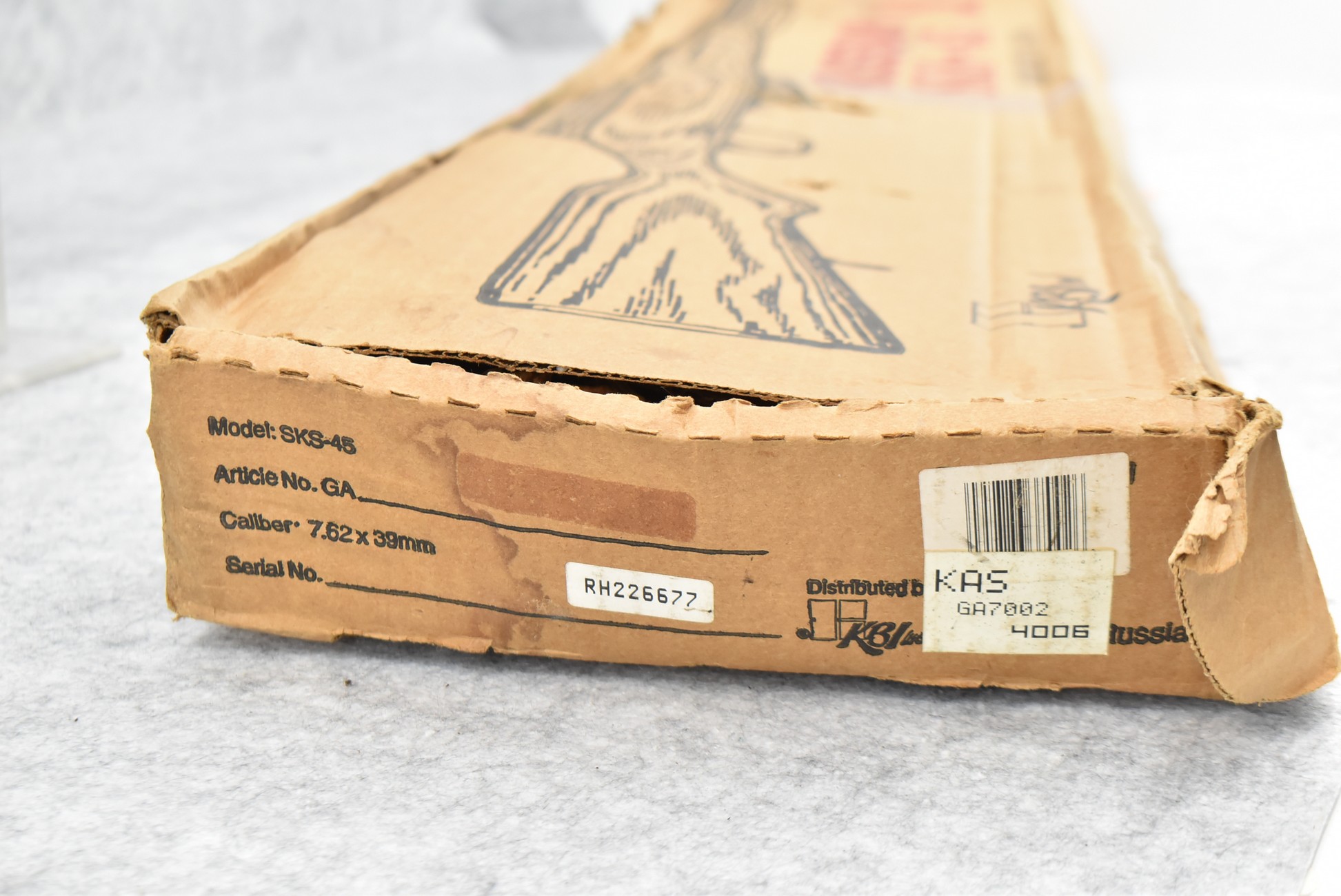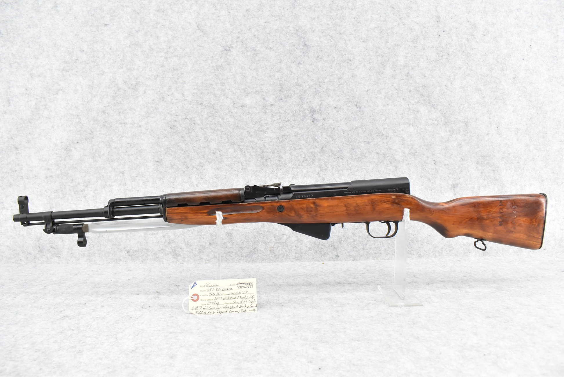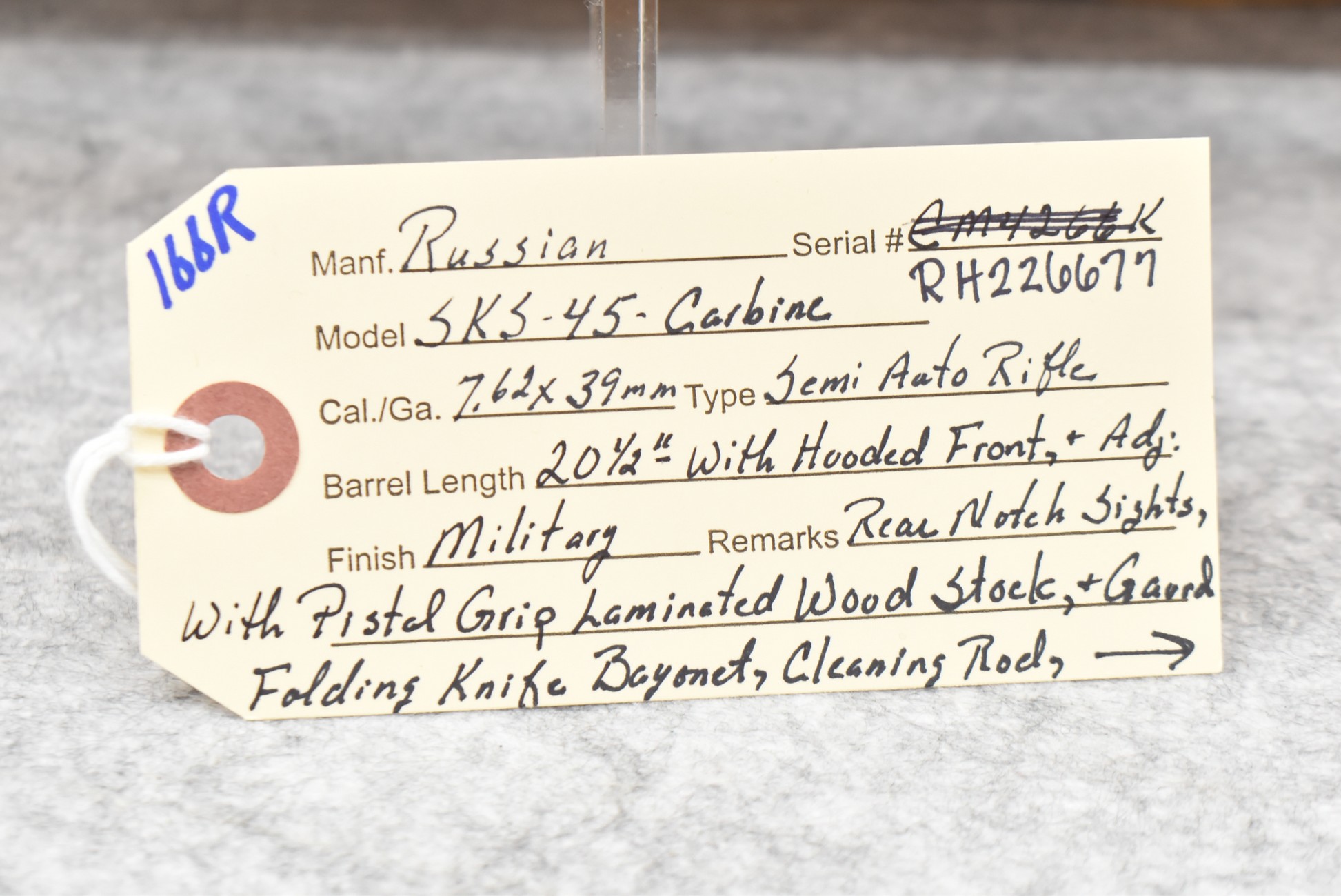 166R.     Russian – Mod. SKS-45 – 7.62x39mm Cal. Semi-Auto Rifle – w/20 ½” Barrel w/Hooded Front & Adj. Rear Notch Sights – Military Finish – w/Pistol Grip Laminated Wood Stocks w/Metal Butt Plate – w/Sling – w/Folding Knife Bayonet – w/Cleaning Rod & Lube Kit – w/Shipping Box & Accessories – Import Marked
