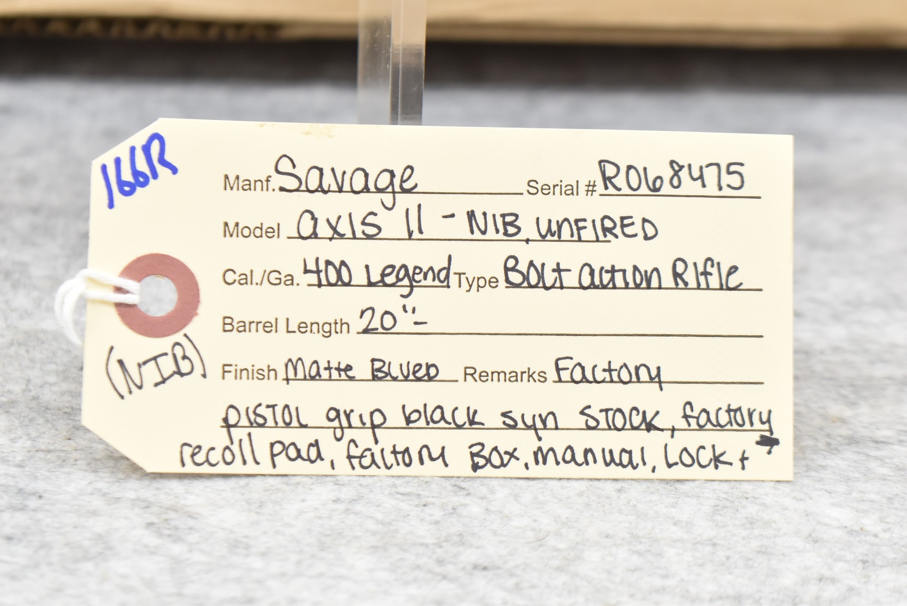 166R. Savage – Mod. Axis 11 – 400 Legend Cal. Bolt Action Rifle – w/20” Barrel – Matte Blued Finish – w/Factory Pistol Grip Black Synthetic Stock w/Factory Recoil Pad – w/Detachable Mag – New & Unfired w/Factory Box & Manual