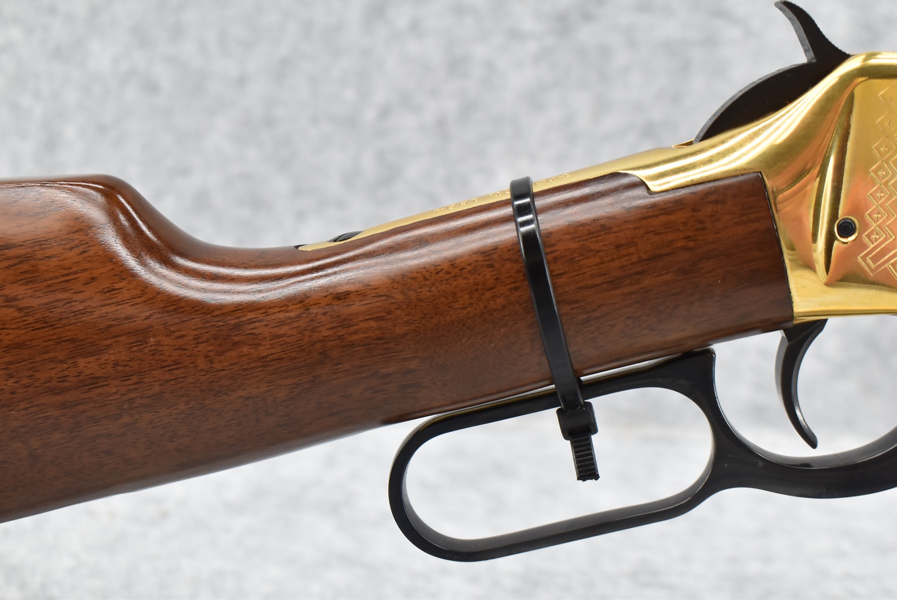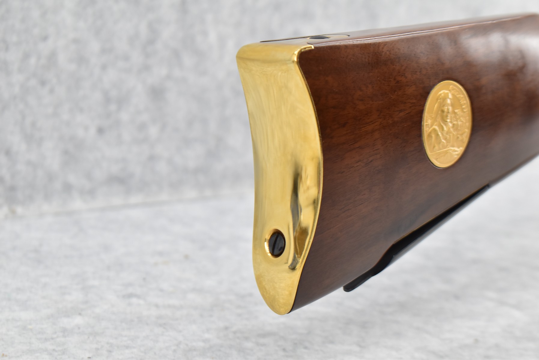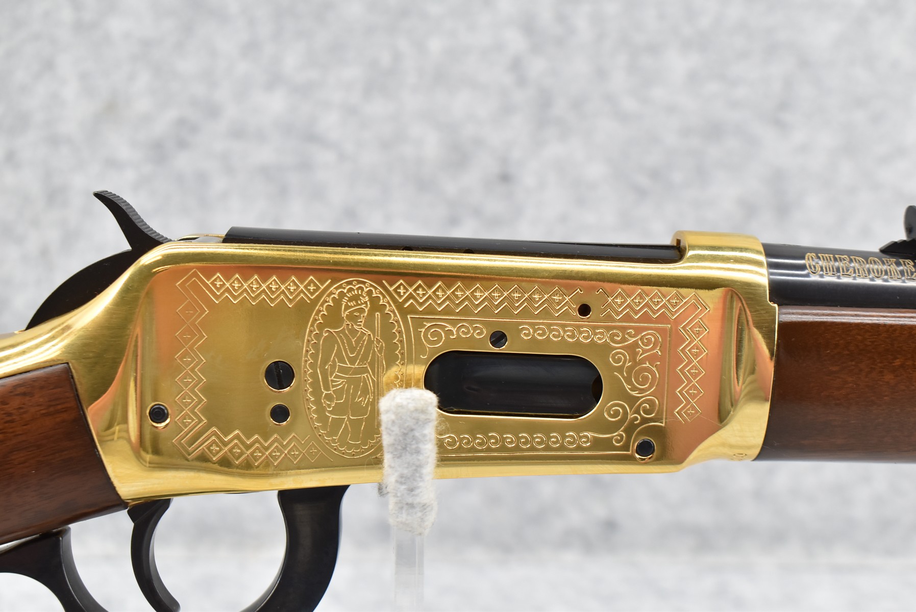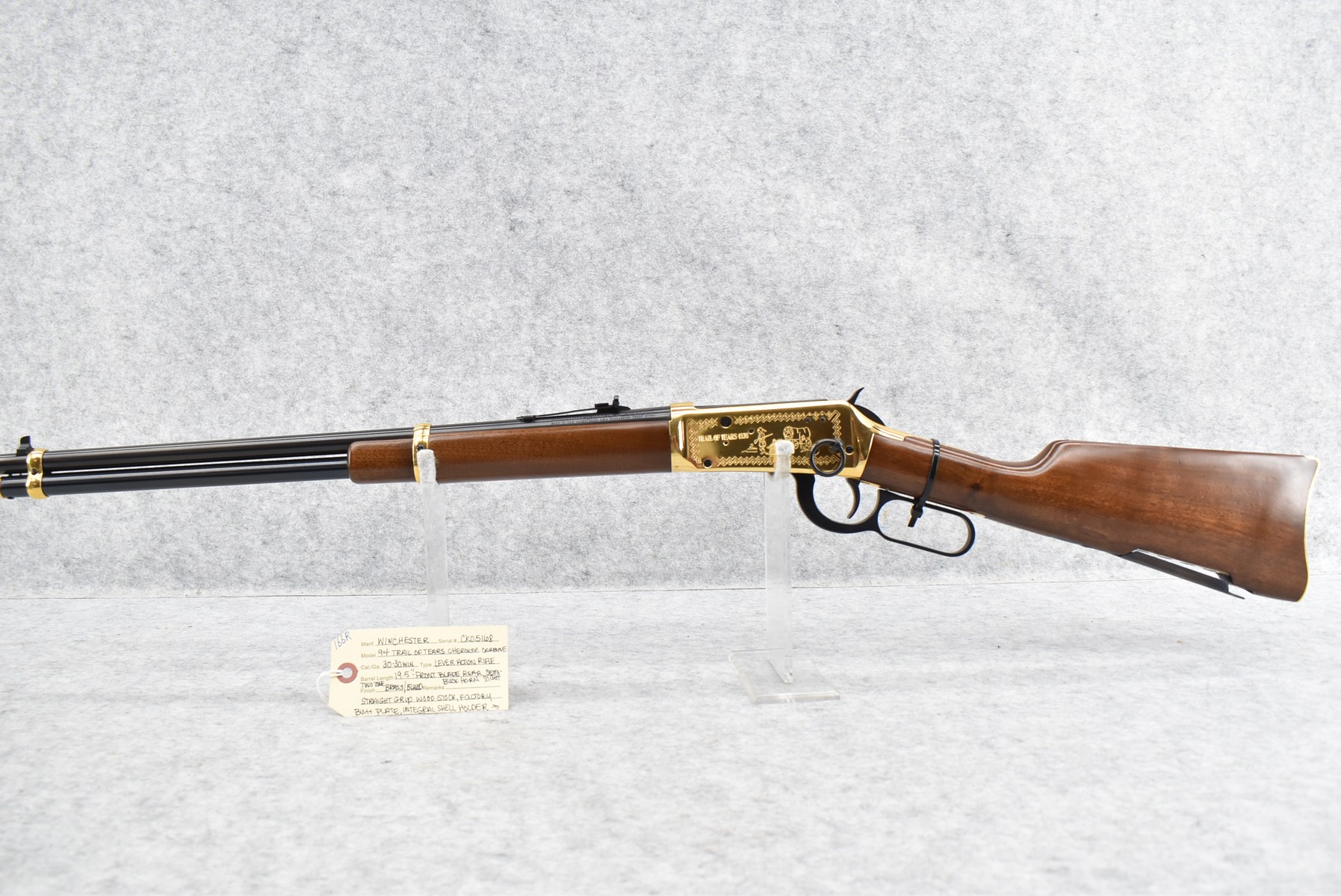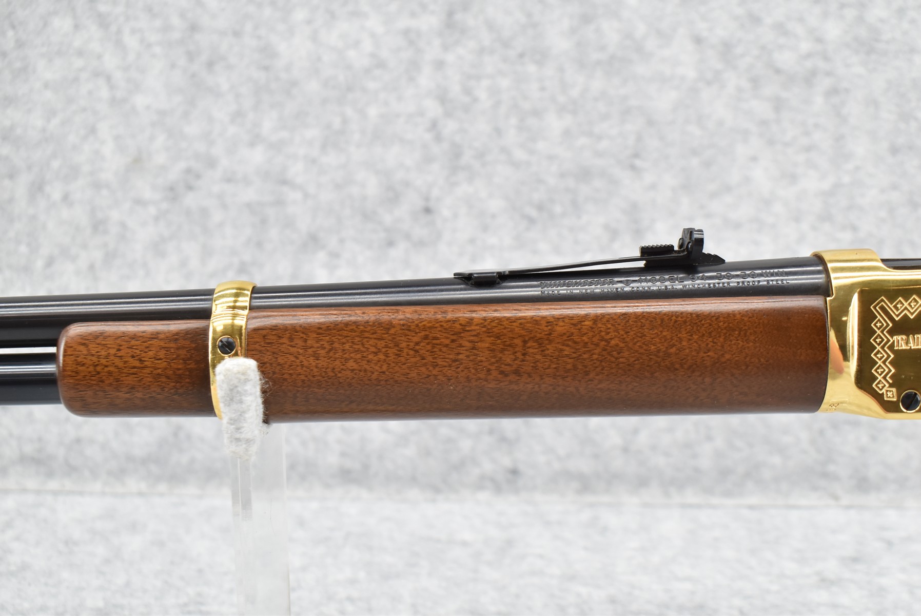 166R.     Winchester – Mod. 94 – Trail of Tears Cherokee Carbine – 30-30 Win. Cal. Lever Action Rifle – w/20” Barrel w/Front Blade & Semi Buckhorn Rear Sights – Gold Plated/Blued Two-Tone Finish – w/Straight Grip Wood Stock w/Factory Butt Plate – w/Integral Shell Holder in Stock – w/Tubular Magazine – No Box