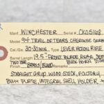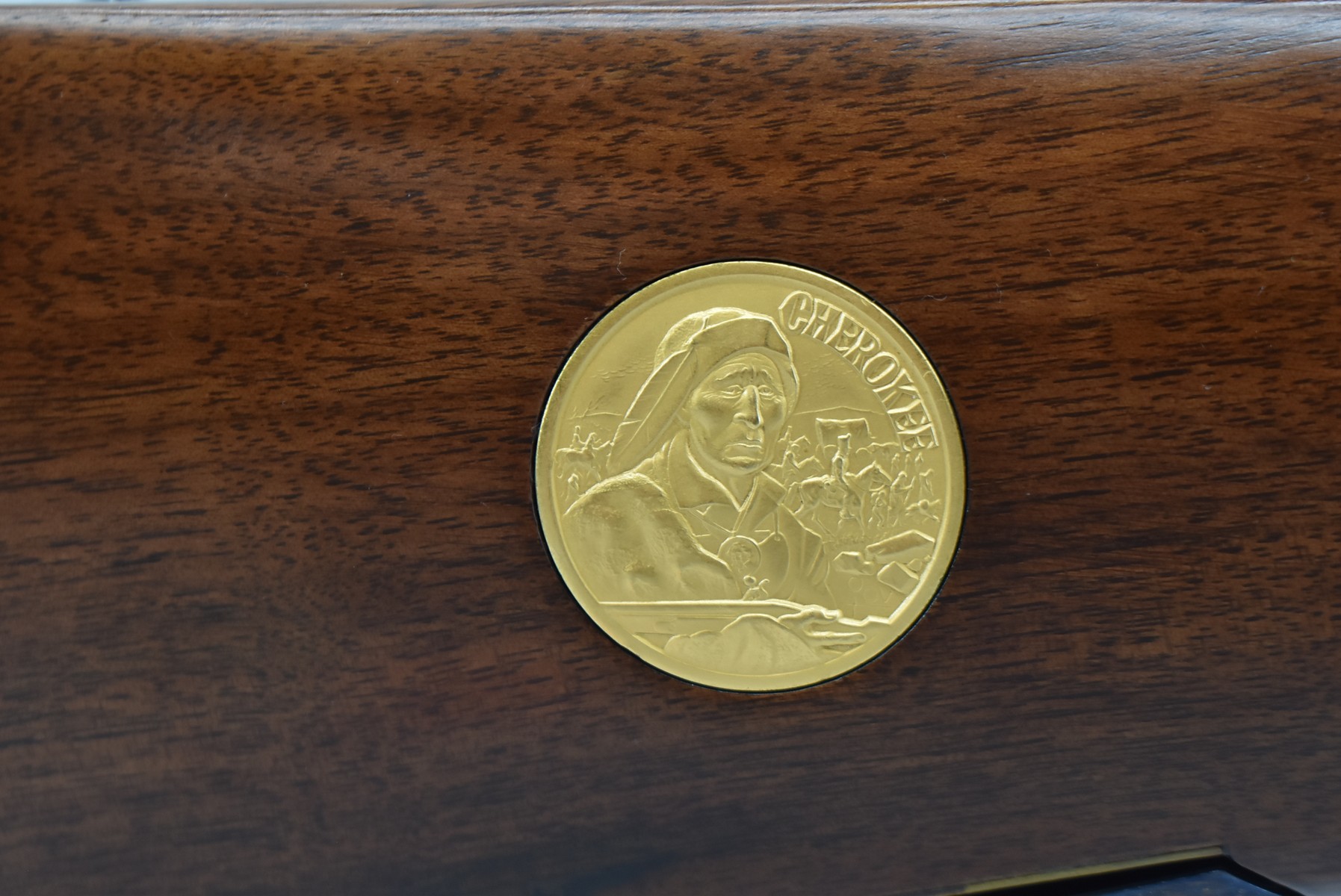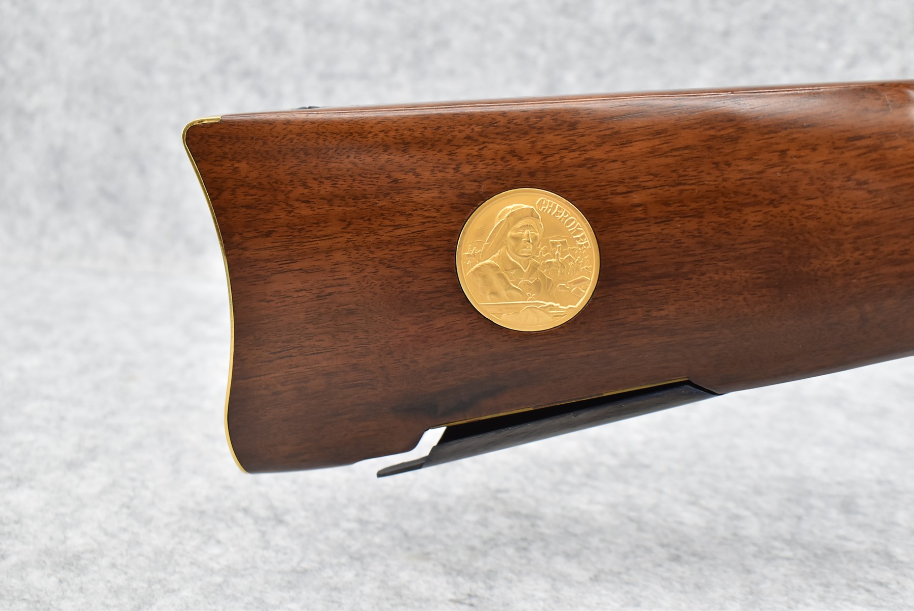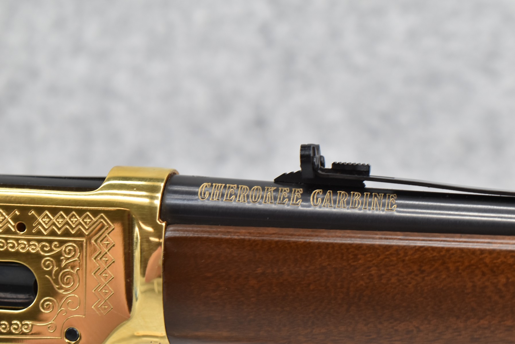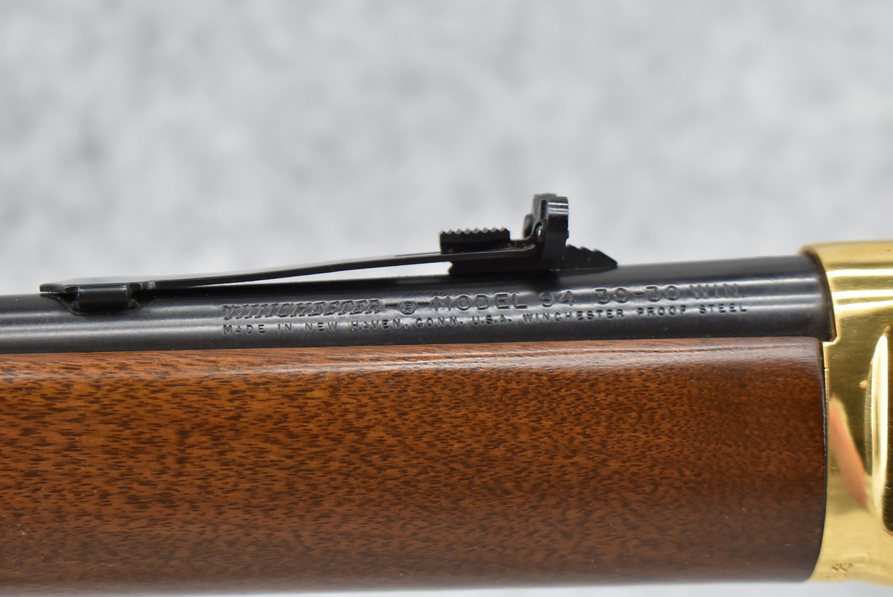 166R.     Winchester – Mod. 94 – Trail of Tears Cherokee Carbine – 30-30 Win. Cal. Lever Action Rifle – w/20” Barrel w/Front Blade & Semi Buckhorn Rear Sights – Gold Plated/Blued Two-Tone Finish – w/Straight Grip Wood Stock w/Factory Butt Plate – w/Integral Shell Holder in Stock – w/Tubular Magazine – No Box