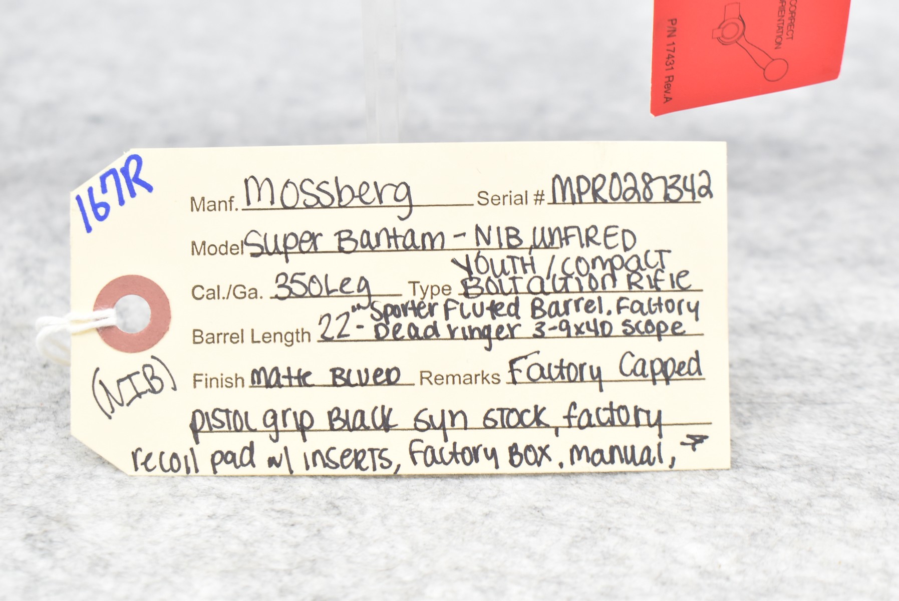 167R. Mossberg – Mod. Super Bantam – 350 Legend Cal. Youth/Compact Bolt Action Rifle – w/22” Fluted Barrel – Matte Blued Finish – w/Factory Capped Pistol Grip Black Synthetic Stock w/Factory Recoil Pad w/Inserts – w/Dead Ringer 3-9×40 Scope & Mounts – New & Unfired w/Factory Box, Manual & Detachable Magazine